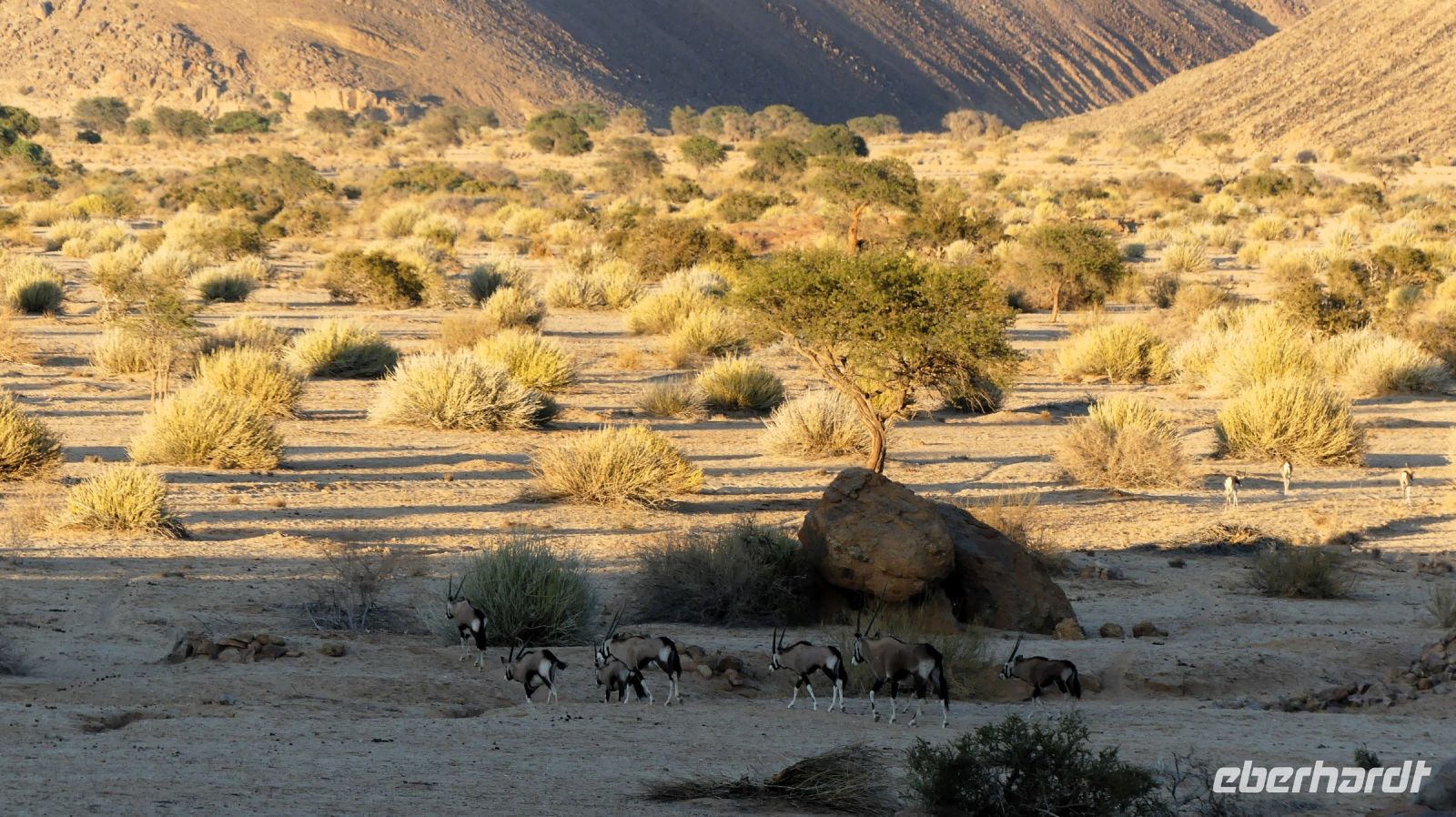 Auf unserer weiteren Fahrt wurde die Landschaft immer karger, trockener, aber nicht weniger interessant. Faszinierende Bergketten und Steine aus gelben Stein, Wolfsmilchsgewächse als grüne Farbtupfer, Strauße und Oryxe! Unser Etappenziel heute: die Gondwana Fish River Canyon Lodge, in der Nähe des Fish River Canyon. Die Lodge ist einer meiner Lieblingsunterkünfte und wir freuten uns, hier auch den Silvesterabend hier zu verbringen. Das Haupthaus der Lodge ist ein ehemaliges Farmhaus von zwei Deutschen. Die Häuschen aus Holz und Stein sind alle mit und in die Natur gebaut. Gondwana achtet da sehr auf Umweltverträglichkeit und Nachhaltigkeit. Fast ausschließlich sind die Lodges (jede auf ihre Art) Selbstversorger mit Solarenergie, Gemüsegarten, eigener Brunnen usw. Wir bezogen unsere komfortablen Häuschen mit Ausblick . Ich mußte etwas weiter laufen;-). In den Bäumen zwitscherten bunte Vögelchen und die niedlichen Klippschliefer (Dassies) labten sich am saftigen Gras. Wir natürlich später auch, beim späteren Abendessen mit leckeren Getränken. Der Wein The Old Man`s Blend white war besonders lecker. Zu später Stunde unternahmen wir noch eine Nachtwanderung auf der Suche nach dem Kreuz des Südens! Wir wurden fündig inklusive der mit Sternen übersäten Milky Way, die sich über uns wie ein helles Netz spannte. PS: am Abend wie in den frühen Morgenstunden war ziemlich viel Betrieb vor den Hütten: Oryxe marschierten durch das Gelände.