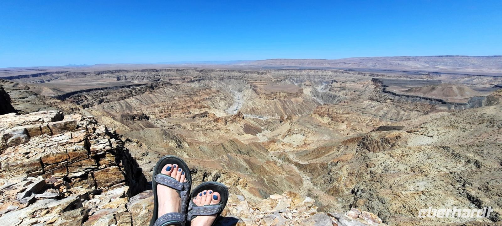 Der letzte Tag des Jahres 2023 hatte begonnen. Herrlich wie die Sonne in dieser einzigartigen Landschaft aufging und die Felsen golden anstrahlte. Nac einem guten Frühstück fuhren wir zum Fish River Canyon. Am obersten Aussichtpunkt und Info-Point stiegen wir aus. Wie immer hatten die Toiletten, die man vor einigen Jahren dort errichtet hatte, geschlossen. Vor unseren Augen tauchte plötzlich als großes, langes Loch im Boden auf - eine spektakuläre Aussicht auf den Canyon. Der Fish River windet sich, wenn er Wasser führt, durch den 550 Meter tiefen Canyon und bildet somit die zweitgrößte Schluchtenlandschaft der Erde. Zu unserer Reisezeit (Ende Dezember) war er vollkommen ausgetrocknet, nur noch einzelne, kleine Felsenpools konnten wir erahnen. Neben der geologischen Entstehungsgeschichte gibt es noch eine Nama-Legende. Vor langer Zeit soll hier eine Riesenschlange gelebt haben, die die Ziegen und Schafe der hier lebenden Namas fraß. Die Namas spürten die Schlange auf. In ihrem Todeskampf wehrte sich die Schlange heftig und wand sich in alle Richtungen, wobei der Boden aufriss und die gewaltigen Furchen entstanden. Mit etwas Fantasie kann man die versteinerte Schlange entdecken. Wir spazierten entlang der Kante, immer wieder boten sich andere Fotomotive. Am Ende unseres Spazierganges, dort wo der Einstieg zur mehrtägigen Wanderung in den Canyon ist, sahen wir Steine, die mit Tattoos verziert waren. Die Stromatolithen sind die ältesten bekannten Fossilien der Welt. Kleine Echsen und Agamen sonnten sich auf den Steinen. Am Nachmittag entspannten wir beim Nichtstun in unserer Lodge und genossen diese einmalige Landschaft zwischen roten Felsgestein, gelben Sand und blauen Himmel. Der versteckte Felsenpool mit weitem Ausblick war das Highlight. Zur Kaffeezeit stand sogar Christstollen auf dem Buffet, 34 ° C und nachweihnachtliche Gefühle. Zur Sundowner-Time erklommen einige Gäste mit Annett später den Hausberg und genossen von oben die einsame, faszinierende Weite dieses wunderbaren Fleckchens. Am Silvesterabend nahmen wir zunächst am festlich gedeckten Tisch im Restaurant Platz. Die letzten Stunden des Jahres 2023 begannen. Wir speisten lecker und viel. Auf Empfehlung probierten wir den "Katholischen", ein namibischer Wein, der ursprünglich nur als Messwein genutzt wurde. Er schmeckte gar nicht mal so übel. Am Ende des Festschmauses unterhielten uns die Mitarbeiter der Lodge mit Gesangs- und Tanzeinlagen. Der Küchenchef überraschte uns noch mit selbstgemachten Schokopralinen, unwiderstehliches Hüftgold. Später setzten wir uns auf die Terrasse und genossen die letzte Stunde des lauen Sommerabend 2023. Um Mitternacht knallten die Bubbles-Korken und wir stießen mit allen auf ein gesundes Jahr 2024. Wir Eberhardtler kürten noch die Dancing Queen des Lodge-Personals, die stolz die Krone entgegen nahm. Wie "Hans guck in die Luft"
