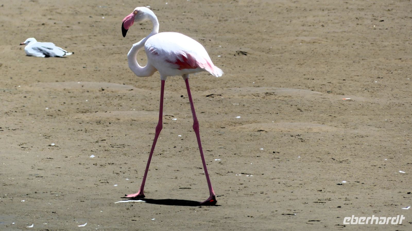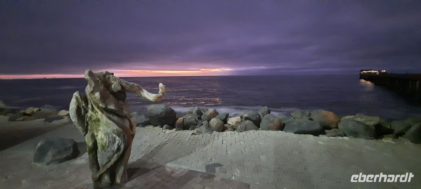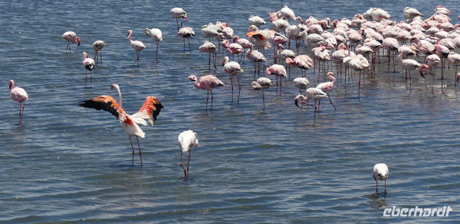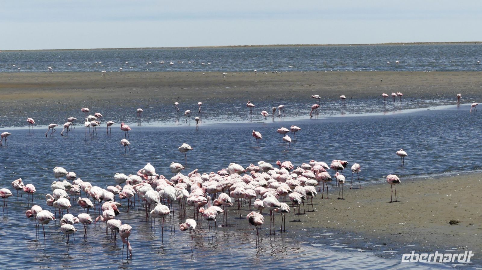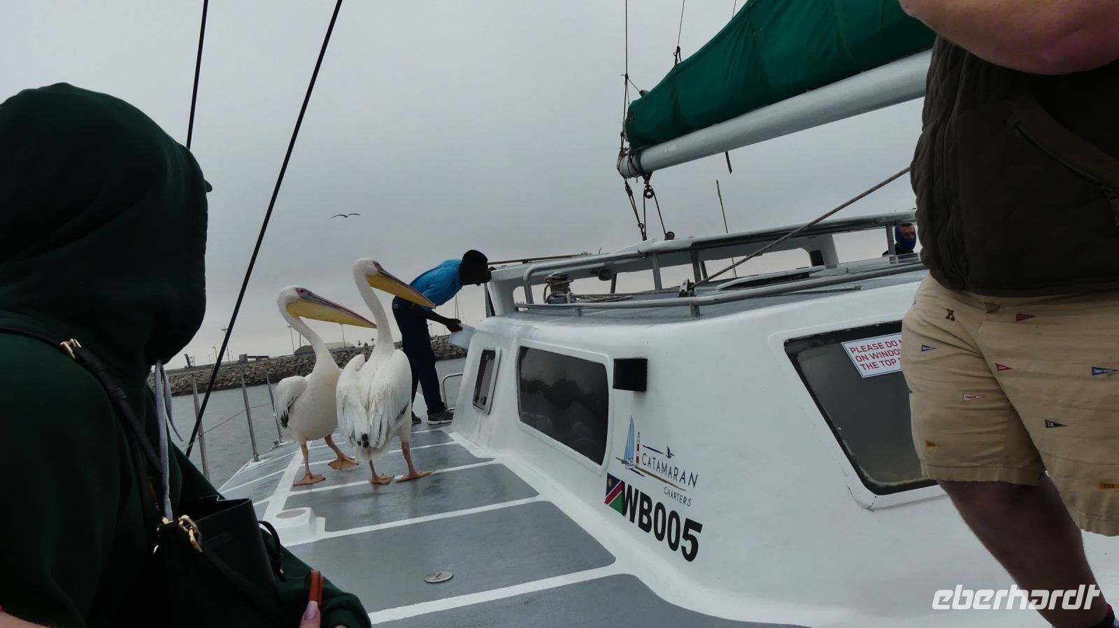 Bootsfahrt mit dem Katamaran durch die Lagune von Walvis Bay. Chef Ernst begrüßte uns mit seinem norddeutschen Esprit und bat uns, seine unterhaltsamen Sicherheitsanweisung doch "Ernst" zu nehmen. Nach den vergangenen, heißen Tagen war heute richtig kühl, so kamen unsere dickeren Jacken endlich mal zum Einsatz.Gleich zu Beginn kamen mehrere "blinde" Passagiere an Bord. Robben und die Pelikane, wobei einer sehr dreist unseren Harolf als Landeplatz nutzte. Seebär Ernst erzählte uns auf sehr lustige Weise Interessantes über die Bucht, die Landzunge und seine "Bewohner". Dabei wurden wir mit Kaffee und ebenso wärmenden Sherry (in Alibi-Tassen) bewirtet. Vorbei an den Austern-Tonnen, auf denen es sich Robben gemütlich gemacht hatten, schipperten wir zur Landzunge, auf deren Spitze der schwarz-weiße Leuchtturm steht. Da nicht so großer Wellengang war, konnten wir relativ nah heran. Viele Robbenkolonien haben es sich hier bequem gemacht. Von Weiten hörten wir schon das laute Rufen der kleinen Heuler. Die niedlichen Robben fühlten sich sichtlich wohl und ließen sich von den Kanufahrern, die durch das kalte Wasser paddelten, nicht stören. Plötzlich schauten alle gebannt auf das Wasser Und..... ein die Flosse eines Mond- oder Sonnenfisches war zu sehen. Dieses stattliche Exemplar schwamm dann auch ganz nah an uns vorbei. WOW, ein Mondfisch ist wirklich selten zu sehen! Für mich war es erst das 3. Mal, dass ich einem zu Gesicht bekam. Danke, liebe Reisegruppe. Auf der Rückfahrt sahen wir noch eine, mit Komoranen und anderen Wasservögeln voll besetzte Guano Plattform. Ja, früher verdiente man hier mit Vogel-Ausscheidungen enorm viel Geld, manch einer wurde sogar Millionär. Später ließen wir die Korken knallen und stießen mit südafrikanischen Sekt auf diesen perfekten Vormittag an. Dazu schlemmten wir vom kleinen Buffet mit frischen Austern, Meeresfrüchten, Fisch, Fleisch und Süßem. Seeluft macht eben großen Appetit! Bevor wir nach Swakopmund zurückfuhren, unternahmen wir noch einen Abstecher zu den Flamingos in der Bucht und konnten Hunderte von Flamingos, die im Sonnenschein durch das flache Wasser wadeten, beobachten - ein herrlicher Anblick. Den freien Nachmittag konnten die Gäste für ganz individuelle Erkundungen nutzen, die meisten gingen natürlich shoppen.. Am Abend hatten wir Date an der bekannten Seebrücke. Nach einem Spaziergang über die Jetty wurden wir im Restaurant The Tug, direkt an der Seebrücke zum Abendessen erwartet. Hier schlemmten wir wieder a la carte und ließen den letzten Tag am Atlantik ausklingen.