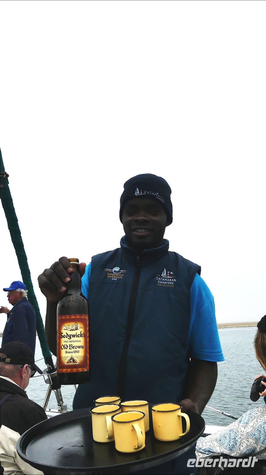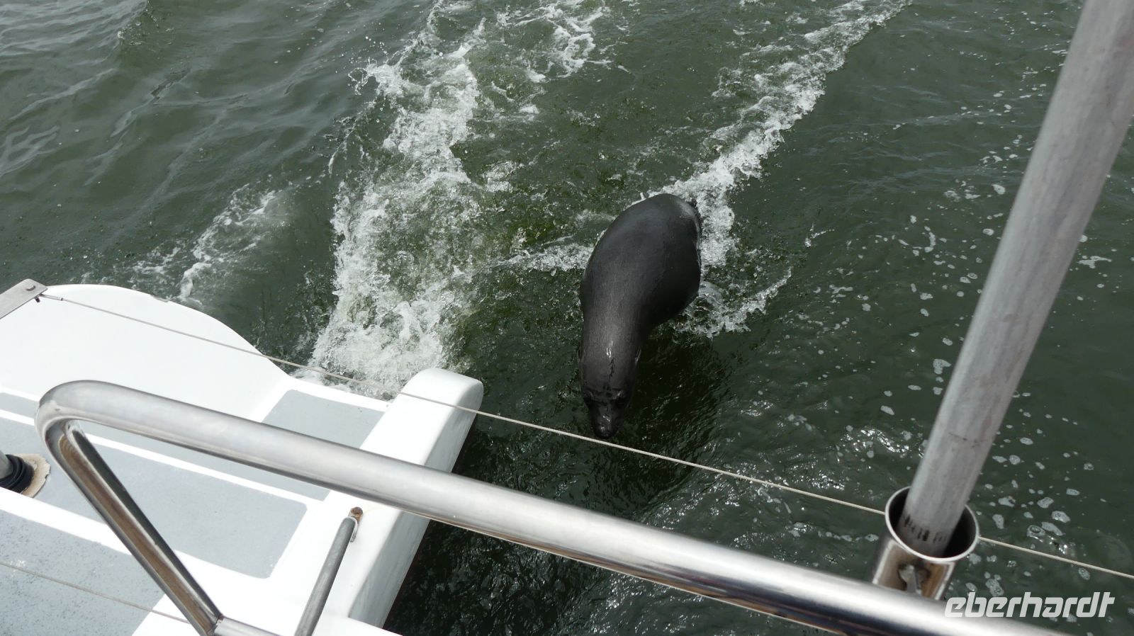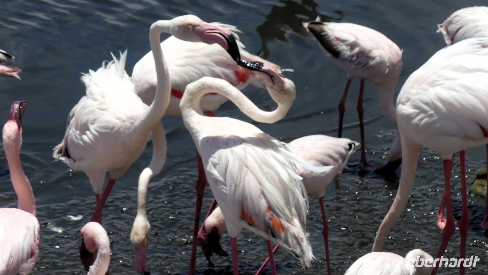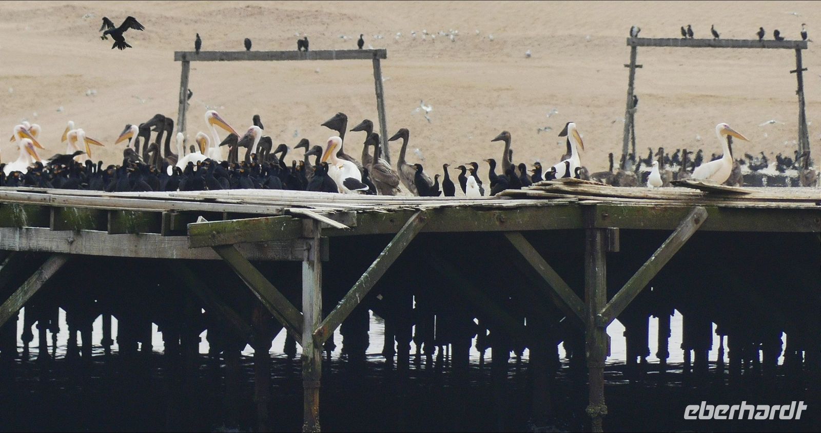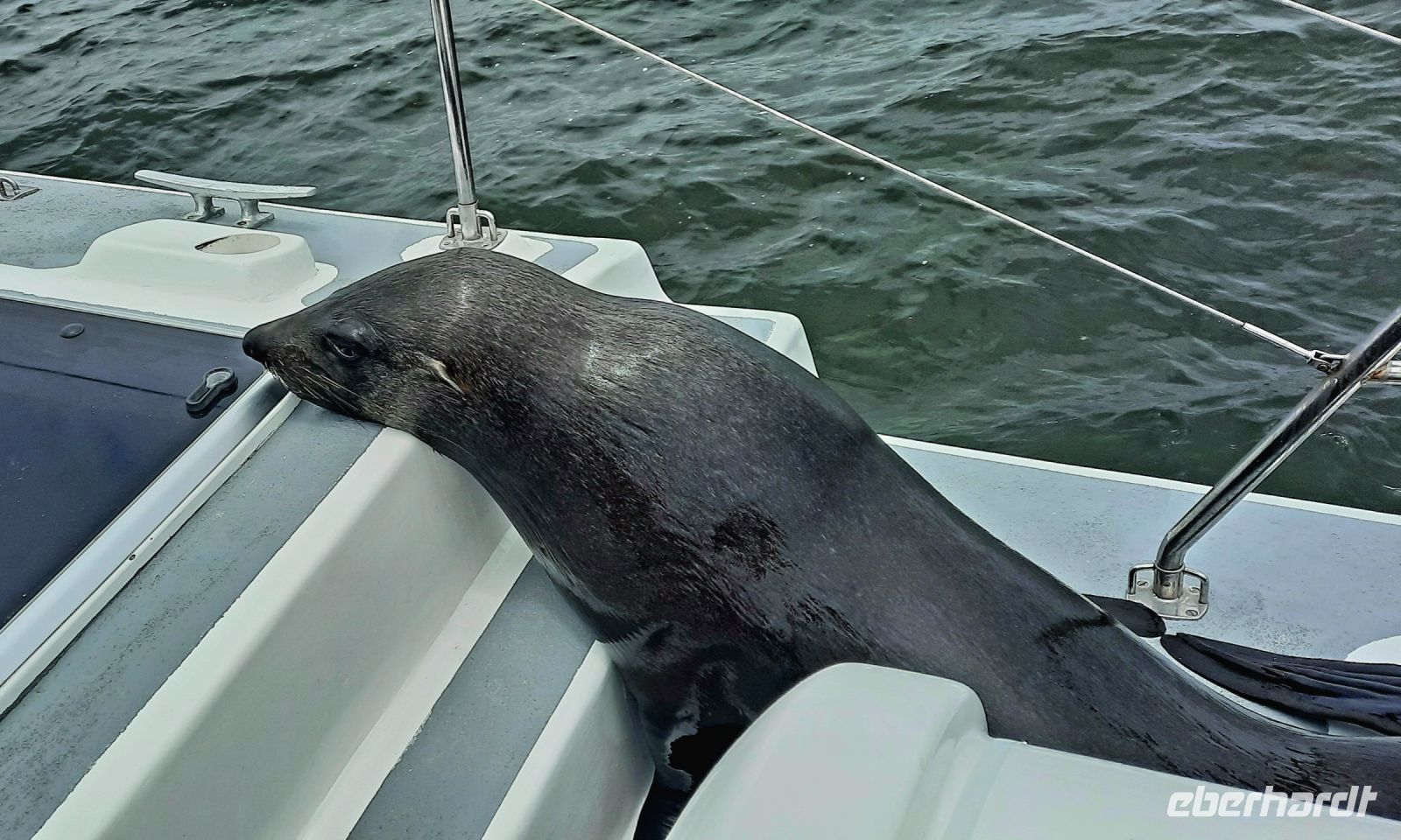 Bootsfahrt mit dem Katamaran durch die Lagune von Walvis Bay. Chef Ernst begrüßte uns mit seinem norddeutschen Esprit und bat uns, seine unterhaltsamen Sicherheitsanweisung doch "Ernst" zu nehmen. Nach den vergangenen, heißen Tagen war heute richtig kühl, so kamen unsere dickeren Jacken endlich mal zum Einsatz.Gleich zu Beginn kamen mehrere "blinde" Passagiere an Bord. Robben und die Pelikane, wobei einer sehr dreist unseren Harolf als Landeplatz nutzte. Seebär Ernst erzählte uns auf sehr lustige Weise Interessantes über die Bucht, die Landzunge und seine "Bewohner". Dabei wurden wir mit Kaffee und ebenso wärmenden Sherry (in Alibi-Tassen) bewirtet. Vorbei an den Austern-Tonnen, auf denen es sich Robben gemütlich gemacht hatten, schipperten wir zur Landzunge, auf deren Spitze der schwarz-weiße Leuchtturm steht. Da nicht so großer Wellengang war, konnten wir relativ nah heran. Viele Robbenkolonien haben es sich hier bequem gemacht. Von Weiten hörten wir schon das laute Rufen der kleinen Heuler. Die niedlichen Robben fühlten sich sichtlich wohl und ließen sich von den Kanufahrern, die durch das kalte Wasser paddelten, nicht stören. Plötzlich schauten alle gebannt auf das Wasser Und..... ein die Flosse eines Mond- oder Sonnenfisches war zu sehen. Dieses stattliche Exemplar schwamm dann auch ganz nah an uns vorbei. WOW, ein Mondfisch ist wirklich selten zu sehen! Für mich war es erst das 3. Mal, dass ich einem zu Gesicht bekam. Danke, liebe Reisegruppe. Auf der Rückfahrt sahen wir noch eine, mit Komoranen und anderen Wasservögeln voll besetzte Guano Plattform. Ja, früher verdiente man hier mit Vogel-Ausscheidungen enorm viel Geld, manch einer wurde sogar Millionär. Später ließen wir die Korken knallen und stießen mit südafrikanischen Sekt auf diesen perfekten Vormittag an. Dazu schlemmten wir vom kleinen Buffet mit frischen Austern, Meeresfrüchten, Fisch, Fleisch und Süßem. Seeluft macht eben großen Appetit! Bevor wir nach Swakopmund zurückfuhren, unternahmen wir noch einen Abstecher zu den Flamingos in der Bucht und konnten Hunderte von Flamingos, die im Sonnenschein durch das flache Wasser wadeten, beobachten - ein herrlicher Anblick. Den freien Nachmittag konnten die Gäste für ganz individuelle Erkundungen nutzen, die meisten gingen natürlich shoppen.. Am Abend hatten wir Date an der bekannten Seebrücke. Nach einem Spaziergang über die Jetty wurden wir im Restaurant The Tug, direkt an der Seebrücke zum Abendessen erwartet. Hier schlemmten wir wieder a la carte und ließen den letzten Tag am Atlantik ausklingen.