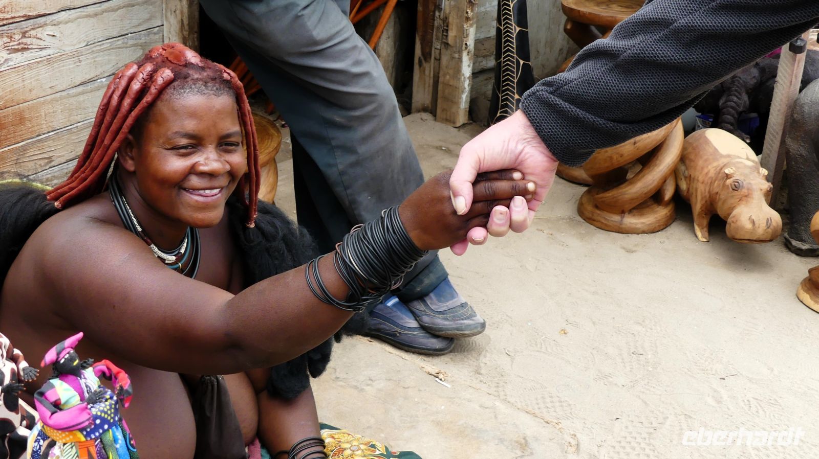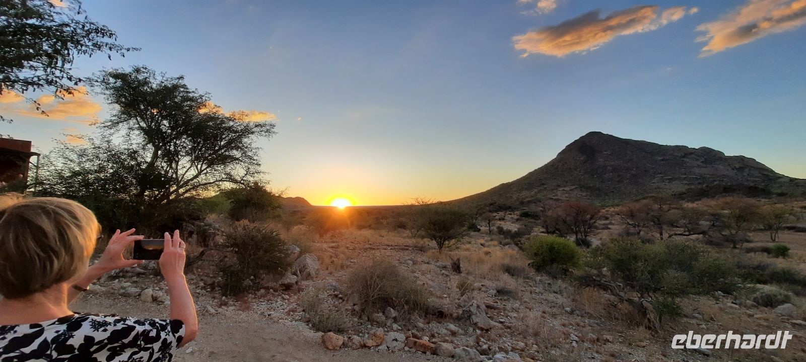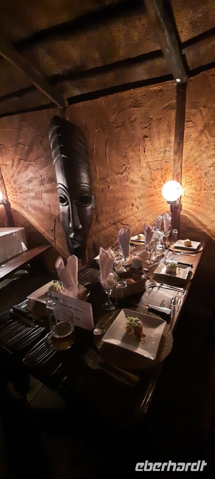 Das wiederum umwerfende Frühstücksbuffet erhellte unsere Gemüter und wir freuten uns auf den Tag. Kurz noch ein Stopp im Supermarkt und schon ging es weiter. Entlang der Atlantikküste, zunächst auf Asphalt, fuhren wir Richtung Henties Bay. Wir sahen viele Angelspots, Salzgewinnungs- und Meerwasser-Entsalzungsanlagen (Wasserversorgung). Später bogen wir wieder auf Sand-Pad ins Landesinnere, ins Damaraland ab. Diese karge und steinige Gegend ist das Hauptsiedlungsgebiet dieser Bevölkerungsgruppe (ca. 9 % der Gesamtbevölkerung Namibias). Während der Apartheid (südafrikanisches Mandatsgebiet) war die Region zum Homeland erklärt. Zum Glück sind diese Zeiten vorbei. In der Ferne sahen wir auch die Rössing-Mine (Uranium) und später später dann die bizarren Felsformationen des Erongo Gebirges. Die einmalige Landschaft mit Inselbergen und Granitfelsen beeindruckte uns. Diese Gegend ist auch reich an Halbedelsteinen, die von den Damaras am Straßenrand feil geboten werden. Auch hier wurde wieder ausgiebig geshoppt. Die Spitzkoppe, auch das Matterhorn von Namibia genannt, war eine passende Location für unsere Mittagspause. Jennifer, eine Damara führte uns zu den über 1.000 Jahre alten Felszeichnungen der San, die an der Spitzkoppe im Small Bush Mans Paradise zu finden sind. Nahe des Rock Arch, einem durch Erosion ausgewaschenen, sehr markanten Felsbogen fanden wir ein halbwegs schattiges Plätzchen und picknickten in gemütlicher Runde. Auf unserer Weiterfahrt sammelten sich dunkle Regenwolken über dem Felsmassiv des Hohensteins zusammen. Aus der Ferne sahen wir Blitze und den schwarzen Regenvorhang - ein wahnsinniges Naturschauspiel! Genau dorthin mussten wir, doch wir blieben trocken, den das Gewitter blieb hinter dem Felsen hängen. Heute übernachteten wir in der Hohenstein Lodge, die sich am Fuße des höchsten Gipfels des Erongo Gebirges, dem eben schon erwähnten Hohenstein befindet. Das private Gelände der Farm ist gerade mal 500 Hektar groß, aber von unendlicher Schönheit. Selbst die Giraffen waren zur Begrüßung versammelt. Bei Kaffee und Kuchen konnten wir uns gar nicht satt sehen. Zum fantastischen Sonnenuntergang trafen wir uns zum Foto-Shooting an der Feuerstelle. Mit dem passenden Getränk in der Hand hielten wir die einzigartige Stimmung auf unseren Fotos fest. Zum Abend wurde uns ein leckeres Menü auf der Terrasse serviert. Auch eine Maus hatte wohl Hunger und beäugte uns aus ihrem Astloch.