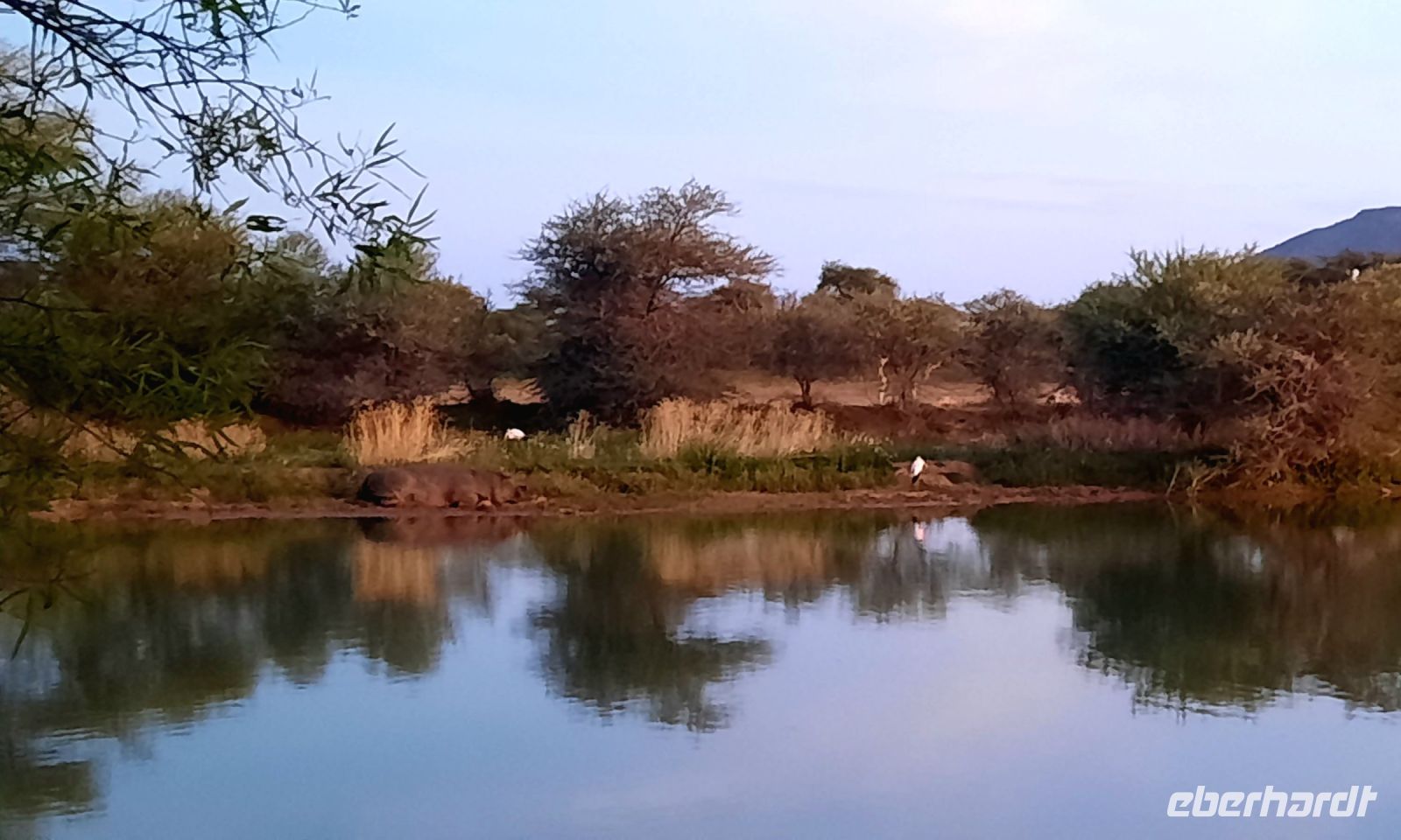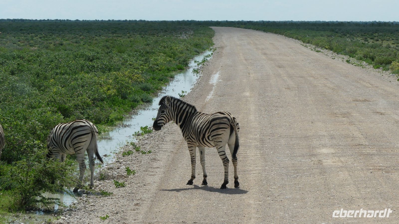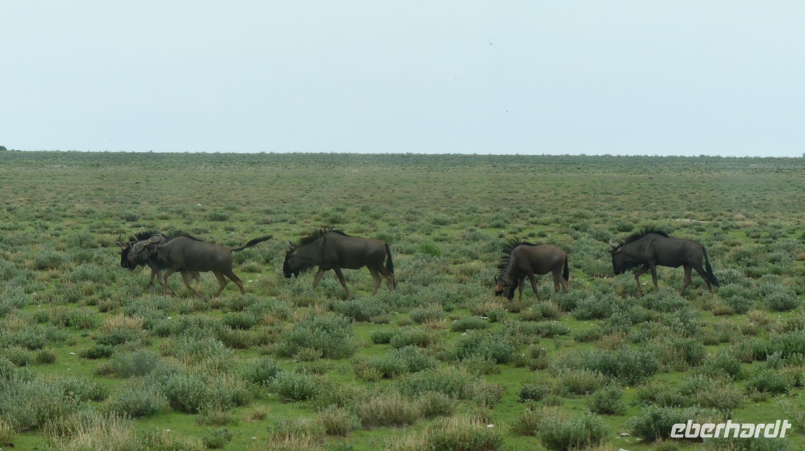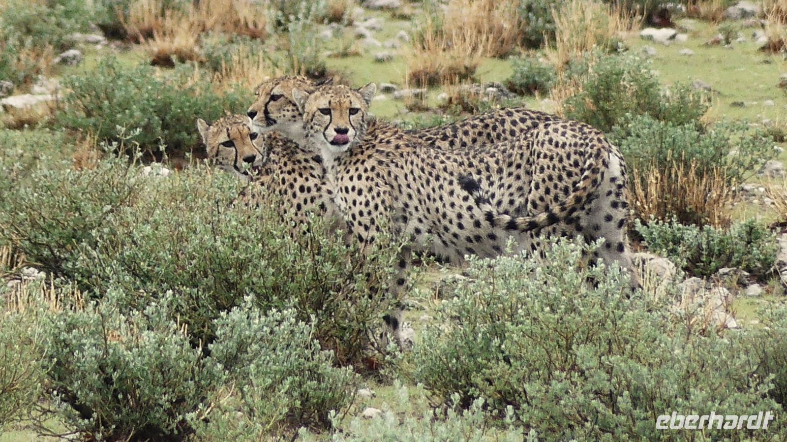 Südwestafrika) den damals fast 100.000 km² großen Park als Schutzgebiet. Wilderei und Großwildjagd hatten den Tierbestand damals auf dramatische Weise reduziert. Später und während der Apartheid wurde der Park auf seine heutige Größe (ca. 22.000 km ²) verkleinert und 1964 zum Nationalpark erklärt. Am ersten, verschlammten Wasserloch Ombika gab es nichts Großes zu sehen. Also weiter bis zum Hauptcamp und danach versuchten wir unser Glück an verschiedenen Wasserlöchern. Vom Regen war es überall grün, die Pad mit Pfützen übersät. Später sahen wir in der Ferne nur noch die Hinterteile von 2 Spitzmaul-Nashorn-Mamas mit ihrem Nachwuchs im Busch verschwinden. Leider hatten wir sie am Wasserloch verfehlt. Man muß eben zur richtigen Zeit am richtigen Ort sein. Giraffen, Zebras, Sprinkböcke, Oryxe, Gnus, Impalas - eben das Übliche. Doch dann richteten sich unsere Augen auf eine Zebra Familie, die angespannt in eine Richtung schaute. Wow, eine 3 Geparden - wahrscheinlich Mama, Papa und Halbwüchsiger. Was für ein Glück! Später konzentrierten wir uns auf die grüne Vegetation im Etosha. Überall spross das Grün aus dem Trockenen, Blümchen blühten..... Das wäre doch ein Paradis für die Tiere. oder? So manches Gefiederte wurde dann entdeckt: Kaptriel, Strauße, Riesen- und Gackeltrappen, ein Weißburzelsinghabicht, Blaue Kraniche (Nationalvogel Südafrikas) und die Tierherden um Springbock, Zebra, Gnu, Kuhantilope, Impala & Co wurden größer. Wir pirschten am Rand der Etosha Pfanne, bis zum Horizont ein weißes Nichts. Die Etosha Pan (Pfanne) ist zentraler Mittelpunkt des Parks. Der große, weiße Platz wie ihn die Ovambos nennen, ist knapp 5.000 km ² groß – eine faszinierende Unendlichkeit. Zwei einzelne Schirmakazien boten ein schönes Fotomotiv, so typisch ist für den Park. Bei den Helio Hügeln, der einzigen richtigen Erhebung, im Camp Halali verbrachten wir unsere Mittagspause bei einem Picknick. Anschließend fuhren wir entspannt zurück und erfreuten uns an den Tieren, die sich in den saftig grünen Ebenen des Etoshas sichtlich wohl fühlten. Am späteren Nachmittag waren wir in unserer Lodge zurück. In der Lodge bedienten wir uns wieder am reichhaltigen Buffet und Eland, Kudu & Co vom Grill.