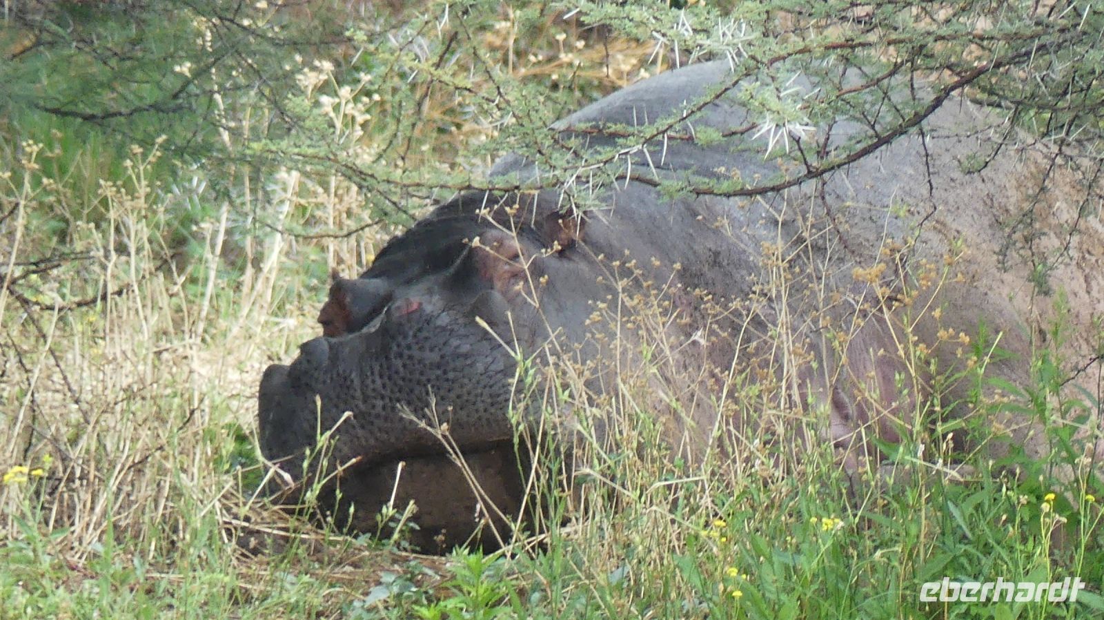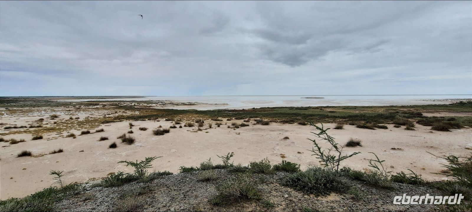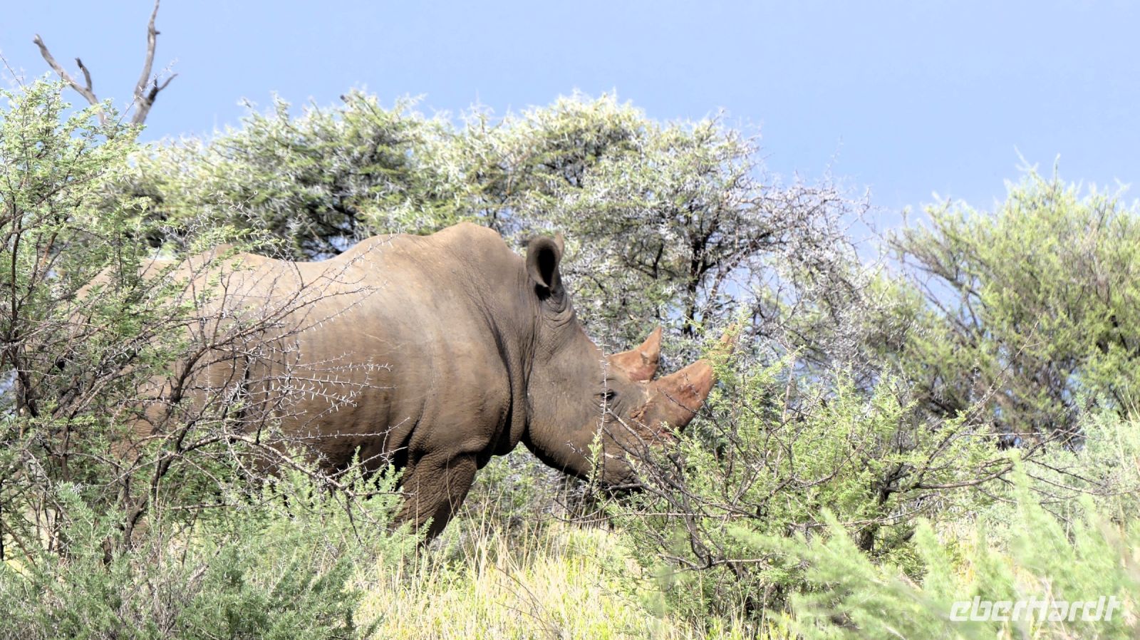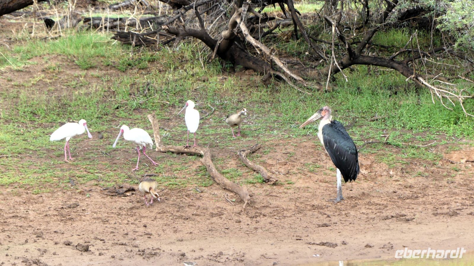 Südwestafrika) den damals fast 100.000 km² großen Park als Schutzgebiet. Wilderei und Großwildjagd hatten den Tierbestand damals auf dramatische Weise reduziert. Später und während der Apartheid wurde der Park auf seine heutige Größe (ca. 22.000 km ²) verkleinert und 1964 zum Nationalpark erklärt. Am ersten, verschlammten Wasserloch Ombika gab es nichts Großes zu sehen. Also weiter bis zum Hauptcamp und danach versuchten wir unser Glück an verschiedenen Wasserlöchern. Vom Regen war es überall grün, die Pad mit Pfützen übersät. Später sahen wir in der Ferne nur noch die Hinterteile von 2 Spitzmaul-Nashorn-Mamas mit ihrem Nachwuchs im Busch verschwinden. Leider hatten wir sie am Wasserloch verfehlt. Man muß eben zur richtigen Zeit am richtigen Ort sein. Giraffen, Zebras, Sprinkböcke, Oryxe, Gnus, Impalas - eben das Übliche. Doch dann richteten sich unsere Augen auf eine Zebra Familie, die angespannt in eine Richtung schaute. Wow, eine 3 Geparden - wahrscheinlich Mama, Papa und Halbwüchsiger. Was für ein Glück! Später konzentrierten wir uns auf die grüne Vegetation im Etosha. Überall spross das Grün aus dem Trockenen, Blümchen blühten..... Das wäre doch ein Paradis für die Tiere. oder? So manches Gefiederte wurde dann entdeckt: Kaptriel, Strauße, Riesen- und Gackeltrappen, ein Weißburzelsinghabicht, Blaue Kraniche (Nationalvogel Südafrikas) und die Tierherden um Springbock, Zebra, Gnu, Kuhantilope, Impala & Co wurden größer. Wir pirschten am Rand der Etosha Pfanne, bis zum Horizont ein weißes Nichts. Die Etosha Pan (Pfanne) ist zentraler Mittelpunkt des Parks. Der große, weiße Platz wie ihn die Ovambos nennen, ist knapp 5.000 km ² groß – eine faszinierende Unendlichkeit. Zwei einzelne Schirmakazien boten ein schönes Fotomotiv, so typisch ist für den Park. Bei den Helio Hügeln, der einzigen richtigen Erhebung, im Camp Halali verbrachten wir unsere Mittagspause bei einem Picknick. Anschließend fuhren wir entspannt zurück und erfreuten uns an den Tieren, die sich in den saftig grünen Ebenen des Etoshas sichtlich wohl fühlten. Am späteren Nachmittag waren wir in unserer Lodge zurück. In der Lodge bedienten wir uns wieder am reichhaltigen Buffet und Eland, Kudu & Co vom Grill.