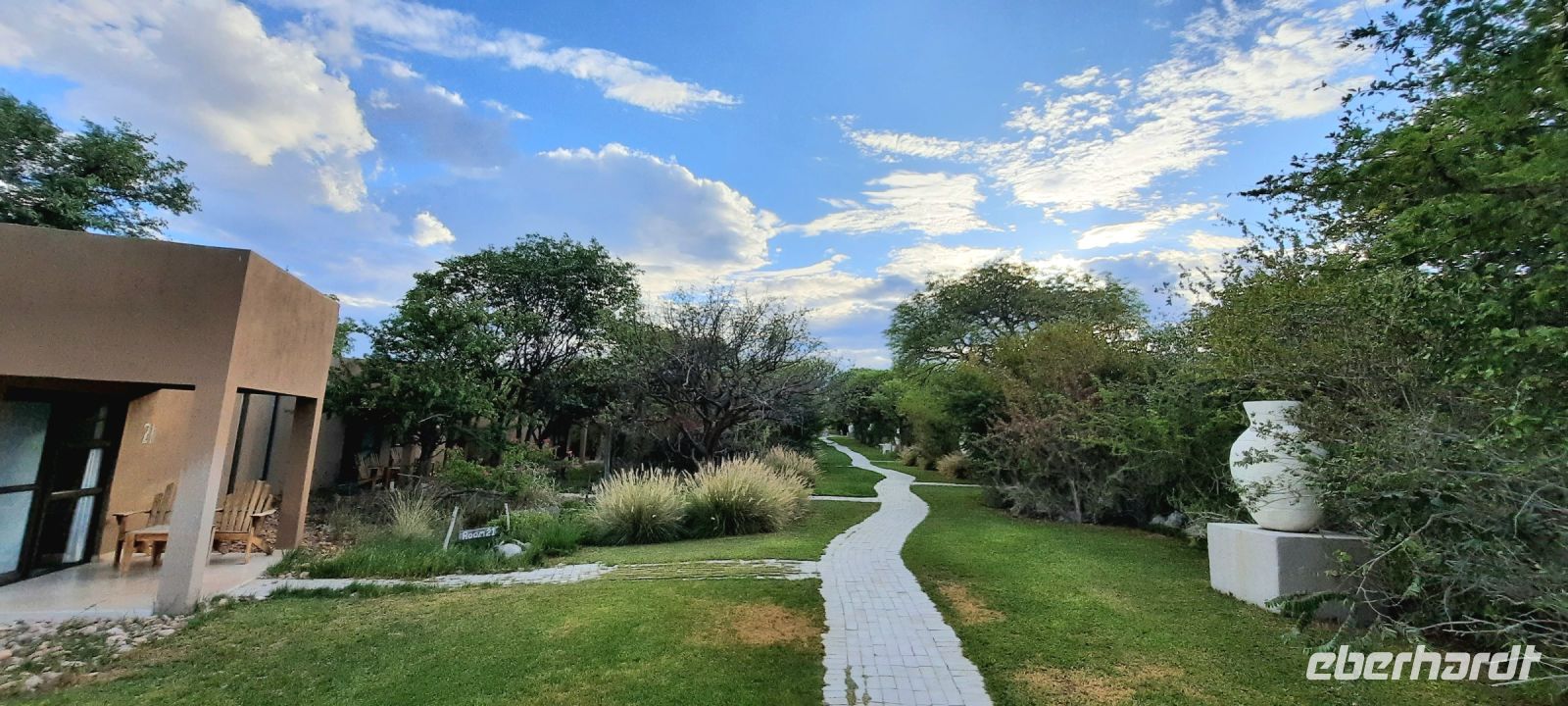 Nach dem Frühstück fuhren wir via Omaruru, einem für die Herero bedeutenden Ort gelangten wir zum "belebten" Ort Kalkfeld. Unterwegs bestaunten wir die vielen Termitenhügel verschiedenster Baustile. An einem Termintenbau hielten wir natürlich an. Harold erzählte uns über die Termitenvölker und vom dem riesigen Pilz, der eine besondere Delikatesse ist. Weiter ging es nach Outjo. Der Name bedeutet in der Herero-Sprache kleiner Hügel und befindet sich auf der touristischen Hauptroute zum Etosha. Der Tourismus ist eine der Haupteinnahmequellen Namibias. Entsprechend groß ist Outjo, ein hübscher Ort mit vielen Geschäften und Souvenir-Shops. In der hiesigen Bäckerei stärkten wir uns bei Kuchen, Schweinohren oder herzhaften Pies, bevor wir Richtung Etosha weiter fuhren. Der Etosha selbst liegt auf Ovambo Gebiet. Die mit fast 48% größte Bevölkerungsgruppe ist vorrangig im dicht besiedelten Norden, oberhalb des Etosha Parks zu Hause. Von Outjo war es nicht mehr weit zur Toshari Lodge, wo wir am frühen Nachmittag eincheckten. Die Lodge ist eine grüne Oase, nicht nur, weil es in den letzten Tagen ausgiebig geregnet hatte. Sondern auch, weil sich die Lodge ausschließlich mit Solarenergie versorgt. Da der Himmel in den letzten Tagen grau war, waren auch die Batterien nicht voll aufgeladen und Strom musste gespart werden. So war der Strom für Elektrizität in unseren Chalets gedrosselt und Steckdose sowie Klimaanlage öfters Pause. Am Nachmittag unternahmen wir dann eine erste Pirschfahrt im bekannten Etosha Nationalpark. Obwohl es sehr trocken und heiß war, waren die Wasserlöcher verwaist. Ringsum war es grün und die Tiere hatten genug zum Fressen. Wir sahen dennoch Zebras, Oryxe, Gnus und Impalas und hofften auf größere Ausbeute am nächsten Tag.