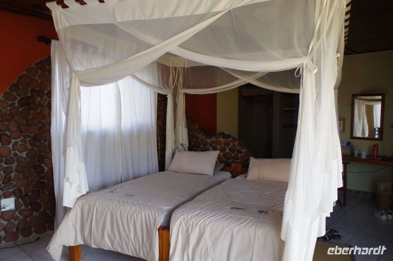 Nachdem wir uns bei einem guten Frühstück gestärkt hatten, fuhren wir zunächst nach Mariental zurück. Bei Mariental befindet sich der Hardap Staudamm. Daher wird in dieser Region viel Landwirtschaft betrieben. Im hiesigen Superspar deckten wir uns mit allerlei "Nützlichen" für unterwegs ein. Gegen Mittag erreichten wir die private Farm Gariganus, mit ihren kuriosen Gästeunterkünften. Im Buch