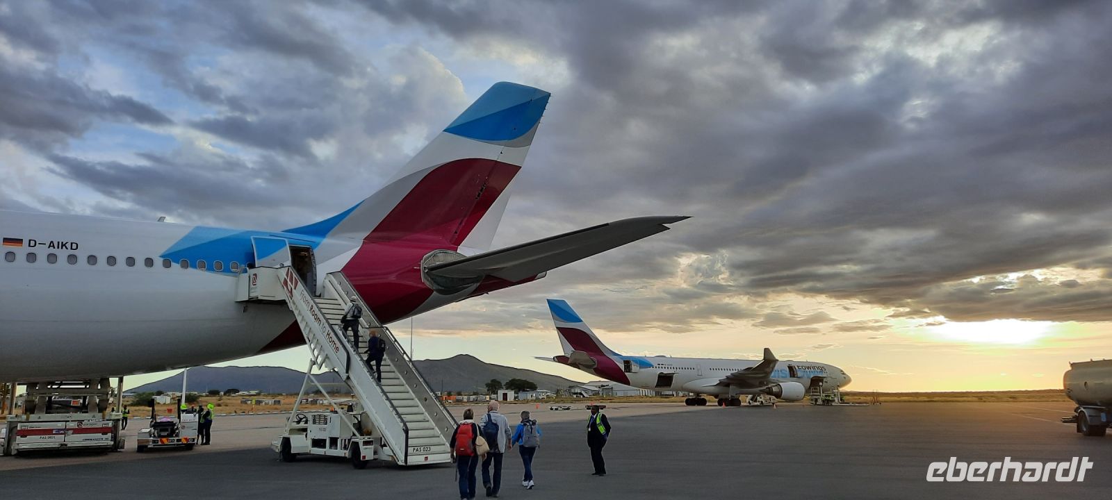 Der letzte Rauch des nabelden Raachermannels war verflogen, die Koffer mit sommerlichen Outfits gepackt und die vom Weihnachtsfest übrig gebliebenen Plätzchen als Reiseproviant verstaut. Per Flug, Bahn und Auto gelangten alle Gäste, der kleinen Reisegruppe (ohne Stau, Streik und Flugverspätung)!) pünktlich zum Flughafen Frankfurt/Main. Am Abflug-Gate zum gemeinsamen Weiterflug nach Windhoek begrüßte Reisebegleiterin Annett ihre Gäste und schon konnte es losgehen. An diesem Tag flogen zwei Maschinen nach Windhoek, wobei die erste geplante Maschine fast zur gleichen Zeit abflog wie unsere, also mit 2 h Verspätung. Unser Fluggerät wurde wahrscheinlich noch gewechselt und so wurden auch unsere Sitzplätze geändert, aber wir flogen fast pünktlich ab!