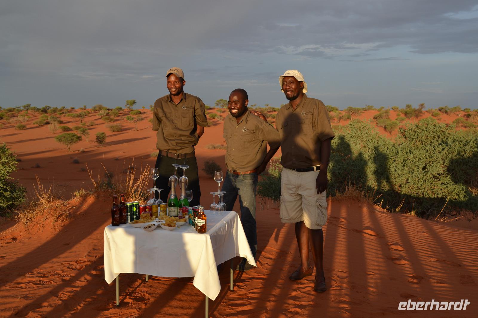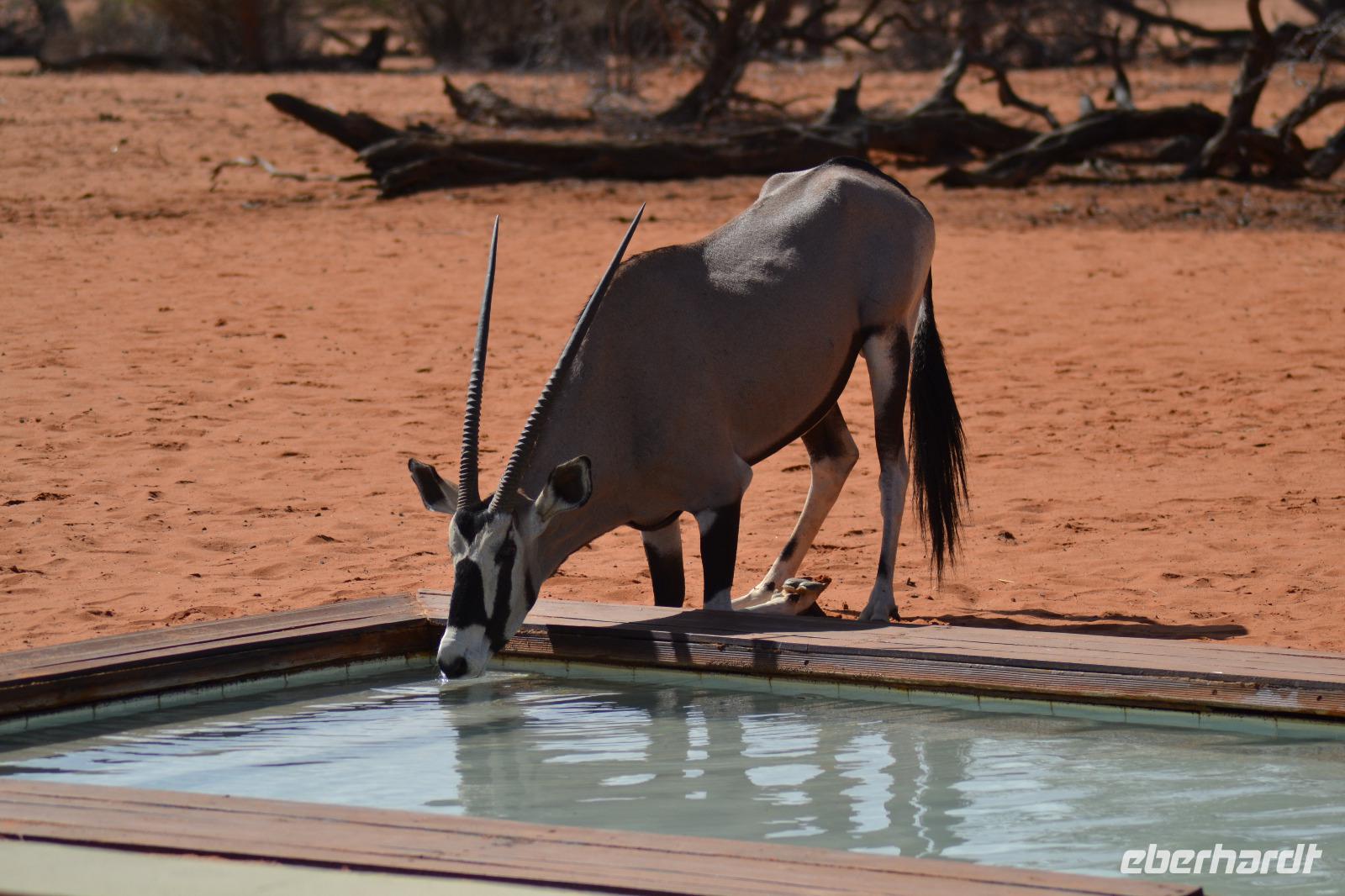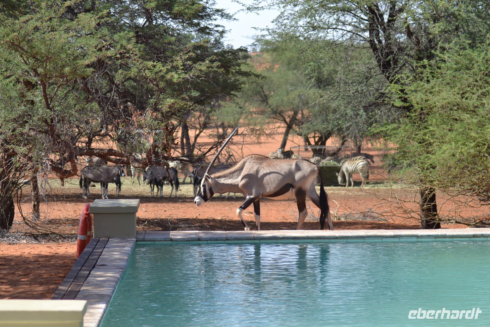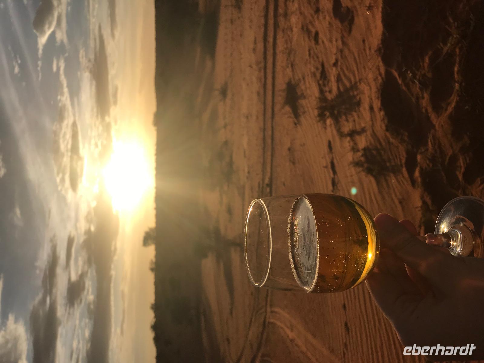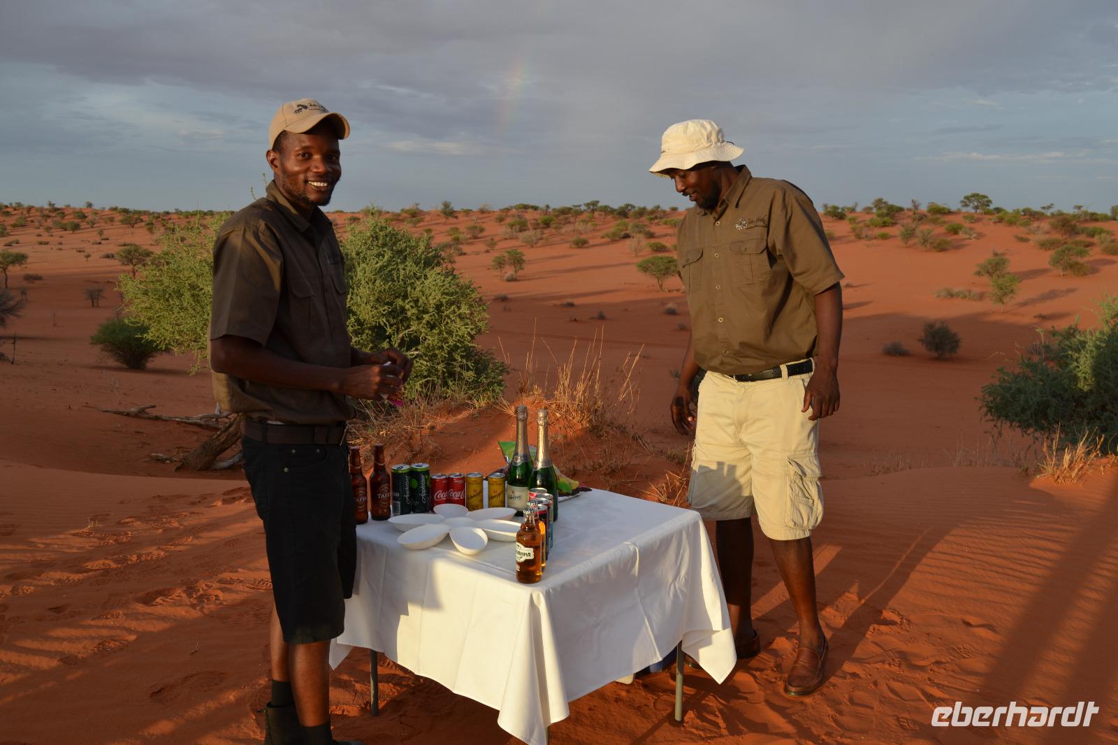 Nach einem ausgiebigen Frühstück mit einem tollen Panoramablick über die Stadt starteten wir unsere erste lange Strecke mit ca. 300 km in die Kalahari Halbwüste. Doch zunächst hatten Laura und Dagmar noch ein paar geheime Erledigungen vor. Nachdem alles im Truck verladen war ging die Fahrt über Heldenacker und somit die Überquerung des südlichen Wendekreises des Steinbocks weiter. An einer Tankstelle in Rehoboth nutzen wir die Gelegenheit unseren Kaffee weg zu bringen. Kurz hinter dem Ort Verliesen wir die asphaltierten Straßen und begaben uns auf die Schotterpisten in die Kalahari. Unterwegs Briefte uns Dagmar mit den wichtigsten Besonderheiten des Landes und worauf man unbedingt achten sollte. Besonders die Malaria Vorsorge mittels eines Gin Tonics blieb uns gut im Gedächtnis. Dies war der erste alkoholische Tipp unserer Reiseleiterin. Daran wollten wir uns auf jeden Fall halten. Mittags erreichten wir bereits unsere tolle Lodge in mitten der Natur! Einer der drei Unterkünfte in diesem privaten Gelände und auch die komfortabelste. Nach einer Pause, die wir für eigene Erkundigungen des Geländes mit ersten Tierbeobachtung, ein Sprung in den kühlen Pool oder ein Getränk an der Bar nutzen. Zum Nachmittag trafen wir uns an der Terrasse auf ein Stück Kuchen und Kaffee. Im Anschluss stand die erste Sundowner Fahrt in offenen Jeeps statt. Wir sahen unwahrscheinlich viele Tiere. Kudus, Springböcke, Zebras, Giraffen, Strauße, Löwe, Löffelhunde, und vieles mehr. Nach einer 2,5 stündigen Fahrt durch die wunderbare Natur genossen wir bei einem kühlen Getränk und kleinen Snacks den Sonnenuntergang auf der Düne. Im Hintergrund der grau bedeckte Himmel und am Ende des Horizontes ein Regenbogen. Es folgte der zweite alkoholische Tipp von Dagmar. Wir sollten alle ein Glas Sekt trinken, damit sollte der Regen kommen. Als wir unsere Lodge wieder erreichten wartet bereits ein romantisch gedeckter Tisch auf der Terrasse auf uns. Wir ließen den Abend bei einem, zwei, oder vielleicht drei Gläsern Wein ausklingen und begaben uns anschließend auf den teilweise abenteuerlichen Weg zurück in unsere Chalets.