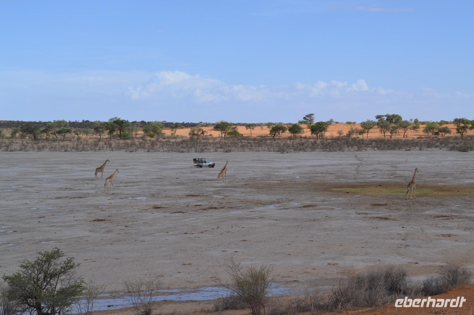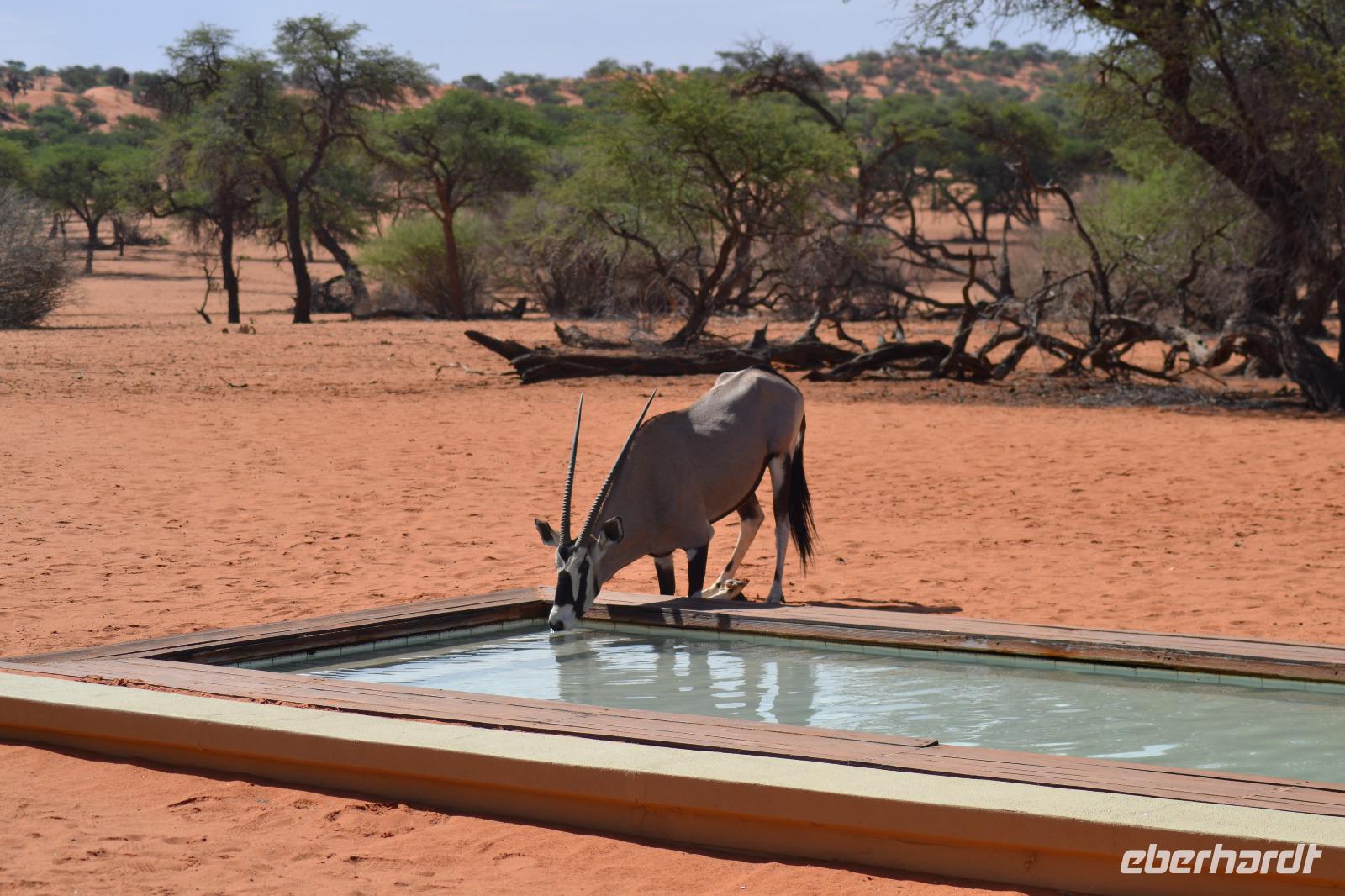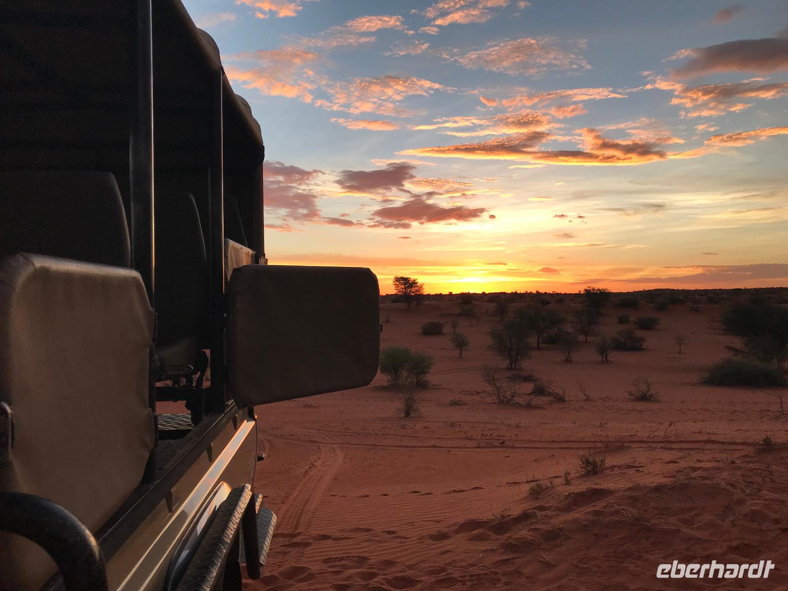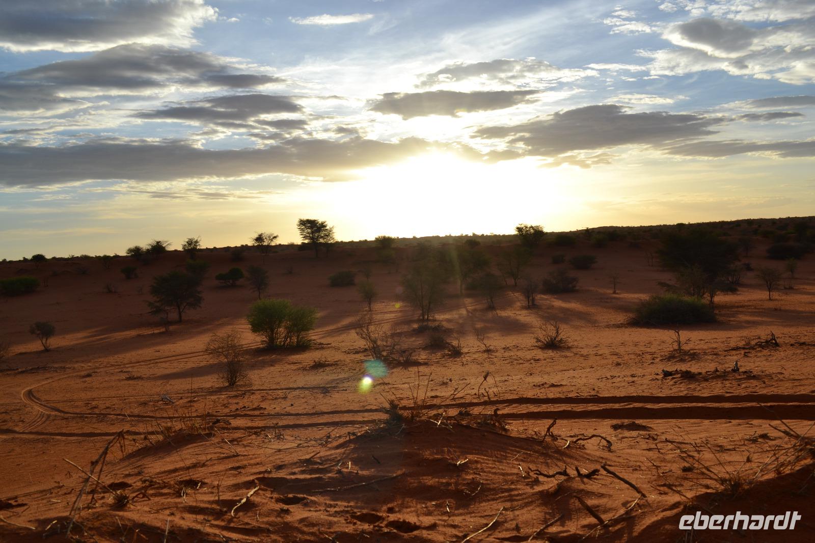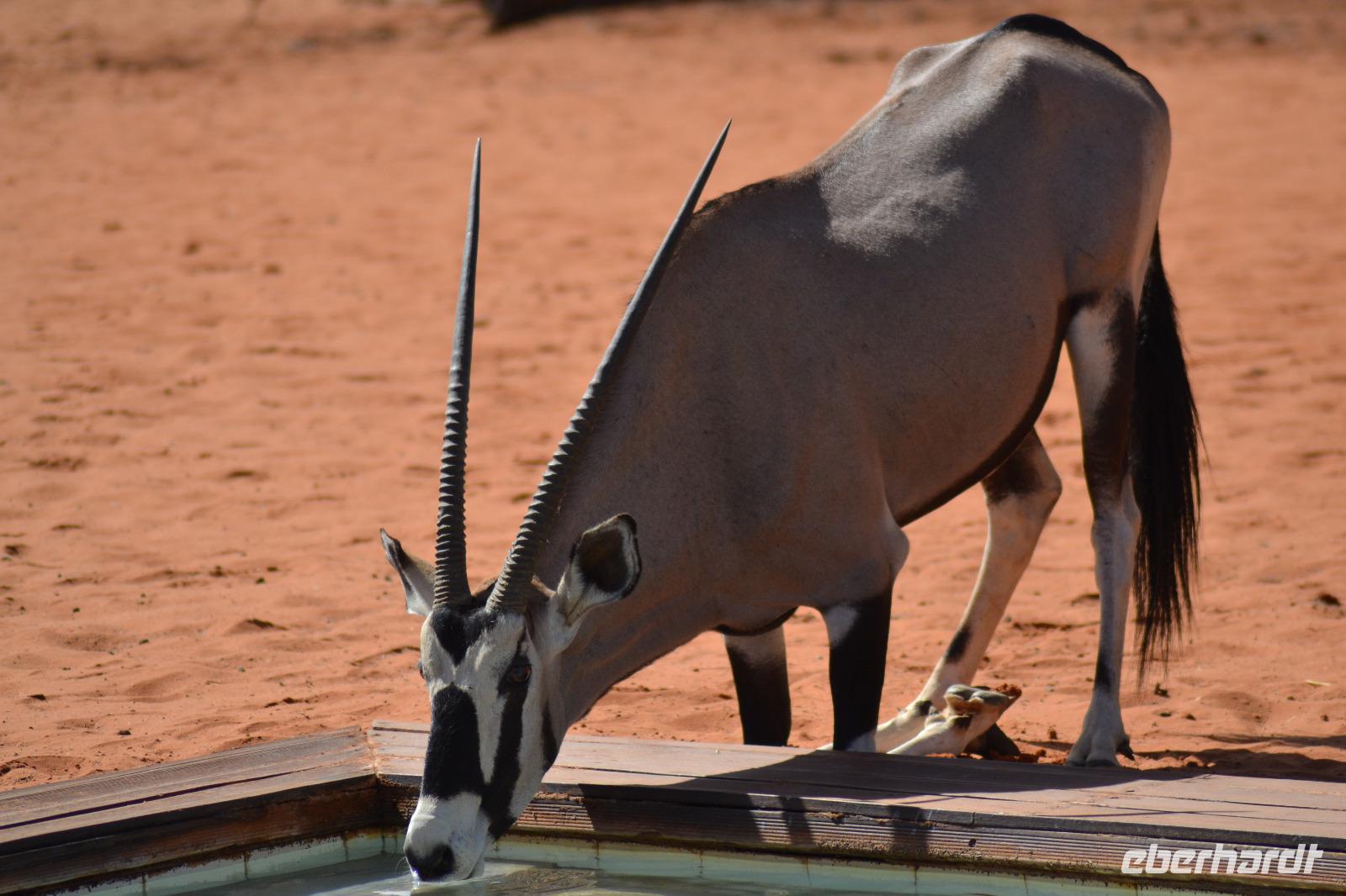 Nach einem ausgiebigen Frühstück mit einem tollen Panoramablick über die Stadt starteten wir unsere erste lange Strecke mit ca. 300 km in die Kalahari Halbwüste. Doch zunächst hatten Laura und Dagmar noch ein paar geheime Erledigungen vor. Nachdem alles im Truck verladen war ging die Fahrt über Heldenacker und somit die Überquerung des südlichen Wendekreises des Steinbocks weiter. An einer Tankstelle in Rehoboth nutzen wir die Gelegenheit unseren Kaffee weg zu bringen. Kurz hinter dem Ort Verliesen wir die asphaltierten Straßen und begaben uns auf die Schotterpisten in die Kalahari. Unterwegs Briefte uns Dagmar mit den wichtigsten Besonderheiten des Landes und worauf man unbedingt achten sollte. Besonders die Malaria Vorsorge mittels eines Gin Tonics blieb uns gut im Gedächtnis. Dies war der erste alkoholische Tipp unserer Reiseleiterin. Daran wollten wir uns auf jeden Fall halten. Mittags erreichten wir bereits unsere tolle Lodge in mitten der Natur! Einer der drei Unterkünfte in diesem privaten Gelände und auch die komfortabelste. Nach einer Pause, die wir für eigene Erkundigungen des Geländes mit ersten Tierbeobachtung, ein Sprung in den kühlen Pool oder ein Getränk an der Bar nutzen. Zum Nachmittag trafen wir uns an der Terrasse auf ein Stück Kuchen und Kaffee. Im Anschluss stand die erste Sundowner Fahrt in offenen Jeeps statt. Wir sahen unwahrscheinlich viele Tiere. Kudus, Springböcke, Zebras, Giraffen, Strauße, Löwe, Löffelhunde, und vieles mehr. Nach einer 2,5 stündigen Fahrt durch die wunderbare Natur genossen wir bei einem kühlen Getränk und kleinen Snacks den Sonnenuntergang auf der Düne. Im Hintergrund der grau bedeckte Himmel und am Ende des Horizontes ein Regenbogen. Es folgte der zweite alkoholische Tipp von Dagmar. Wir sollten alle ein Glas Sekt trinken, damit sollte der Regen kommen. Als wir unsere Lodge wieder erreichten wartet bereits ein romantisch gedeckter Tisch auf der Terrasse auf uns. Wir ließen den Abend bei einem, zwei, oder vielleicht drei Gläsern Wein ausklingen und begaben uns anschließend auf den teilweise abenteuerlichen Weg zurück in unsere Chalets.