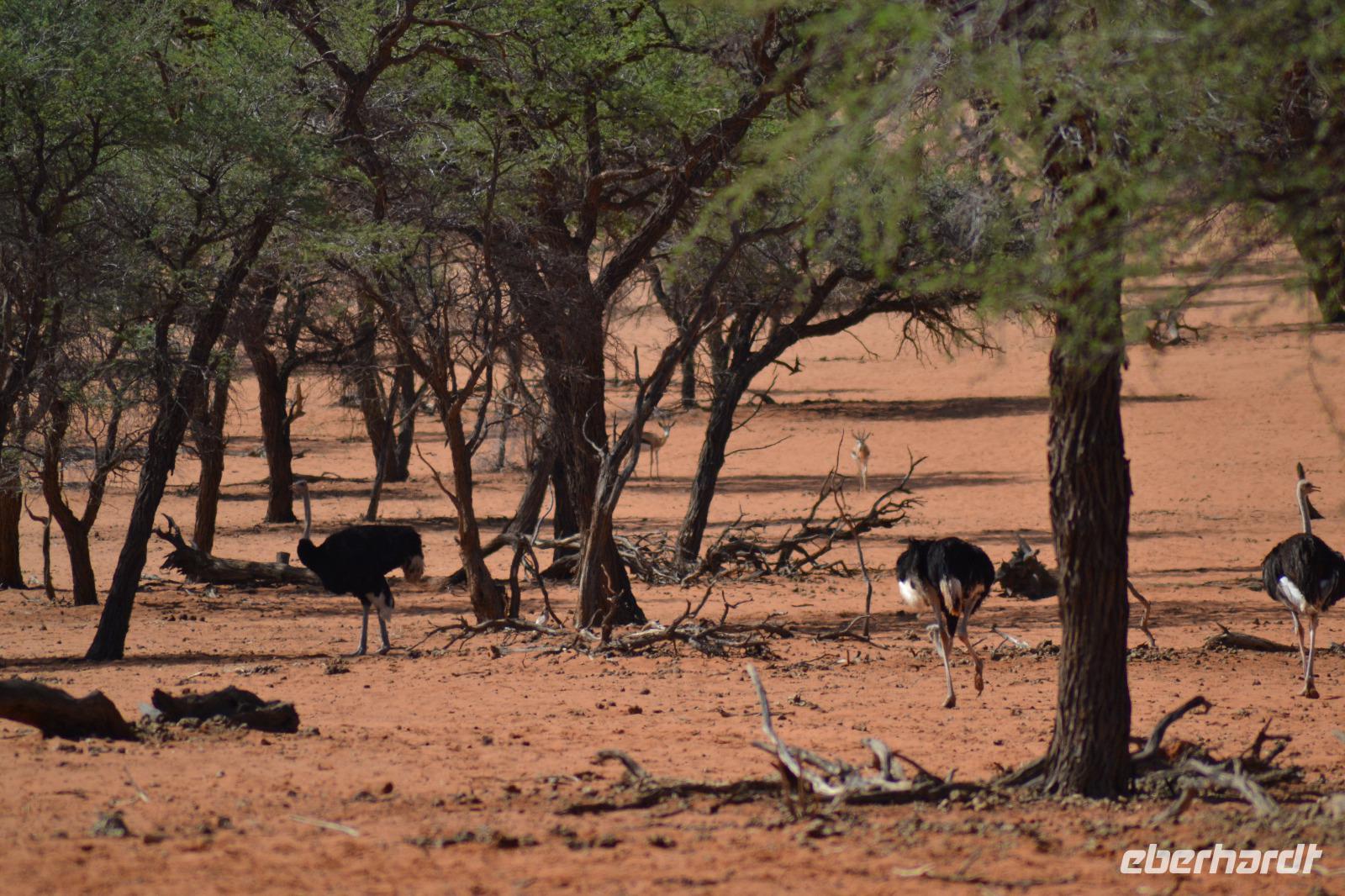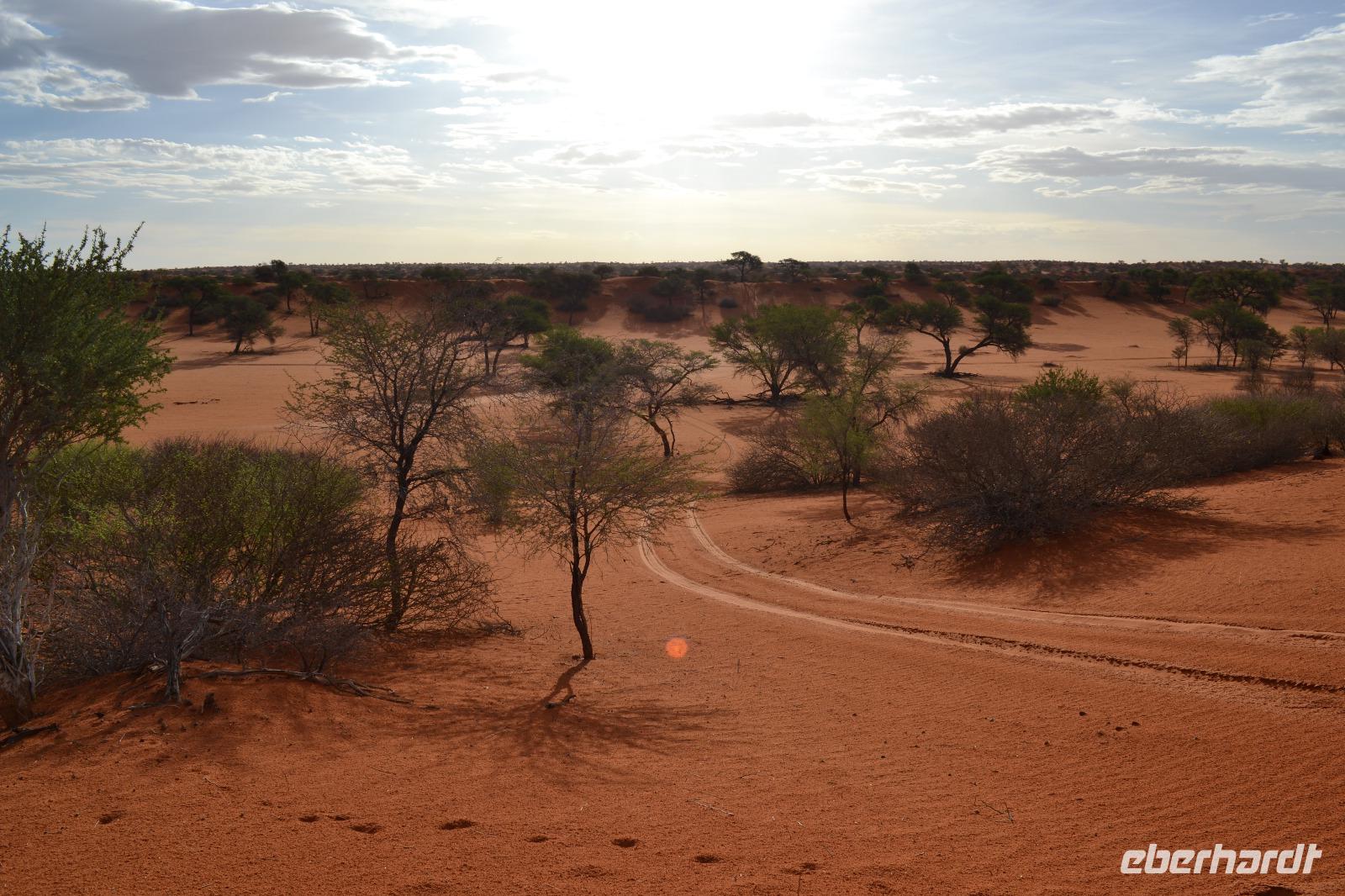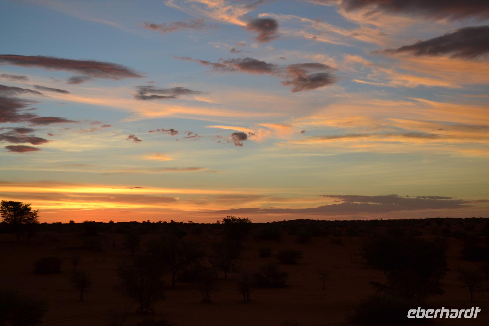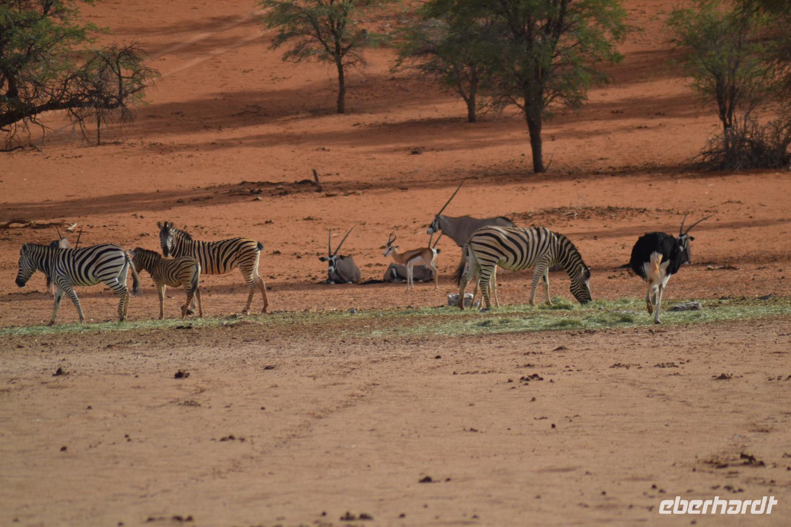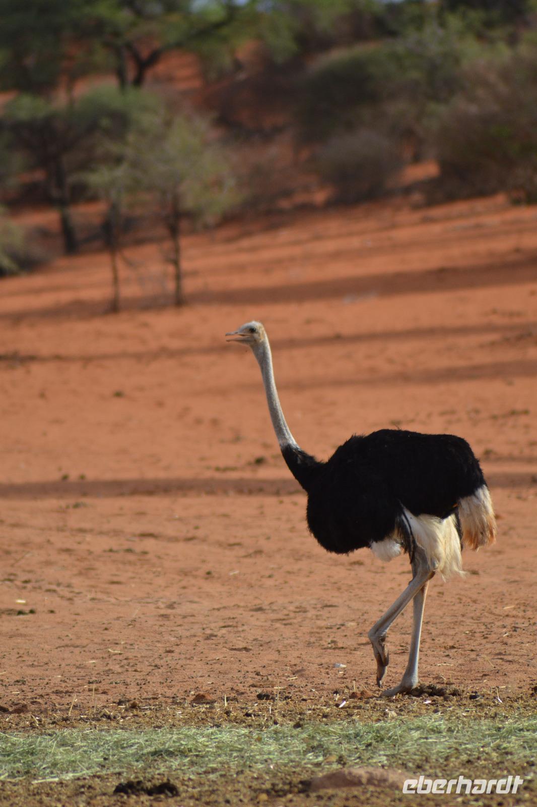 Nach einem ausgiebigen Frühstück mit einem tollen Panoramablick über die Stadt starteten wir unsere erste lange Strecke mit ca. 300 km in die Kalahari Halbwüste. Doch zunächst hatten Laura und Dagmar noch ein paar geheime Erledigungen vor. Nachdem alles im Truck verladen war ging die Fahrt über Heldenacker und somit die Überquerung des südlichen Wendekreises des Steinbocks weiter. An einer Tankstelle in Rehoboth nutzen wir die Gelegenheit unseren Kaffee weg zu bringen. Kurz hinter dem Ort Verliesen wir die asphaltierten Straßen und begaben uns auf die Schotterpisten in die Kalahari. Unterwegs Briefte uns Dagmar mit den wichtigsten Besonderheiten des Landes und worauf man unbedingt achten sollte. Besonders die Malaria Vorsorge mittels eines Gin Tonics blieb uns gut im Gedächtnis. Dies war der erste alkoholische Tipp unserer Reiseleiterin. Daran wollten wir uns auf jeden Fall halten. Mittags erreichten wir bereits unsere tolle Lodge in mitten der Natur! Einer der drei Unterkünfte in diesem privaten Gelände und auch die komfortabelste. Nach einer Pause, die wir für eigene Erkundigungen des Geländes mit ersten Tierbeobachtung, ein Sprung in den kühlen Pool oder ein Getränk an der Bar nutzen. Zum Nachmittag trafen wir uns an der Terrasse auf ein Stück Kuchen und Kaffee. Im Anschluss stand die erste Sundowner Fahrt in offenen Jeeps statt. Wir sahen unwahrscheinlich viele Tiere. Kudus, Springböcke, Zebras, Giraffen, Strauße, Löwe, Löffelhunde, und vieles mehr. Nach einer 2,5 stündigen Fahrt durch die wunderbare Natur genossen wir bei einem kühlen Getränk und kleinen Snacks den Sonnenuntergang auf der Düne. Im Hintergrund der grau bedeckte Himmel und am Ende des Horizontes ein Regenbogen. Es folgte der zweite alkoholische Tipp von Dagmar. Wir sollten alle ein Glas Sekt trinken, damit sollte der Regen kommen. Als wir unsere Lodge wieder erreichten wartet bereits ein romantisch gedeckter Tisch auf der Terrasse auf uns. Wir ließen den Abend bei einem, zwei, oder vielleicht drei Gläsern Wein ausklingen und begaben uns anschließend auf den teilweise abenteuerlichen Weg zurück in unsere Chalets.