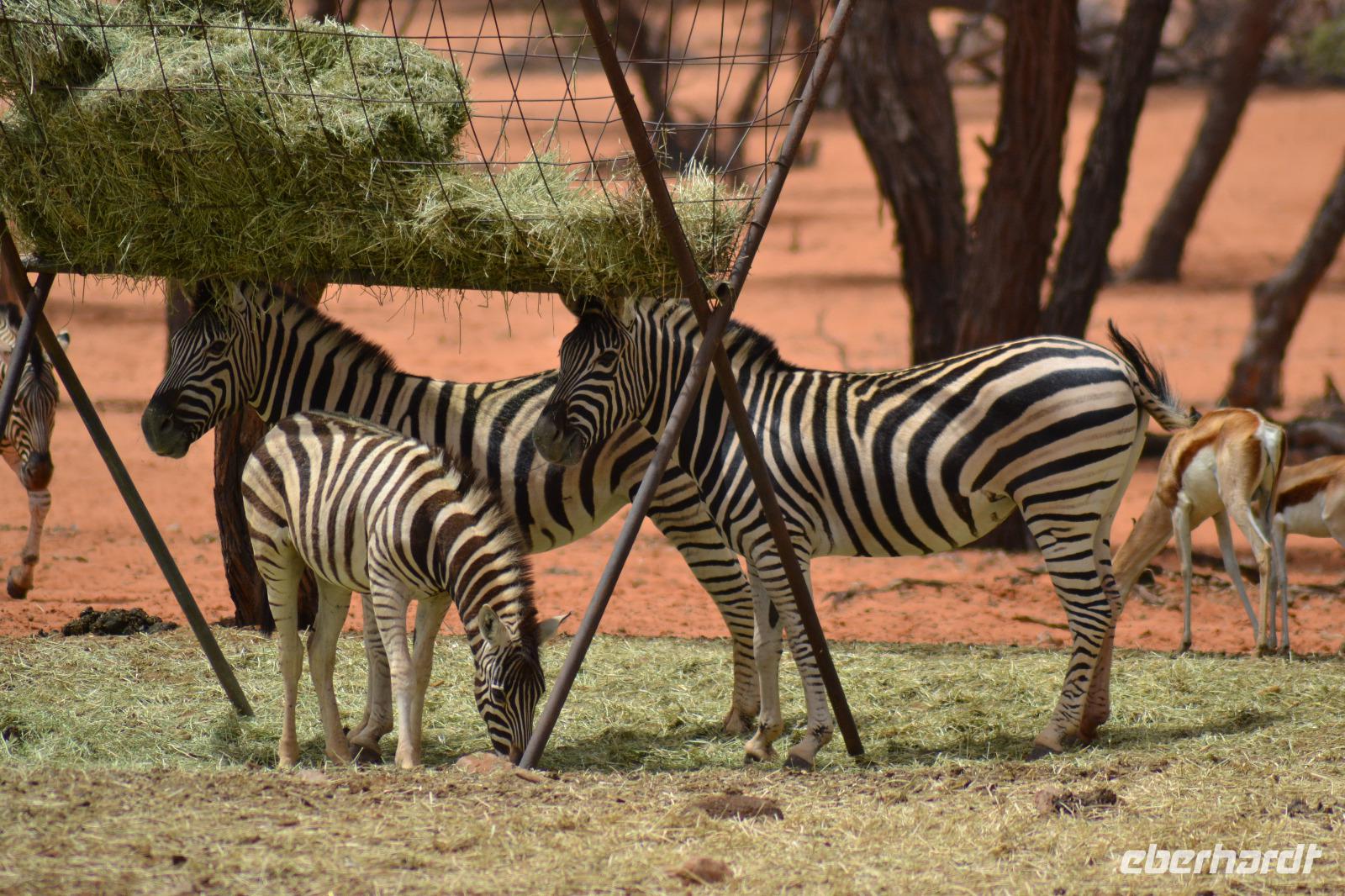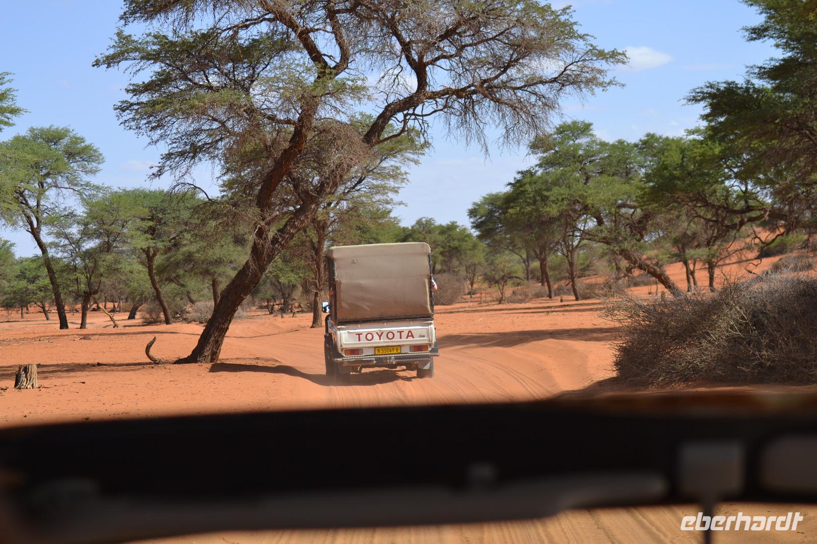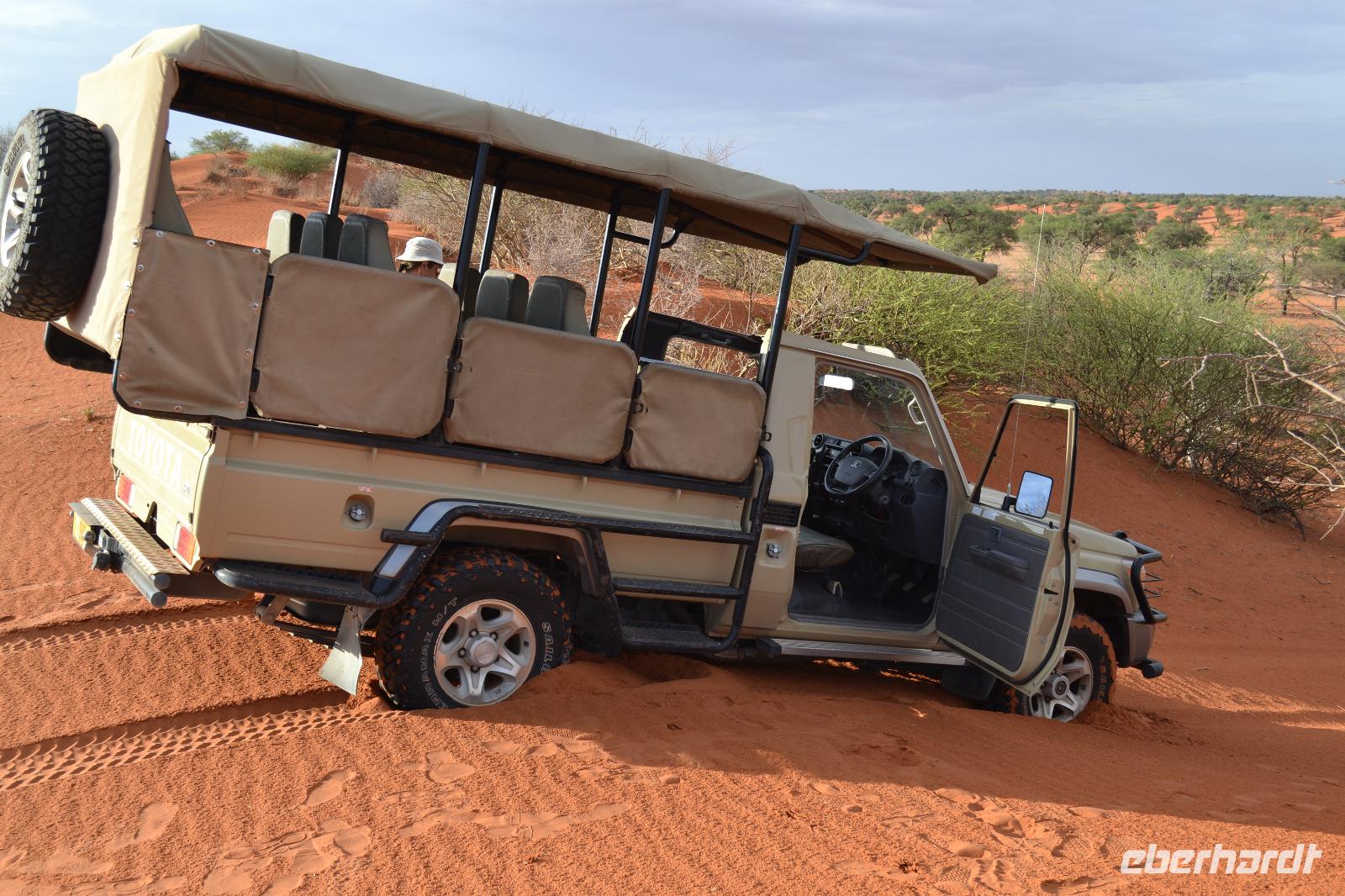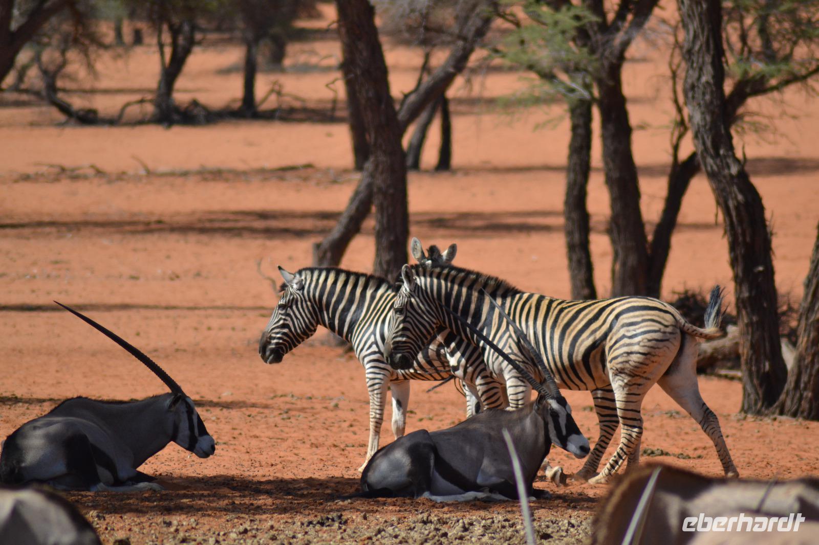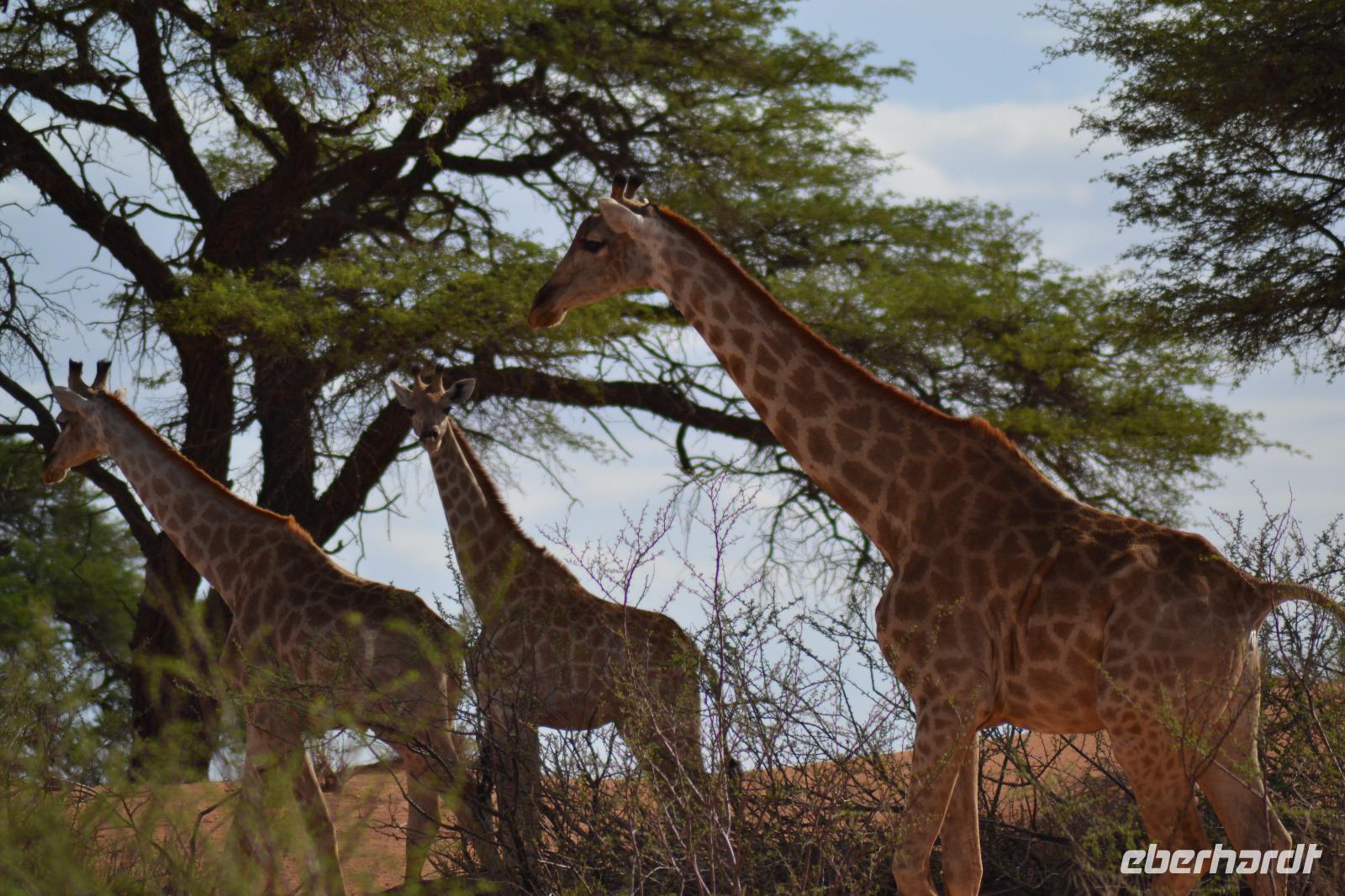 Nach einem ausgiebigen Frühstück mit einem tollen Panoramablick über die Stadt starteten wir unsere erste lange Strecke mit ca. 300 km in die Kalahari Halbwüste. Doch zunächst hatten Laura und Dagmar noch ein paar geheime Erledigungen vor. Nachdem alles im Truck verladen war ging die Fahrt über Heldenacker und somit die Überquerung des südlichen Wendekreises des Steinbocks weiter. An einer Tankstelle in Rehoboth nutzen wir die Gelegenheit unseren Kaffee weg zu bringen. Kurz hinter dem Ort Verliesen wir die asphaltierten Straßen und begaben uns auf die Schotterpisten in die Kalahari. Unterwegs Briefte uns Dagmar mit den wichtigsten Besonderheiten des Landes und worauf man unbedingt achten sollte. Besonders die Malaria Vorsorge mittels eines Gin Tonics blieb uns gut im Gedächtnis. Dies war der erste alkoholische Tipp unserer Reiseleiterin. Daran wollten wir uns auf jeden Fall halten. Mittags erreichten wir bereits unsere tolle Lodge in mitten der Natur! Einer der drei Unterkünfte in diesem privaten Gelände und auch die komfortabelste. Nach einer Pause, die wir für eigene Erkundigungen des Geländes mit ersten Tierbeobachtung, ein Sprung in den kühlen Pool oder ein Getränk an der Bar nutzen. Zum Nachmittag trafen wir uns an der Terrasse auf ein Stück Kuchen und Kaffee. Im Anschluss stand die erste Sundowner Fahrt in offenen Jeeps statt. Wir sahen unwahrscheinlich viele Tiere. Kudus, Springböcke, Zebras, Giraffen, Strauße, Löwe, Löffelhunde, und vieles mehr. Nach einer 2,5 stündigen Fahrt durch die wunderbare Natur genossen wir bei einem kühlen Getränk und kleinen Snacks den Sonnenuntergang auf der Düne. Im Hintergrund der grau bedeckte Himmel und am Ende des Horizontes ein Regenbogen. Es folgte der zweite alkoholische Tipp von Dagmar. Wir sollten alle ein Glas Sekt trinken, damit sollte der Regen kommen. Als wir unsere Lodge wieder erreichten wartet bereits ein romantisch gedeckter Tisch auf der Terrasse auf uns. Wir ließen den Abend bei einem, zwei, oder vielleicht drei Gläsern Wein ausklingen und begaben uns anschließend auf den teilweise abenteuerlichen Weg zurück in unsere Chalets.