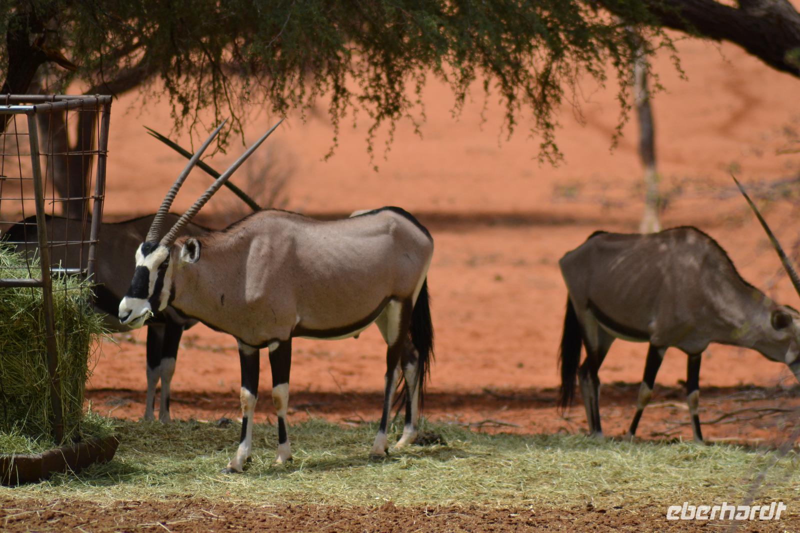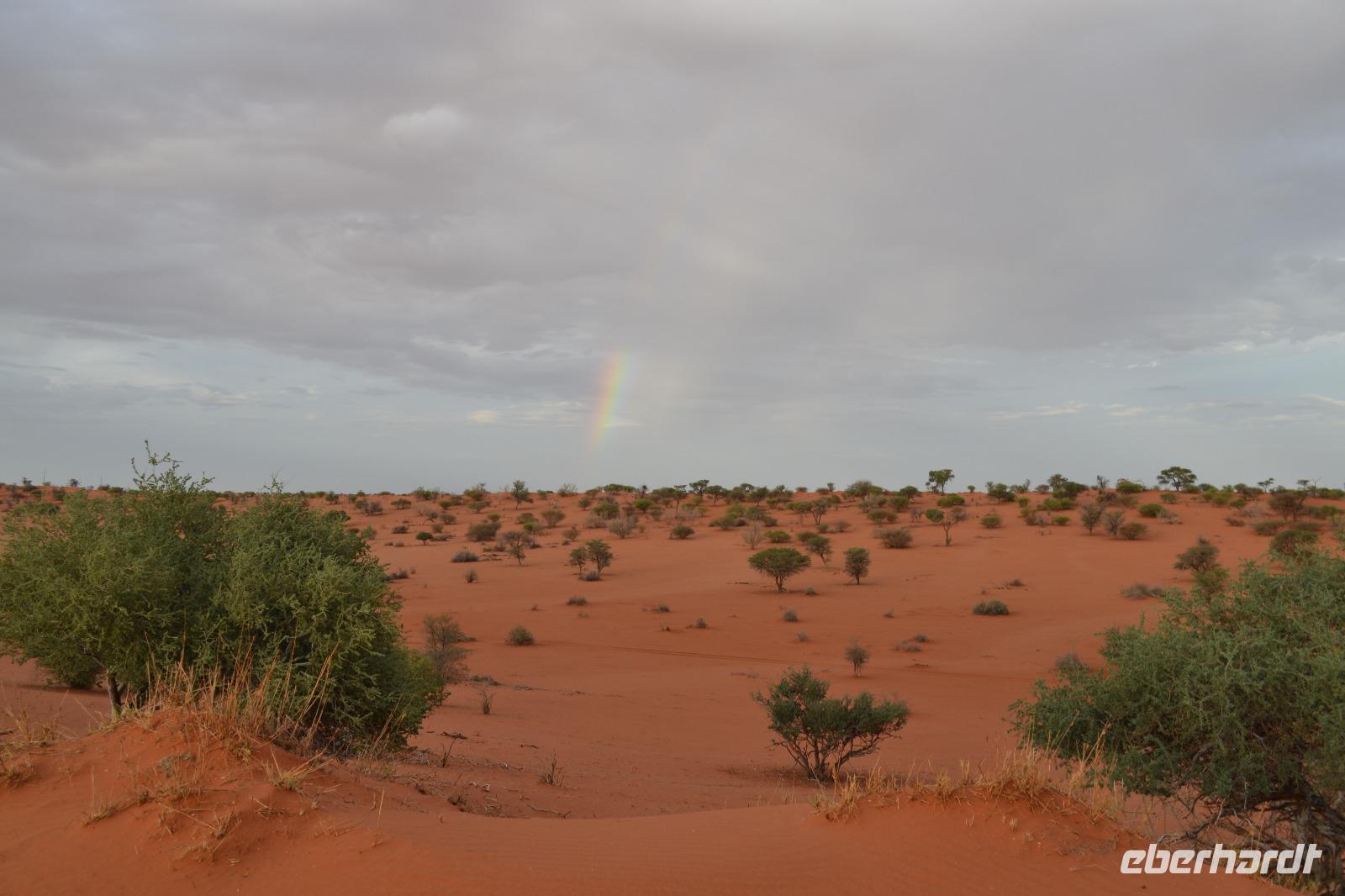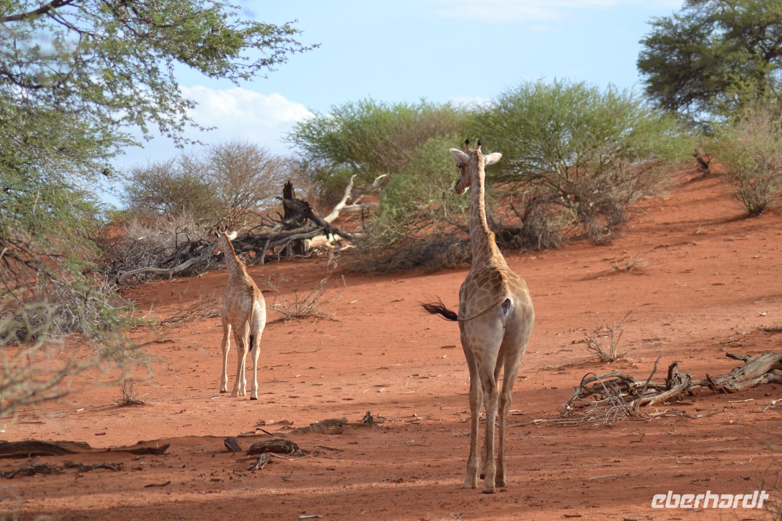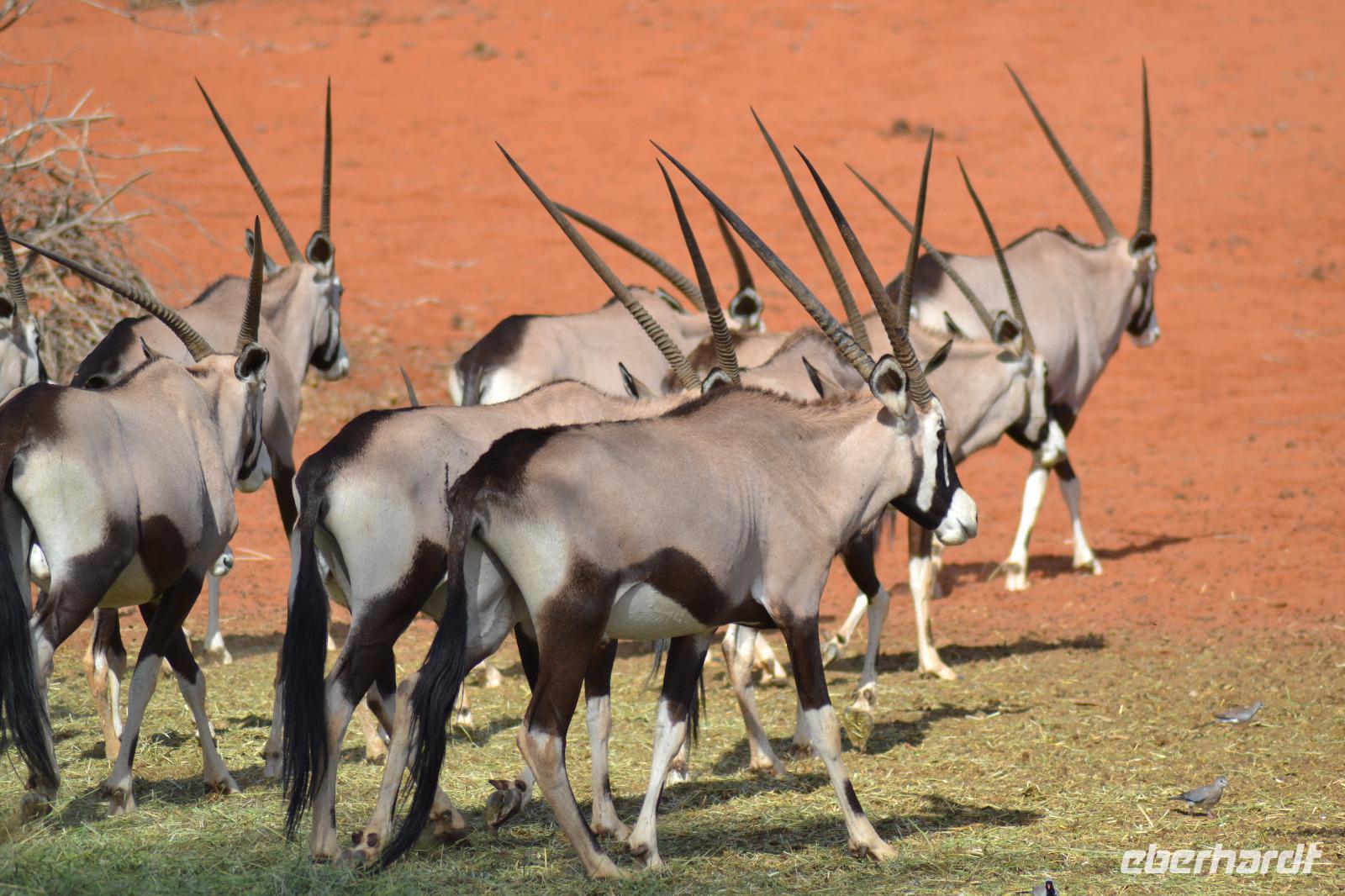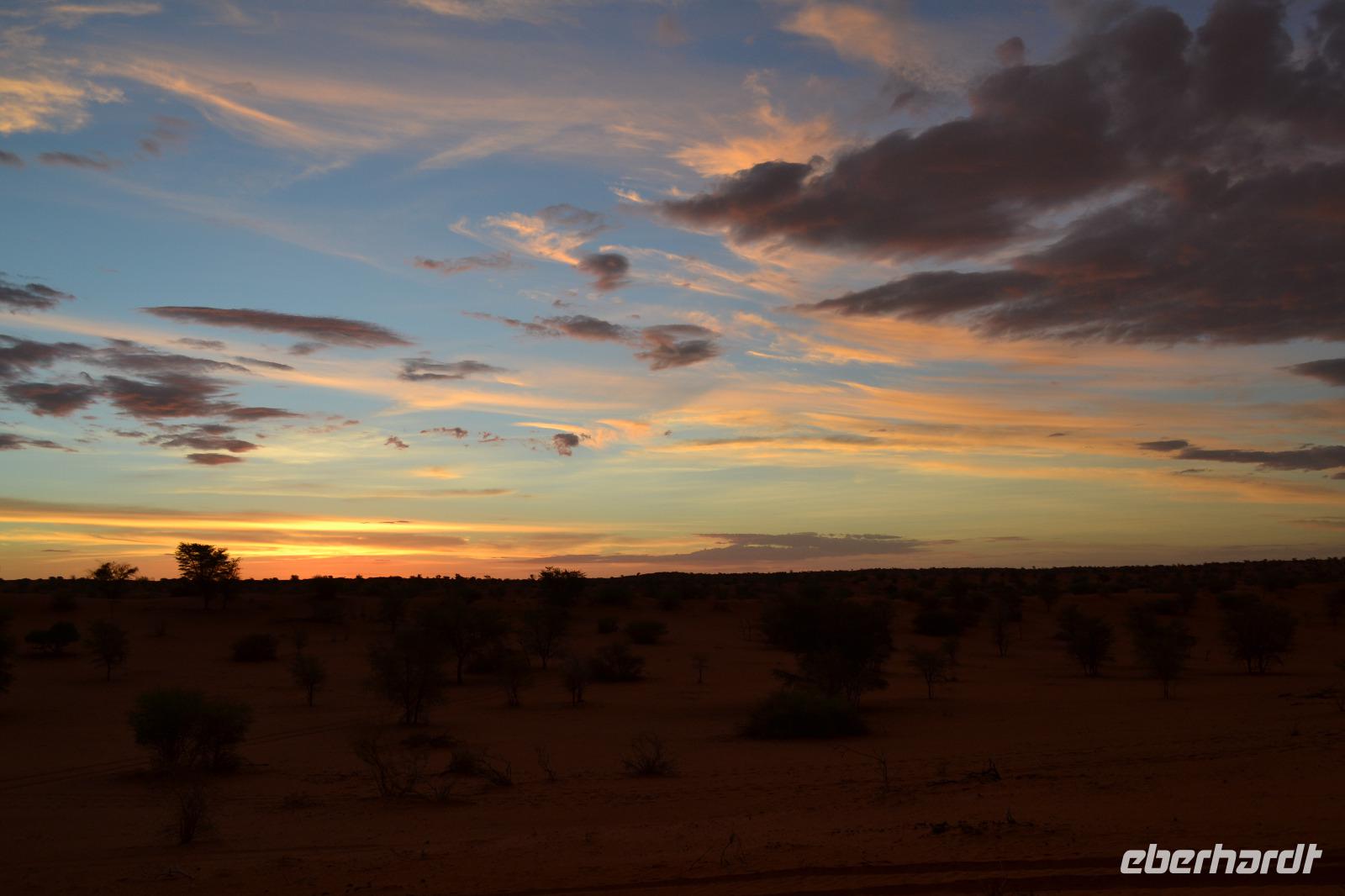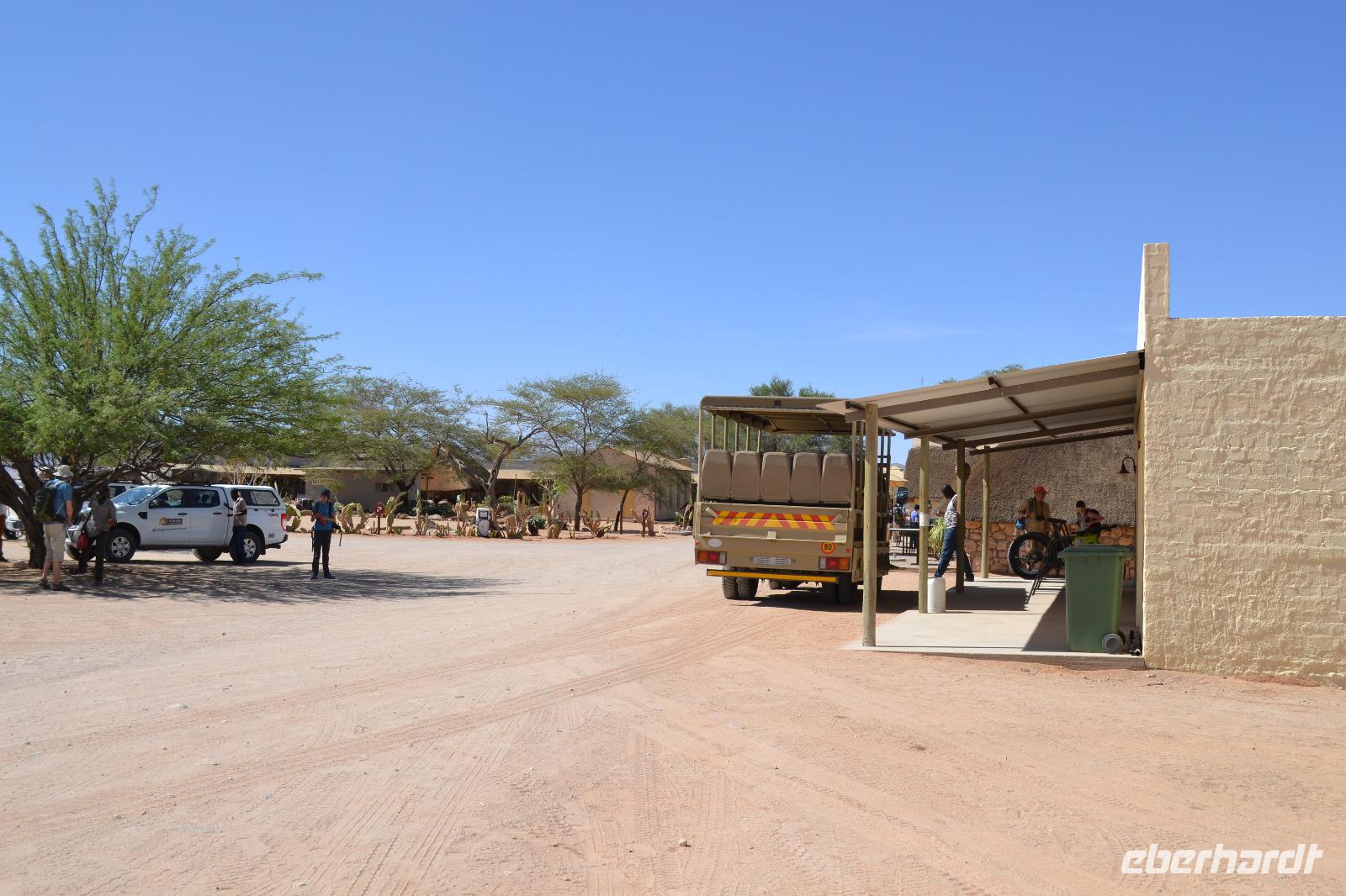 Nach einem ausgiebigen Frühstück mit einem tollen Panoramablick über die Stadt starteten wir unsere erste lange Strecke mit ca. 300 km in die Kalahari Halbwüste. Doch zunächst hatten Laura und Dagmar noch ein paar geheime Erledigungen vor. Nachdem alles im Truck verladen war ging die Fahrt über Heldenacker und somit die Überquerung des südlichen Wendekreises des Steinbocks weiter. An einer Tankstelle in Rehoboth nutzen wir die Gelegenheit unseren Kaffee weg zu bringen. Kurz hinter dem Ort Verliesen wir die asphaltierten Straßen und begaben uns auf die Schotterpisten in die Kalahari. Unterwegs Briefte uns Dagmar mit den wichtigsten Besonderheiten des Landes und worauf man unbedingt achten sollte. Besonders die Malaria Vorsorge mittels eines Gin Tonics blieb uns gut im Gedächtnis. Dies war der erste alkoholische Tipp unserer Reiseleiterin. Daran wollten wir uns auf jeden Fall halten. Mittags erreichten wir bereits unsere tolle Lodge in mitten der Natur! Einer der drei Unterkünfte in diesem privaten Gelände und auch die komfortabelste. Nach einer Pause, die wir für eigene Erkundigungen des Geländes mit ersten Tierbeobachtung, ein Sprung in den kühlen Pool oder ein Getränk an der Bar nutzen. Zum Nachmittag trafen wir uns an der Terrasse auf ein Stück Kuchen und Kaffee. Im Anschluss stand die erste Sundowner Fahrt in offenen Jeeps statt. Wir sahen unwahrscheinlich viele Tiere. Kudus, Springböcke, Zebras, Giraffen, Strauße, Löwe, Löffelhunde, und vieles mehr. Nach einer 2,5 stündigen Fahrt durch die wunderbare Natur genossen wir bei einem kühlen Getränk und kleinen Snacks den Sonnenuntergang auf der Düne. Im Hintergrund der grau bedeckte Himmel und am Ende des Horizontes ein Regenbogen. Es folgte der zweite alkoholische Tipp von Dagmar. Wir sollten alle ein Glas Sekt trinken, damit sollte der Regen kommen. Als wir unsere Lodge wieder erreichten wartet bereits ein romantisch gedeckter Tisch auf der Terrasse auf uns. Wir ließen den Abend bei einem, zwei, oder vielleicht drei Gläsern Wein ausklingen und begaben uns anschließend auf den teilweise abenteuerlichen Weg zurück in unsere Chalets.