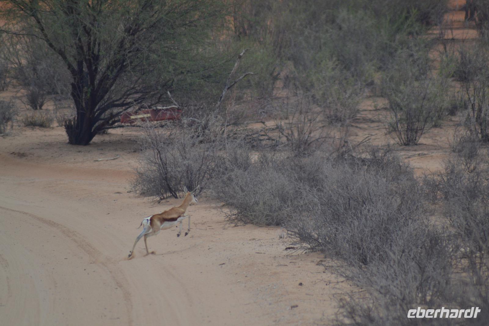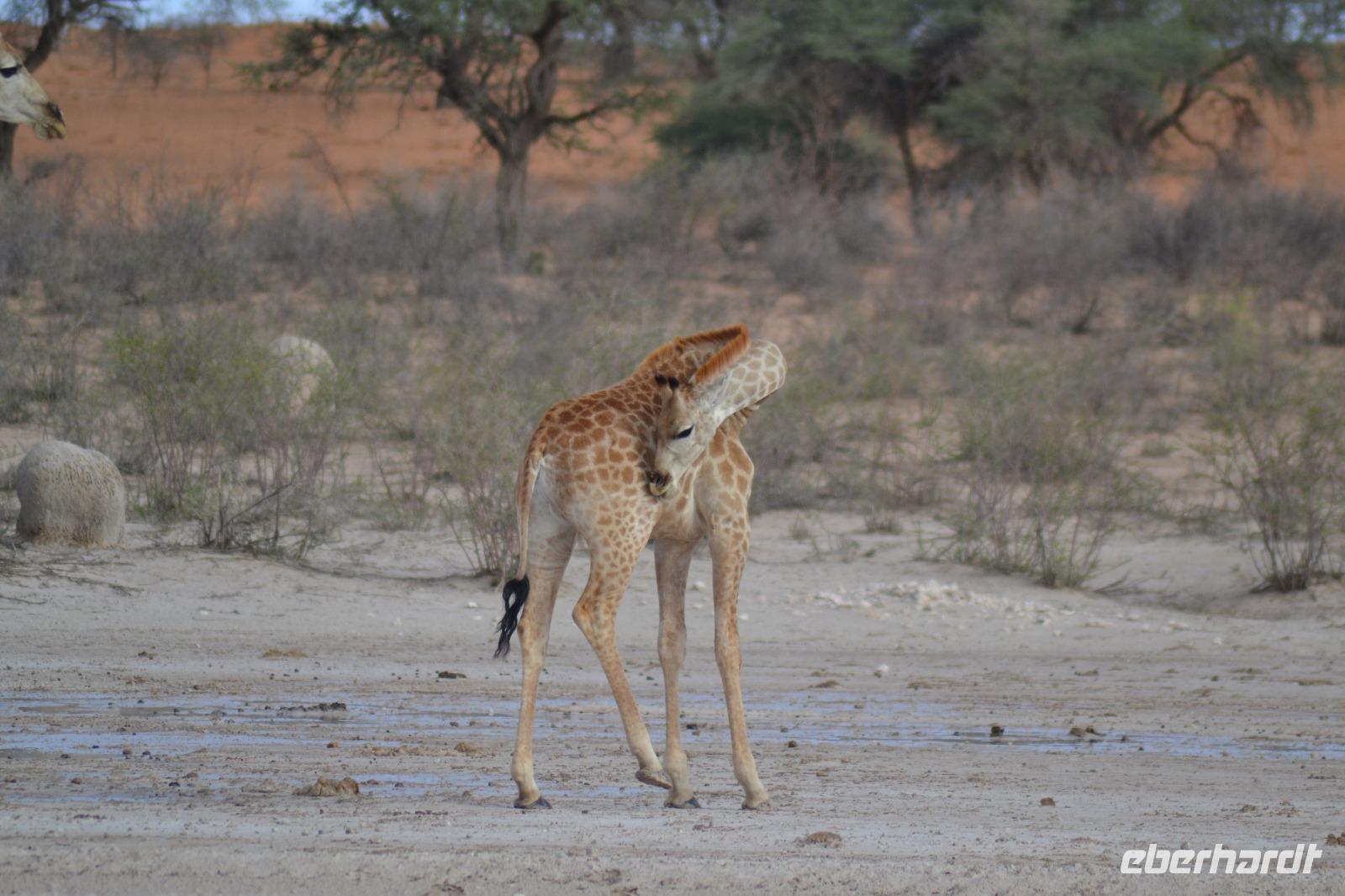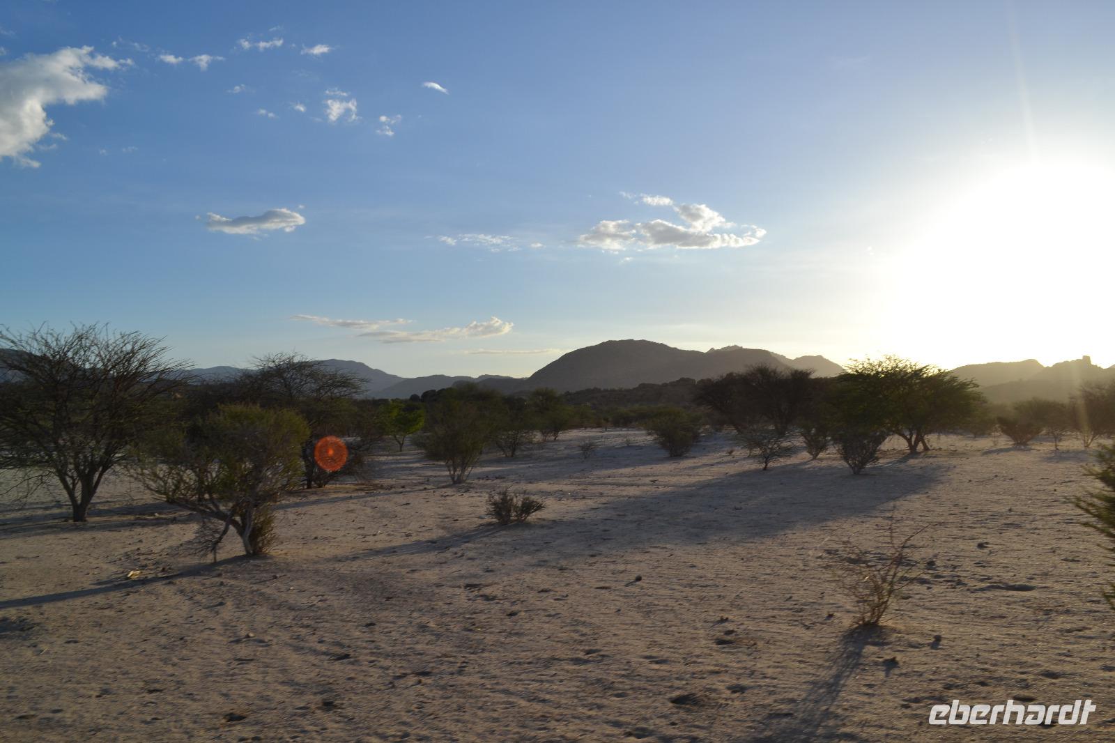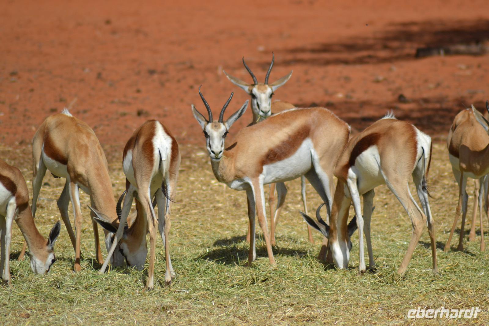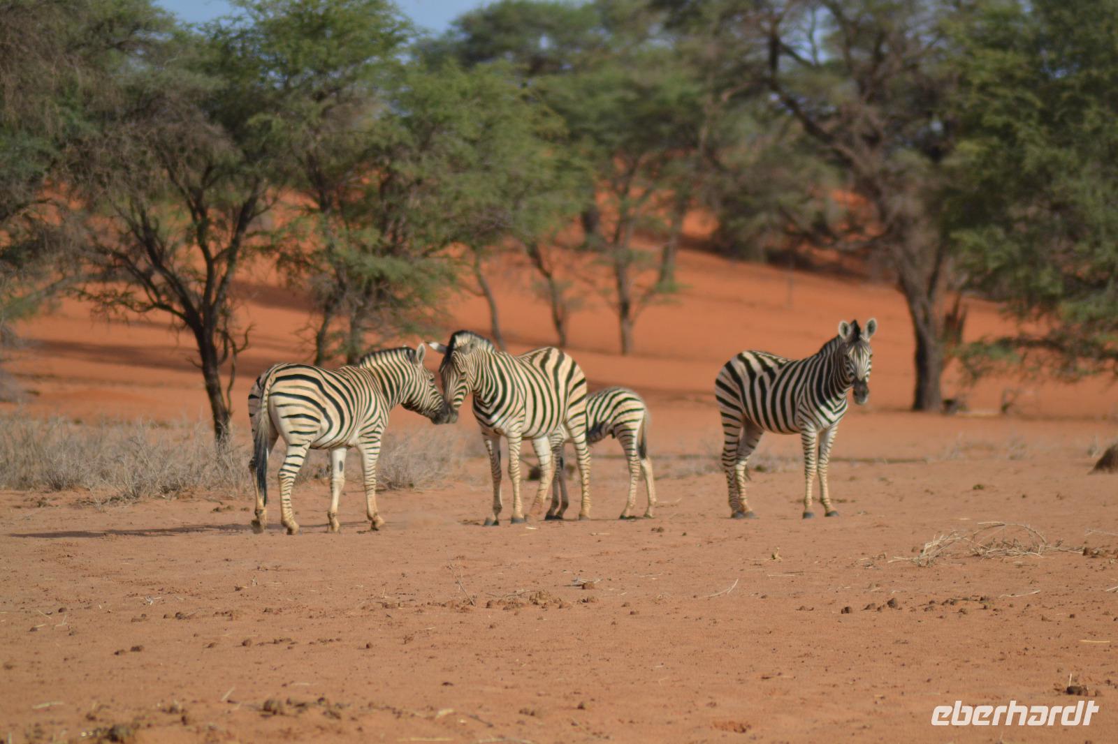 Nach einem ausgiebigen Frühstück mit einem tollen Panoramablick über die Stadt starteten wir unsere erste lange Strecke mit ca. 300 km in die Kalahari Halbwüste. Doch zunächst hatten Laura und Dagmar noch ein paar geheime Erledigungen vor. Nachdem alles im Truck verladen war ging die Fahrt über Heldenacker und somit die Überquerung des südlichen Wendekreises des Steinbocks weiter. An einer Tankstelle in Rehoboth nutzen wir die Gelegenheit unseren Kaffee weg zu bringen. Kurz hinter dem Ort Verliesen wir die asphaltierten Straßen und begaben uns auf die Schotterpisten in die Kalahari. Unterwegs Briefte uns Dagmar mit den wichtigsten Besonderheiten des Landes und worauf man unbedingt achten sollte. Besonders die Malaria Vorsorge mittels eines Gin Tonics blieb uns gut im Gedächtnis. Dies war der erste alkoholische Tipp unserer Reiseleiterin. Daran wollten wir uns auf jeden Fall halten. Mittags erreichten wir bereits unsere tolle Lodge in mitten der Natur! Einer der drei Unterkünfte in diesem privaten Gelände und auch die komfortabelste. Nach einer Pause, die wir für eigene Erkundigungen des Geländes mit ersten Tierbeobachtung, ein Sprung in den kühlen Pool oder ein Getränk an der Bar nutzen. Zum Nachmittag trafen wir uns an der Terrasse auf ein Stück Kuchen und Kaffee. Im Anschluss stand die erste Sundowner Fahrt in offenen Jeeps statt. Wir sahen unwahrscheinlich viele Tiere. Kudus, Springböcke, Zebras, Giraffen, Strauße, Löwe, Löffelhunde, und vieles mehr. Nach einer 2,5 stündigen Fahrt durch die wunderbare Natur genossen wir bei einem kühlen Getränk und kleinen Snacks den Sonnenuntergang auf der Düne. Im Hintergrund der grau bedeckte Himmel und am Ende des Horizontes ein Regenbogen. Es folgte der zweite alkoholische Tipp von Dagmar. Wir sollten alle ein Glas Sekt trinken, damit sollte der Regen kommen. Als wir unsere Lodge wieder erreichten wartet bereits ein romantisch gedeckter Tisch auf der Terrasse auf uns. Wir ließen den Abend bei einem, zwei, oder vielleicht drei Gläsern Wein ausklingen und begaben uns anschließend auf den teilweise abenteuerlichen Weg zurück in unsere Chalets.