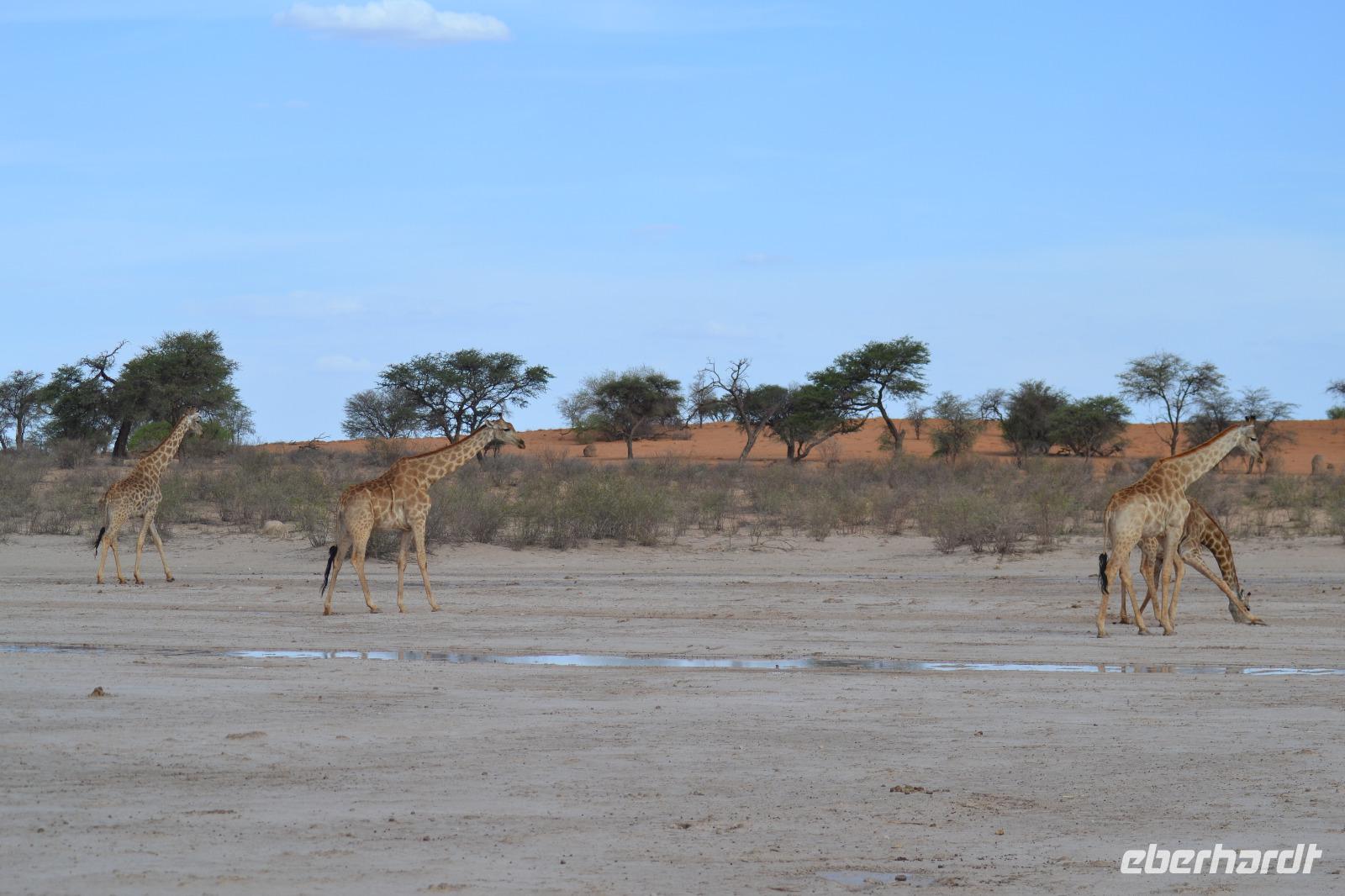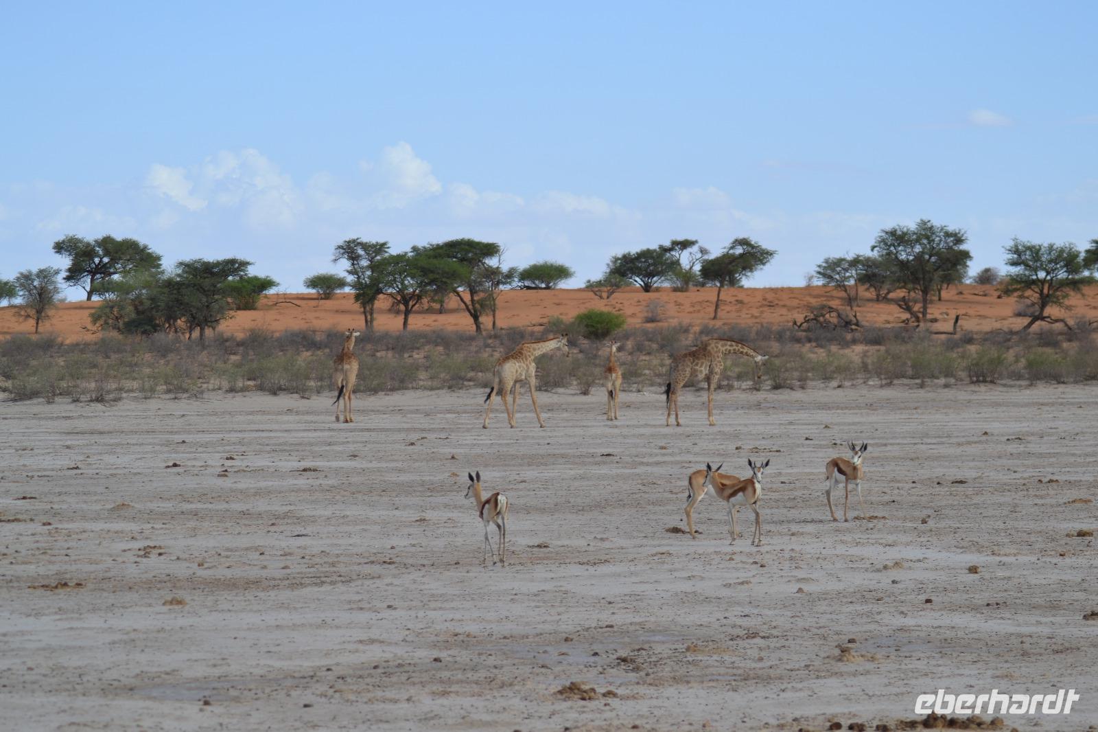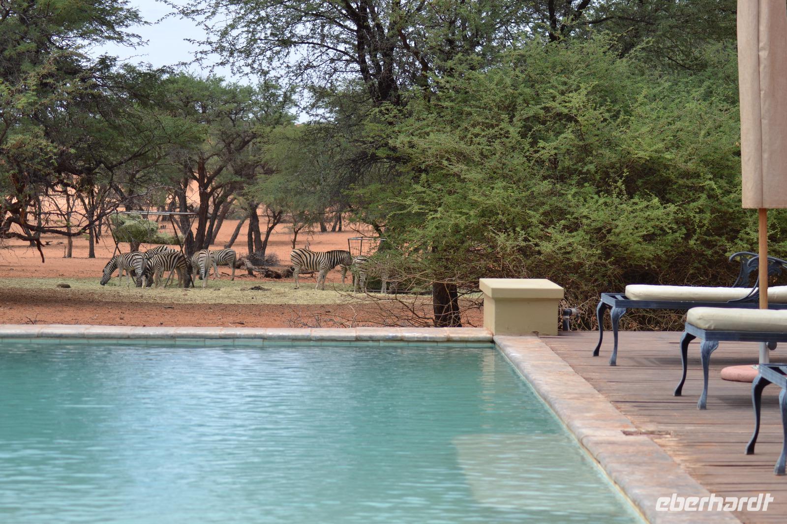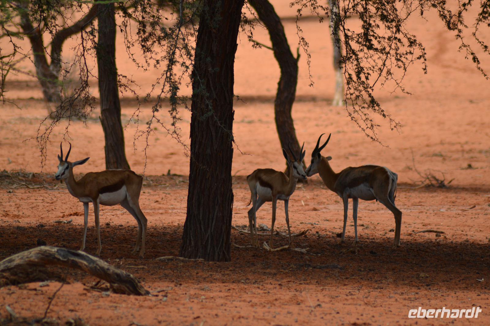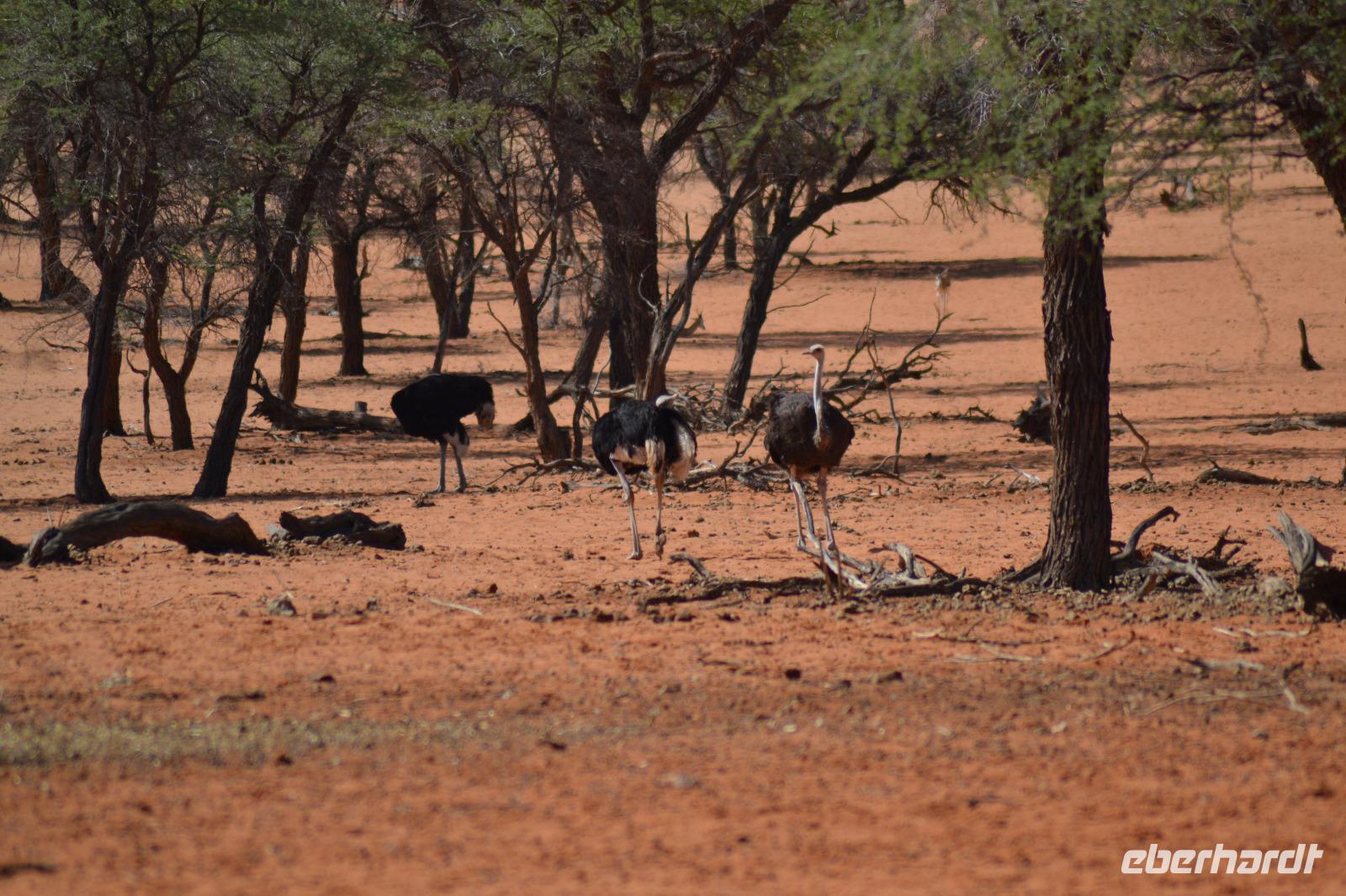 Nach einem ausgiebigen Frühstück mit einem tollen Panoramablick über die Stadt starteten wir unsere erste lange Strecke mit ca. 300 km in die Kalahari Halbwüste. Doch zunächst hatten Laura und Dagmar noch ein paar geheime Erledigungen vor. Nachdem alles im Truck verladen war ging die Fahrt über Heldenacker und somit die Überquerung des südlichen Wendekreises des Steinbocks weiter. An einer Tankstelle in Rehoboth nutzen wir die Gelegenheit unseren Kaffee weg zu bringen. Kurz hinter dem Ort Verliesen wir die asphaltierten Straßen und begaben uns auf die Schotterpisten in die Kalahari. Unterwegs Briefte uns Dagmar mit den wichtigsten Besonderheiten des Landes und worauf man unbedingt achten sollte. Besonders die Malaria Vorsorge mittels eines Gin Tonics blieb uns gut im Gedächtnis. Dies war der erste alkoholische Tipp unserer Reiseleiterin. Daran wollten wir uns auf jeden Fall halten. Mittags erreichten wir bereits unsere tolle Lodge in mitten der Natur! Einer der drei Unterkünfte in diesem privaten Gelände und auch die komfortabelste. Nach einer Pause, die wir für eigene Erkundigungen des Geländes mit ersten Tierbeobachtung, ein Sprung in den kühlen Pool oder ein Getränk an der Bar nutzen. Zum Nachmittag trafen wir uns an der Terrasse auf ein Stück Kuchen und Kaffee. Im Anschluss stand die erste Sundowner Fahrt in offenen Jeeps statt. Wir sahen unwahrscheinlich viele Tiere. Kudus, Springböcke, Zebras, Giraffen, Strauße, Löwe, Löffelhunde, und vieles mehr. Nach einer 2,5 stündigen Fahrt durch die wunderbare Natur genossen wir bei einem kühlen Getränk und kleinen Snacks den Sonnenuntergang auf der Düne. Im Hintergrund der grau bedeckte Himmel und am Ende des Horizontes ein Regenbogen. Es folgte der zweite alkoholische Tipp von Dagmar. Wir sollten alle ein Glas Sekt trinken, damit sollte der Regen kommen. Als wir unsere Lodge wieder erreichten wartet bereits ein romantisch gedeckter Tisch auf der Terrasse auf uns. Wir ließen den Abend bei einem, zwei, oder vielleicht drei Gläsern Wein ausklingen und begaben uns anschließend auf den teilweise abenteuerlichen Weg zurück in unsere Chalets.