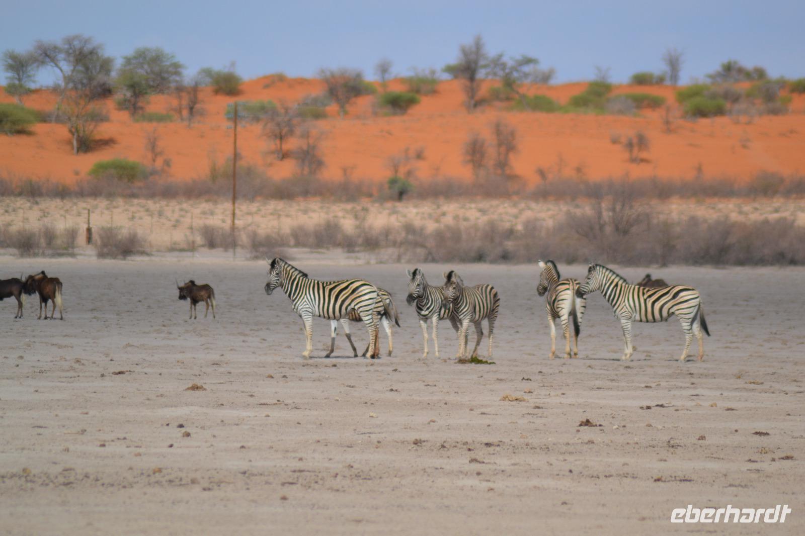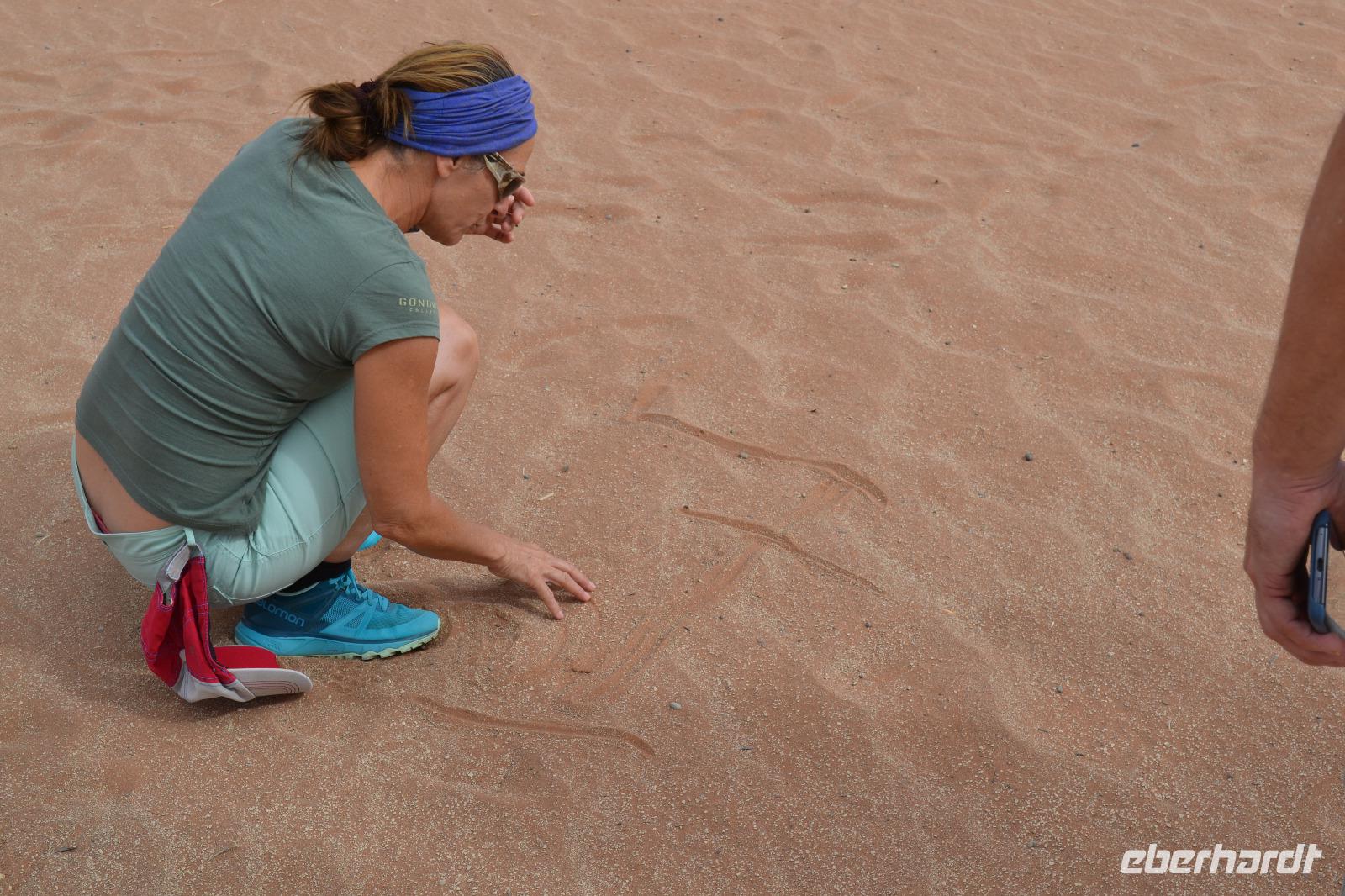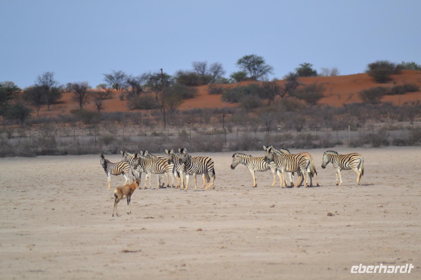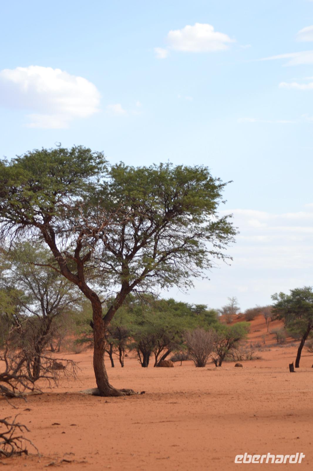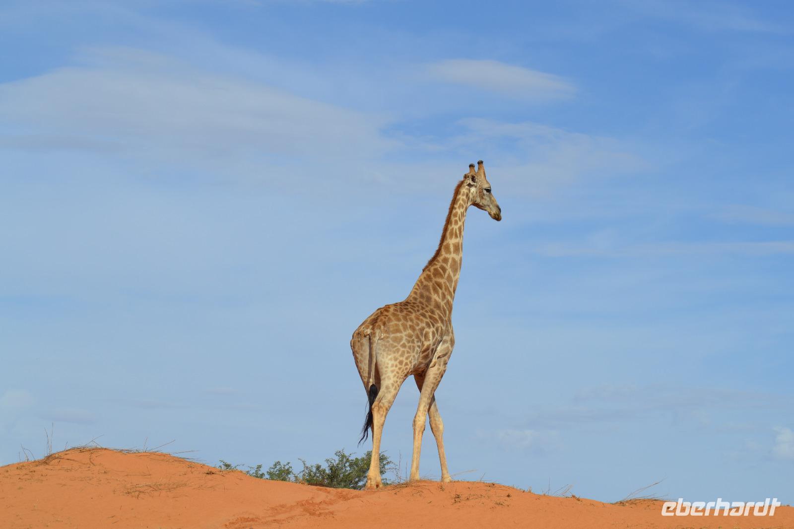 Nach einem ausgiebigen Frühstück mit einem tollen Panoramablick über die Stadt starteten wir unsere erste lange Strecke mit ca. 300 km in die Kalahari Halbwüste. Doch zunächst hatten Laura und Dagmar noch ein paar geheime Erledigungen vor. Nachdem alles im Truck verladen war ging die Fahrt über Heldenacker und somit die Überquerung des südlichen Wendekreises des Steinbocks weiter. An einer Tankstelle in Rehoboth nutzen wir die Gelegenheit unseren Kaffee weg zu bringen. Kurz hinter dem Ort Verliesen wir die asphaltierten Straßen und begaben uns auf die Schotterpisten in die Kalahari. Unterwegs Briefte uns Dagmar mit den wichtigsten Besonderheiten des Landes und worauf man unbedingt achten sollte. Besonders die Malaria Vorsorge mittels eines Gin Tonics blieb uns gut im Gedächtnis. Dies war der erste alkoholische Tipp unserer Reiseleiterin. Daran wollten wir uns auf jeden Fall halten. Mittags erreichten wir bereits unsere tolle Lodge in mitten der Natur! Einer der drei Unterkünfte in diesem privaten Gelände und auch die komfortabelste. Nach einer Pause, die wir für eigene Erkundigungen des Geländes mit ersten Tierbeobachtung, ein Sprung in den kühlen Pool oder ein Getränk an der Bar nutzen. Zum Nachmittag trafen wir uns an der Terrasse auf ein Stück Kuchen und Kaffee. Im Anschluss stand die erste Sundowner Fahrt in offenen Jeeps statt. Wir sahen unwahrscheinlich viele Tiere. Kudus, Springböcke, Zebras, Giraffen, Strauße, Löwe, Löffelhunde, und vieles mehr. Nach einer 2,5 stündigen Fahrt durch die wunderbare Natur genossen wir bei einem kühlen Getränk und kleinen Snacks den Sonnenuntergang auf der Düne. Im Hintergrund der grau bedeckte Himmel und am Ende des Horizontes ein Regenbogen. Es folgte der zweite alkoholische Tipp von Dagmar. Wir sollten alle ein Glas Sekt trinken, damit sollte der Regen kommen. Als wir unsere Lodge wieder erreichten wartet bereits ein romantisch gedeckter Tisch auf der Terrasse auf uns. Wir ließen den Abend bei einem, zwei, oder vielleicht drei Gläsern Wein ausklingen und begaben uns anschließend auf den teilweise abenteuerlichen Weg zurück in unsere Chalets.