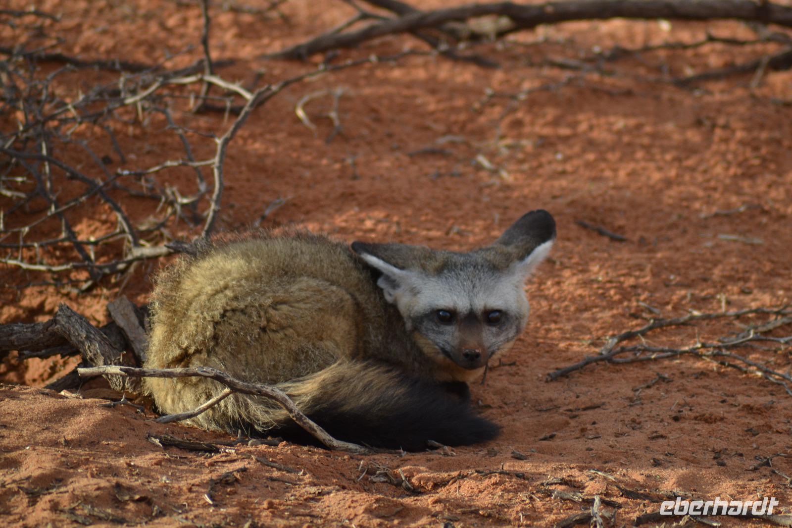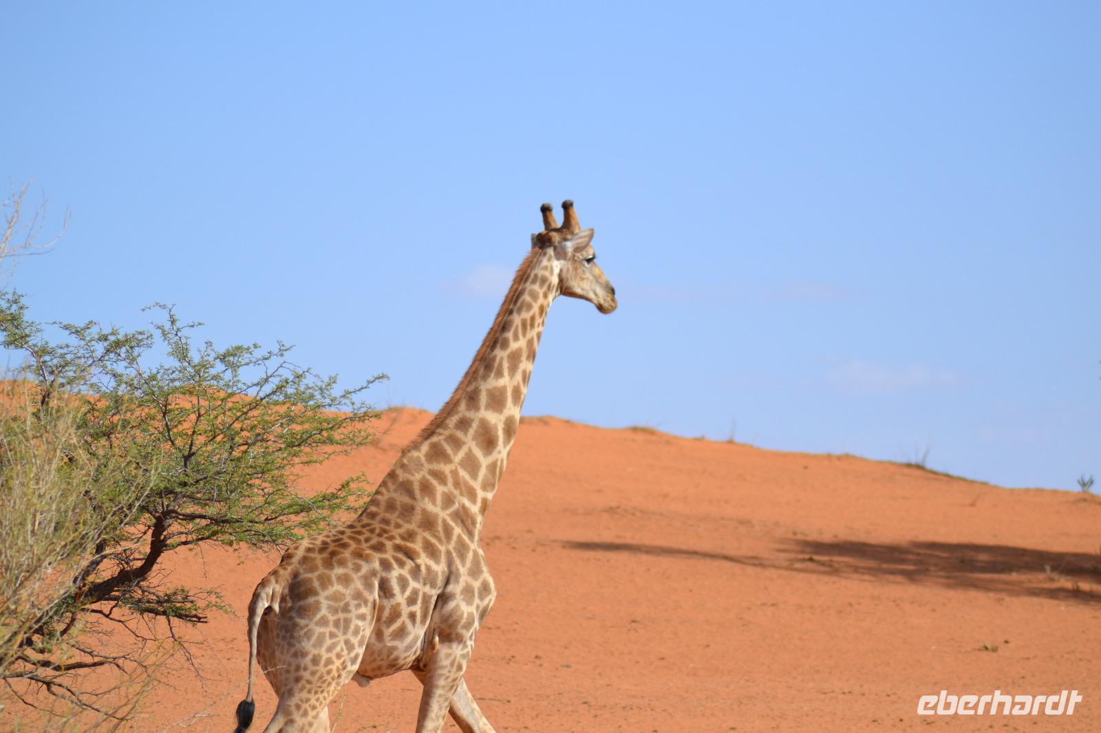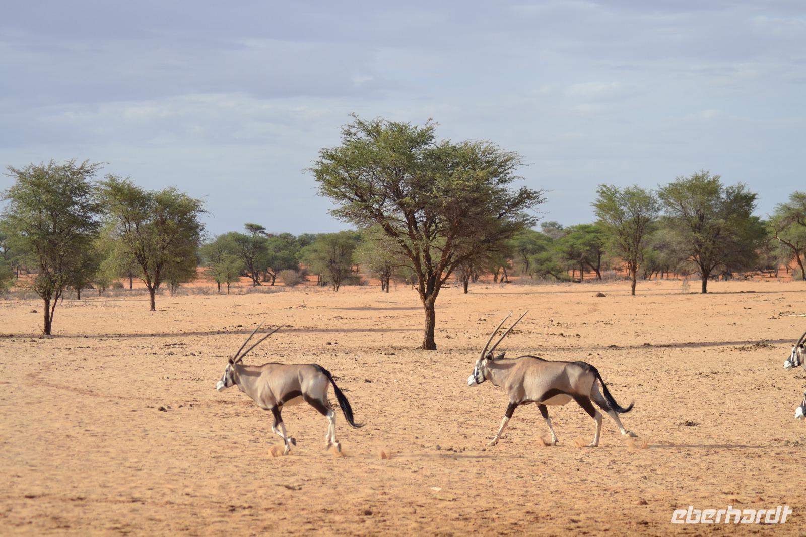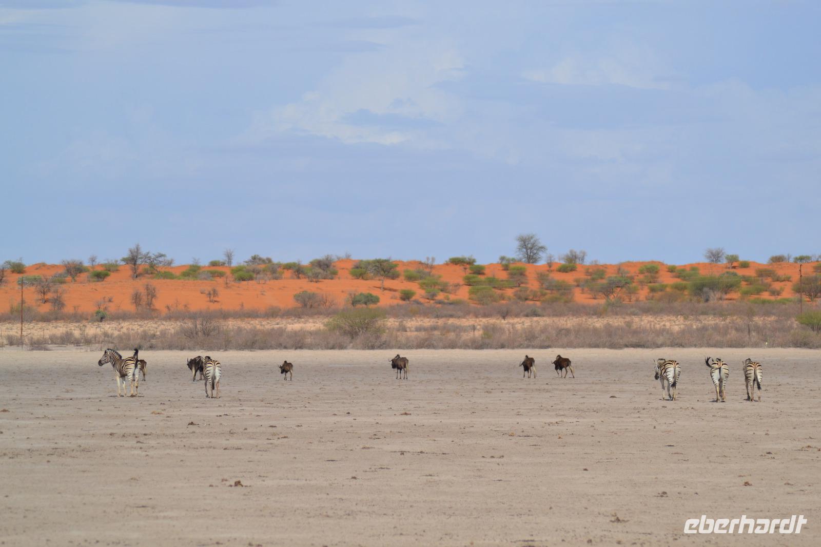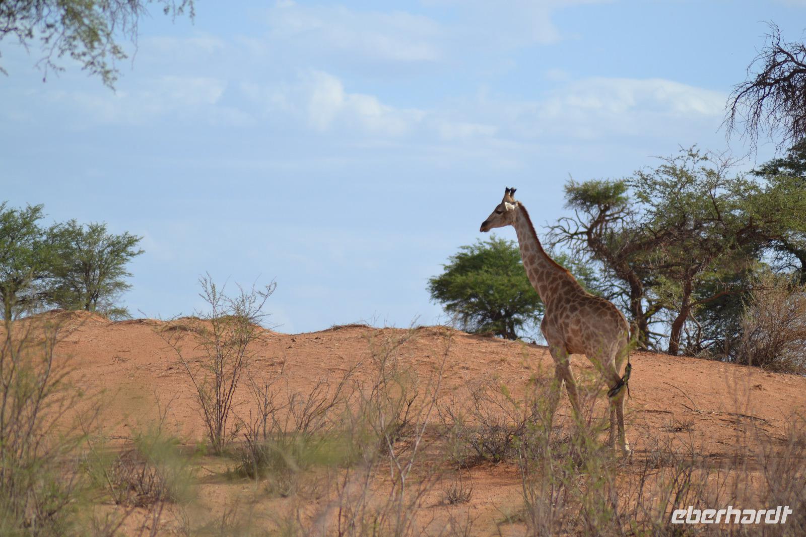 Nach einem ausgiebigen Frühstück mit einem tollen Panoramablick über die Stadt starteten wir unsere erste lange Strecke mit ca. 300 km in die Kalahari Halbwüste. Doch zunächst hatten Laura und Dagmar noch ein paar geheime Erledigungen vor. Nachdem alles im Truck verladen war ging die Fahrt über Heldenacker und somit die Überquerung des südlichen Wendekreises des Steinbocks weiter. An einer Tankstelle in Rehoboth nutzen wir die Gelegenheit unseren Kaffee weg zu bringen. Kurz hinter dem Ort Verliesen wir die asphaltierten Straßen und begaben uns auf die Schotterpisten in die Kalahari. Unterwegs Briefte uns Dagmar mit den wichtigsten Besonderheiten des Landes und worauf man unbedingt achten sollte. Besonders die Malaria Vorsorge mittels eines Gin Tonics blieb uns gut im Gedächtnis. Dies war der erste alkoholische Tipp unserer Reiseleiterin. Daran wollten wir uns auf jeden Fall halten. Mittags erreichten wir bereits unsere tolle Lodge in mitten der Natur! Einer der drei Unterkünfte in diesem privaten Gelände und auch die komfortabelste. Nach einer Pause, die wir für eigene Erkundigungen des Geländes mit ersten Tierbeobachtung, ein Sprung in den kühlen Pool oder ein Getränk an der Bar nutzen. Zum Nachmittag trafen wir uns an der Terrasse auf ein Stück Kuchen und Kaffee. Im Anschluss stand die erste Sundowner Fahrt in offenen Jeeps statt. Wir sahen unwahrscheinlich viele Tiere. Kudus, Springböcke, Zebras, Giraffen, Strauße, Löwe, Löffelhunde, und vieles mehr. Nach einer 2,5 stündigen Fahrt durch die wunderbare Natur genossen wir bei einem kühlen Getränk und kleinen Snacks den Sonnenuntergang auf der Düne. Im Hintergrund der grau bedeckte Himmel und am Ende des Horizontes ein Regenbogen. Es folgte der zweite alkoholische Tipp von Dagmar. Wir sollten alle ein Glas Sekt trinken, damit sollte der Regen kommen. Als wir unsere Lodge wieder erreichten wartet bereits ein romantisch gedeckter Tisch auf der Terrasse auf uns. Wir ließen den Abend bei einem, zwei, oder vielleicht drei Gläsern Wein ausklingen und begaben uns anschließend auf den teilweise abenteuerlichen Weg zurück in unsere Chalets.
