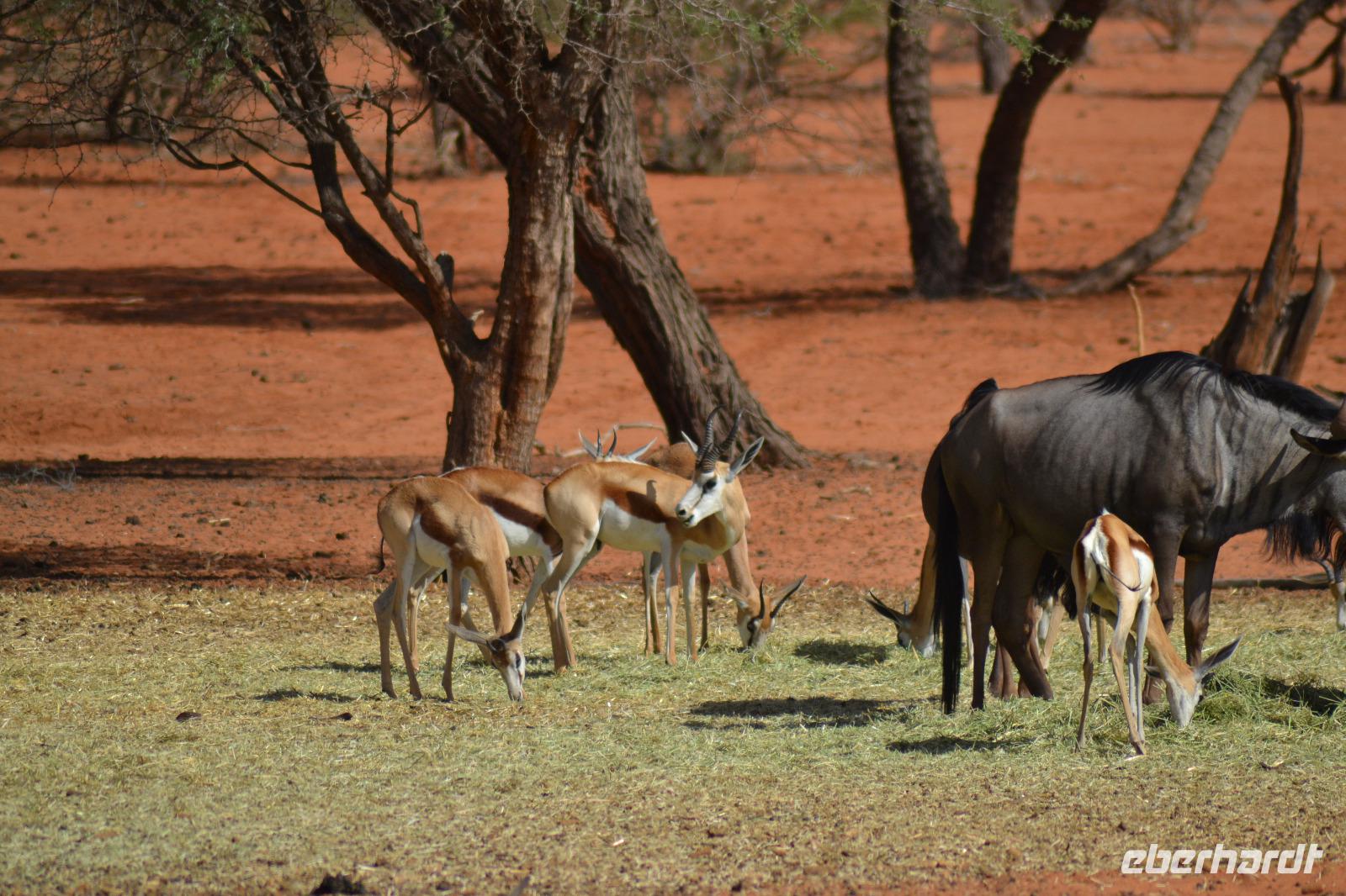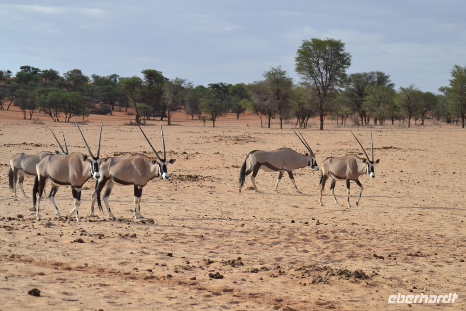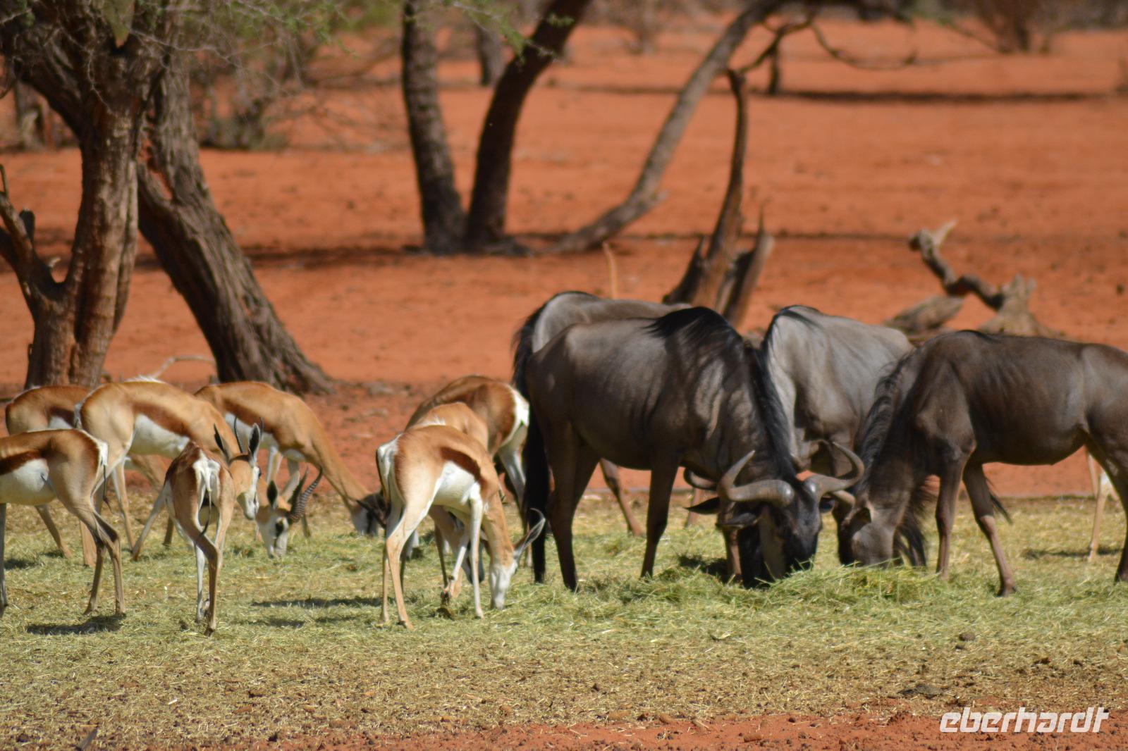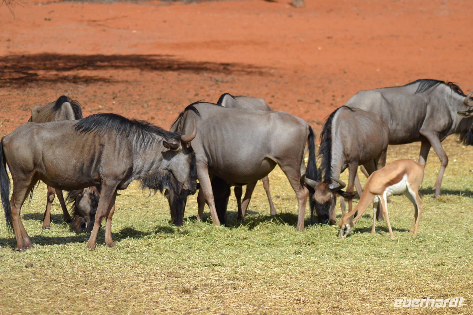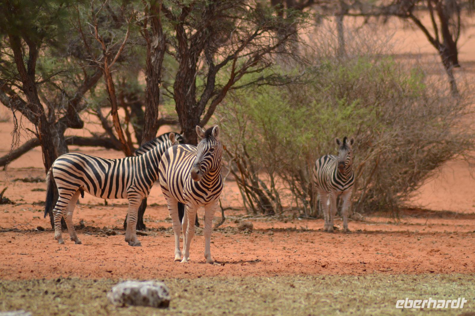 Nach einem ausgiebigen Frühstück mit einem tollen Panoramablick über die Stadt starteten wir unsere erste lange Strecke mit ca. 300 km in die Kalahari Halbwüste. Doch zunächst hatten Laura und Dagmar noch ein paar geheime Erledigungen vor. Nachdem alles im Truck verladen war ging die Fahrt über Heldenacker und somit die Überquerung des südlichen Wendekreises des Steinbocks weiter. An einer Tankstelle in Rehoboth nutzen wir die Gelegenheit unseren Kaffee weg zu bringen. Kurz hinter dem Ort Verliesen wir die asphaltierten Straßen und begaben uns auf die Schotterpisten in die Kalahari. Unterwegs Briefte uns Dagmar mit den wichtigsten Besonderheiten des Landes und worauf man unbedingt achten sollte. Besonders die Malaria Vorsorge mittels eines Gin Tonics blieb uns gut im Gedächtnis. Dies war der erste alkoholische Tipp unserer Reiseleiterin. Daran wollten wir uns auf jeden Fall halten. Mittags erreichten wir bereits unsere tolle Lodge in mitten der Natur! Einer der drei Unterkünfte in diesem privaten Gelände und auch die komfortabelste. Nach einer Pause, die wir für eigene Erkundigungen des Geländes mit ersten Tierbeobachtung, ein Sprung in den kühlen Pool oder ein Getränk an der Bar nutzen. Zum Nachmittag trafen wir uns an der Terrasse auf ein Stück Kuchen und Kaffee. Im Anschluss stand die erste Sundowner Fahrt in offenen Jeeps statt. Wir sahen unwahrscheinlich viele Tiere. Kudus, Springböcke, Zebras, Giraffen, Strauße, Löwe, Löffelhunde, und vieles mehr. Nach einer 2,5 stündigen Fahrt durch die wunderbare Natur genossen wir bei einem kühlen Getränk und kleinen Snacks den Sonnenuntergang auf der Düne. Im Hintergrund der grau bedeckte Himmel und am Ende des Horizontes ein Regenbogen. Es folgte der zweite alkoholische Tipp von Dagmar. Wir sollten alle ein Glas Sekt trinken, damit sollte der Regen kommen. Als wir unsere Lodge wieder erreichten wartet bereits ein romantisch gedeckter Tisch auf der Terrasse auf uns. Wir ließen den Abend bei einem, zwei, oder vielleicht drei Gläsern Wein ausklingen und begaben uns anschließend auf den teilweise abenteuerlichen Weg zurück in unsere Chalets.