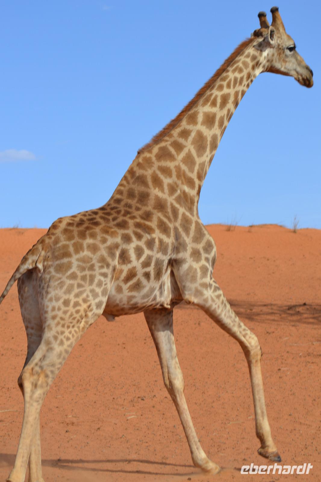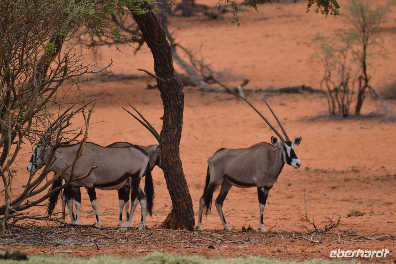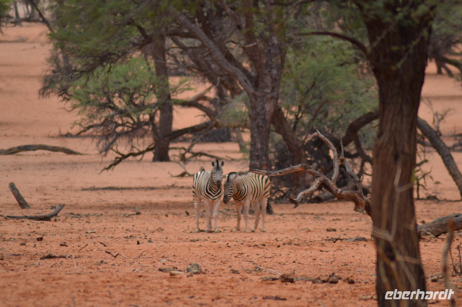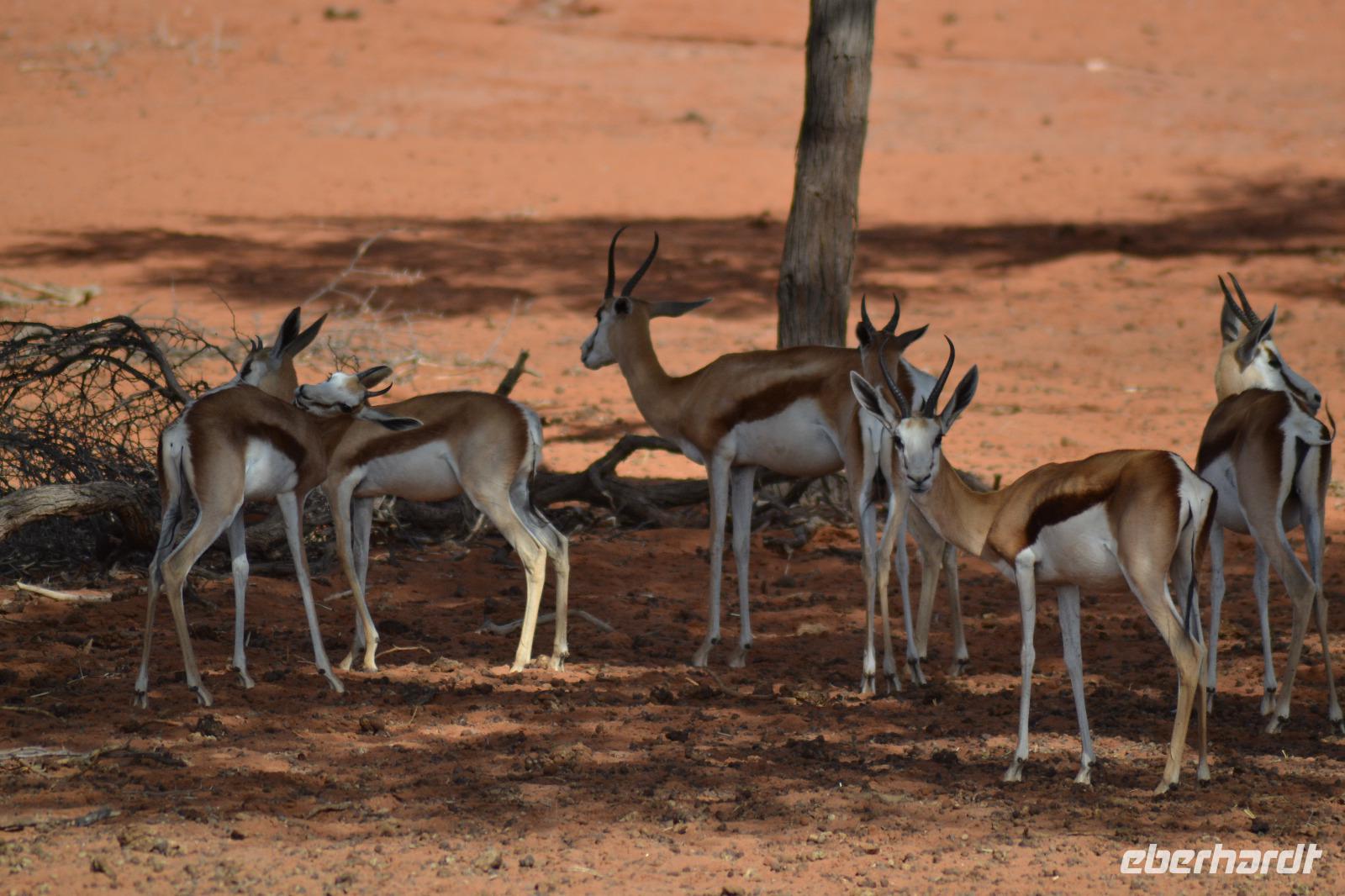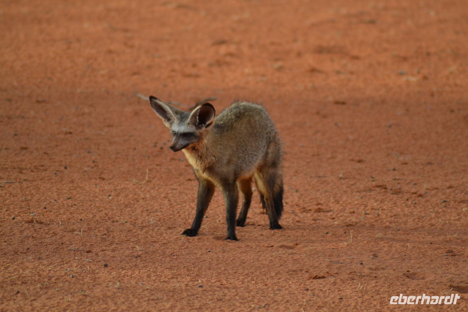 Nach einem ausgiebigen Frühstück mit einem tollen Panoramablick über die Stadt starteten wir unsere erste lange Strecke mit ca. 300 km in die Kalahari Halbwüste. Doch zunächst hatten Laura und Dagmar noch ein paar geheime Erledigungen vor. Nachdem alles im Truck verladen war ging die Fahrt über Heldenacker und somit die Überquerung des südlichen Wendekreises des Steinbocks weiter. An einer Tankstelle in Rehoboth nutzen wir die Gelegenheit unseren Kaffee weg zu bringen. Kurz hinter dem Ort Verliesen wir die asphaltierten Straßen und begaben uns auf die Schotterpisten in die Kalahari. Unterwegs Briefte uns Dagmar mit den wichtigsten Besonderheiten des Landes und worauf man unbedingt achten sollte. Besonders die Malaria Vorsorge mittels eines Gin Tonics blieb uns gut im Gedächtnis. Dies war der erste alkoholische Tipp unserer Reiseleiterin. Daran wollten wir uns auf jeden Fall halten. Mittags erreichten wir bereits unsere tolle Lodge in mitten der Natur! Einer der drei Unterkünfte in diesem privaten Gelände und auch die komfortabelste. Nach einer Pause, die wir für eigene Erkundigungen des Geländes mit ersten Tierbeobachtung, ein Sprung in den kühlen Pool oder ein Getränk an der Bar nutzen. Zum Nachmittag trafen wir uns an der Terrasse auf ein Stück Kuchen und Kaffee. Im Anschluss stand die erste Sundowner Fahrt in offenen Jeeps statt. Wir sahen unwahrscheinlich viele Tiere. Kudus, Springböcke, Zebras, Giraffen, Strauße, Löwe, Löffelhunde, und vieles mehr. Nach einer 2,5 stündigen Fahrt durch die wunderbare Natur genossen wir bei einem kühlen Getränk und kleinen Snacks den Sonnenuntergang auf der Düne. Im Hintergrund der grau bedeckte Himmel und am Ende des Horizontes ein Regenbogen. Es folgte der zweite alkoholische Tipp von Dagmar. Wir sollten alle ein Glas Sekt trinken, damit sollte der Regen kommen. Als wir unsere Lodge wieder erreichten wartet bereits ein romantisch gedeckter Tisch auf der Terrasse auf uns. Wir ließen den Abend bei einem, zwei, oder vielleicht drei Gläsern Wein ausklingen und begaben uns anschließend auf den teilweise abenteuerlichen Weg zurück in unsere Chalets.