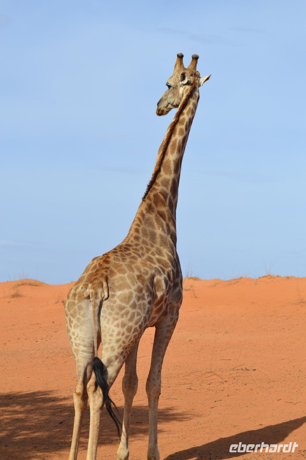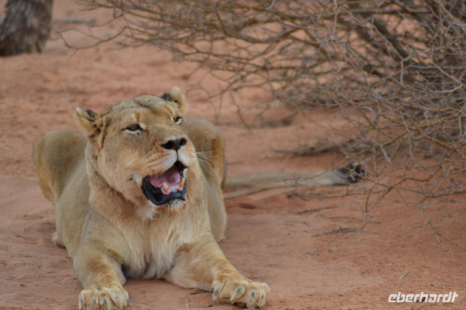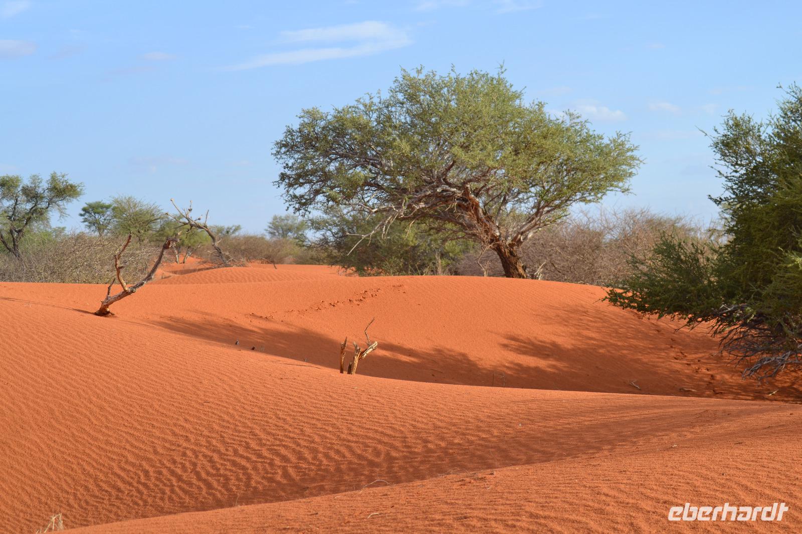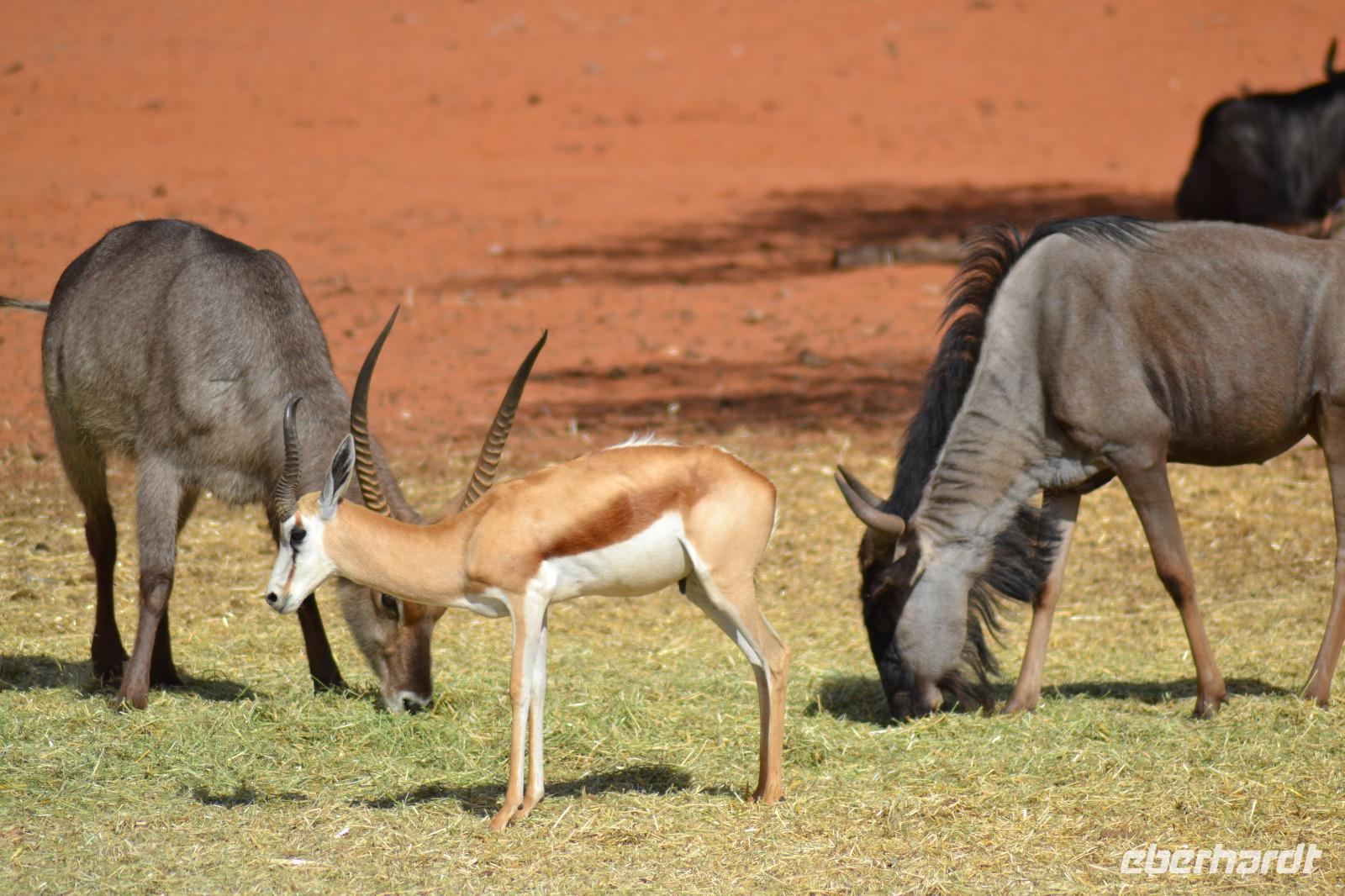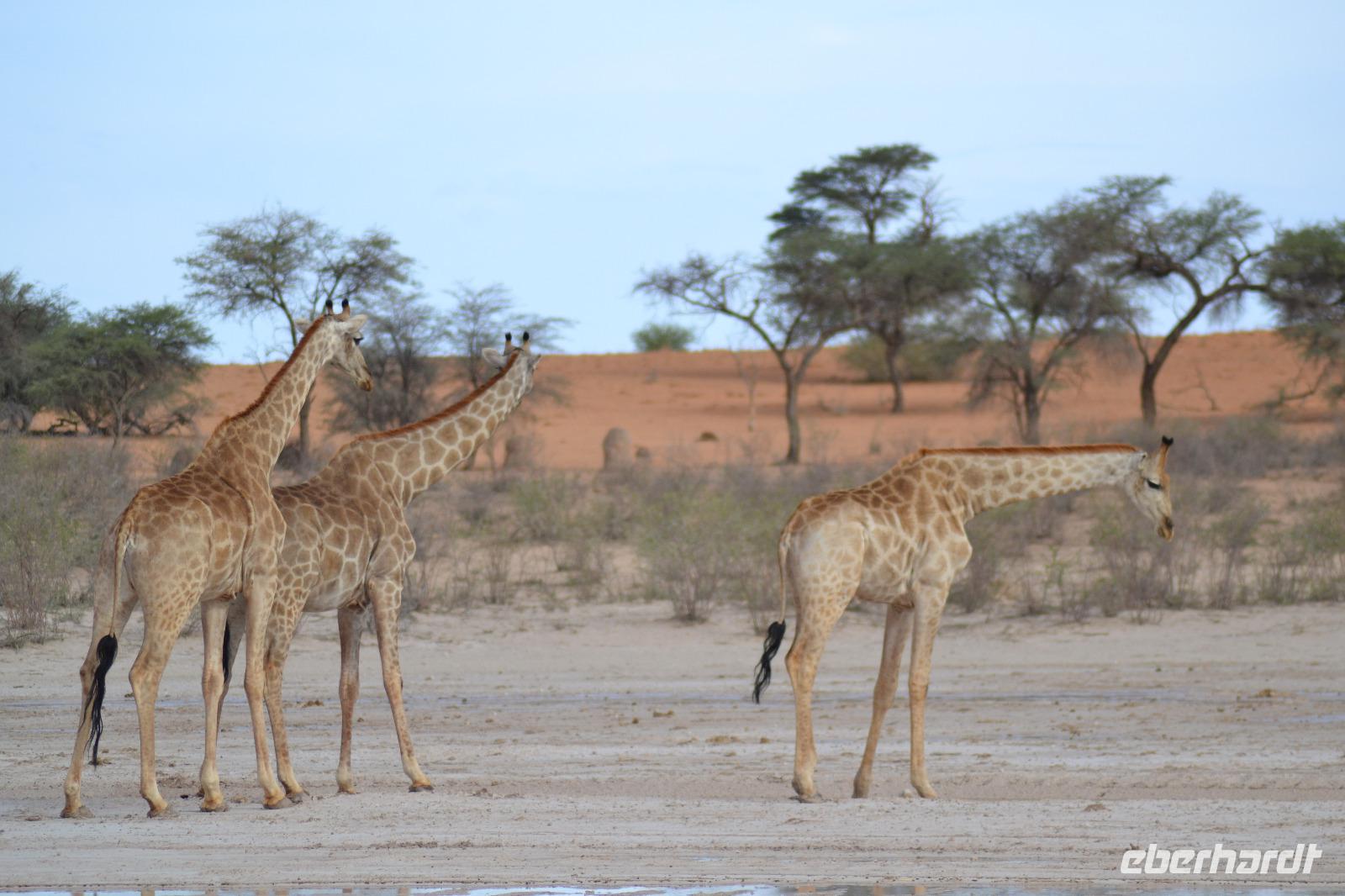 Nach einem ausgiebigen Frühstück mit einem tollen Panoramablick über die Stadt starteten wir unsere erste lange Strecke mit ca. 300 km in die Kalahari Halbwüste. Doch zunächst hatten Laura und Dagmar noch ein paar geheime Erledigungen vor. Nachdem alles im Truck verladen war ging die Fahrt über Heldenacker und somit die Überquerung des südlichen Wendekreises des Steinbocks weiter. An einer Tankstelle in Rehoboth nutzen wir die Gelegenheit unseren Kaffee weg zu bringen. Kurz hinter dem Ort Verliesen wir die asphaltierten Straßen und begaben uns auf die Schotterpisten in die Kalahari. Unterwegs Briefte uns Dagmar mit den wichtigsten Besonderheiten des Landes und worauf man unbedingt achten sollte. Besonders die Malaria Vorsorge mittels eines Gin Tonics blieb uns gut im Gedächtnis. Dies war der erste alkoholische Tipp unserer Reiseleiterin. Daran wollten wir uns auf jeden Fall halten. Mittags erreichten wir bereits unsere tolle Lodge in mitten der Natur! Einer der drei Unterkünfte in diesem privaten Gelände und auch die komfortabelste. Nach einer Pause, die wir für eigene Erkundigungen des Geländes mit ersten Tierbeobachtung, ein Sprung in den kühlen Pool oder ein Getränk an der Bar nutzen. Zum Nachmittag trafen wir uns an der Terrasse auf ein Stück Kuchen und Kaffee. Im Anschluss stand die erste Sundowner Fahrt in offenen Jeeps statt. Wir sahen unwahrscheinlich viele Tiere. Kudus, Springböcke, Zebras, Giraffen, Strauße, Löwe, Löffelhunde, und vieles mehr. Nach einer 2,5 stündigen Fahrt durch die wunderbare Natur genossen wir bei einem kühlen Getränk und kleinen Snacks den Sonnenuntergang auf der Düne. Im Hintergrund der grau bedeckte Himmel und am Ende des Horizontes ein Regenbogen. Es folgte der zweite alkoholische Tipp von Dagmar. Wir sollten alle ein Glas Sekt trinken, damit sollte der Regen kommen. Als wir unsere Lodge wieder erreichten wartet bereits ein romantisch gedeckter Tisch auf der Terrasse auf uns. Wir ließen den Abend bei einem, zwei, oder vielleicht drei Gläsern Wein ausklingen und begaben uns anschließend auf den teilweise abenteuerlichen Weg zurück in unsere Chalets.