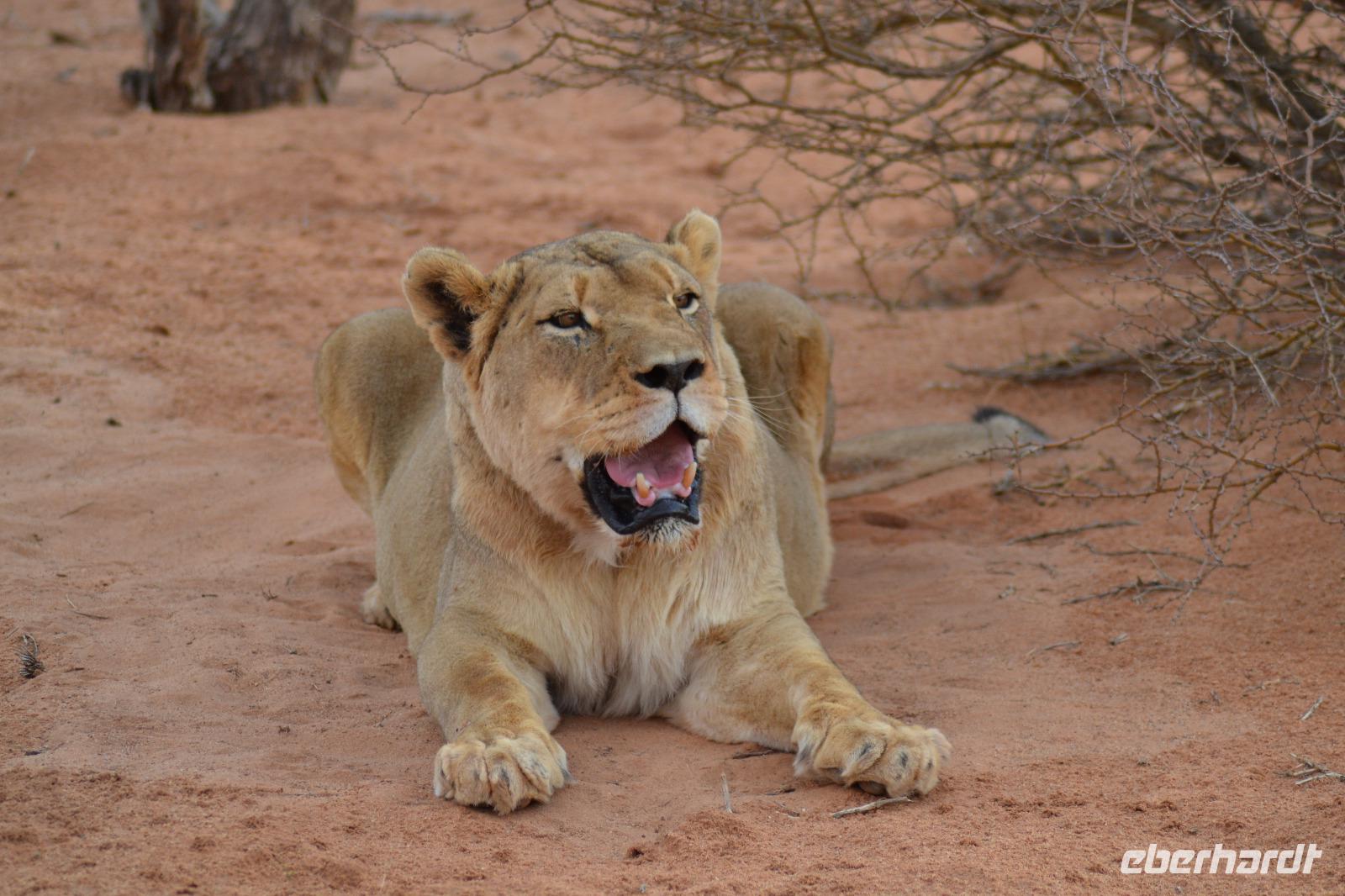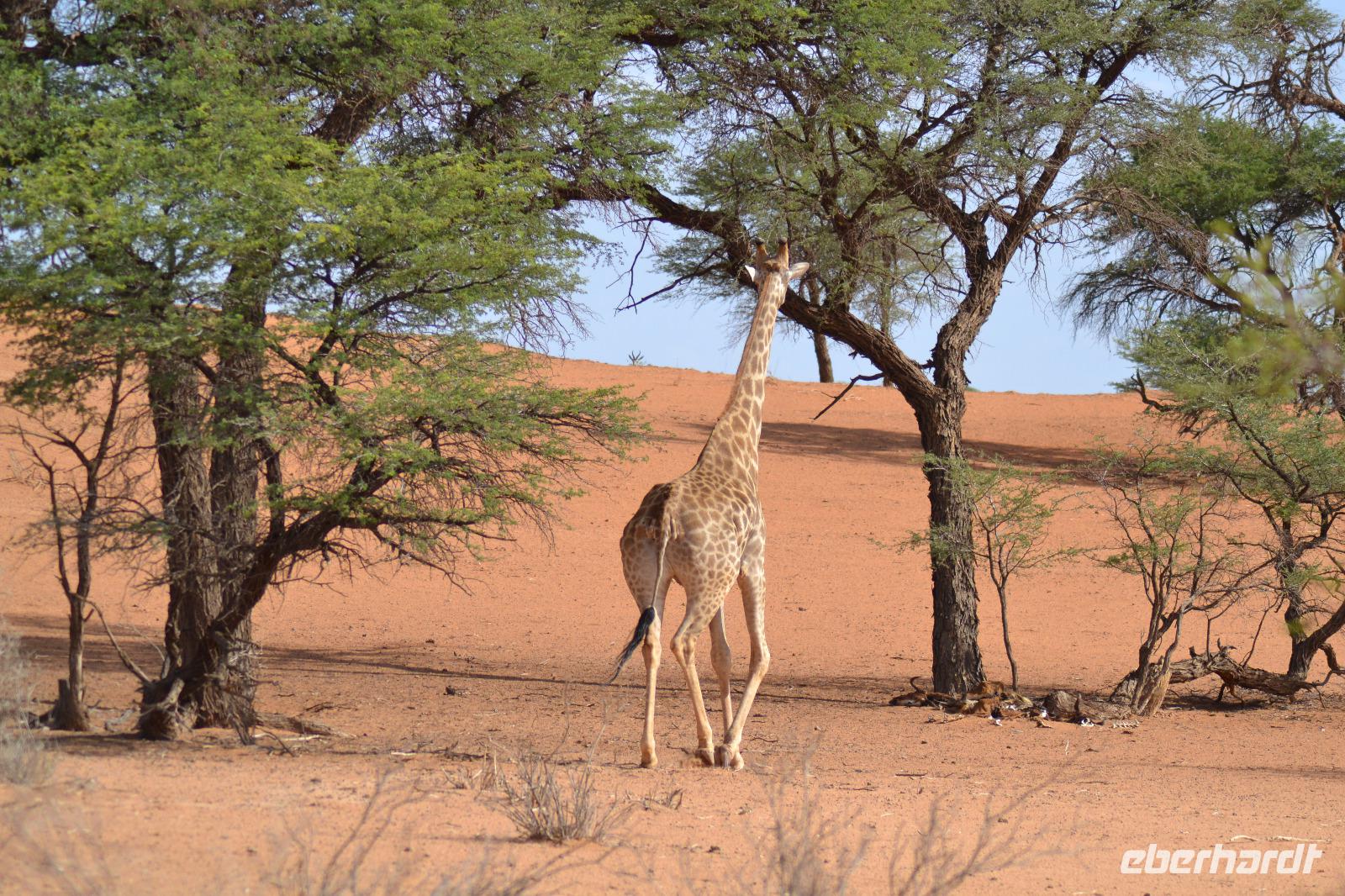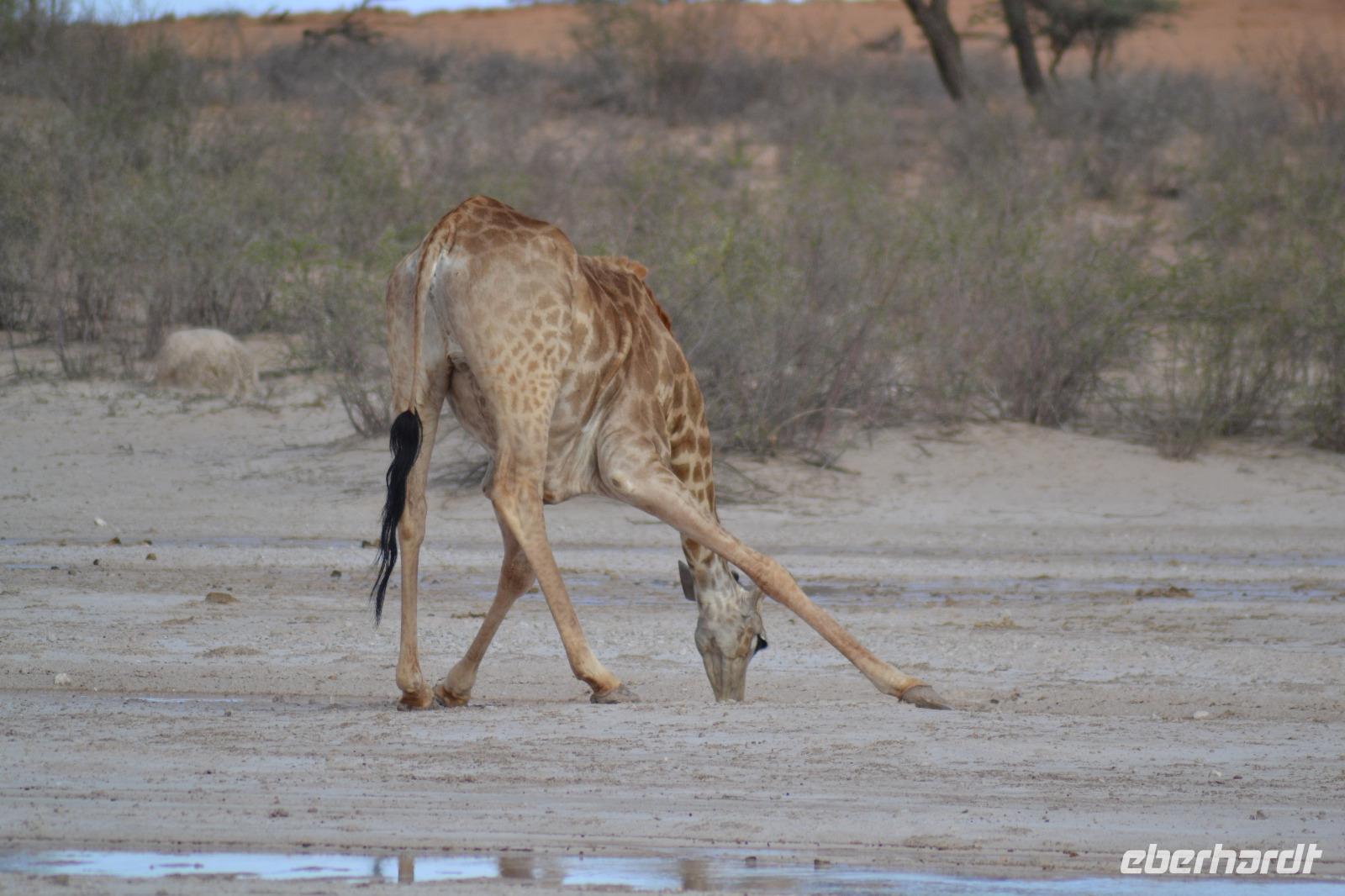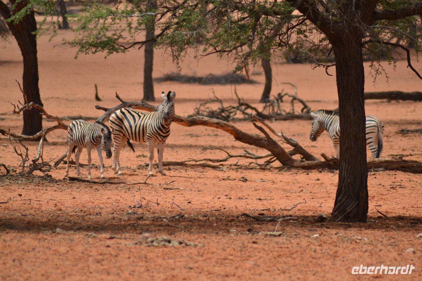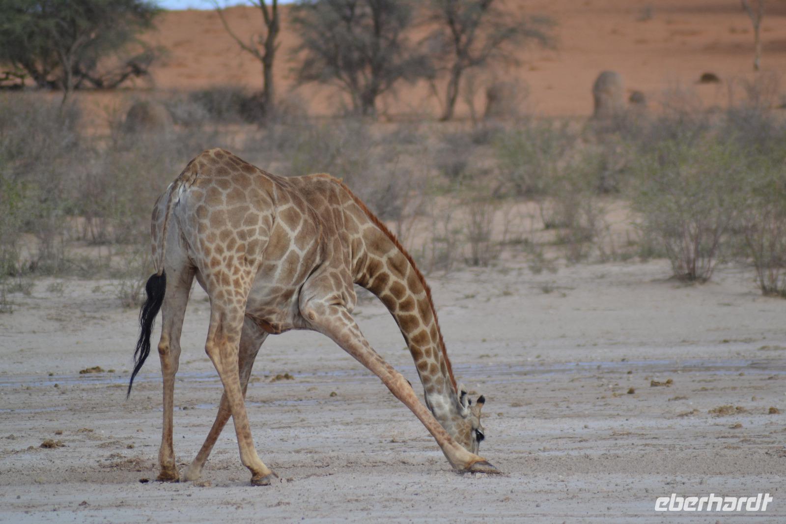 Nach einem ausgiebigen Frühstück mit einem tollen Panoramablick über die Stadt starteten wir unsere erste lange Strecke mit ca. 300 km in die Kalahari Halbwüste. Doch zunächst hatten Laura und Dagmar noch ein paar geheime Erledigungen vor. Nachdem alles im Truck verladen war ging die Fahrt über Heldenacker und somit die Überquerung des südlichen Wendekreises des Steinbocks weiter. An einer Tankstelle in Rehoboth nutzen wir die Gelegenheit unseren Kaffee weg zu bringen. Kurz hinter dem Ort Verliesen wir die asphaltierten Straßen und begaben uns auf die Schotterpisten in die Kalahari. Unterwegs Briefte uns Dagmar mit den wichtigsten Besonderheiten des Landes und worauf man unbedingt achten sollte. Besonders die Malaria Vorsorge mittels eines Gin Tonics blieb uns gut im Gedächtnis. Dies war der erste alkoholische Tipp unserer Reiseleiterin. Daran wollten wir uns auf jeden Fall halten. Mittags erreichten wir bereits unsere tolle Lodge in mitten der Natur! Einer der drei Unterkünfte in diesem privaten Gelände und auch die komfortabelste. Nach einer Pause, die wir für eigene Erkundigungen des Geländes mit ersten Tierbeobachtung, ein Sprung in den kühlen Pool oder ein Getränk an der Bar nutzen. Zum Nachmittag trafen wir uns an der Terrasse auf ein Stück Kuchen und Kaffee. Im Anschluss stand die erste Sundowner Fahrt in offenen Jeeps statt. Wir sahen unwahrscheinlich viele Tiere. Kudus, Springböcke, Zebras, Giraffen, Strauße, Löwe, Löffelhunde, und vieles mehr. Nach einer 2,5 stündigen Fahrt durch die wunderbare Natur genossen wir bei einem kühlen Getränk und kleinen Snacks den Sonnenuntergang auf der Düne. Im Hintergrund der grau bedeckte Himmel und am Ende des Horizontes ein Regenbogen. Es folgte der zweite alkoholische Tipp von Dagmar. Wir sollten alle ein Glas Sekt trinken, damit sollte der Regen kommen. Als wir unsere Lodge wieder erreichten wartet bereits ein romantisch gedeckter Tisch auf der Terrasse auf uns. Wir ließen den Abend bei einem, zwei, oder vielleicht drei Gläsern Wein ausklingen und begaben uns anschließend auf den teilweise abenteuerlichen Weg zurück in unsere Chalets.