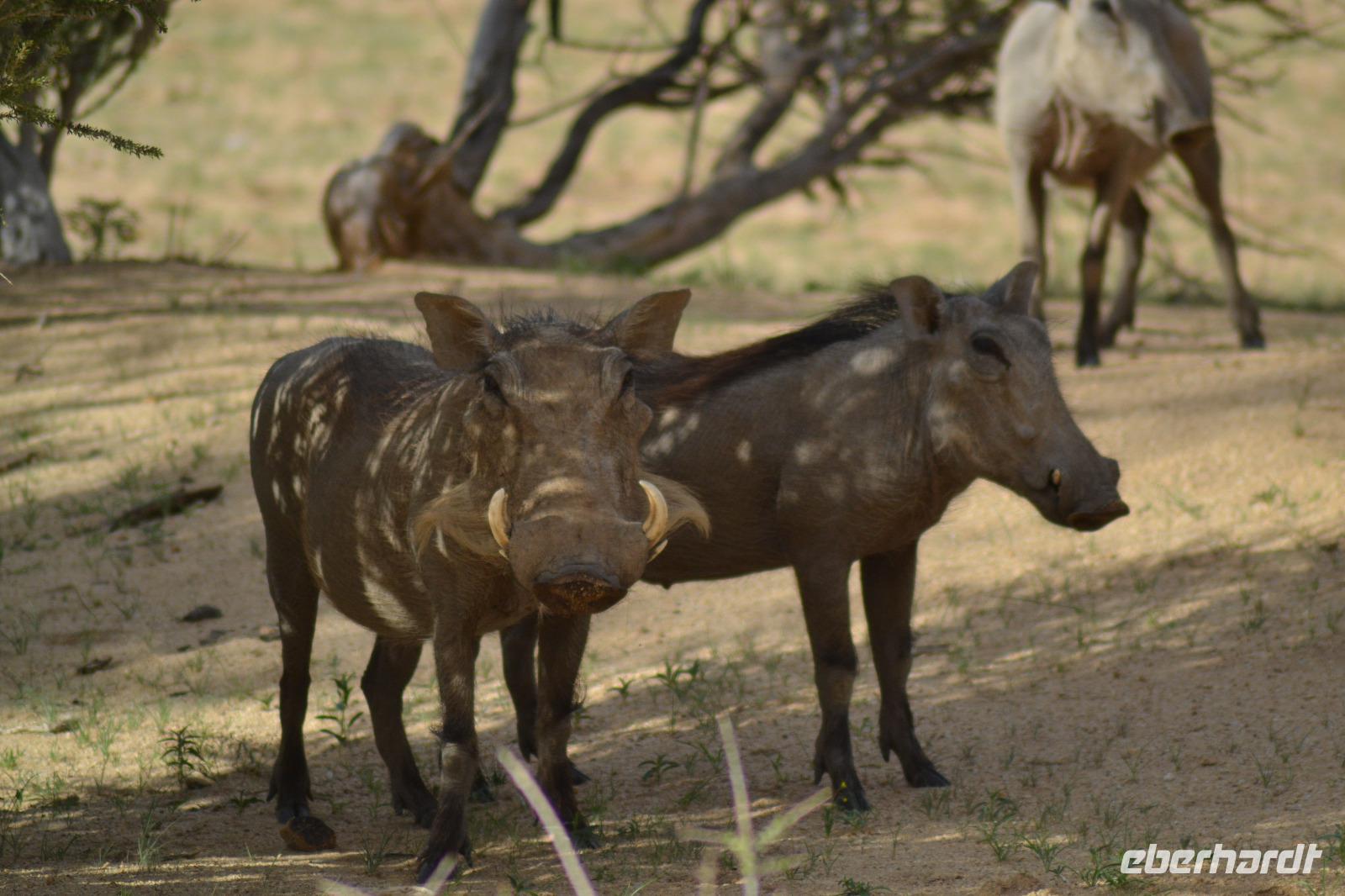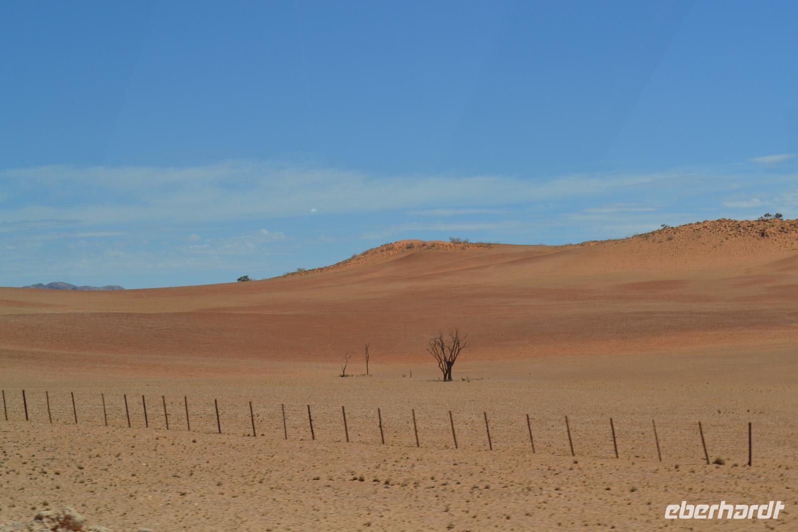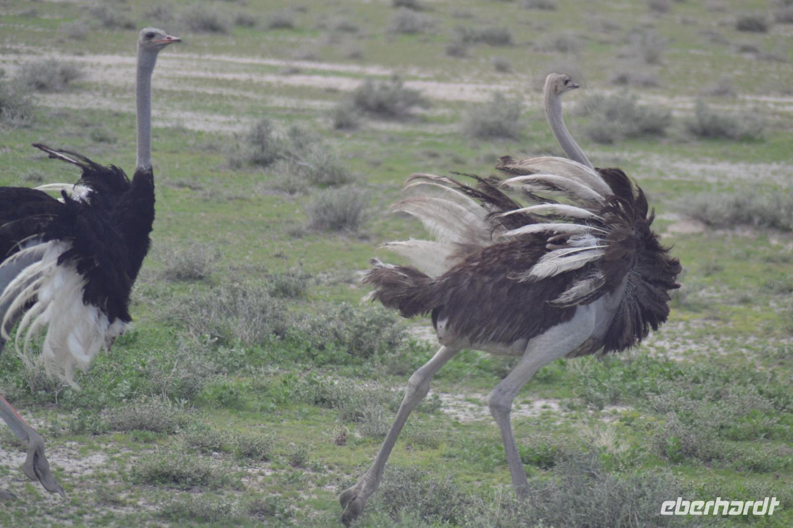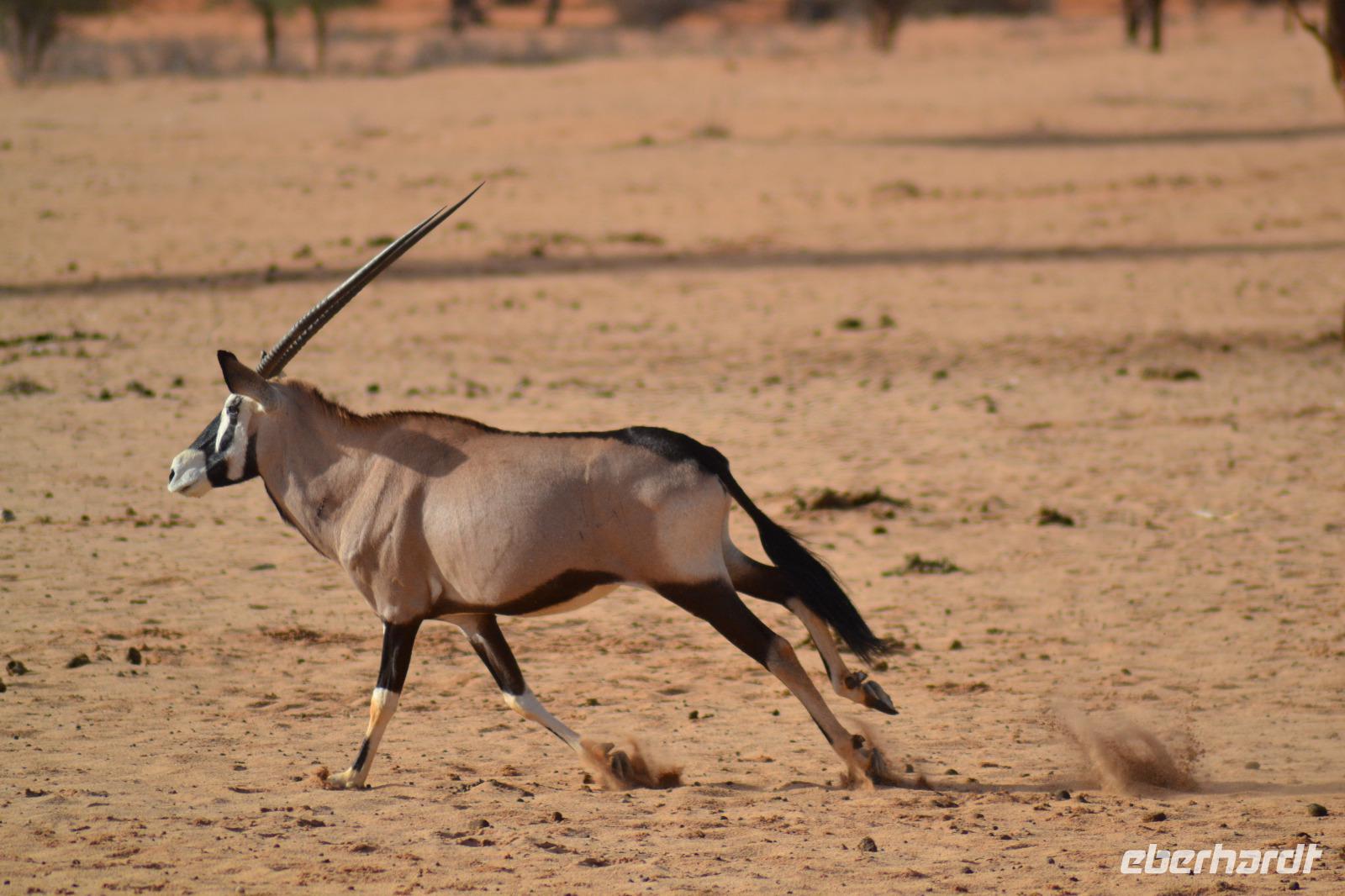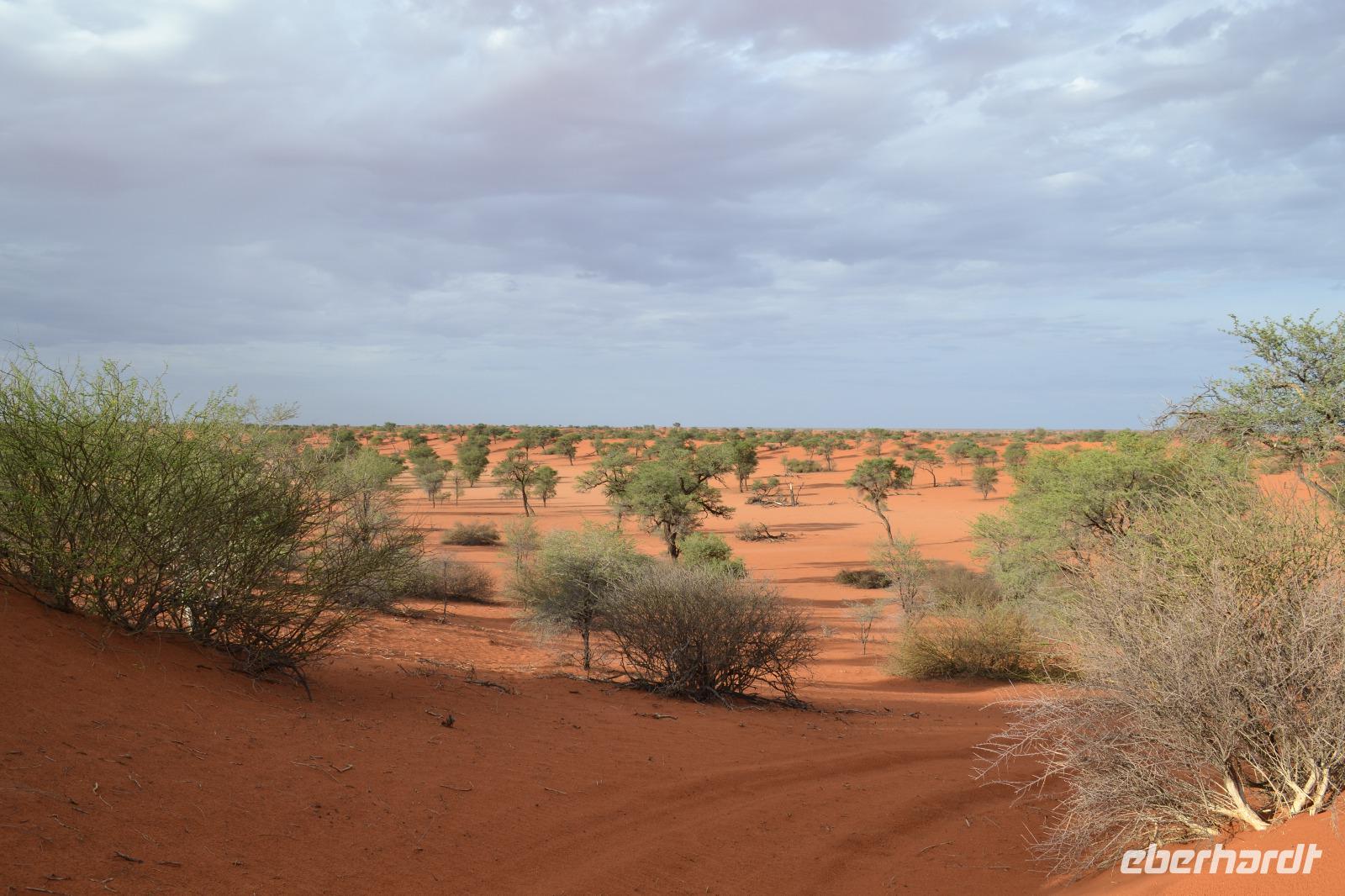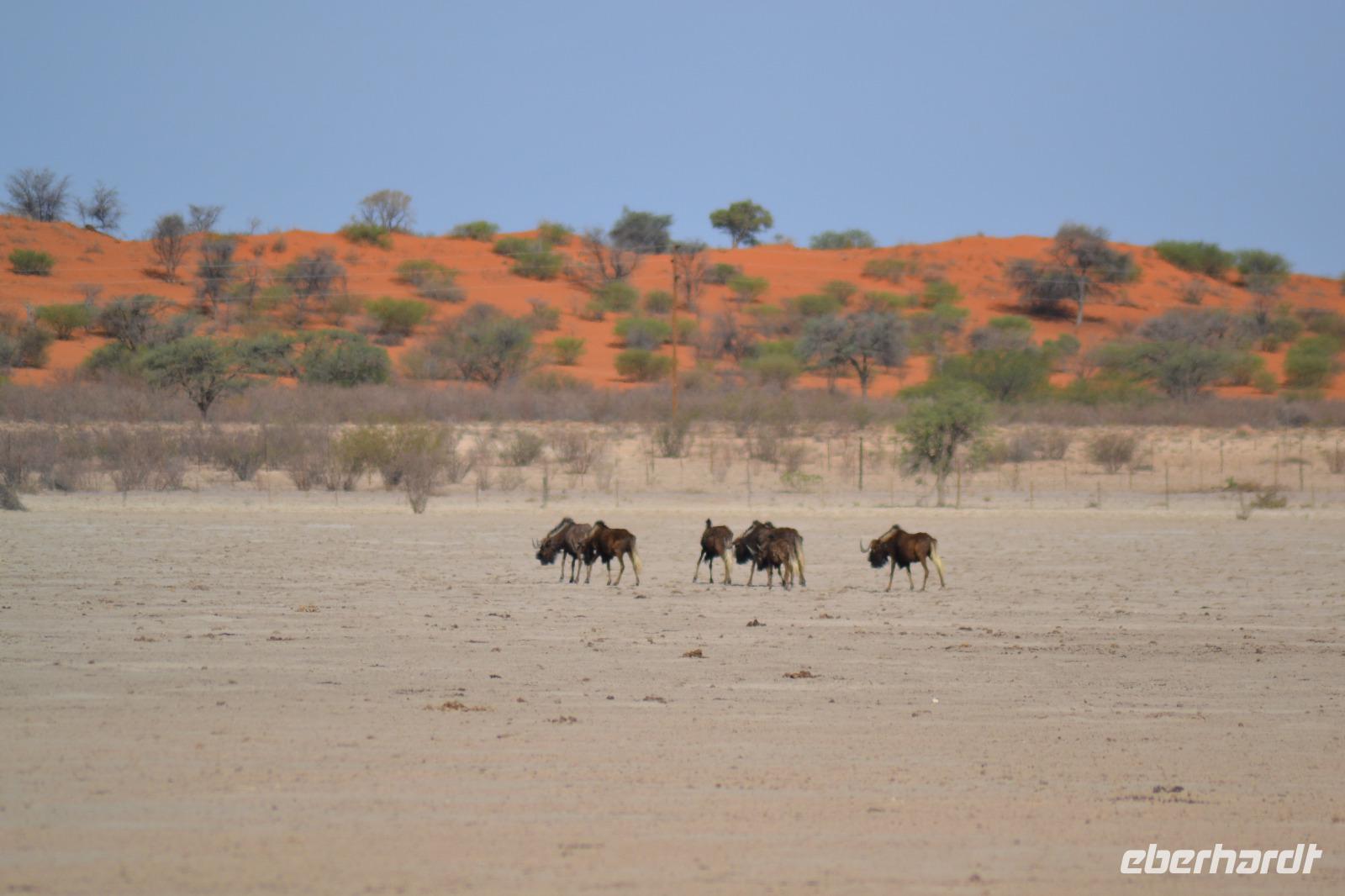 Nach einem ausgiebigen Frühstück mit einem tollen Panoramablick über die Stadt starteten wir unsere erste lange Strecke mit ca. 300 km in die Kalahari Halbwüste. Doch zunächst hatten Laura und Dagmar noch ein paar geheime Erledigungen vor. Nachdem alles im Truck verladen war ging die Fahrt über Heldenacker und somit die Überquerung des südlichen Wendekreises des Steinbocks weiter. An einer Tankstelle in Rehoboth nutzen wir die Gelegenheit unseren Kaffee weg zu bringen. Kurz hinter dem Ort Verliesen wir die asphaltierten Straßen und begaben uns auf die Schotterpisten in die Kalahari. Unterwegs Briefte uns Dagmar mit den wichtigsten Besonderheiten des Landes und worauf man unbedingt achten sollte. Besonders die Malaria Vorsorge mittels eines Gin Tonics blieb uns gut im Gedächtnis. Dies war der erste alkoholische Tipp unserer Reiseleiterin. Daran wollten wir uns auf jeden Fall halten. Mittags erreichten wir bereits unsere tolle Lodge in mitten der Natur! Einer der drei Unterkünfte in diesem privaten Gelände und auch die komfortabelste. Nach einer Pause, die wir für eigene Erkundigungen des Geländes mit ersten Tierbeobachtung, ein Sprung in den kühlen Pool oder ein Getränk an der Bar nutzen. Zum Nachmittag trafen wir uns an der Terrasse auf ein Stück Kuchen und Kaffee. Im Anschluss stand die erste Sundowner Fahrt in offenen Jeeps statt. Wir sahen unwahrscheinlich viele Tiere. Kudus, Springböcke, Zebras, Giraffen, Strauße, Löwe, Löffelhunde, und vieles mehr. Nach einer 2,5 stündigen Fahrt durch die wunderbare Natur genossen wir bei einem kühlen Getränk und kleinen Snacks den Sonnenuntergang auf der Düne. Im Hintergrund der grau bedeckte Himmel und am Ende des Horizontes ein Regenbogen. Es folgte der zweite alkoholische Tipp von Dagmar. Wir sollten alle ein Glas Sekt trinken, damit sollte der Regen kommen. Als wir unsere Lodge wieder erreichten wartet bereits ein romantisch gedeckter Tisch auf der Terrasse auf uns. Wir ließen den Abend bei einem, zwei, oder vielleicht drei Gläsern Wein ausklingen und begaben uns anschließend auf den teilweise abenteuerlichen Weg zurück in unsere Chalets.