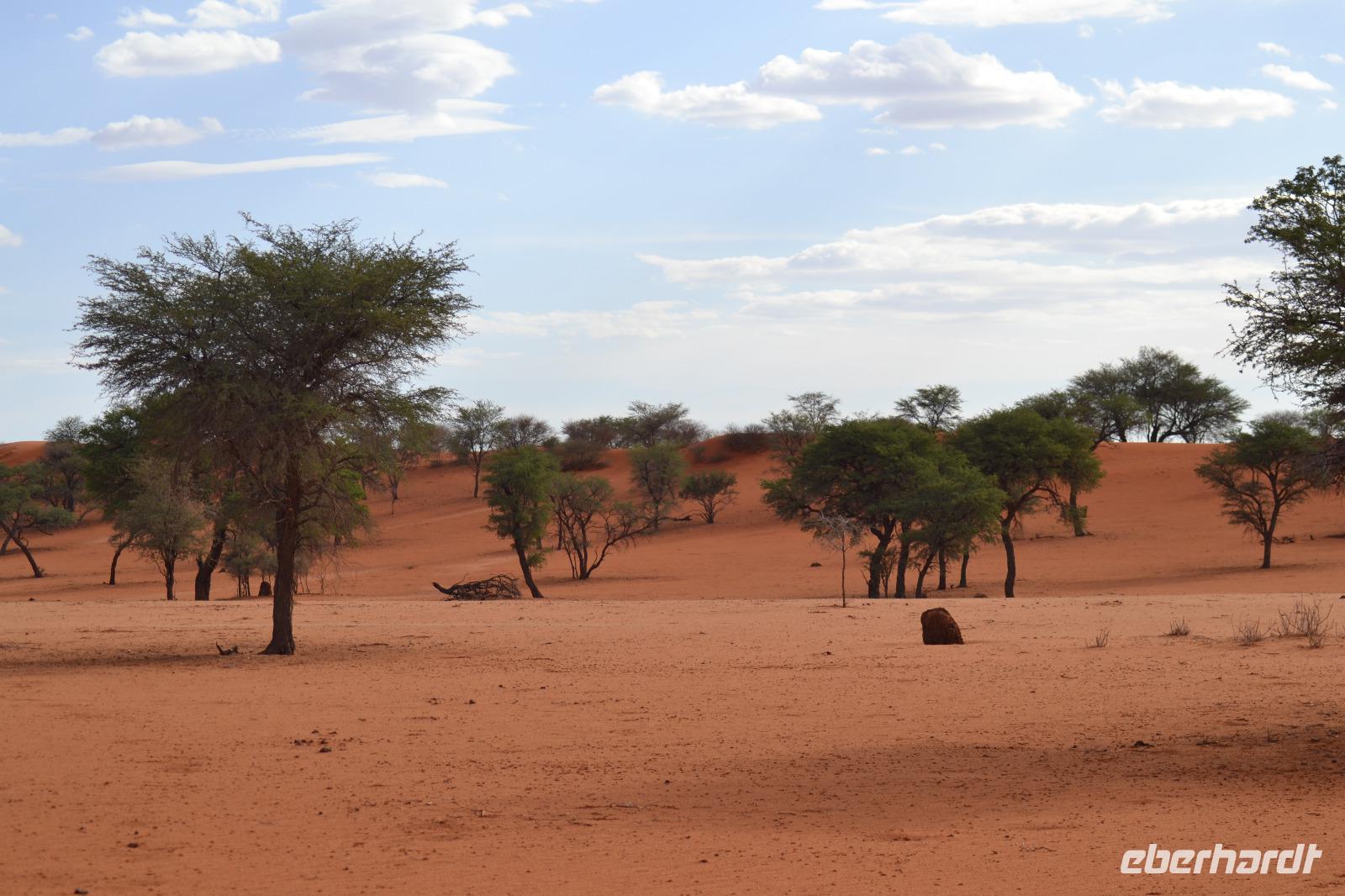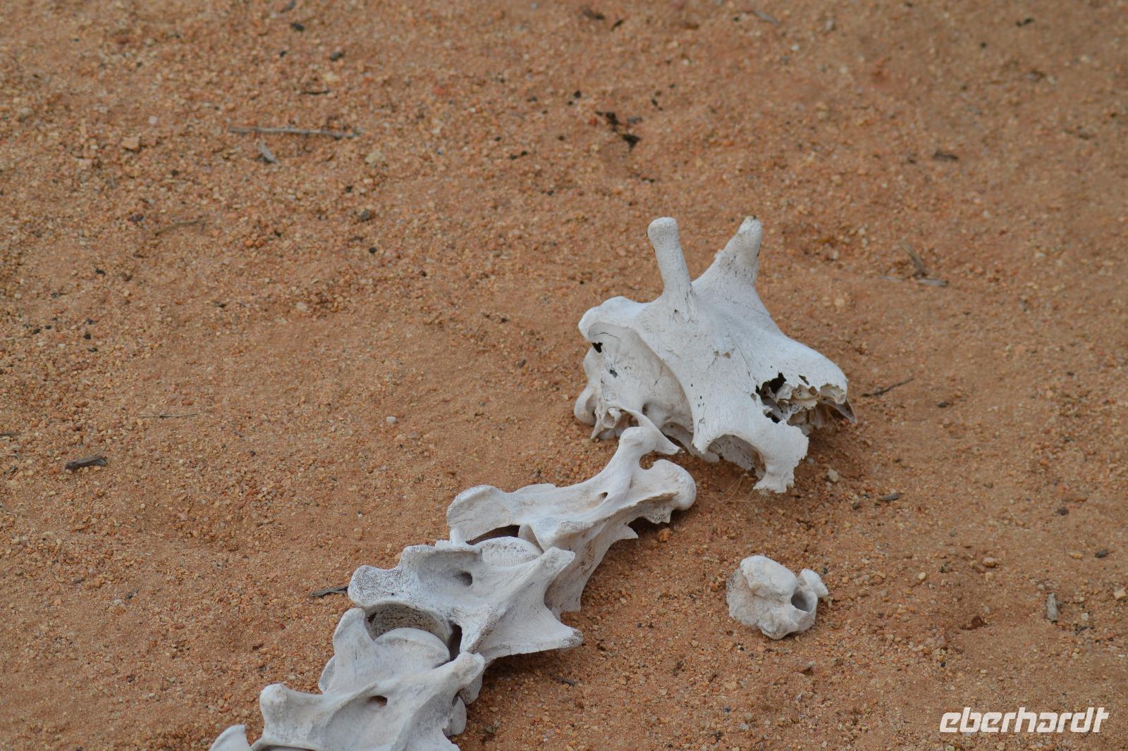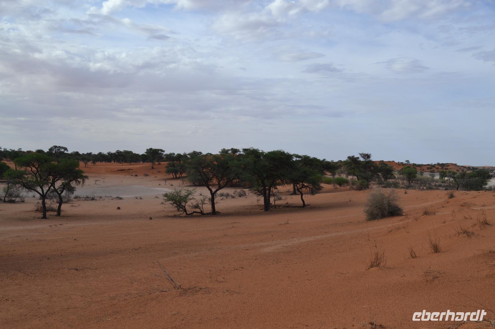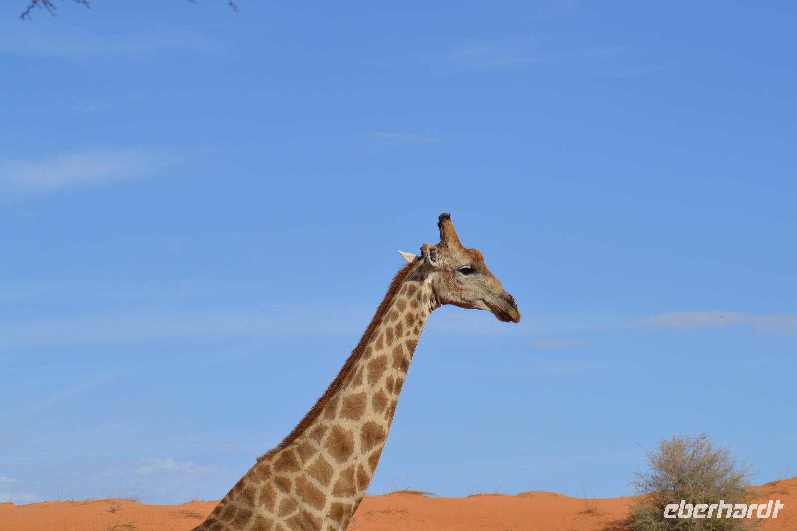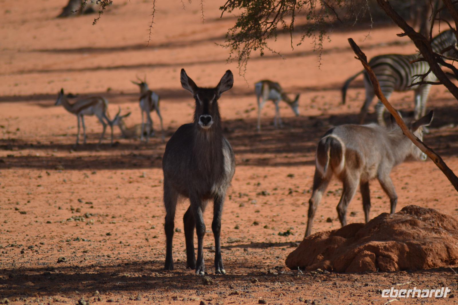 Nach einem ausgiebigen Frühstück mit einem tollen Panoramablick über die Stadt starteten wir unsere erste lange Strecke mit ca. 300 km in die Kalahari Halbwüste. Doch zunächst hatten Laura und Dagmar noch ein paar geheime Erledigungen vor. Nachdem alles im Truck verladen war ging die Fahrt über Heldenacker und somit die Überquerung des südlichen Wendekreises des Steinbocks weiter. An einer Tankstelle in Rehoboth nutzen wir die Gelegenheit unseren Kaffee weg zu bringen. Kurz hinter dem Ort Verliesen wir die asphaltierten Straßen und begaben uns auf die Schotterpisten in die Kalahari. Unterwegs Briefte uns Dagmar mit den wichtigsten Besonderheiten des Landes und worauf man unbedingt achten sollte. Besonders die Malaria Vorsorge mittels eines Gin Tonics blieb uns gut im Gedächtnis. Dies war der erste alkoholische Tipp unserer Reiseleiterin. Daran wollten wir uns auf jeden Fall halten. Mittags erreichten wir bereits unsere tolle Lodge in mitten der Natur! Einer der drei Unterkünfte in diesem privaten Gelände und auch die komfortabelste. Nach einer Pause, die wir für eigene Erkundigungen des Geländes mit ersten Tierbeobachtung, ein Sprung in den kühlen Pool oder ein Getränk an der Bar nutzen. Zum Nachmittag trafen wir uns an der Terrasse auf ein Stück Kuchen und Kaffee. Im Anschluss stand die erste Sundowner Fahrt in offenen Jeeps statt. Wir sahen unwahrscheinlich viele Tiere. Kudus, Springböcke, Zebras, Giraffen, Strauße, Löwe, Löffelhunde, und vieles mehr. Nach einer 2,5 stündigen Fahrt durch die wunderbare Natur genossen wir bei einem kühlen Getränk und kleinen Snacks den Sonnenuntergang auf der Düne. Im Hintergrund der grau bedeckte Himmel und am Ende des Horizontes ein Regenbogen. Es folgte der zweite alkoholische Tipp von Dagmar. Wir sollten alle ein Glas Sekt trinken, damit sollte der Regen kommen. Als wir unsere Lodge wieder erreichten wartet bereits ein romantisch gedeckter Tisch auf der Terrasse auf uns. Wir ließen den Abend bei einem, zwei, oder vielleicht drei Gläsern Wein ausklingen und begaben uns anschließend auf den teilweise abenteuerlichen Weg zurück in unsere Chalets.