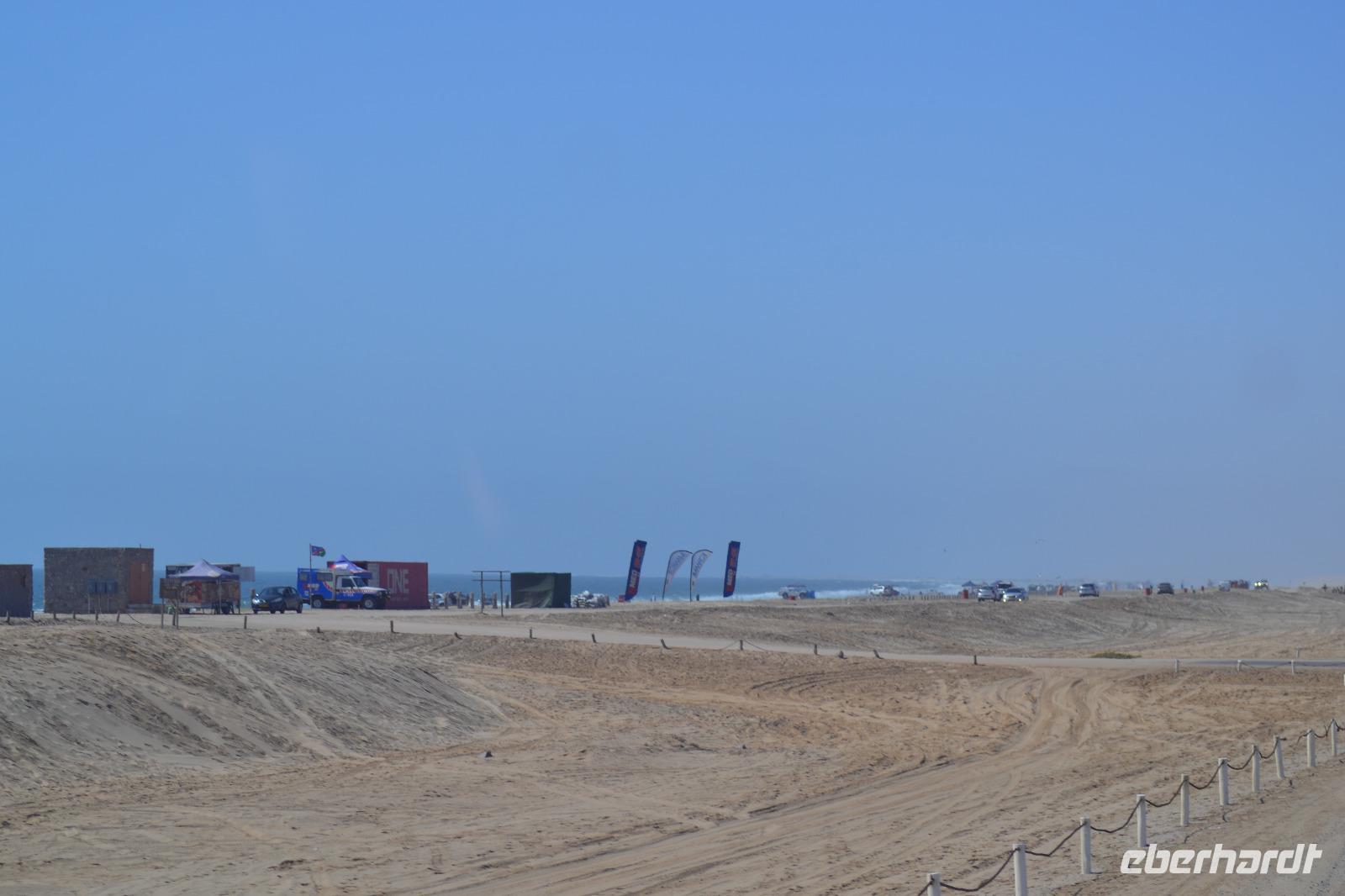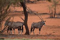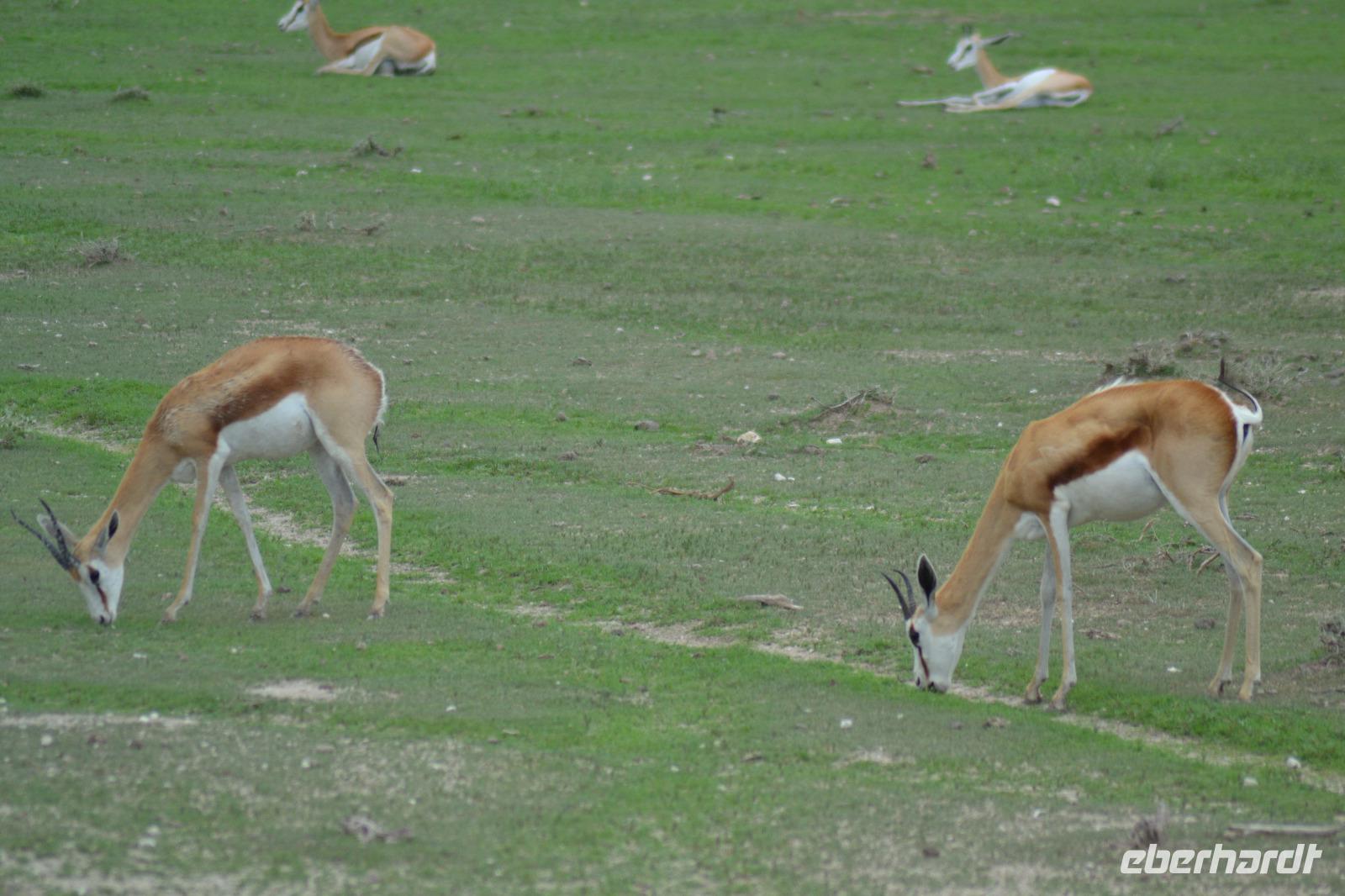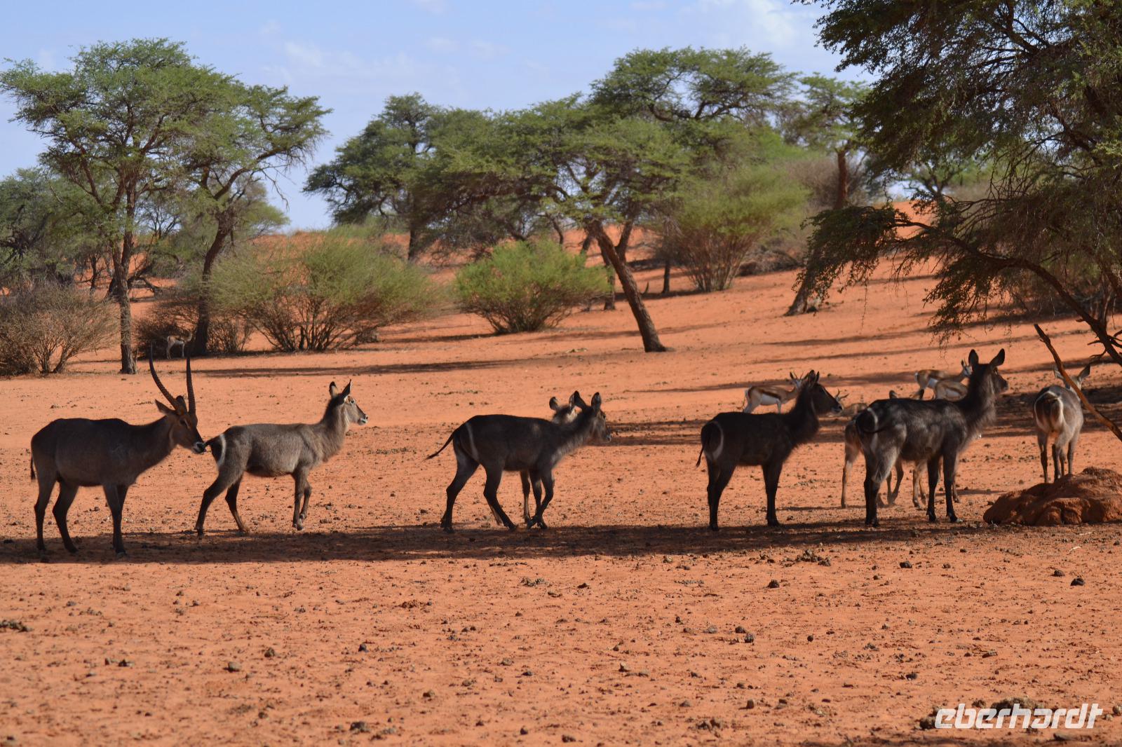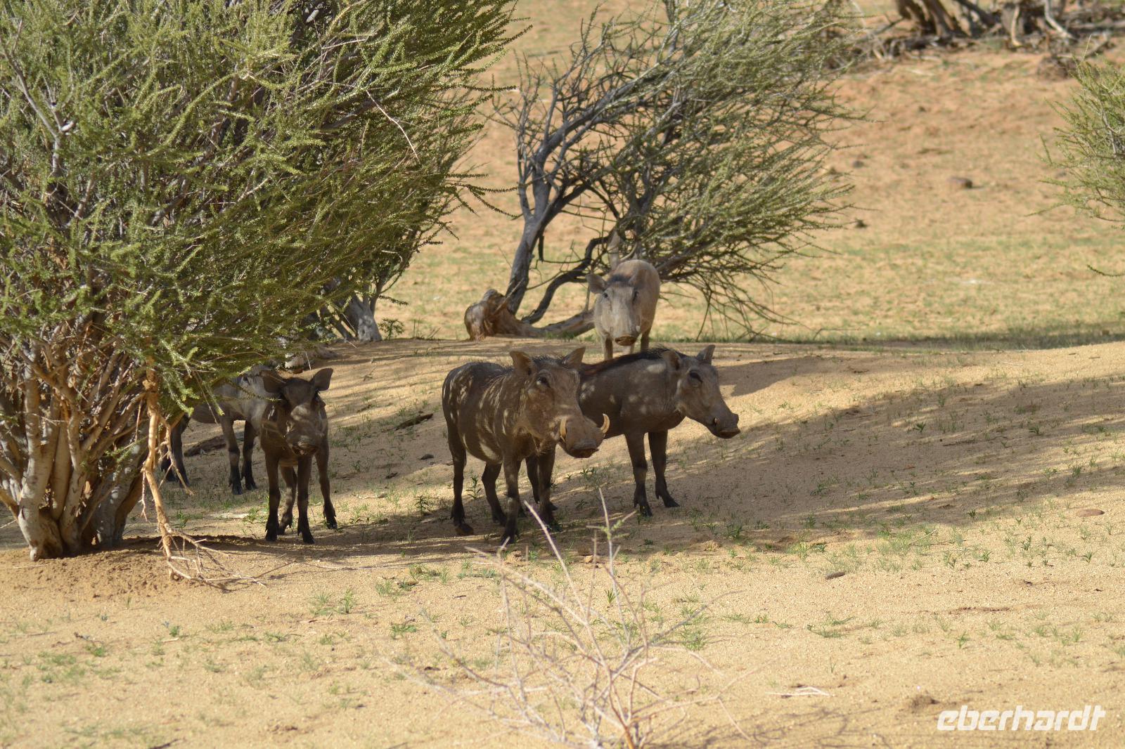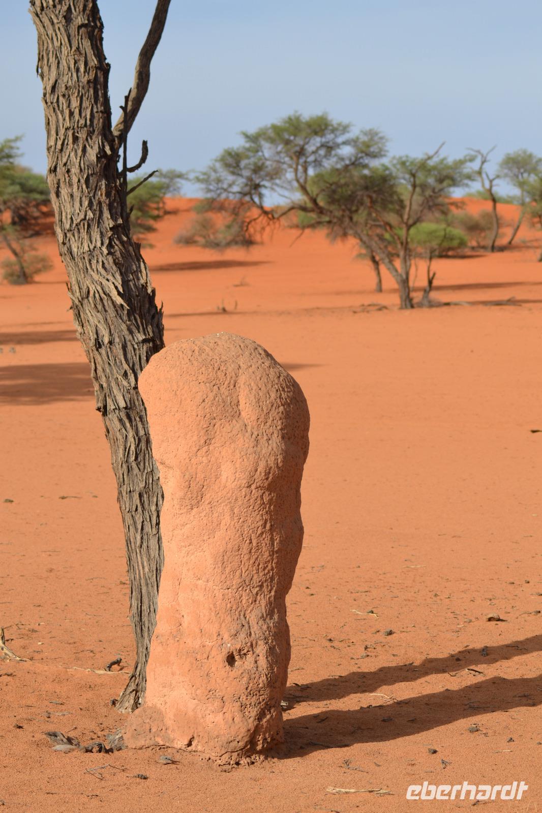 Nach einem ausgiebigen Frühstück mit einem tollen Panoramablick über die Stadt starteten wir unsere erste lange Strecke mit ca. 300 km in die Kalahari Halbwüste. Doch zunächst hatten Laura und Dagmar noch ein paar geheime Erledigungen vor. Nachdem alles im Truck verladen war ging die Fahrt über Heldenacker und somit die Überquerung des südlichen Wendekreises des Steinbocks weiter. An einer Tankstelle in Rehoboth nutzen wir die Gelegenheit unseren Kaffee weg zu bringen. Kurz hinter dem Ort Verliesen wir die asphaltierten Straßen und begaben uns auf die Schotterpisten in die Kalahari. Unterwegs Briefte uns Dagmar mit den wichtigsten Besonderheiten des Landes und worauf man unbedingt achten sollte. Besonders die Malaria Vorsorge mittels eines Gin Tonics blieb uns gut im Gedächtnis. Dies war der erste alkoholische Tipp unserer Reiseleiterin. Daran wollten wir uns auf jeden Fall halten. Mittags erreichten wir bereits unsere tolle Lodge in mitten der Natur! Einer der drei Unterkünfte in diesem privaten Gelände und auch die komfortabelste. Nach einer Pause, die wir für eigene Erkundigungen des Geländes mit ersten Tierbeobachtung, ein Sprung in den kühlen Pool oder ein Getränk an der Bar nutzen. Zum Nachmittag trafen wir uns an der Terrasse auf ein Stück Kuchen und Kaffee. Im Anschluss stand die erste Sundowner Fahrt in offenen Jeeps statt. Wir sahen unwahrscheinlich viele Tiere. Kudus, Springböcke, Zebras, Giraffen, Strauße, Löwe, Löffelhunde, und vieles mehr. Nach einer 2,5 stündigen Fahrt durch die wunderbare Natur genossen wir bei einem kühlen Getränk und kleinen Snacks den Sonnenuntergang auf der Düne. Im Hintergrund der grau bedeckte Himmel und am Ende des Horizontes ein Regenbogen. Es folgte der zweite alkoholische Tipp von Dagmar. Wir sollten alle ein Glas Sekt trinken, damit sollte der Regen kommen. Als wir unsere Lodge wieder erreichten wartet bereits ein romantisch gedeckter Tisch auf der Terrasse auf uns. Wir ließen den Abend bei einem, zwei, oder vielleicht drei Gläsern Wein ausklingen und begaben uns anschließend auf den teilweise abenteuerlichen Weg zurück in unsere Chalets.