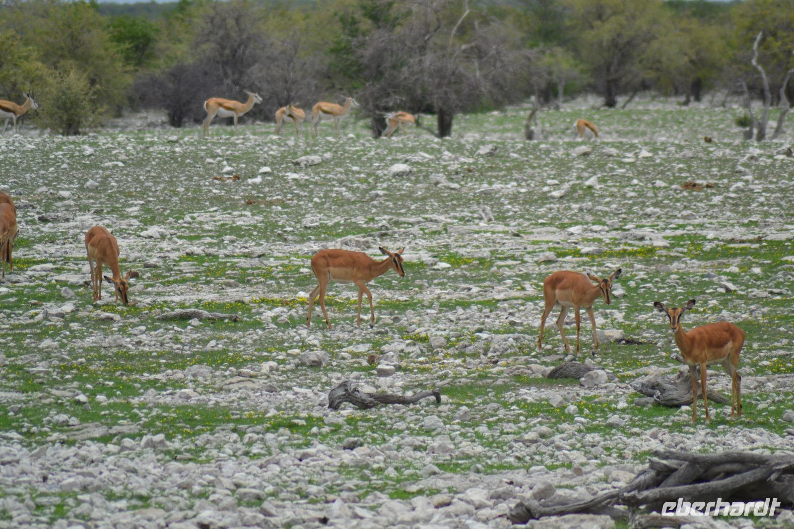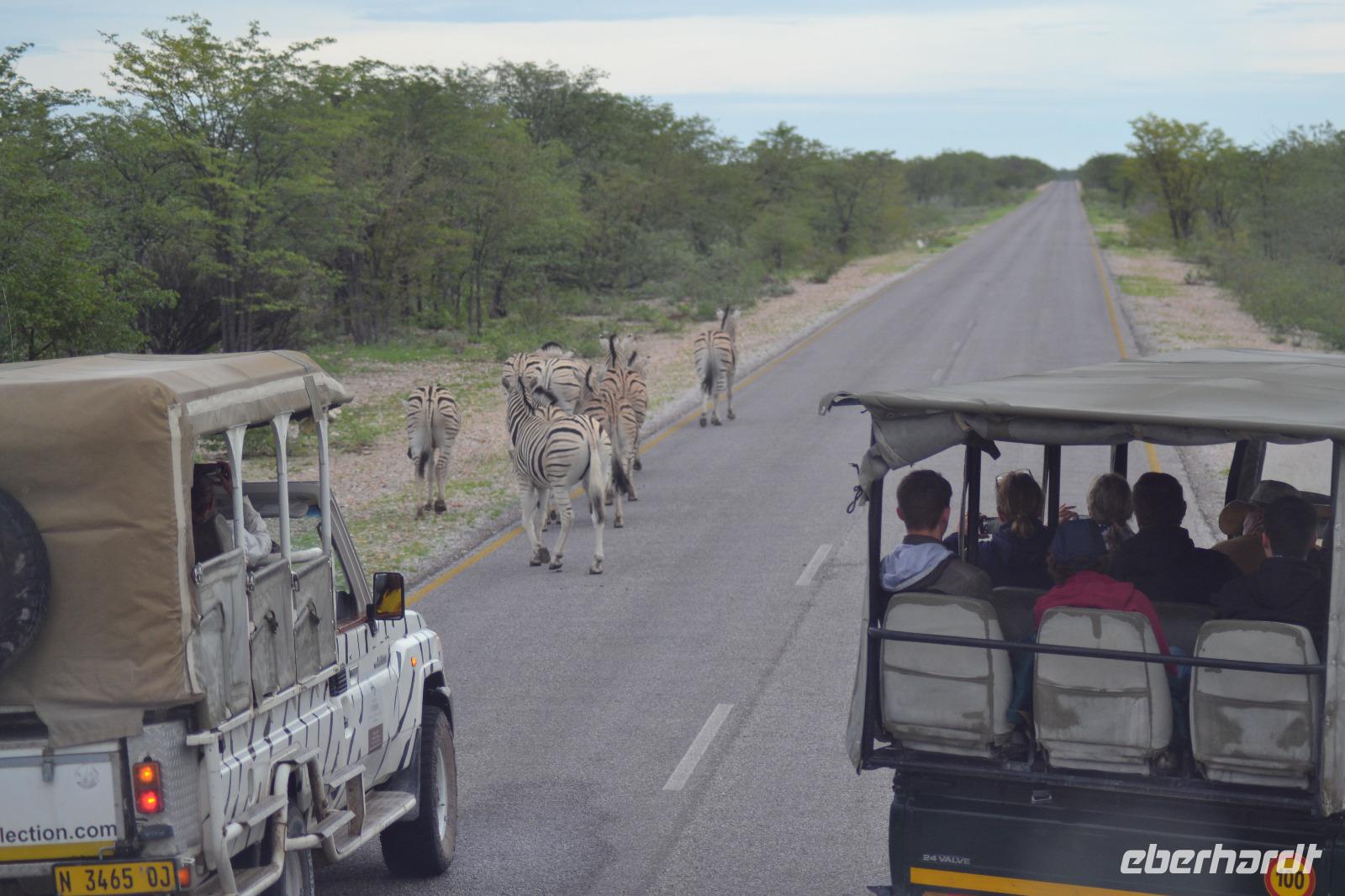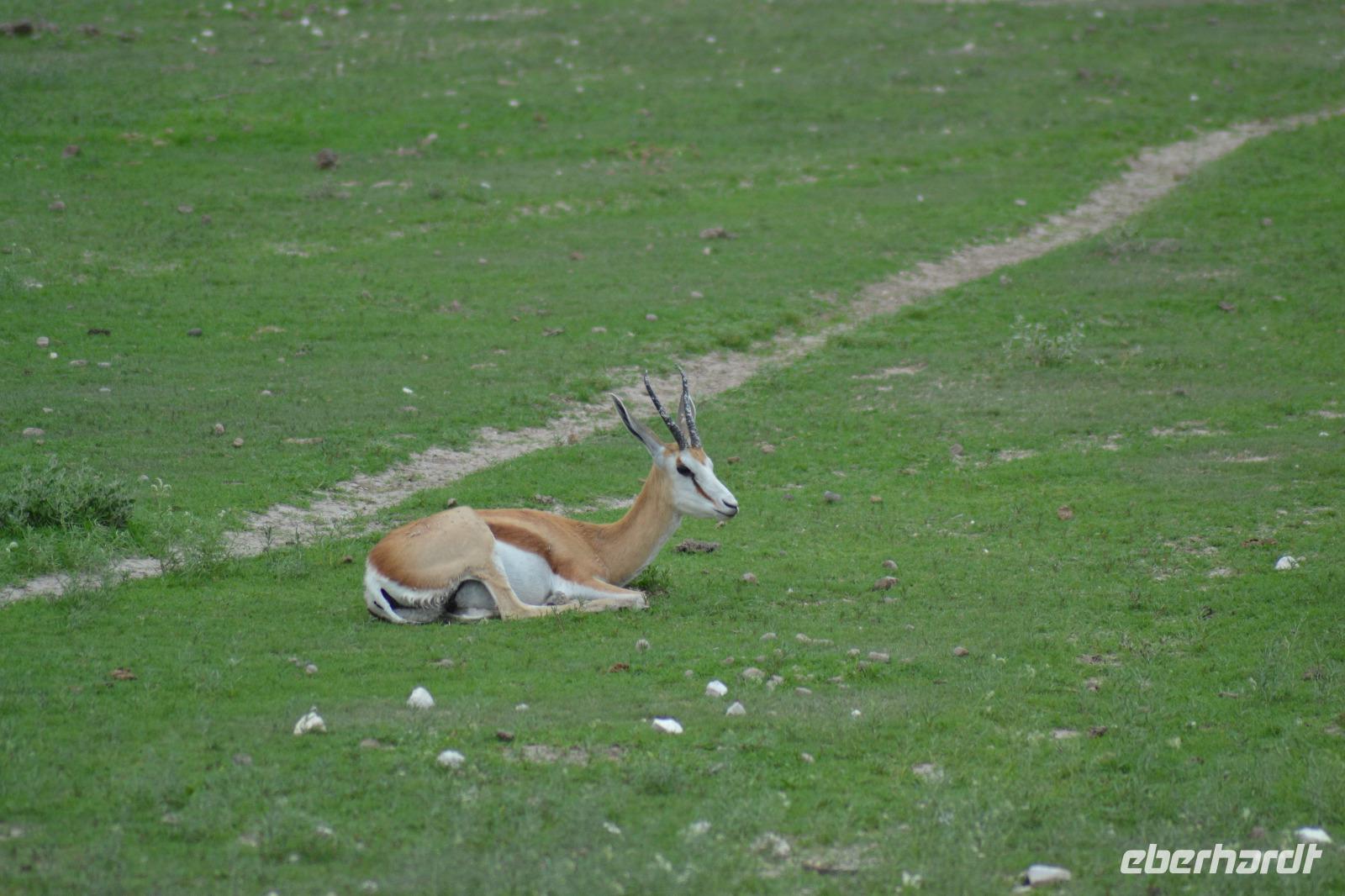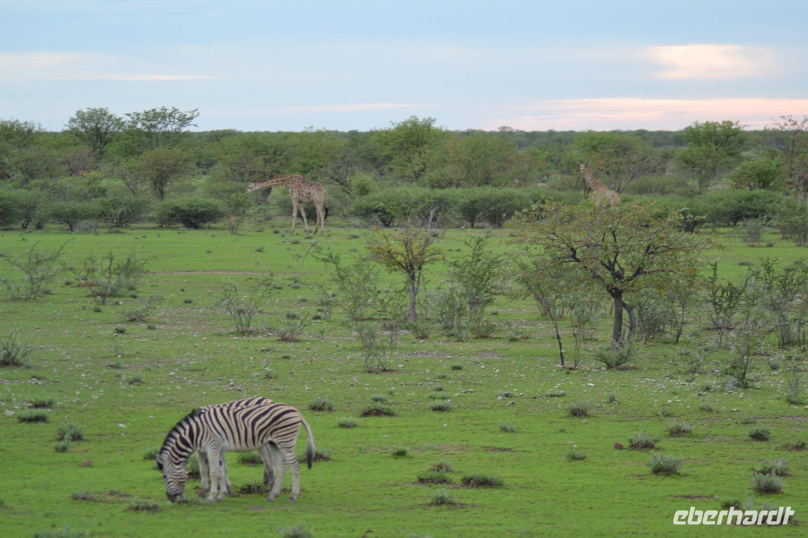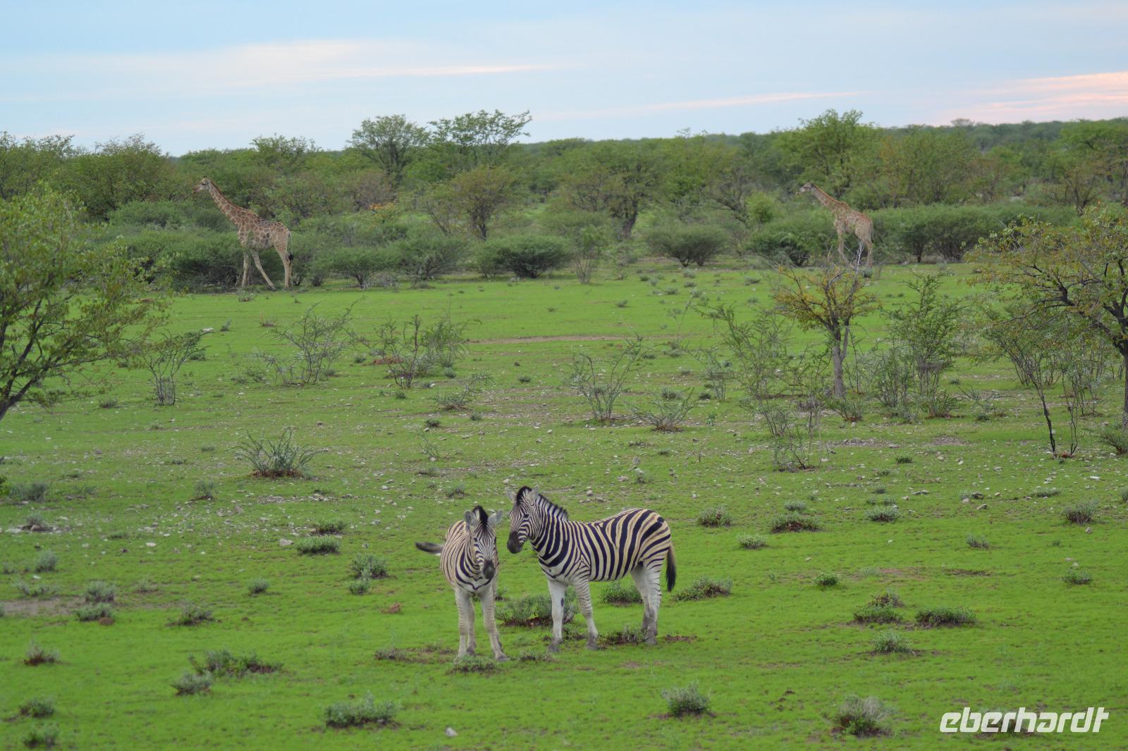 Am Morgen fuhren wir die Schotterstraße durch den Park Richtung Etosha-Nationalpark. Heute war unsere Fahrtstrecke nicht so lang und der Großteil auf einer asphaltierten Straße. Wir legten eine Pause bei der Bäckerei von Anastasia in Outjio ein. Die Namibianerin lebte eine lange Zeit in der Schweiz. Zusammen mit Ihrem Mann gründete sie die Bäckerei mit leckeren deutschen Kuchen. In dem kleinen Ort mit ungefähr 100.000 Einwohnern stöberten wir auch in einem schönen Souvenir Geschäft nach tollen Kunst Artikeln. Mittag trafen wir am Nationalpark ein und fuhren mit unserem Truck direkt auf die erste Pirschfahrt. In den letzten Tagen regnete es in den nördlichen Teil von Namibia sehr viel, sodass man leider nicht allzu viele Tiere sah. Wir gönnten es den Lebewesen, denn sie waren nicht mehr gezwungen die Wasserlöcher aufzusuchen. Dennoch sahen wir große Herden von Zebras, Springböcken, Gnus und Giraffen. Am Abend bezogen wir unsere Zimmer im Hotel und genossen ein kühles Getränk, sowie ein leckeres Buffet auf der Sundowner Terrasse.