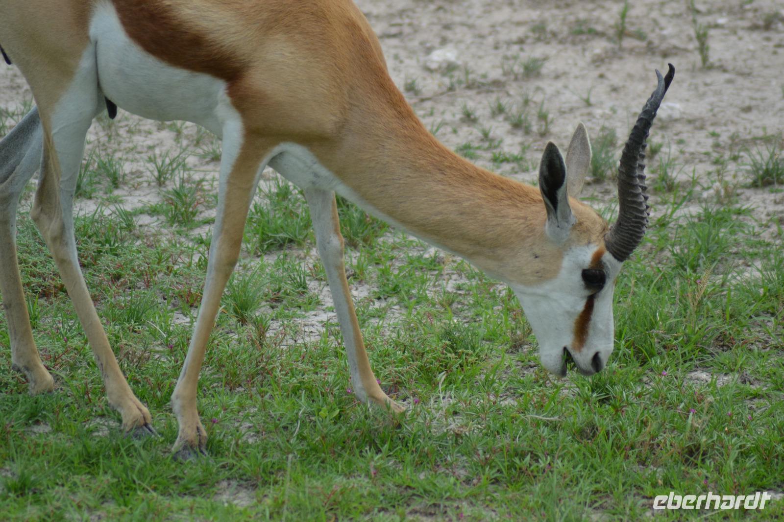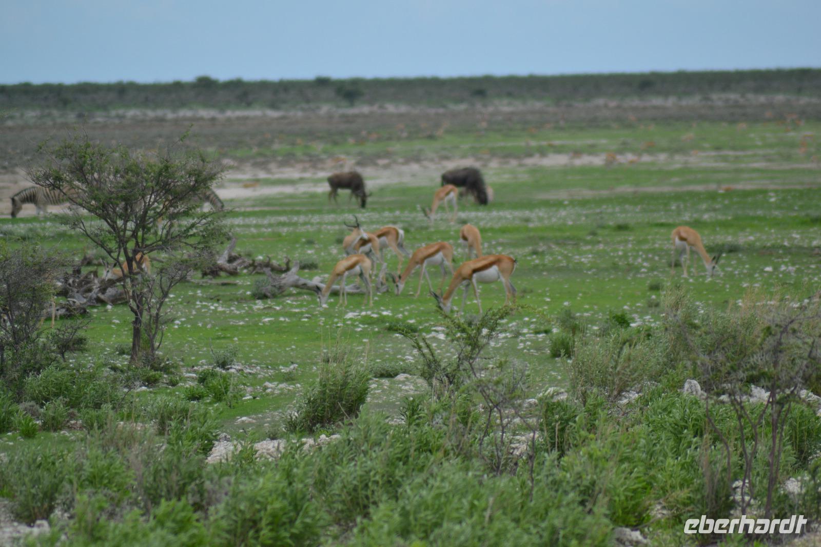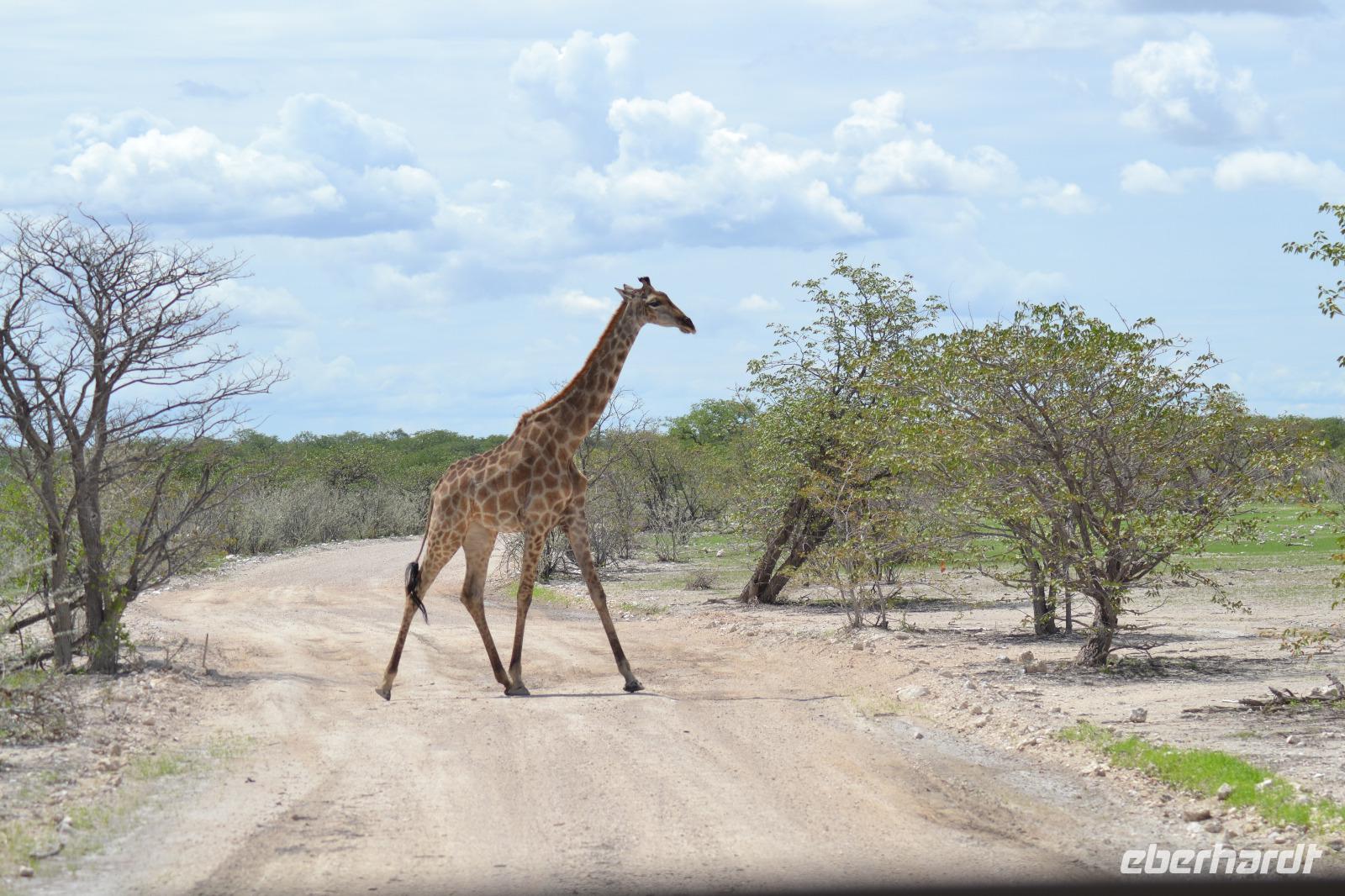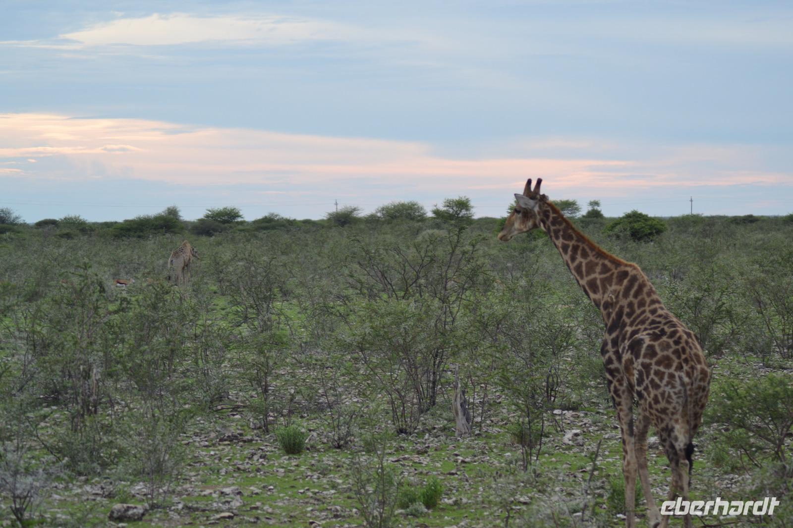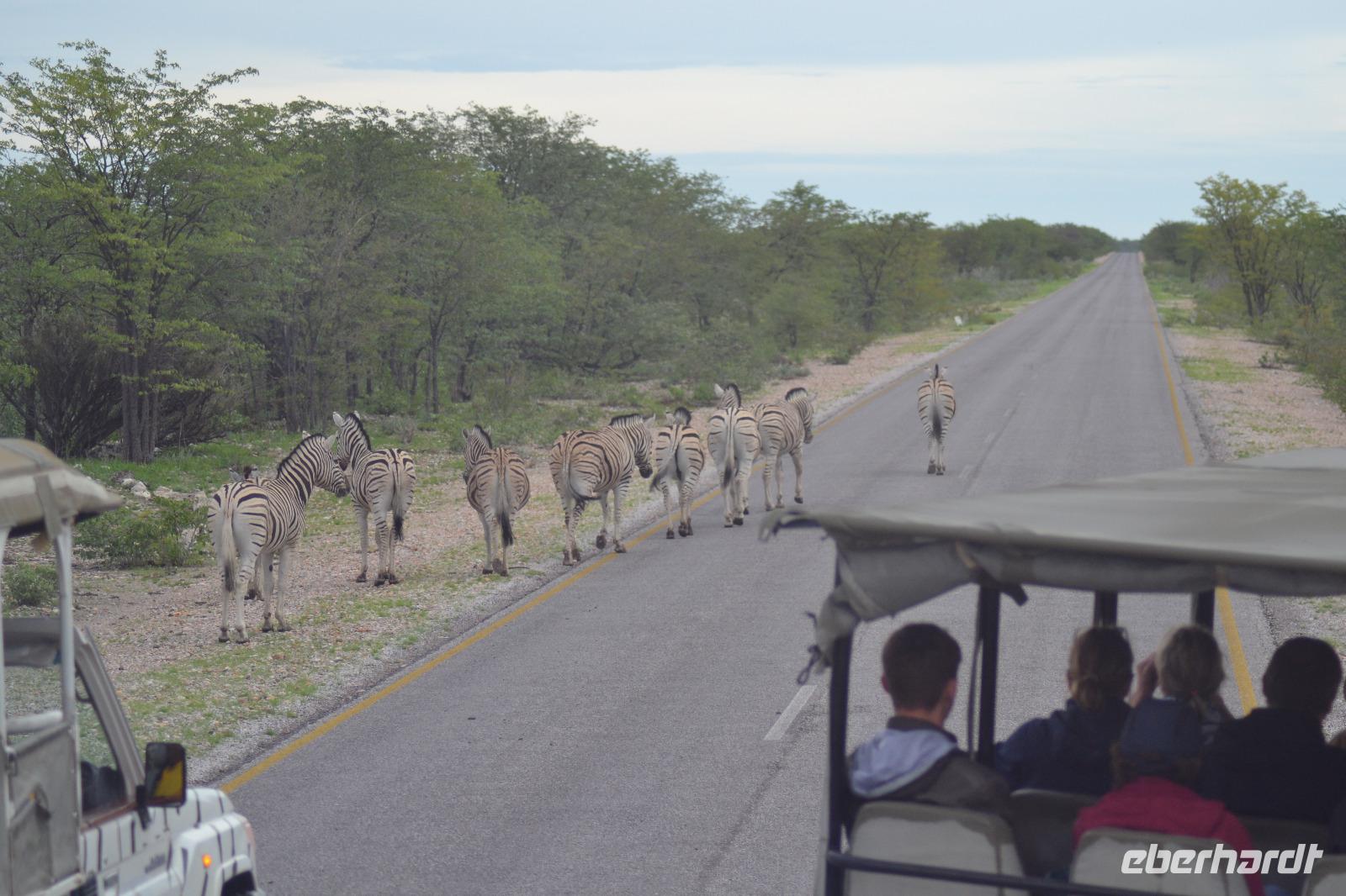 Am Morgen fuhren wir die Schotterstraße durch den Park Richtung Etosha-Nationalpark. Heute war unsere Fahrtstrecke nicht so lang und der Großteil auf einer asphaltierten Straße. Wir legten eine Pause bei der Bäckerei von Anastasia in Outjio ein. Die Namibianerin lebte eine lange Zeit in der Schweiz. Zusammen mit Ihrem Mann gründete sie die Bäckerei mit leckeren deutschen Kuchen. In dem kleinen Ort mit ungefähr 100.000 Einwohnern stöberten wir auch in einem schönen Souvenir Geschäft nach tollen Kunst Artikeln. Mittag trafen wir am Nationalpark ein und fuhren mit unserem Truck direkt auf die erste Pirschfahrt. In den letzten Tagen regnete es in den nördlichen Teil von Namibia sehr viel, sodass man leider nicht allzu viele Tiere sah. Wir gönnten es den Lebewesen, denn sie waren nicht mehr gezwungen die Wasserlöcher aufzusuchen. Dennoch sahen wir große Herden von Zebras, Springböcken, Gnus und Giraffen. Am Abend bezogen wir unsere Zimmer im Hotel und genossen ein kühles Getränk, sowie ein leckeres Buffet auf der Sundowner Terrasse.