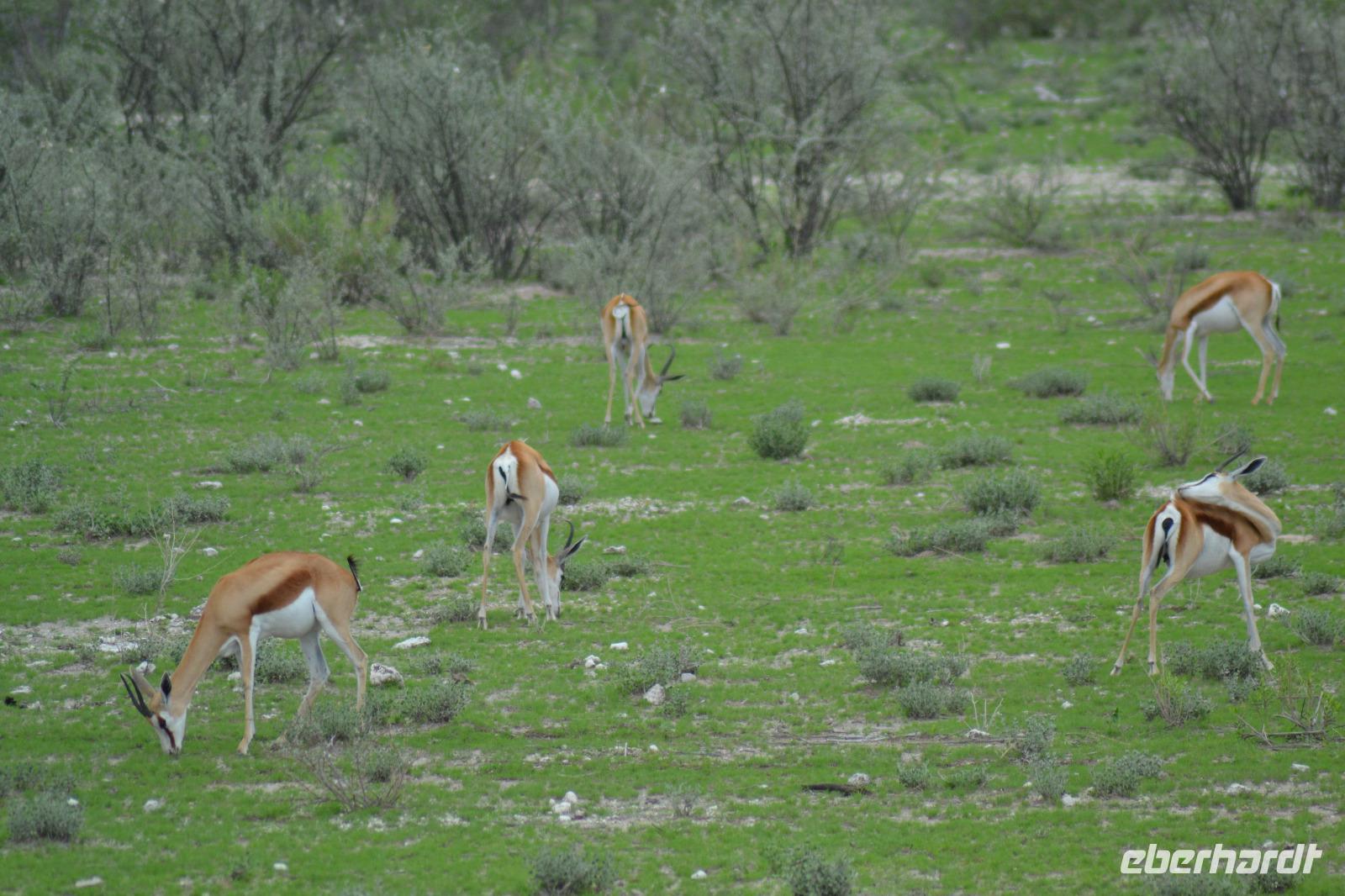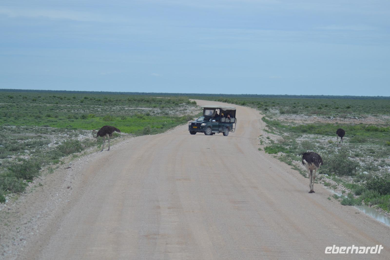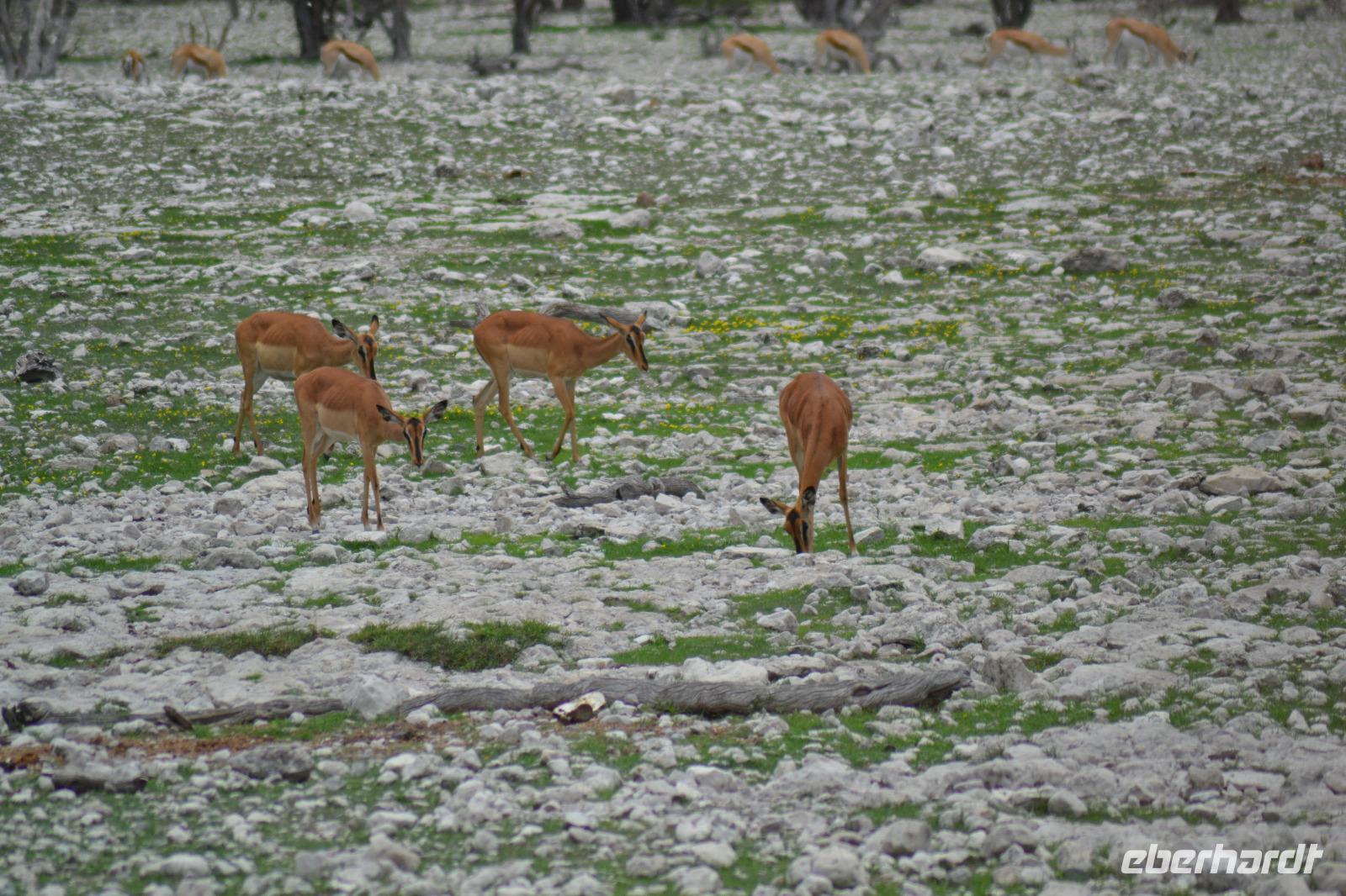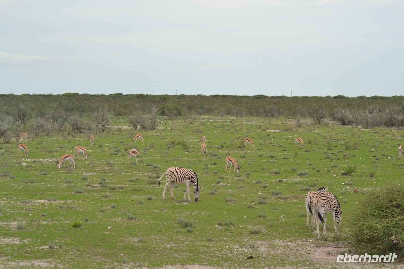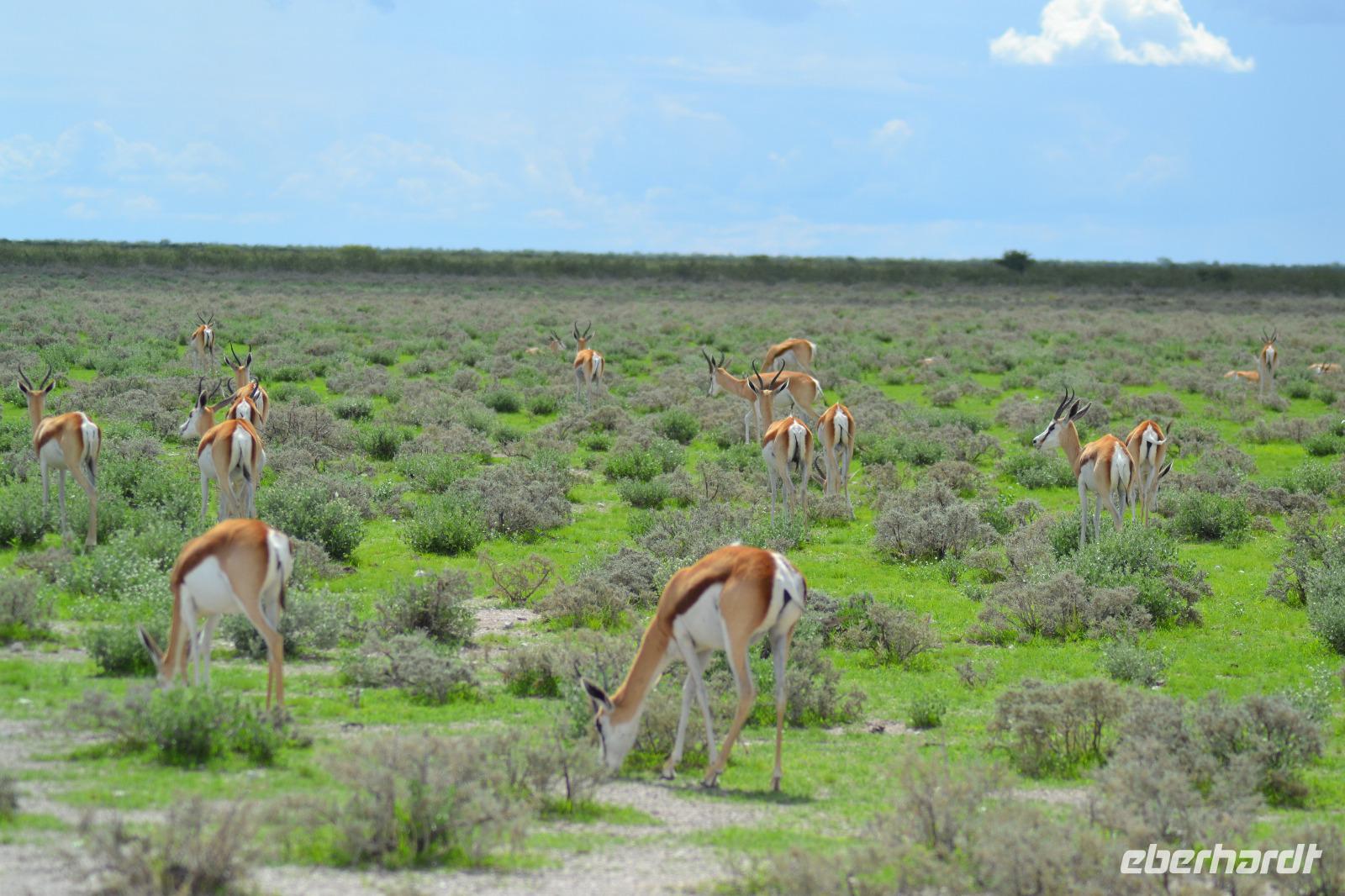 Am Morgen fuhren wir die Schotterstraße durch den Park Richtung Etosha-Nationalpark. Heute war unsere Fahrtstrecke nicht so lang und der Großteil auf einer asphaltierten Straße. Wir legten eine Pause bei der Bäckerei von Anastasia in Outjio ein. Die Namibianerin lebte eine lange Zeit in der Schweiz. Zusammen mit Ihrem Mann gründete sie die Bäckerei mit leckeren deutschen Kuchen. In dem kleinen Ort mit ungefähr 100.000 Einwohnern stöberten wir auch in einem schönen Souvenir Geschäft nach tollen Kunst Artikeln. Mittag trafen wir am Nationalpark ein und fuhren mit unserem Truck direkt auf die erste Pirschfahrt. In den letzten Tagen regnete es in den nördlichen Teil von Namibia sehr viel, sodass man leider nicht allzu viele Tiere sah. Wir gönnten es den Lebewesen, denn sie waren nicht mehr gezwungen die Wasserlöcher aufzusuchen. Dennoch sahen wir große Herden von Zebras, Springböcken, Gnus und Giraffen. Am Abend bezogen wir unsere Zimmer im Hotel und genossen ein kühles Getränk, sowie ein leckeres Buffet auf der Sundowner Terrasse.