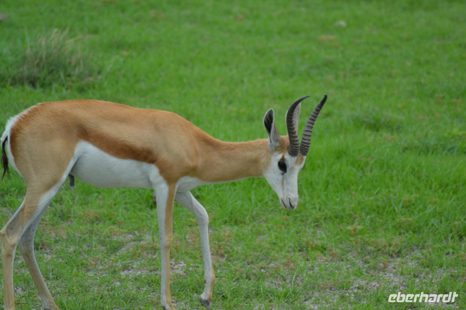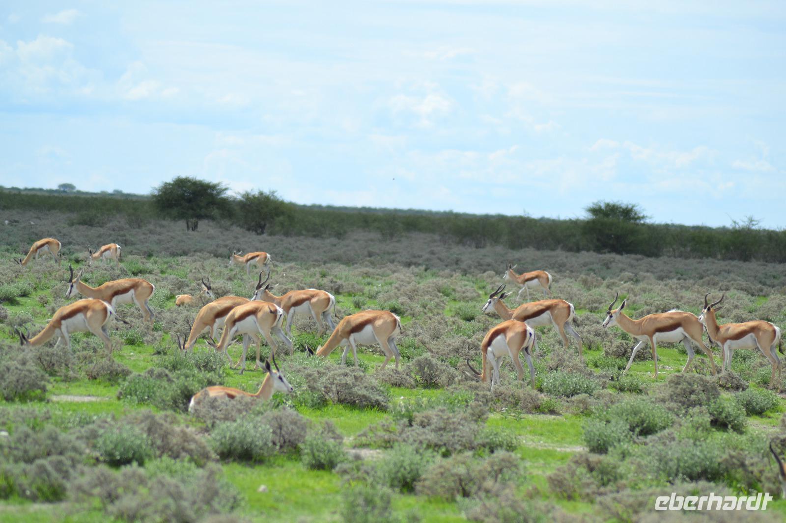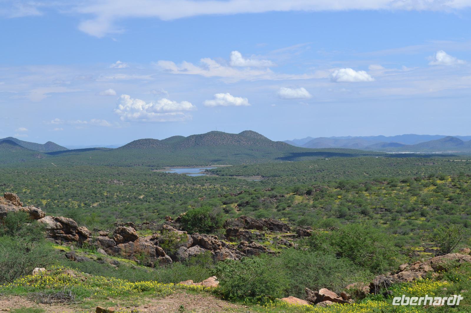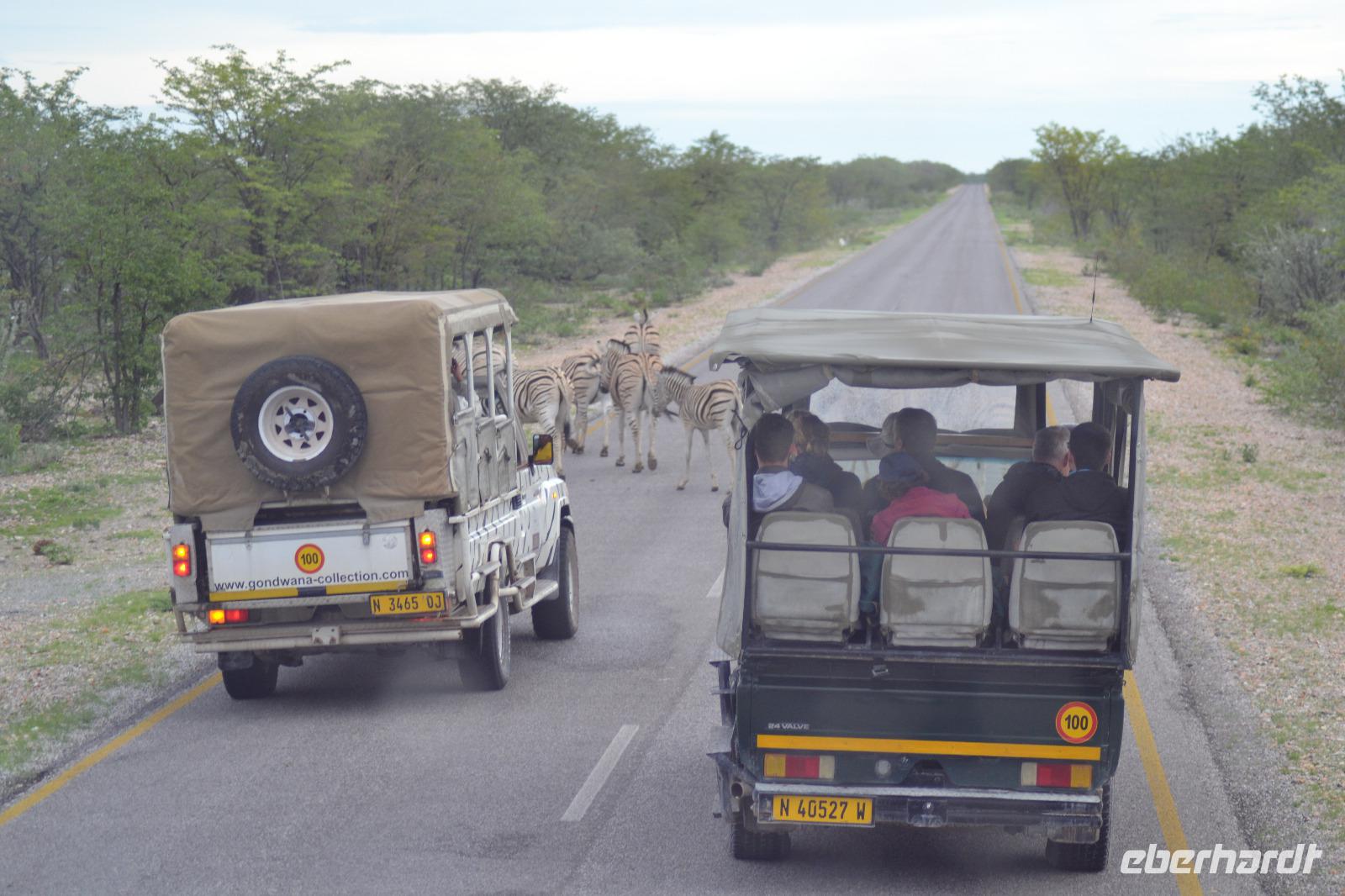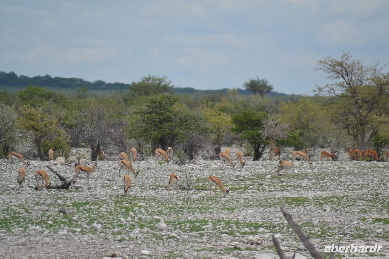 Am Morgen fuhren wir die Schotterstraße durch den Park Richtung Etosha-Nationalpark. Heute war unsere Fahrtstrecke nicht so lang und der Großteil auf einer asphaltierten Straße. Wir legten eine Pause bei der Bäckerei von Anastasia in Outjio ein. Die Namibianerin lebte eine lange Zeit in der Schweiz. Zusammen mit Ihrem Mann gründete sie die Bäckerei mit leckeren deutschen Kuchen. In dem kleinen Ort mit ungefähr 100.000 Einwohnern stöberten wir auch in einem schönen Souvenir Geschäft nach tollen Kunst Artikeln. Mittag trafen wir am Nationalpark ein und fuhren mit unserem Truck direkt auf die erste Pirschfahrt. In den letzten Tagen regnete es in den nördlichen Teil von Namibia sehr viel, sodass man leider nicht allzu viele Tiere sah. Wir gönnten es den Lebewesen, denn sie waren nicht mehr gezwungen die Wasserlöcher aufzusuchen. Dennoch sahen wir große Herden von Zebras, Springböcken, Gnus und Giraffen. Am Abend bezogen wir unsere Zimmer im Hotel und genossen ein kühles Getränk, sowie ein leckeres Buffet auf der Sundowner Terrasse.
