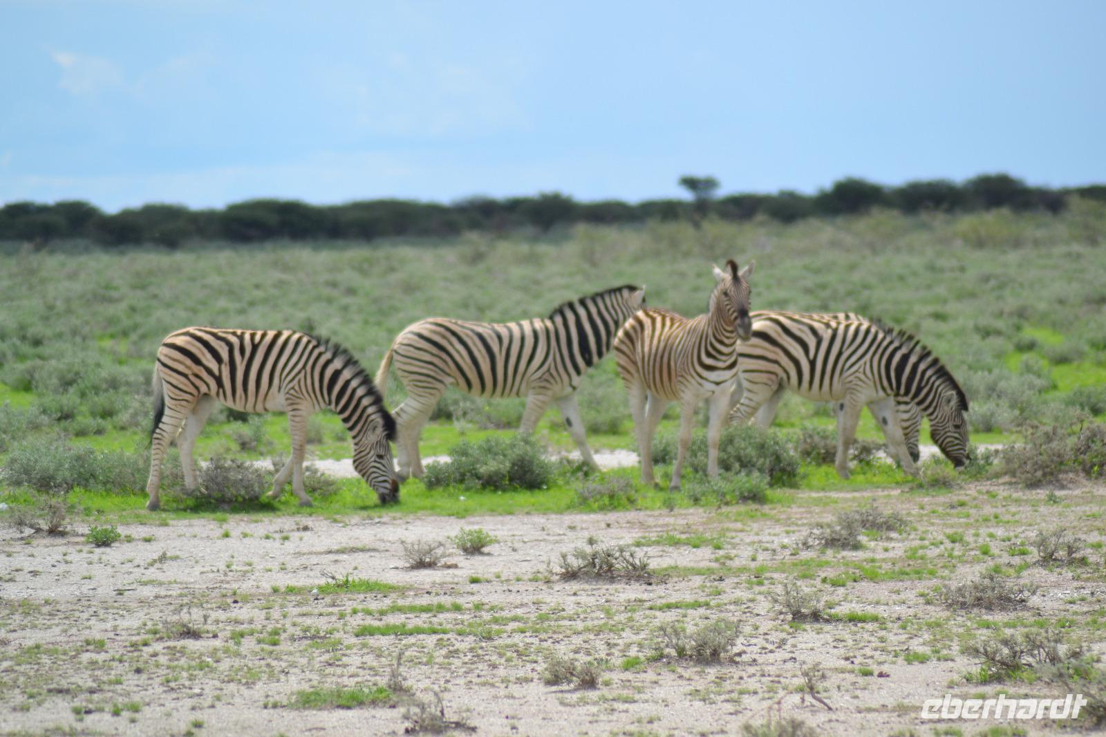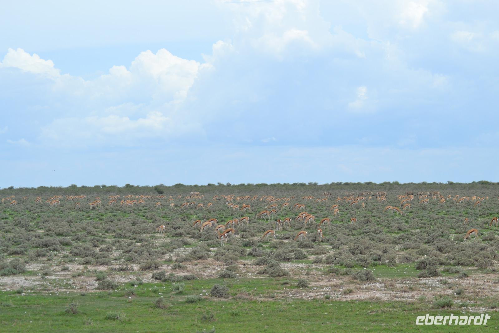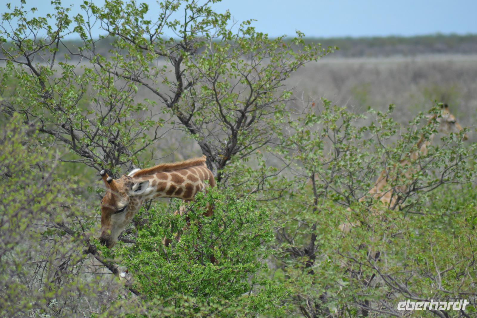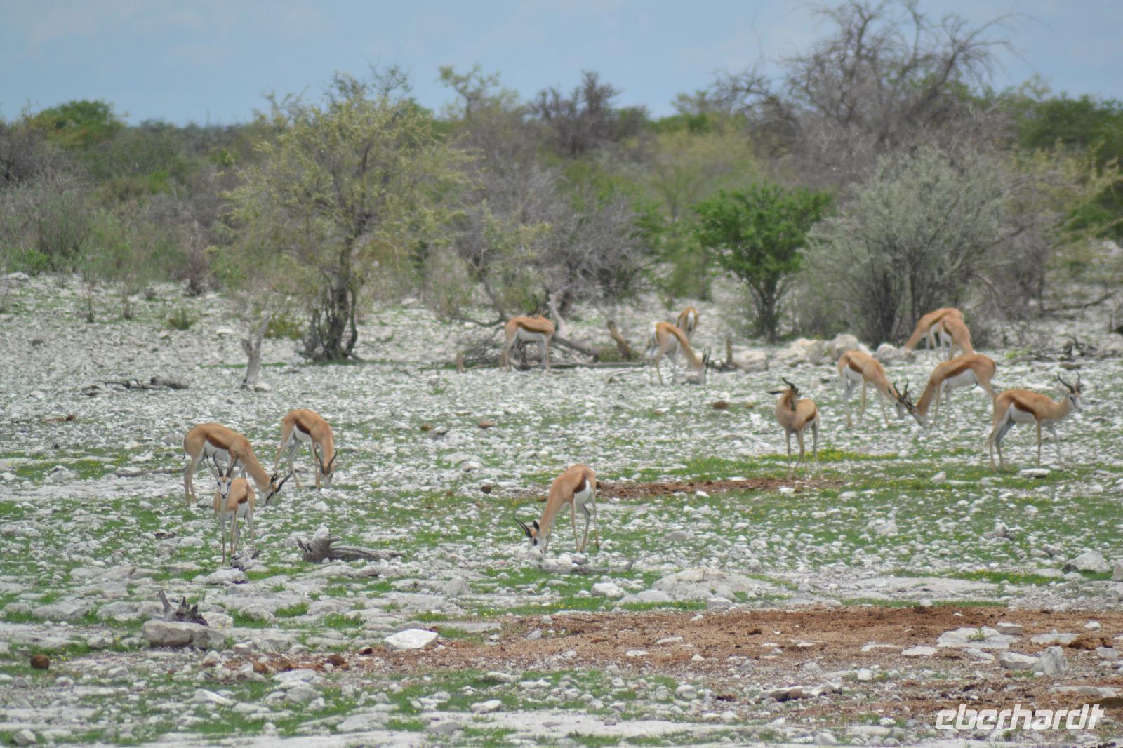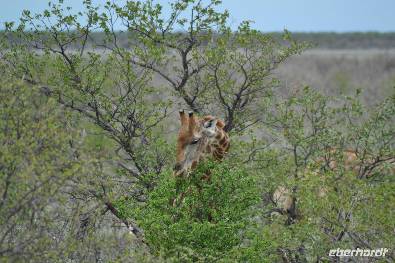 Am Morgen fuhren wir die Schotterstraße durch den Park Richtung Etosha-Nationalpark. Heute war unsere Fahrtstrecke nicht so lang und der Großteil auf einer asphaltierten Straße. Wir legten eine Pause bei der Bäckerei von Anastasia in Outjio ein. Die Namibianerin lebte eine lange Zeit in der Schweiz. Zusammen mit Ihrem Mann gründete sie die Bäckerei mit leckeren deutschen Kuchen. In dem kleinen Ort mit ungefähr 100.000 Einwohnern stöberten wir auch in einem schönen Souvenir Geschäft nach tollen Kunst Artikeln. Mittag trafen wir am Nationalpark ein und fuhren mit unserem Truck direkt auf die erste Pirschfahrt. In den letzten Tagen regnete es in den nördlichen Teil von Namibia sehr viel, sodass man leider nicht allzu viele Tiere sah. Wir gönnten es den Lebewesen, denn sie waren nicht mehr gezwungen die Wasserlöcher aufzusuchen. Dennoch sahen wir große Herden von Zebras, Springböcken, Gnus und Giraffen. Am Abend bezogen wir unsere Zimmer im Hotel und genossen ein kühles Getränk, sowie ein leckeres Buffet auf der Sundowner Terrasse.