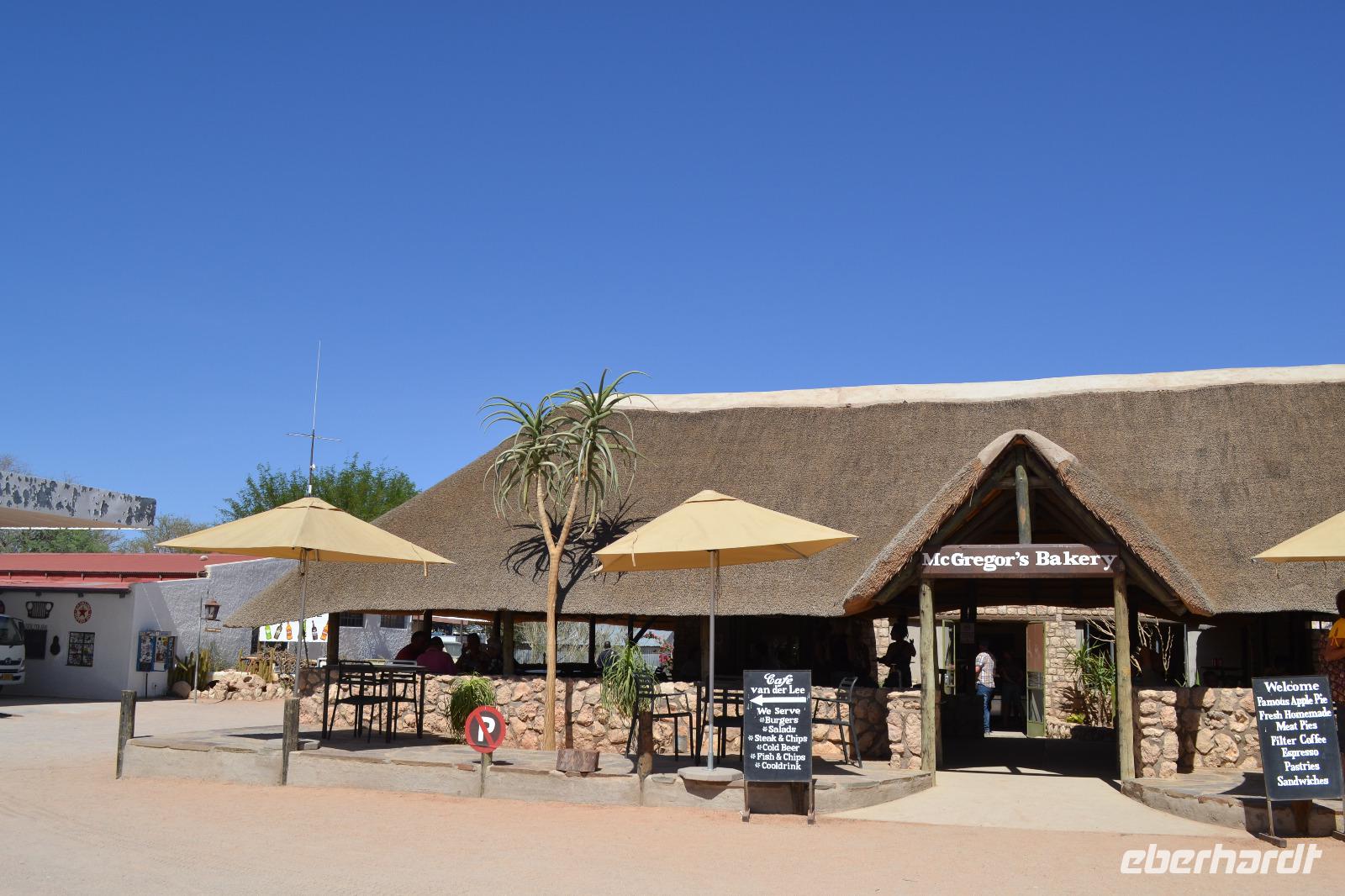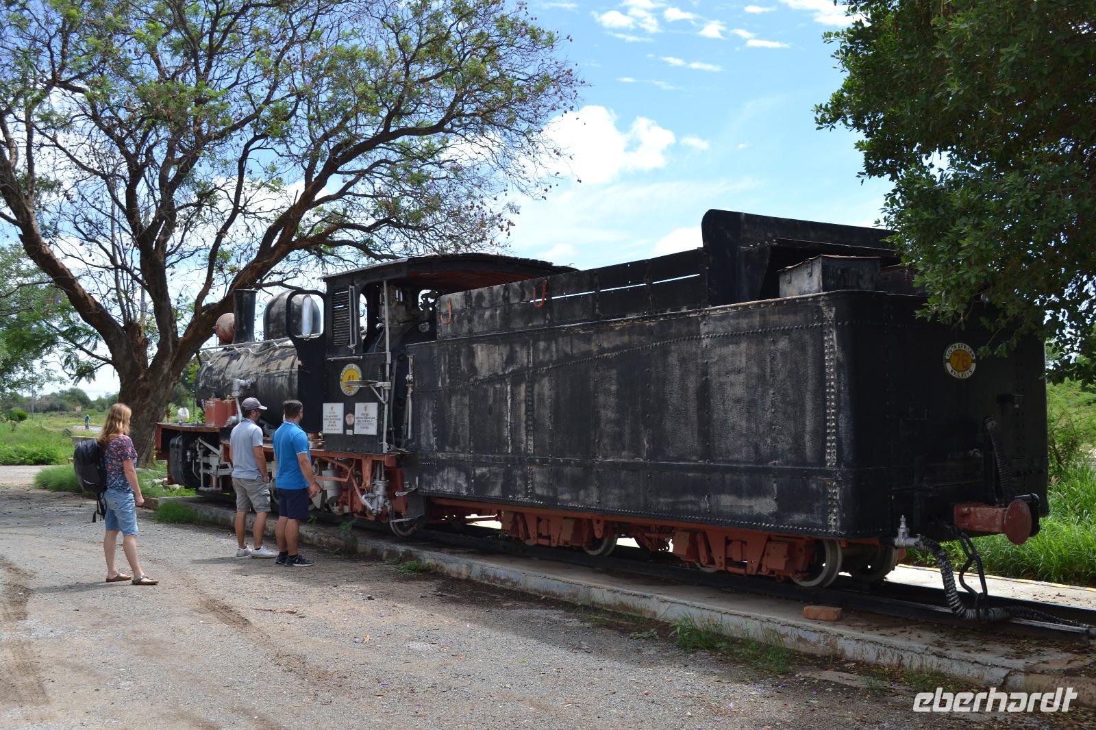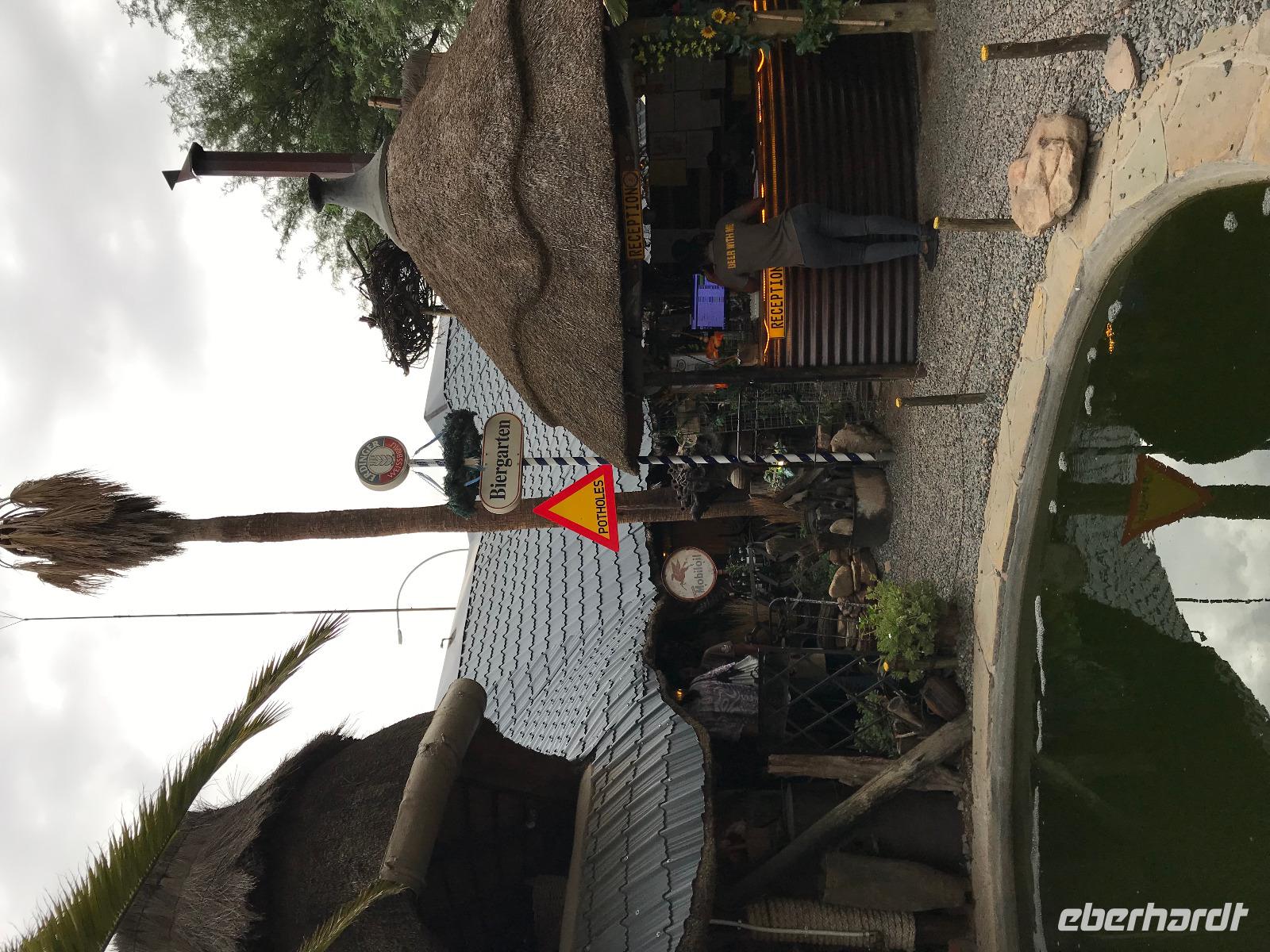 Heute fuhren wir unserem Ziel und auch dem Anfangspunkt unserer Reise ein Stück entgegen. Der Großteil der Strecke bestand aus asphaltierter Straße. Der erste Teil bis Outjio kam uns bekannt vor, denn wir legten den Weg bereits auf dem Weg zum Nationalpark zurück. Anschließend hielten wir in Otjiwarongo wo unserer Reiseleiterin Dagmar den Zahnarzt aufsuchte und wir uns am Bahnhof die alte deutsche Dampflok ansahen. Im April 1906 erhielt der Ort einen Eisenbahnanschluss. Die alte Lok „Nr. 41" wurde 1912 von der Firma Henschel in Kassel gebaut. Sie wurde auf der Strecke zwischen Swakopmund und Otavi eingesetzt. Otjiwarongo bedeutet in der Herero Sprache „schöner Platz der fetten Rinder". Danach tranken wir noch einen Kaffee im Supermarkt und fuhren mit Dagmar weiter zum Holzmarkt in Okahandja. Dort handelten wir stark um uns ein paar schöne Holzschnitzereien für Zuhause zu ergattern. Am Nachmittag erreichten wir unser Farmhaus wo wir die Zeit auf dem Gelände nutzen um uns zu entspannen. Laura und Dagmar bereiteten die Abreise vor. Am Abend trafen wir uns alle am Lagerfeuer um die restlichen Schnaps und Wein Vorräte zu leeren. Unter dem Pavillon wurde uns das letzte Abendessen serviert. In ausgelassener Atmosphäre nahmen wir Abschied voneinander.