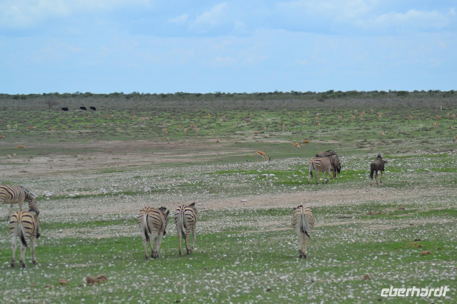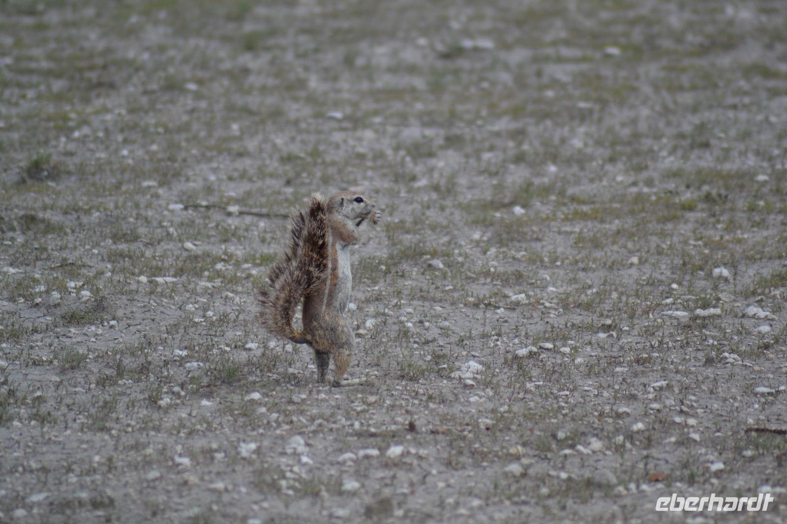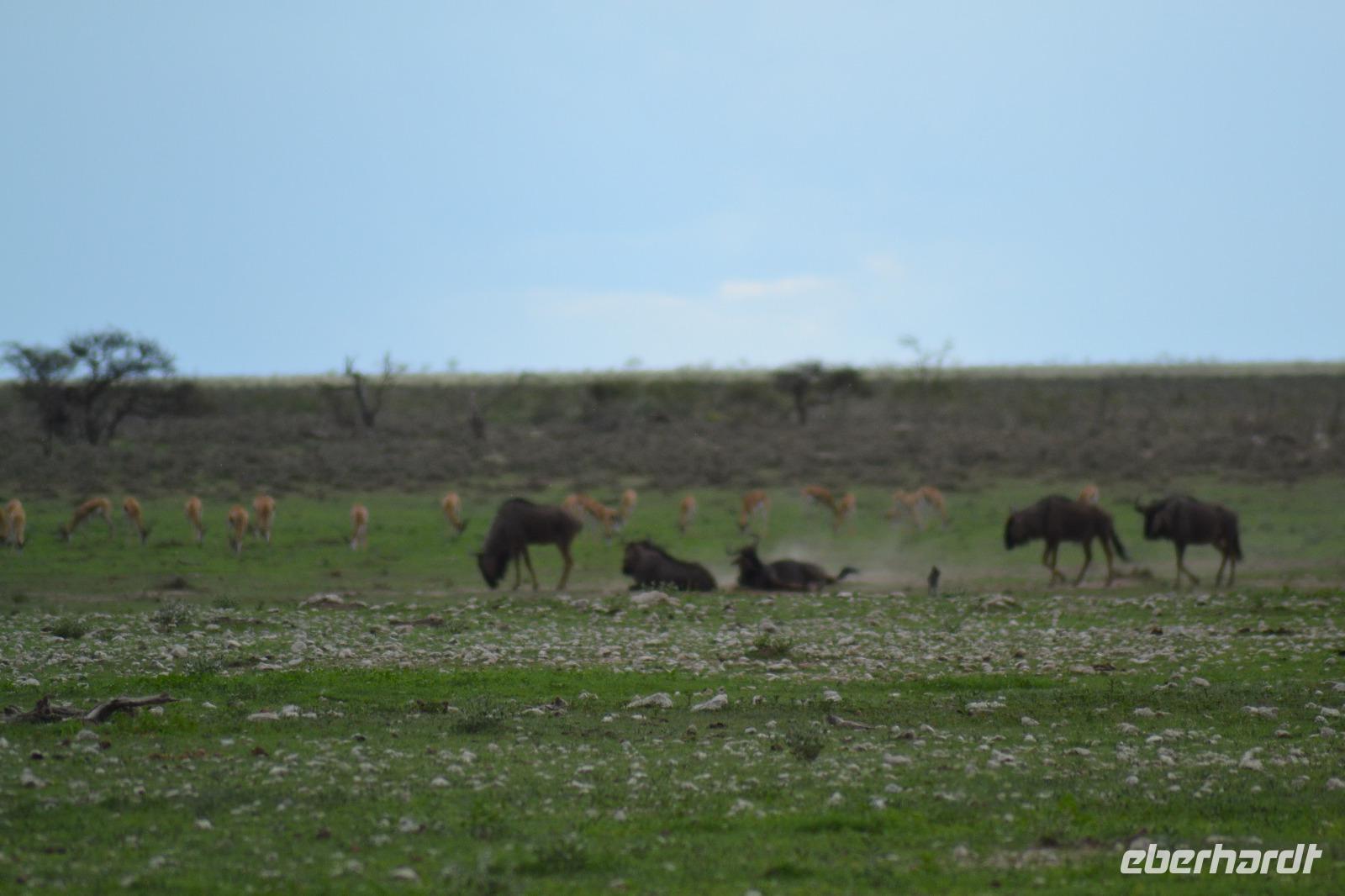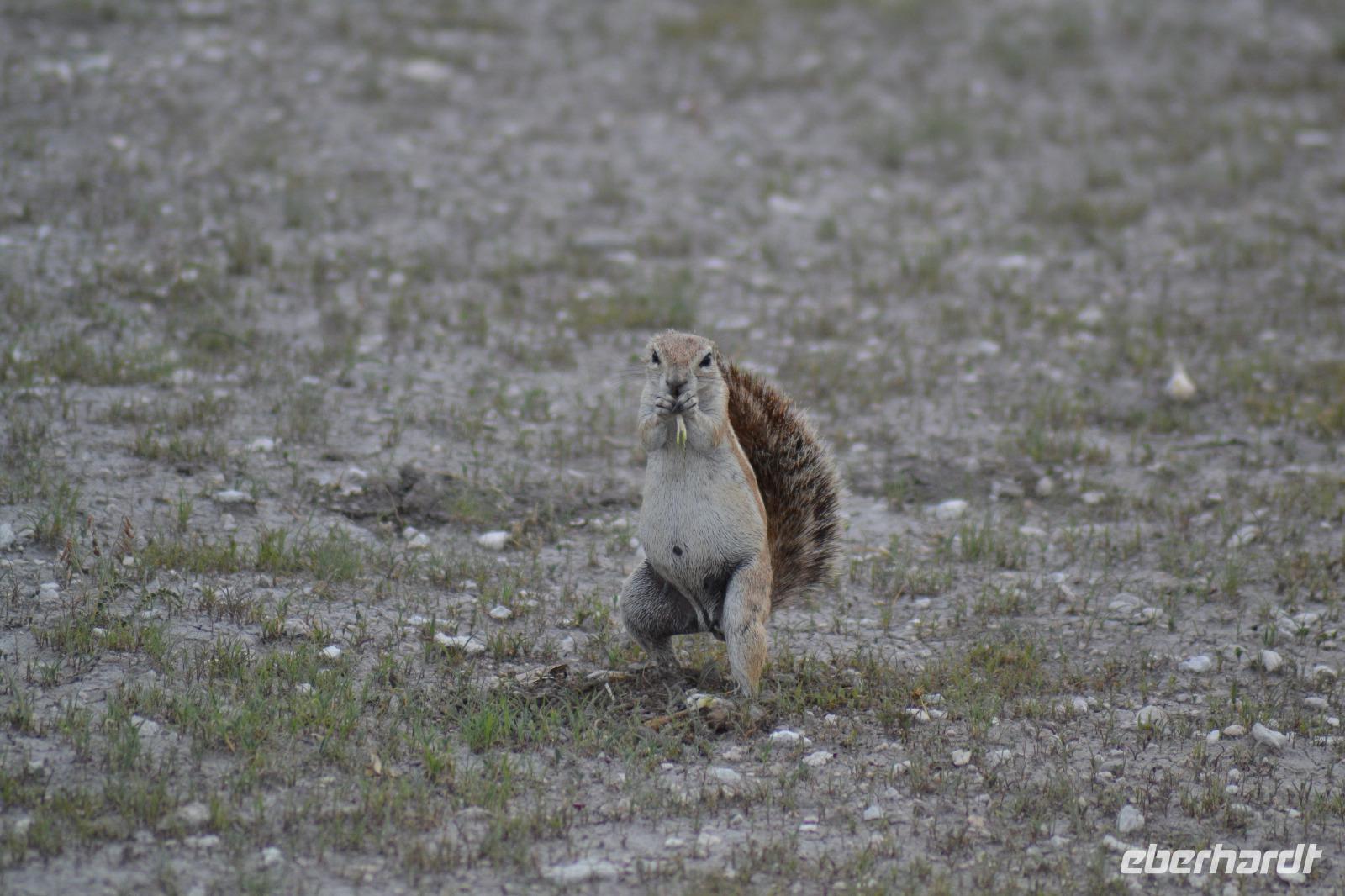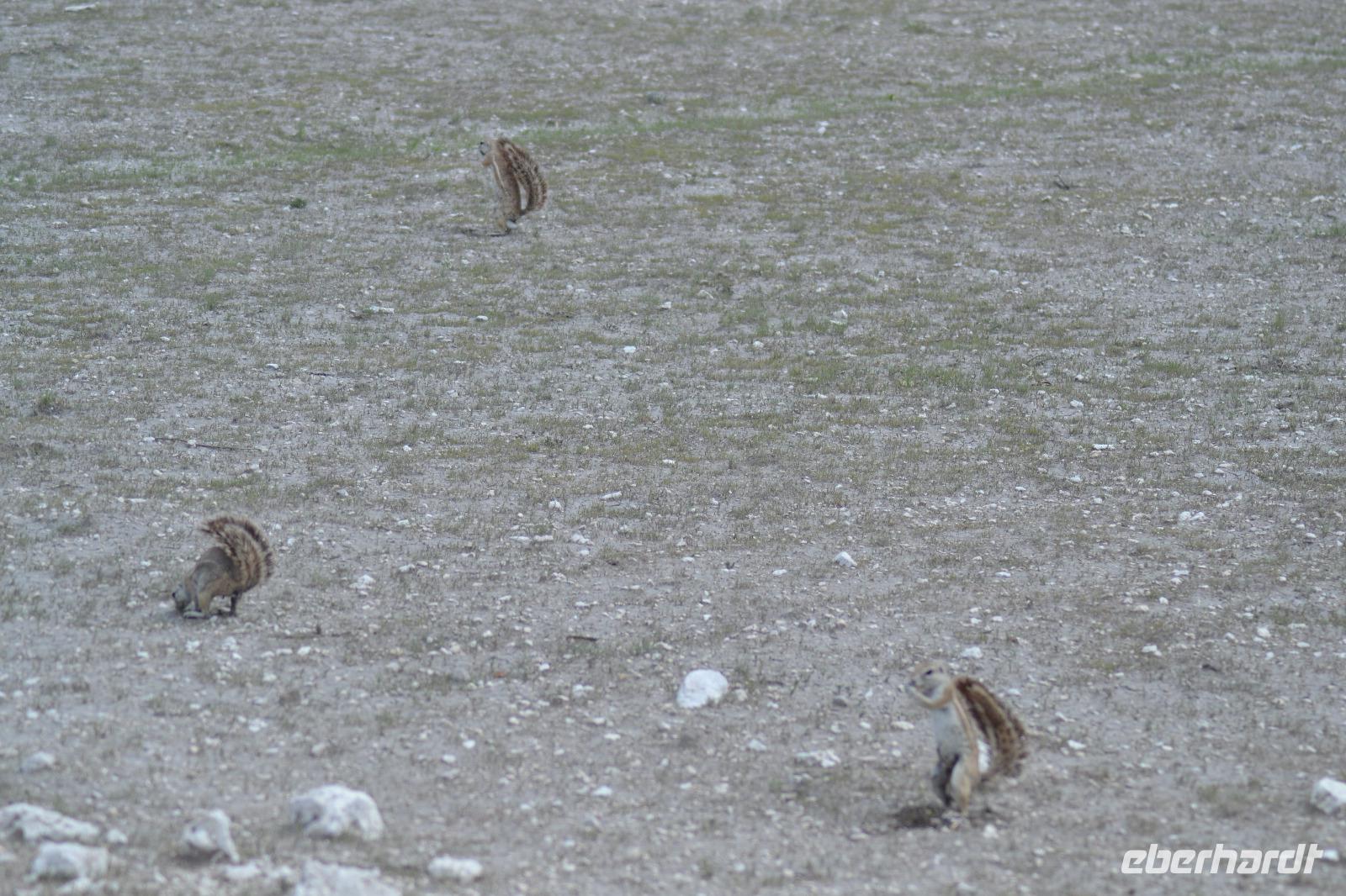 Der heutige Tag stand ganz im Sinne der der Tierbeobachtungen. Einige Gäste nutzen den Morgen um auszuschlafen und entspannt zu frühstücken. Nach der vergangenen Nacht mit großem Unwetter gingen wir bereits am frühen Morgen pünktlich zur Parköffnung auf unsere 1. Pirsch Fahrt. Wir sahen anfangs wieder die üblichen Verdächtigen Herden von Zebras, Oryx und Springböcken. Unsere Fahrt führte uns entlang der Salztonpfanne bis nach Salvadora. „Etosha" stammt aus der Sprache der Oshivambo und bedeutet „großer weißer Platz". Unterwegs sahen wir zwei kleine Löwen Gruppen und ein einzelnes Nashorn. Unser Wunsch nach einem Elefanten ging leider nicht in Erfüllung. Über die Mittagszeit kehrten wir zurück in das Hotel, um uns bei einem kleinen Mittagessen zu stärken. Leider waren keine Nudeln im Hotel vorhanden, weshalb wir kurzfristig unseren Speisewunsch statt Napolitana auf ein Sandwich umlegen mussten. Am Nachmittag lud uns Laura auf Grund des Ausfalles der Klimaanlage im Truck auf eine Safari im offenen Jeep ein. Der erste Teil der Fahrt war sonnig und wir sahen eine kleine Gruppe mit Erdhörnchen. Diese sind nicht zu verwechseln mit den Erdmännchen und sehen eher einem Eichhörnchen ähnlich. Später wurde es immer dunkler am Himmel und wir fuhren unmittelbar in die Unwetter Front. Kurzerhand drehten wir um und entkamen den weiteren Wolken. Auf dem Weg zurück in die Logde holte uns glücklicherweise Brayn mit dem Bus ab und brachten uns trocken bis vor unsere Zimmer. Eigentlich wollten wir heute Abend im Camp des Geländes Essen, doch bei dem Wetter bevorzugten wir das Hauptrestaurant. Draußen kühlte es sich durch den Regen schnell ab.