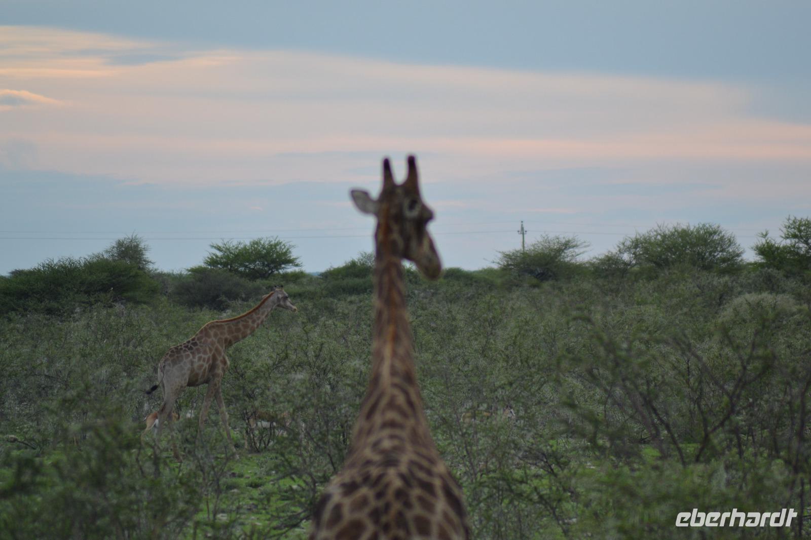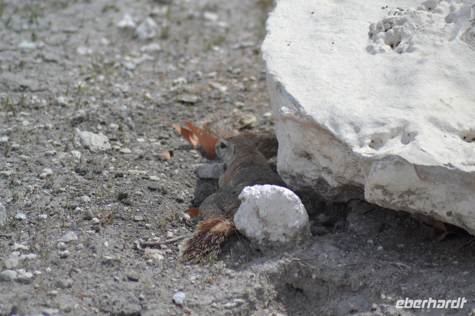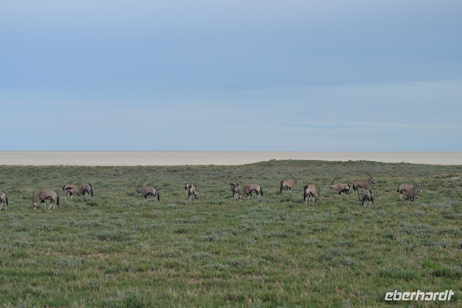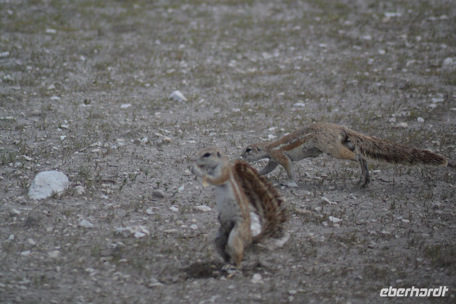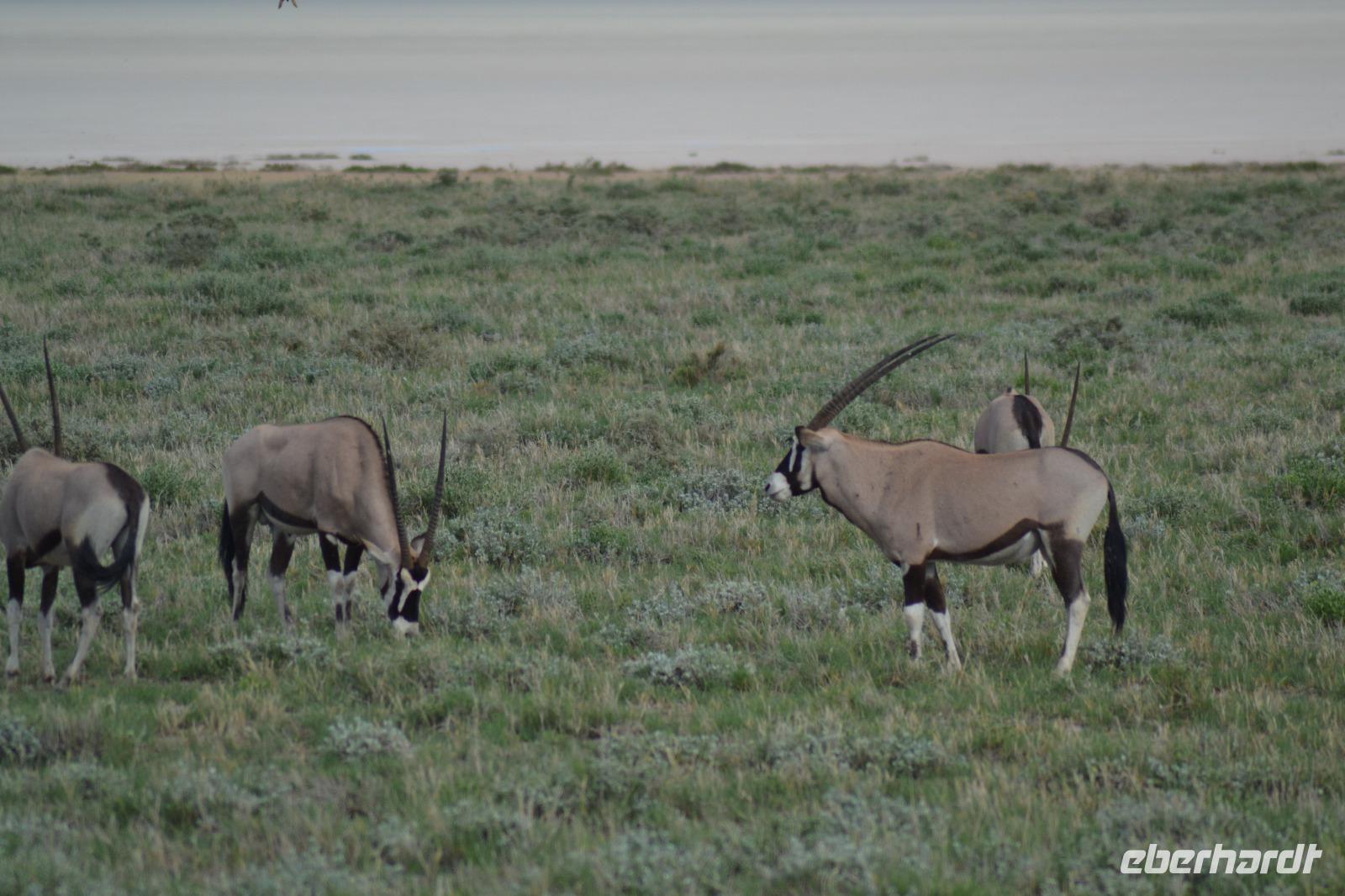 Der heutige Tag stand ganz im Sinne der der Tierbeobachtungen. Einige Gäste nutzen den Morgen um auszuschlafen und entspannt zu frühstücken. Nach der vergangenen Nacht mit großem Unwetter gingen wir bereits am frühen Morgen pünktlich zur Parköffnung auf unsere 1. Pirsch Fahrt. Wir sahen anfangs wieder die üblichen Verdächtigen Herden von Zebras, Oryx und Springböcken. Unsere Fahrt führte uns entlang der Salztonpfanne bis nach Salvadora. „Etosha" stammt aus der Sprache der Oshivambo und bedeutet „großer weißer Platz". Unterwegs sahen wir zwei kleine Löwen Gruppen und ein einzelnes Nashorn. Unser Wunsch nach einem Elefanten ging leider nicht in Erfüllung. Über die Mittagszeit kehrten wir zurück in das Hotel, um uns bei einem kleinen Mittagessen zu stärken. Leider waren keine Nudeln im Hotel vorhanden, weshalb wir kurzfristig unseren Speisewunsch statt Napolitana auf ein Sandwich umlegen mussten. Am Nachmittag lud uns Laura auf Grund des Ausfalles der Klimaanlage im Truck auf eine Safari im offenen Jeep ein. Der erste Teil der Fahrt war sonnig und wir sahen eine kleine Gruppe mit Erdhörnchen. Diese sind nicht zu verwechseln mit den Erdmännchen und sehen eher einem Eichhörnchen ähnlich. Später wurde es immer dunkler am Himmel und wir fuhren unmittelbar in die Unwetter Front. Kurzerhand drehten wir um und entkamen den weiteren Wolken. Auf dem Weg zurück in die Logde holte uns glücklicherweise Brayn mit dem Bus ab und brachten uns trocken bis vor unsere Zimmer. Eigentlich wollten wir heute Abend im Camp des Geländes Essen, doch bei dem Wetter bevorzugten wir das Hauptrestaurant. Draußen kühlte es sich durch den Regen schnell ab.