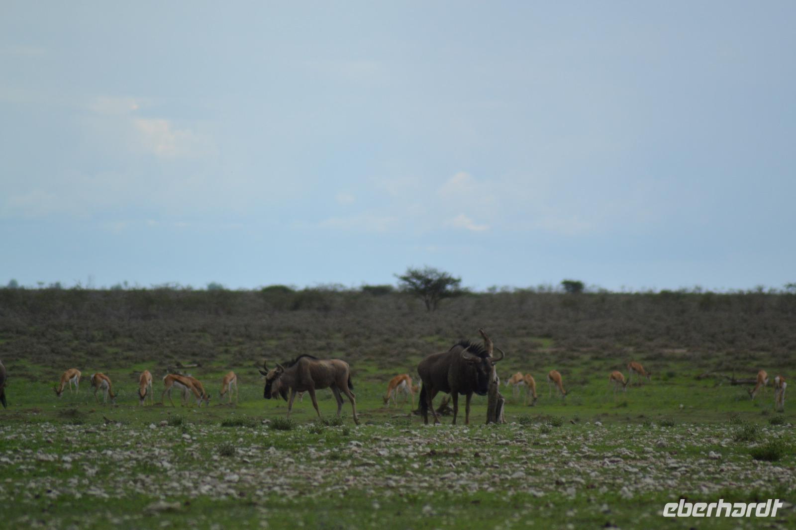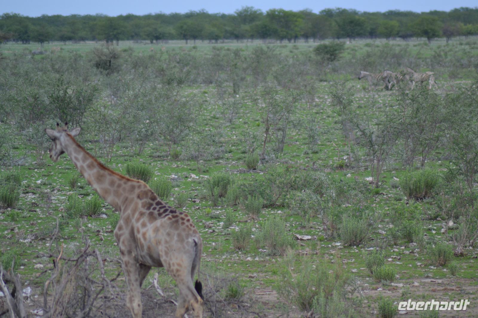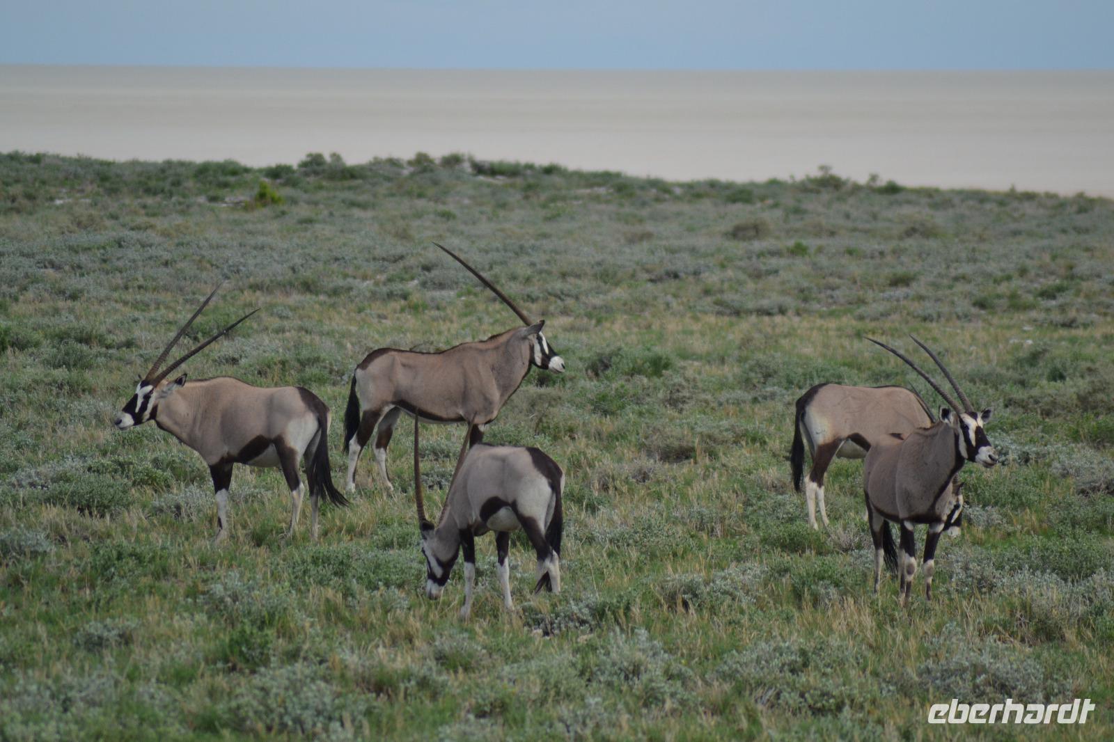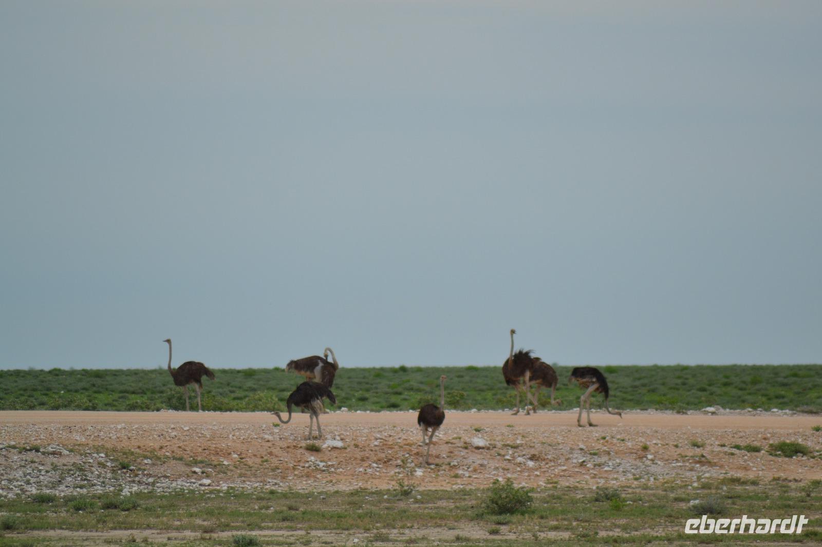 Der heutige Tag stand ganz im Sinne der der Tierbeobachtungen. Einige Gäste nutzen den Morgen um auszuschlafen und entspannt zu frühstücken. Nach der vergangenen Nacht mit großem Unwetter gingen wir bereits am frühen Morgen pünktlich zur Parköffnung auf unsere 1. Pirsch Fahrt. Wir sahen anfangs wieder die üblichen Verdächtigen Herden von Zebras, Oryx und Springböcken. Unsere Fahrt führte uns entlang der Salztonpfanne bis nach Salvadora. „Etosha" stammt aus der Sprache der Oshivambo und bedeutet „großer weißer Platz". Unterwegs sahen wir zwei kleine Löwen Gruppen und ein einzelnes Nashorn. Unser Wunsch nach einem Elefanten ging leider nicht in Erfüllung. Über die Mittagszeit kehrten wir zurück in das Hotel, um uns bei einem kleinen Mittagessen zu stärken. Leider waren keine Nudeln im Hotel vorhanden, weshalb wir kurzfristig unseren Speisewunsch statt Napolitana auf ein Sandwich umlegen mussten. Am Nachmittag lud uns Laura auf Grund des Ausfalles der Klimaanlage im Truck auf eine Safari im offenen Jeep ein. Der erste Teil der Fahrt war sonnig und wir sahen eine kleine Gruppe mit Erdhörnchen. Diese sind nicht zu verwechseln mit den Erdmännchen und sehen eher einem Eichhörnchen ähnlich. Später wurde es immer dunkler am Himmel und wir fuhren unmittelbar in die Unwetter Front. Kurzerhand drehten wir um und entkamen den weiteren Wolken. Auf dem Weg zurück in die Logde holte uns glücklicherweise Brayn mit dem Bus ab und brachten uns trocken bis vor unsere Zimmer. Eigentlich wollten wir heute Abend im Camp des Geländes Essen, doch bei dem Wetter bevorzugten wir das Hauptrestaurant. Draußen kühlte es sich durch den Regen schnell ab.