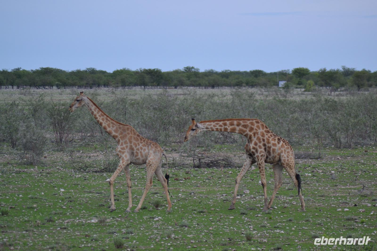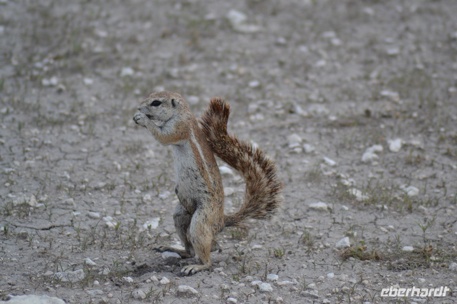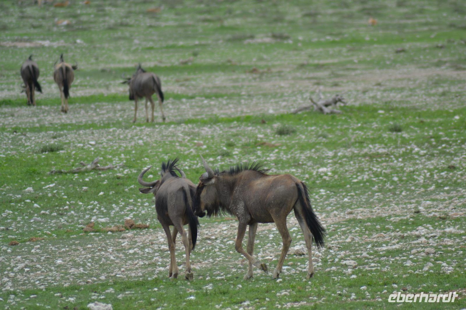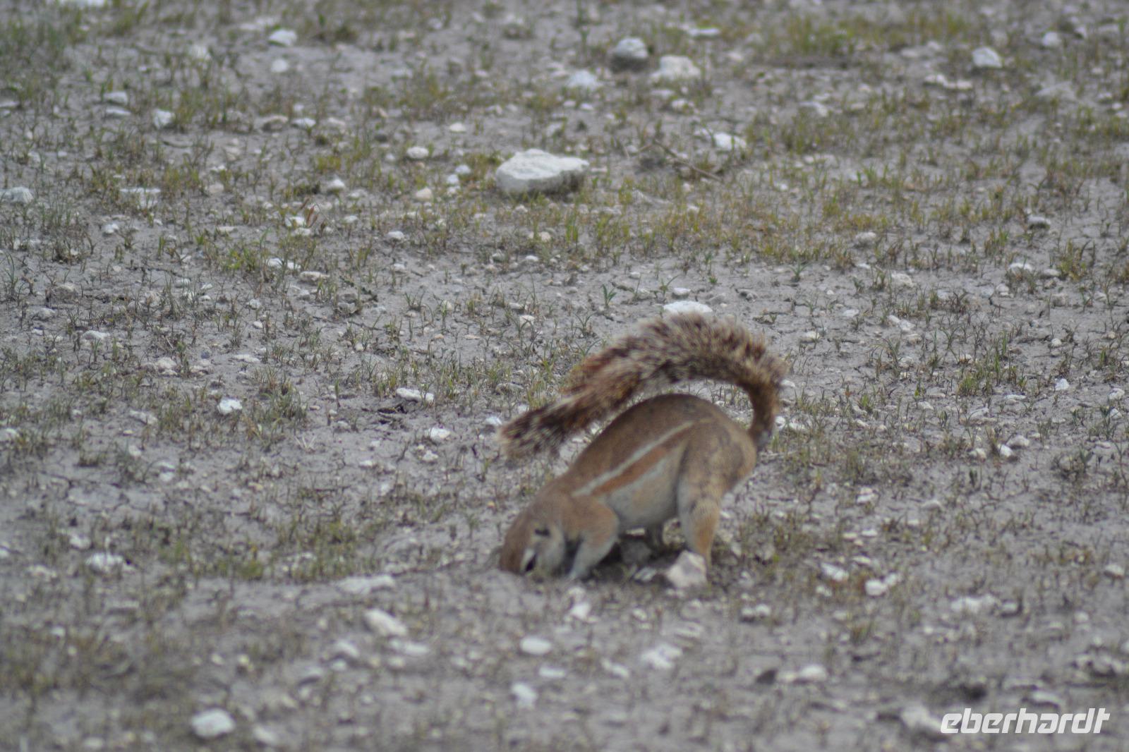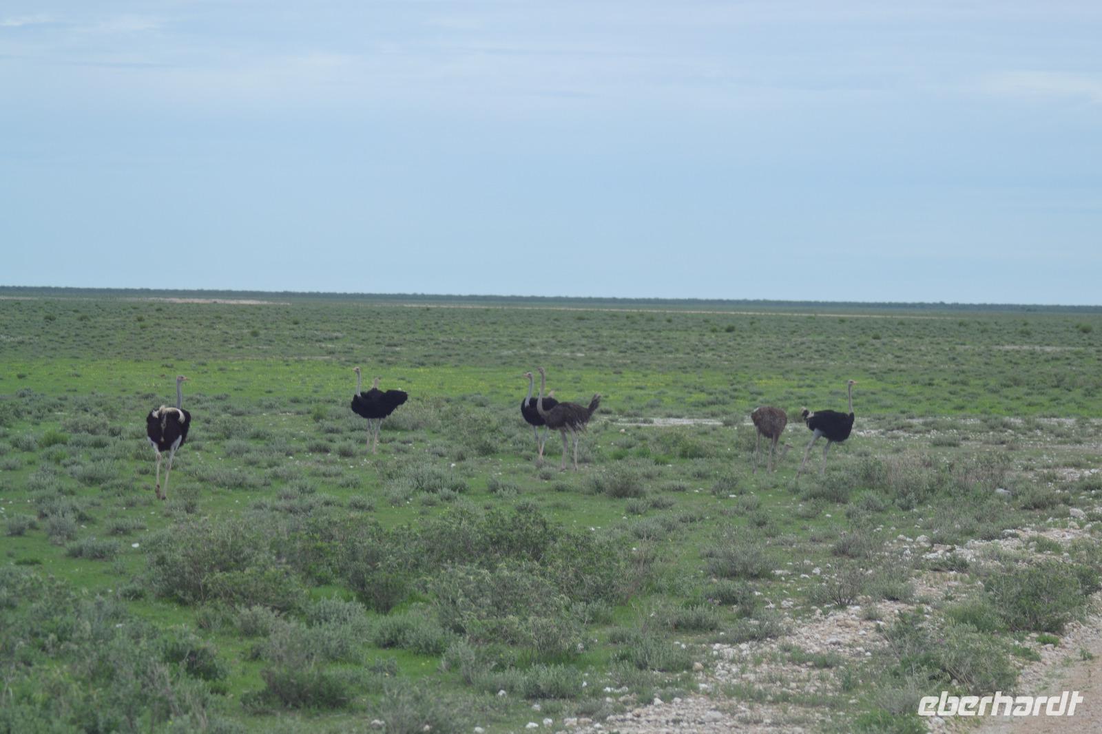 Der heutige Tag stand ganz im Sinne der der Tierbeobachtungen. Einige Gäste nutzen den Morgen um auszuschlafen und entspannt zu frühstücken. Nach der vergangenen Nacht mit großem Unwetter gingen wir bereits am frühen Morgen pünktlich zur Parköffnung auf unsere 1. Pirsch Fahrt. Wir sahen anfangs wieder die üblichen Verdächtigen Herden von Zebras, Oryx und Springböcken. Unsere Fahrt führte uns entlang der Salztonpfanne bis nach Salvadora. „Etosha" stammt aus der Sprache der Oshivambo und bedeutet „großer weißer Platz". Unterwegs sahen wir zwei kleine Löwen Gruppen und ein einzelnes Nashorn. Unser Wunsch nach einem Elefanten ging leider nicht in Erfüllung. Über die Mittagszeit kehrten wir zurück in das Hotel, um uns bei einem kleinen Mittagessen zu stärken. Leider waren keine Nudeln im Hotel vorhanden, weshalb wir kurzfristig unseren Speisewunsch statt Napolitana auf ein Sandwich umlegen mussten. Am Nachmittag lud uns Laura auf Grund des Ausfalles der Klimaanlage im Truck auf eine Safari im offenen Jeep ein. Der erste Teil der Fahrt war sonnig und wir sahen eine kleine Gruppe mit Erdhörnchen. Diese sind nicht zu verwechseln mit den Erdmännchen und sehen eher einem Eichhörnchen ähnlich. Später wurde es immer dunkler am Himmel und wir fuhren unmittelbar in die Unwetter Front. Kurzerhand drehten wir um und entkamen den weiteren Wolken. Auf dem Weg zurück in die Logde holte uns glücklicherweise Brayn mit dem Bus ab und brachten uns trocken bis vor unsere Zimmer. Eigentlich wollten wir heute Abend im Camp des Geländes Essen, doch bei dem Wetter bevorzugten wir das Hauptrestaurant. Draußen kühlte es sich durch den Regen schnell ab.