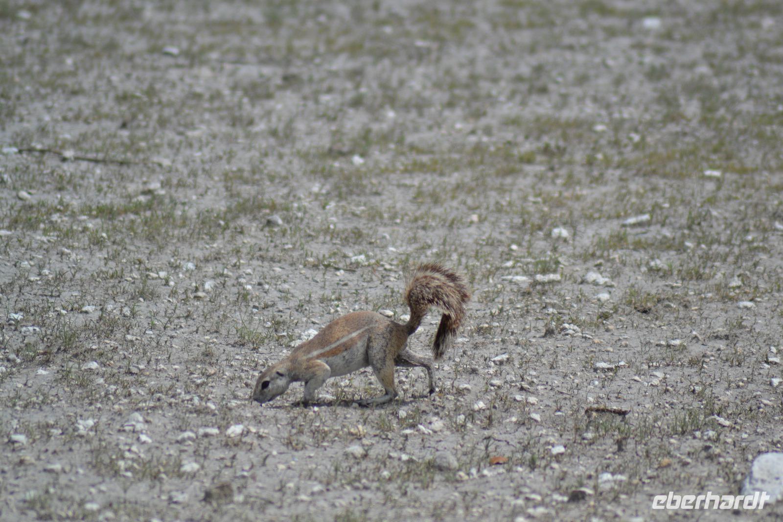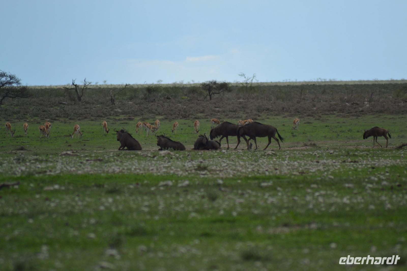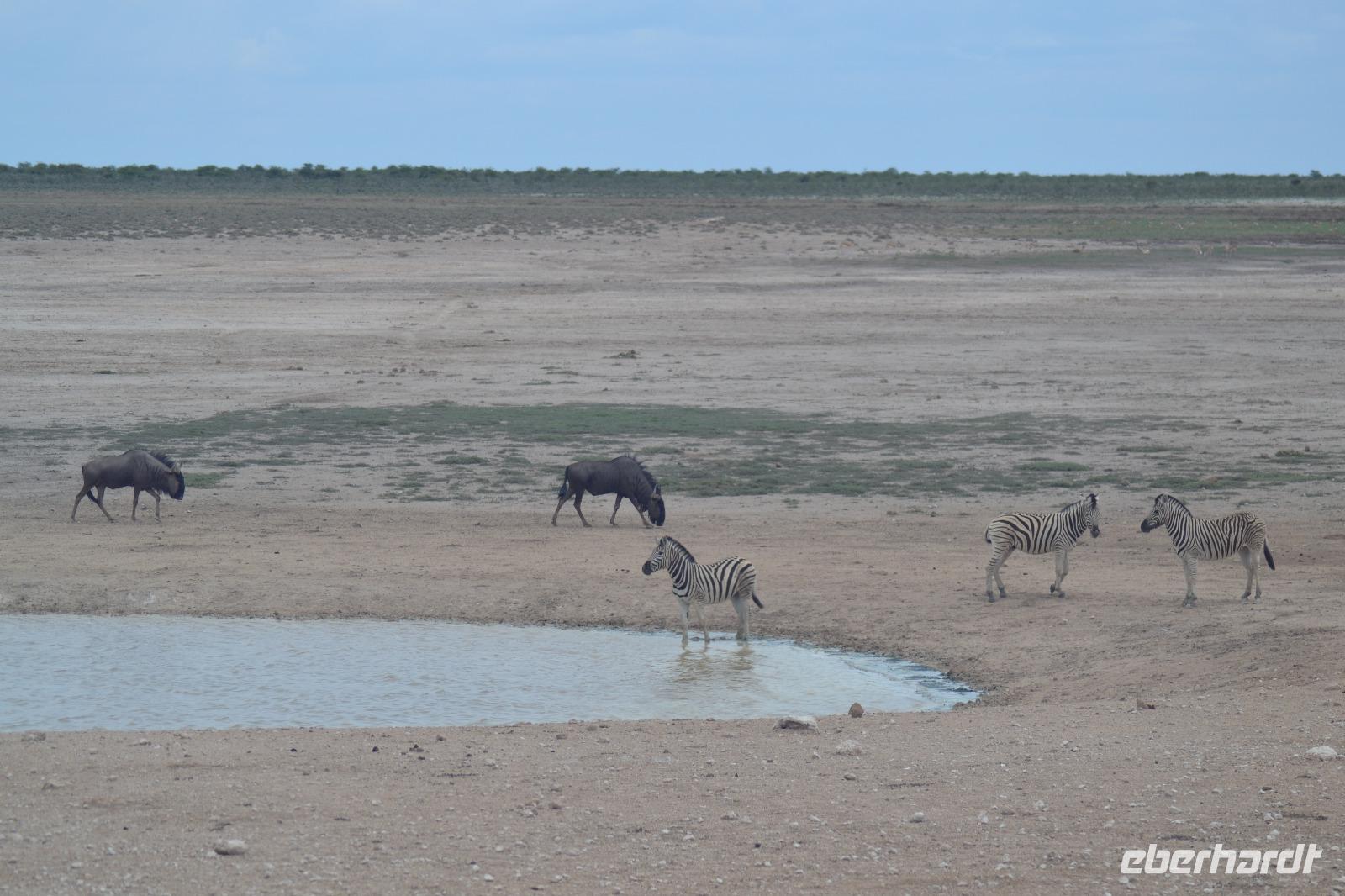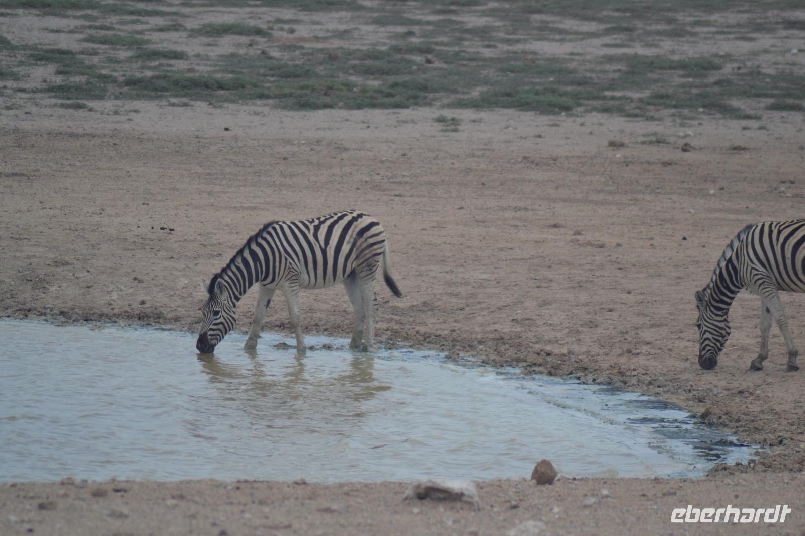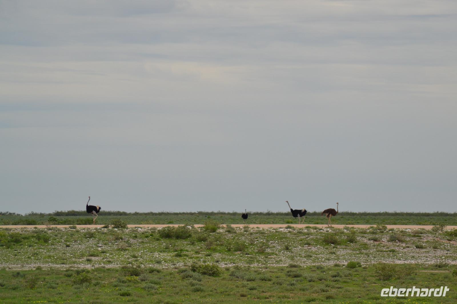 Der heutige Tag stand ganz im Sinne der der Tierbeobachtungen. Einige Gäste nutzen den Morgen um auszuschlafen und entspannt zu frühstücken. Nach der vergangenen Nacht mit großem Unwetter gingen wir bereits am frühen Morgen pünktlich zur Parköffnung auf unsere 1. Pirsch Fahrt. Wir sahen anfangs wieder die üblichen Verdächtigen Herden von Zebras, Oryx und Springböcken. Unsere Fahrt führte uns entlang der Salztonpfanne bis nach Salvadora. „Etosha" stammt aus der Sprache der Oshivambo und bedeutet „großer weißer Platz". Unterwegs sahen wir zwei kleine Löwen Gruppen und ein einzelnes Nashorn. Unser Wunsch nach einem Elefanten ging leider nicht in Erfüllung. Über die Mittagszeit kehrten wir zurück in das Hotel, um uns bei einem kleinen Mittagessen zu stärken. Leider waren keine Nudeln im Hotel vorhanden, weshalb wir kurzfristig unseren Speisewunsch statt Napolitana auf ein Sandwich umlegen mussten. Am Nachmittag lud uns Laura auf Grund des Ausfalles der Klimaanlage im Truck auf eine Safari im offenen Jeep ein. Der erste Teil der Fahrt war sonnig und wir sahen eine kleine Gruppe mit Erdhörnchen. Diese sind nicht zu verwechseln mit den Erdmännchen und sehen eher einem Eichhörnchen ähnlich. Später wurde es immer dunkler am Himmel und wir fuhren unmittelbar in die Unwetter Front. Kurzerhand drehten wir um und entkamen den weiteren Wolken. Auf dem Weg zurück in die Logde holte uns glücklicherweise Brayn mit dem Bus ab und brachten uns trocken bis vor unsere Zimmer. Eigentlich wollten wir heute Abend im Camp des Geländes Essen, doch bei dem Wetter bevorzugten wir das Hauptrestaurant. Draußen kühlte es sich durch den Regen schnell ab.