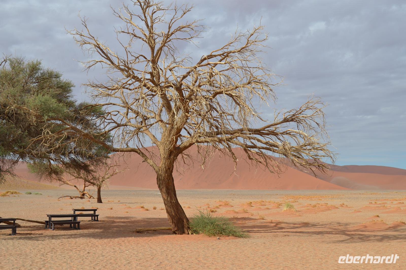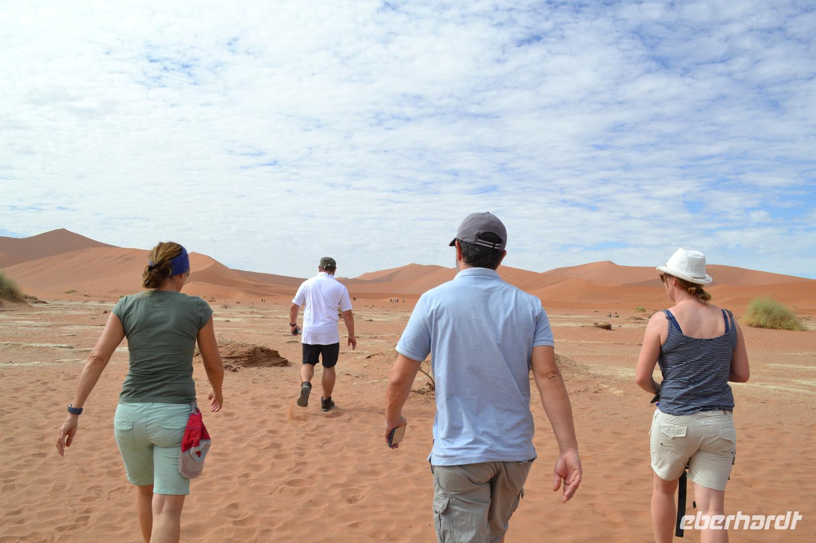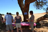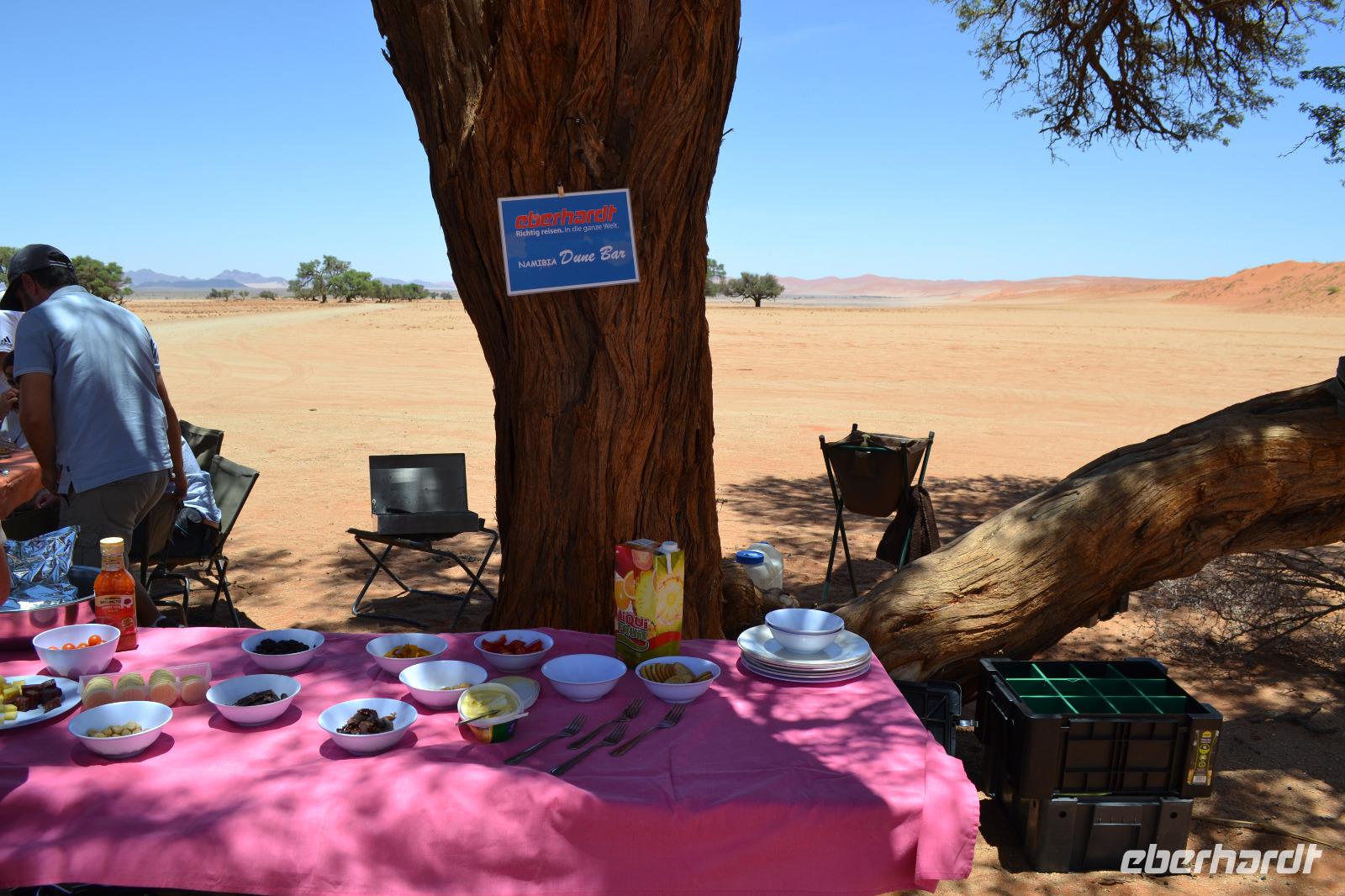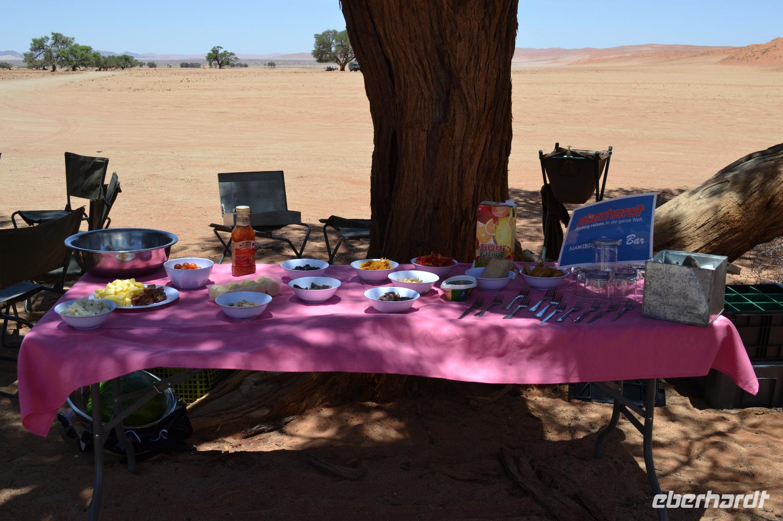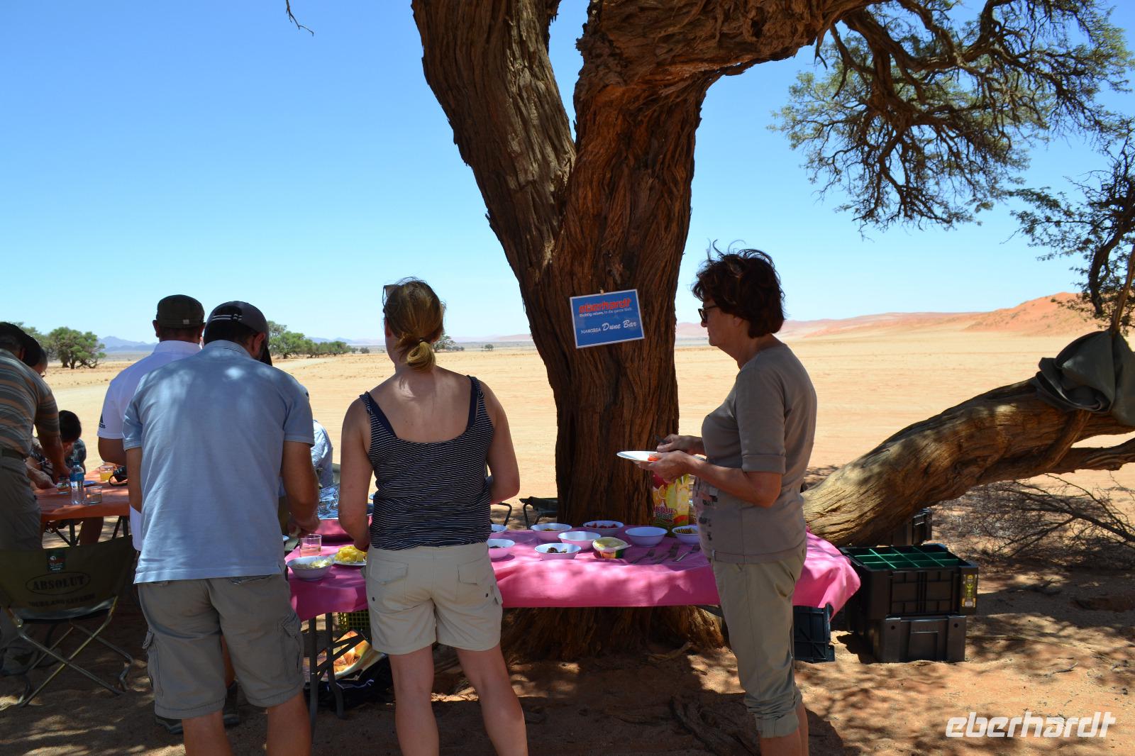Bereits am frühen Morgen mit nur wenig Schlaf machten wir und auf den Weg in den Namib Naukluftpark Nationalpark. Der Park hat eine Fläche von 49.800 km². Nach einer kurzen Fahrt in unserem Truck über die Schotterpads hielten wir für eine kurze Toilettenpause vor den Toren des Nationalparks. Dort führte eine asphaltierte Straße zunächst zum bekannten Postkarten Motiv der Düne 45. Dort legten auch wir einen Fotostopp ein um auch ein so bekanntes Bild zu schießen. Im Anschluss ging es weiter bis wir in kleinere Jeeps umstiegen und unmittelbar in die Dünen fuhren. Den ersten Stopp legten wir am Sossusvlei ein. In den Sand malte uns Dagmar die Bewässerung ein. Bei dem Sossusvlei handelt es sich um eine von Sanddünen umschlossene beige Salz-Ton-Pfanne, die nur in seltenen guten Regenjahren Wasser führt. Dann bildet sich für kurze ein kleiner See im Vlei am Ende des Tsauchab. Der Jeep brachte uns zum Dead Vlei. Es ist die Sammelbezeichnung für die meist trockenliegende Endsenke eines Wüstenflusses. Dort wanderten bis zum Kalk Becken am Fuße des Big Daddy. In der Hitze konnten wir nur langsam einen Fuß vor den anderen setzen. Wieder zurück am Parkplatz angekommen holten wir die Muddi ab und warteten an der Haltestelle auf den Rücktransfer in den Jeeps. Wir stiegen nach einer kurzen Toiletten Pause in unseren Truck und fuhren zu einem abgelegenen Platz. Der Weg dorthin ging über eine sehr holperige Straße und alle Gäste wunderten sich was wir dort wollen. Dagmar meinte an diesen Fleck kommen viele Namibianer um die Düne entlang zu Wandern, roten Sand zu sammeln oder sich unter einen schönen Baum zu setzen. Das alles war natürlich nur eine Ausrede, denn wir bauten mehr oder weniger heimlich eine Dünenbar mit kleinen Snacks und Getränken auf. Eine schöne Überraschung und eine kleine Erholungspause in der Savanne. Unsere Melonen Reste und ein paar Keks Krümel fielen auch noch für die Vögel ab. Wir räumten unser Camping Equipment wieder in den Truck und fuhren zurück über die Hoppel Piste zum Sesriem Canyon. Zunächst schauten wir von oben herein und waren von der Größe stark beeindruckt. Wir stiegen gemeinsam die Treppen hinunter, wanderten und kletterten durch die beeindruckenden Wände des Canyons. Bei der Wärme war es eine wohltuende Abkühlung zwischen den Felswänden. Erschöpft ging es wieder zurück zum Hotel, wo uns noch genügend Zeit für ein Sprung in den Pool, einem kleinen Mittagsschläfchen oder eine Massage blieb. Am Abend trafen wir uns zu dem gemeinsamen Neujahr Abendessen. Heute war alles perfekt! Das Essen war warm und sehr lecker.