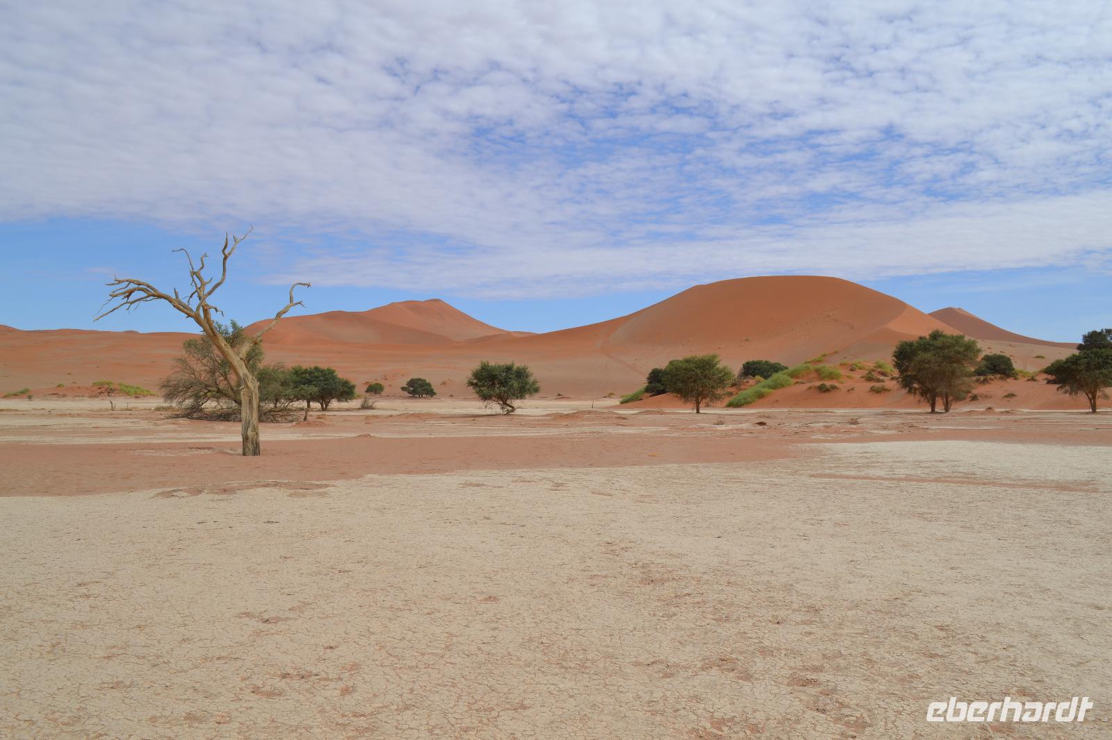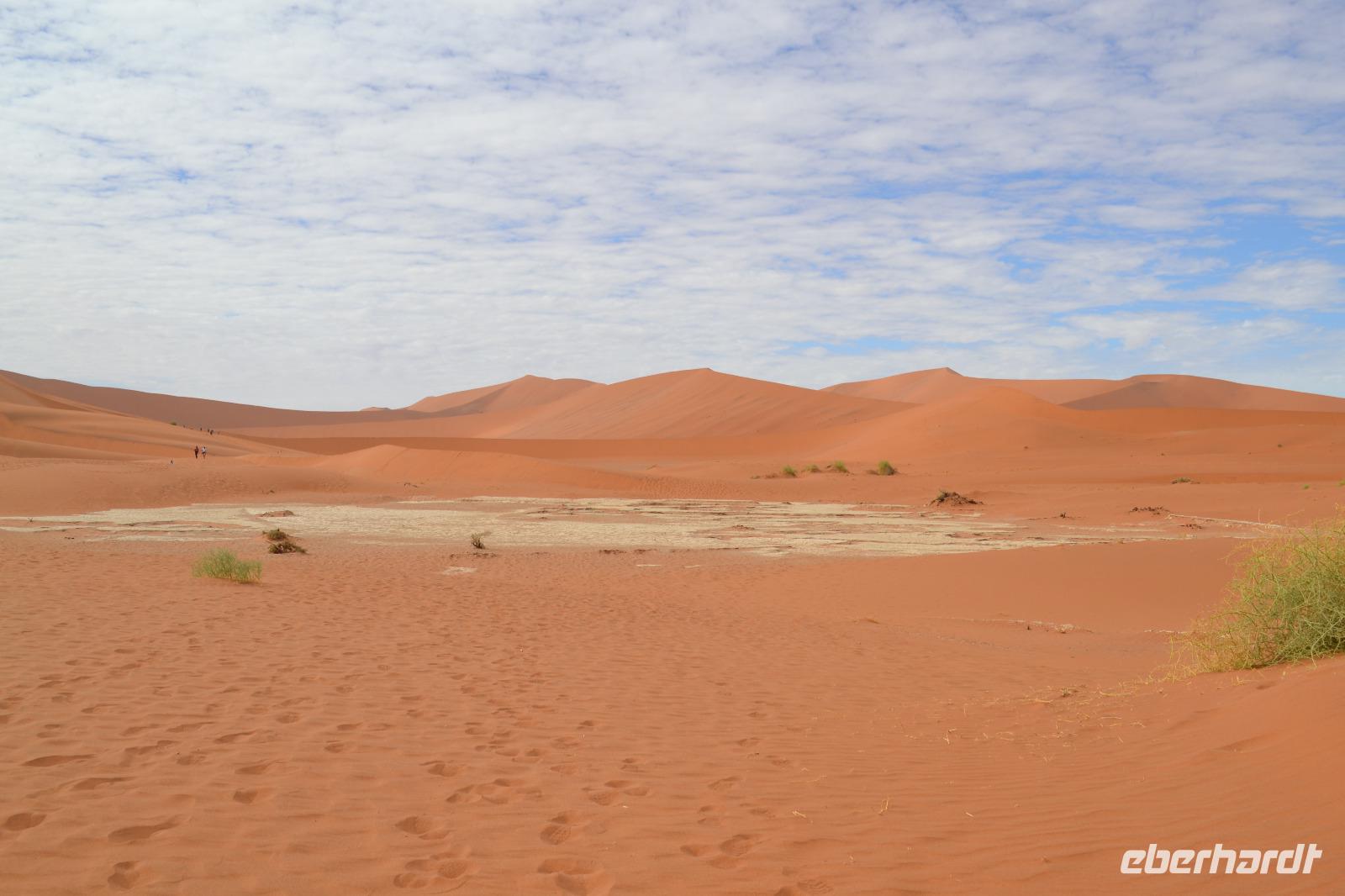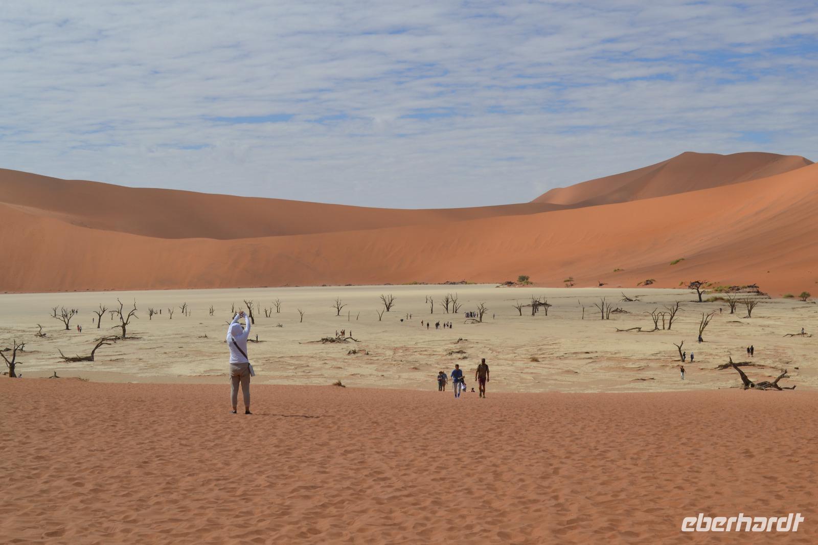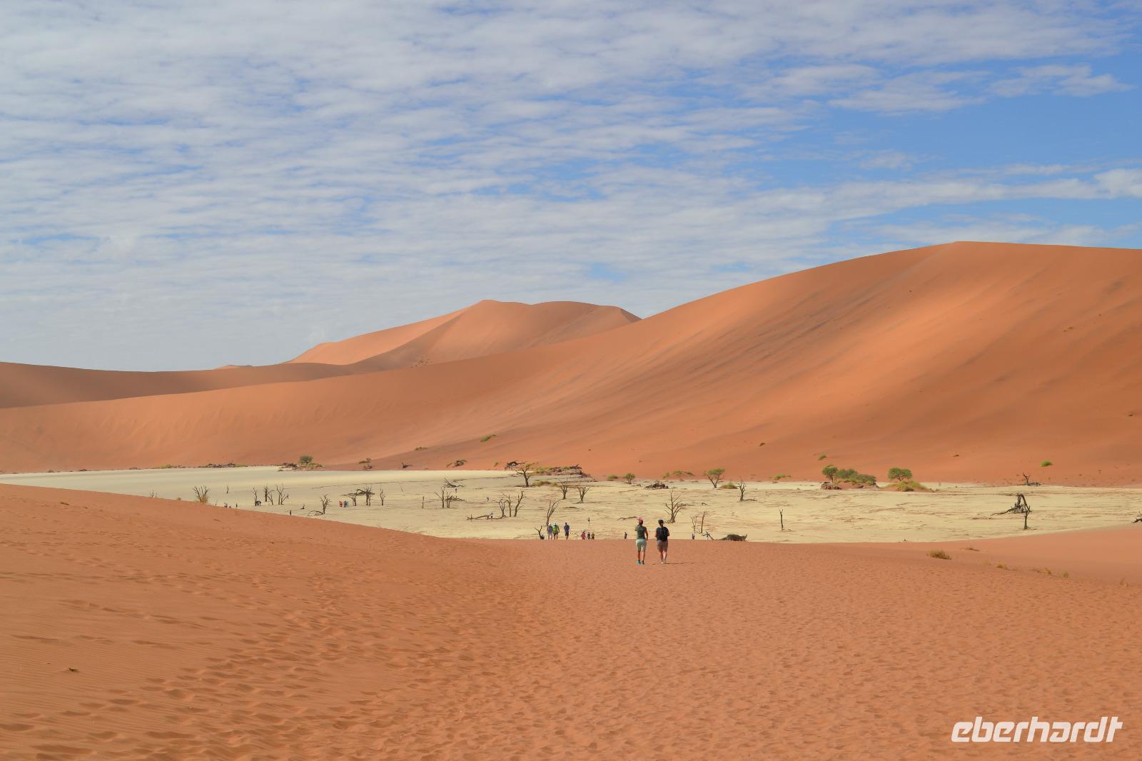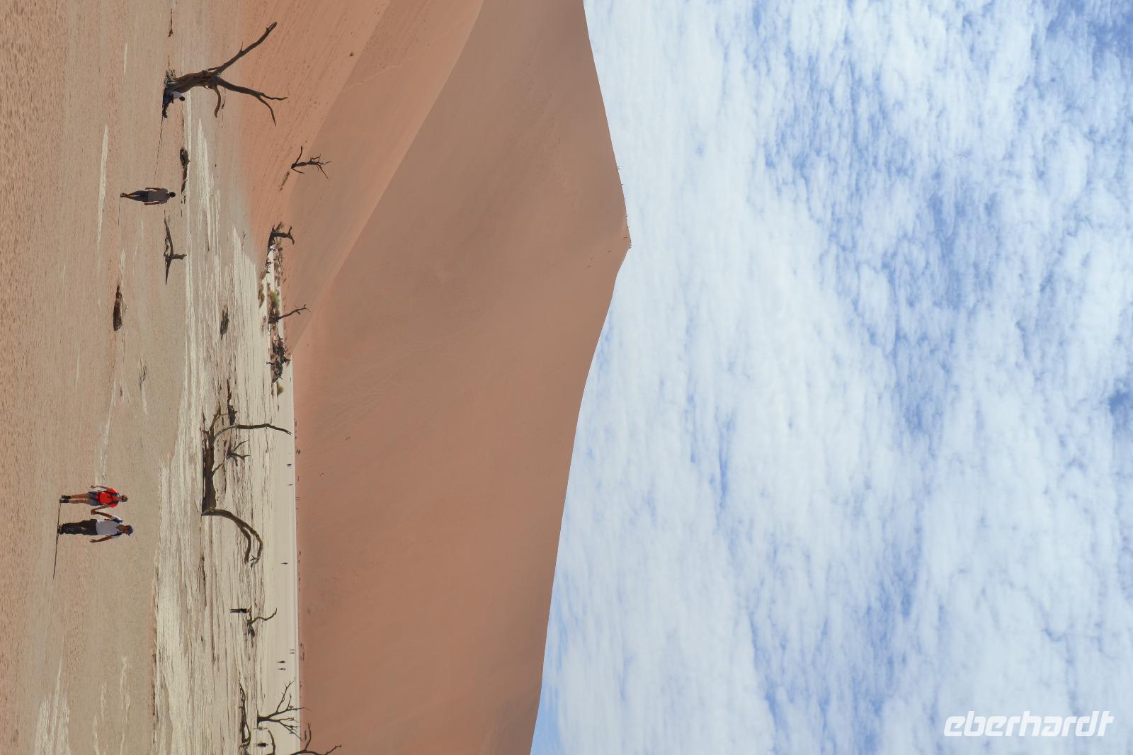 Bereits am frühen Morgen mit nur wenig Schlaf machten wir und auf den Weg in den Namib Naukluftpark Nationalpark. Der Park hat eine Fläche von 49.800 km². Nach einer kurzen Fahrt in unserem Truck über die Schotterpads hielten wir für eine kurze Toilettenpause vor den Toren des Nationalparks. Dort führte eine asphaltierte Straße zunächst zum bekannten Postkarten Motiv der Düne 45. Dort legten auch wir einen Fotostopp ein um auch ein so bekanntes Bild zu schießen. Im Anschluss ging es weiter bis wir in kleinere Jeeps umstiegen und unmittelbar in die Dünen fuhren. Den ersten Stopp legten wir am Sossusvlei ein. In den Sand malte uns Dagmar die Bewässerung ein. Bei dem Sossusvlei handelt es sich um eine von Sanddünen umschlossene beige Salz-Ton-Pfanne, die nur in seltenen guten Regenjahren Wasser führt. Dann bildet sich für kurze ein kleiner See im Vlei am Ende des Tsauchab. Der Jeep brachte uns zum Dead Vlei. Es ist die Sammelbezeichnung für die meist trockenliegende Endsenke eines Wüstenflusses. Dort wanderten bis zum Kalk Becken am Fuße des Big Daddy. In der Hitze konnten wir nur langsam einen Fuß vor den anderen setzen. Wieder zurück am Parkplatz angekommen holten wir die Muddi ab und warteten an der Haltestelle auf den Rücktransfer in den Jeeps. Wir stiegen nach einer kurzen Toiletten Pause in unseren Truck und fuhren zu einem abgelegenen Platz. Der Weg dorthin ging über eine sehr holperige Straße und alle Gäste wunderten sich was wir dort wollen. Dagmar meinte an diesen Fleck kommen viele Namibianer um die Düne entlang zu Wandern, roten Sand zu sammeln oder sich unter einen schönen Baum zu setzen. Das alles war natürlich nur eine Ausrede, denn wir bauten mehr oder weniger heimlich eine Dünenbar mit kleinen Snacks und Getränken auf. Eine schöne Überraschung und eine kleine Erholungspause in der Savanne. Unsere Melonen Reste und ein paar Keks Krümel fielen auch noch für die Vögel ab. Wir räumten unser Camping Equipment wieder in den Truck und fuhren zurück über die Hoppel Piste zum Sesriem Canyon. Zunächst schauten wir von oben herein und waren von der Größe stark beeindruckt. Wir stiegen gemeinsam die Treppen hinunter, wanderten und kletterten durch die beeindruckenden Wände des Canyons. Bei der Wärme war es eine wohltuende Abkühlung zwischen den Felswänden. Erschöpft ging es wieder zurück zum Hotel, wo uns noch genügend Zeit für ein Sprung in den Pool, einem kleinen Mittagsschläfchen oder eine Massage blieb. Am Abend trafen wir uns zu dem gemeinsamen Neujahr Abendessen. Heute war alles perfekt! Das Essen war warm und sehr lecker.