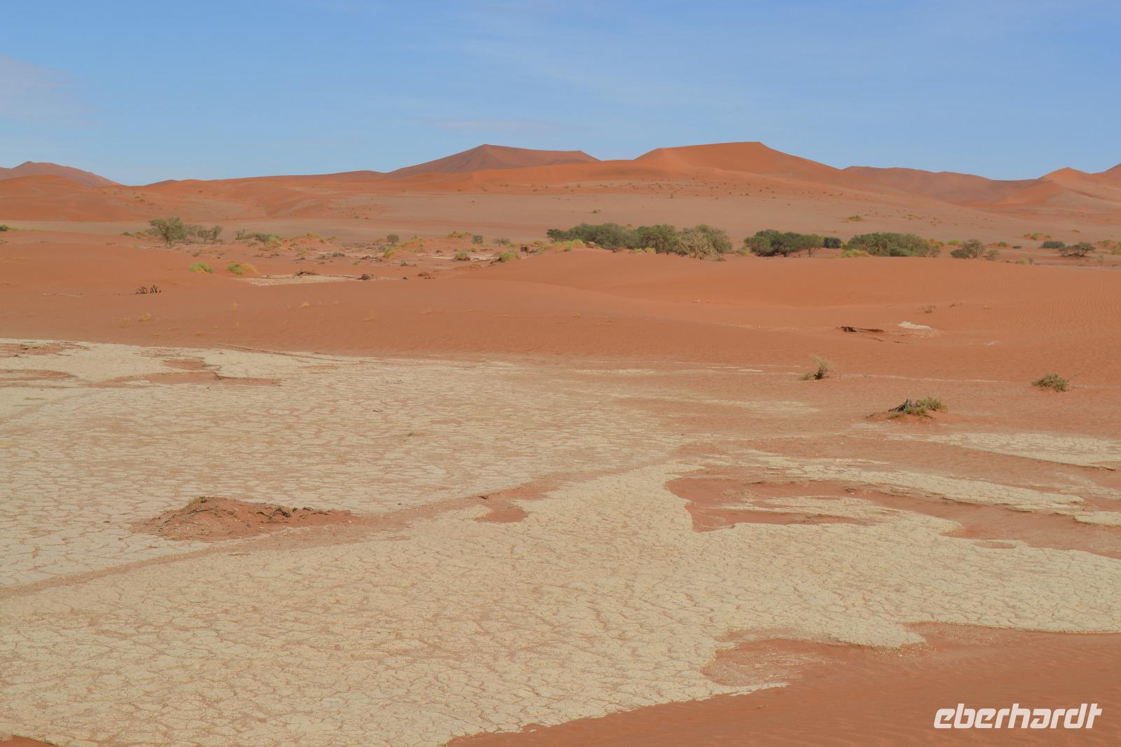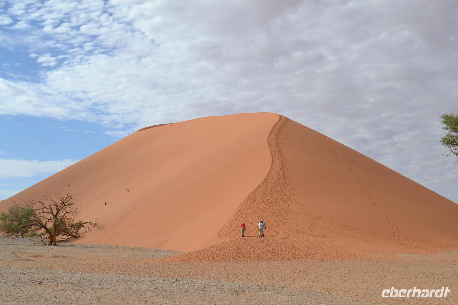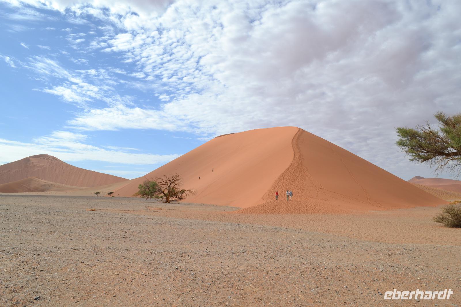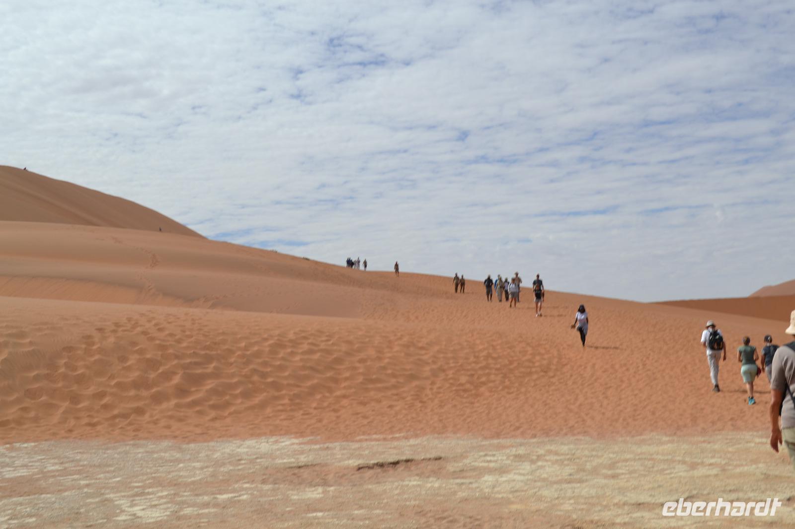 Bereits am frühen Morgen mit nur wenig Schlaf machten wir und auf den Weg in den Namib Naukluftpark Nationalpark. Der Park hat eine Fläche von 49.800 km². Nach einer kurzen Fahrt in unserem Truck über die Schotterpads hielten wir für eine kurze Toilettenpause vor den Toren des Nationalparks. Dort führte eine asphaltierte Straße zunächst zum bekannten Postkarten Motiv der Düne 45. Dort legten auch wir einen Fotostopp ein um auch ein so bekanntes Bild zu schießen. Im Anschluss ging es weiter bis wir in kleinere Jeeps umstiegen und unmittelbar in die Dünen fuhren. Den ersten Stopp legten wir am Sossusvlei ein. In den Sand malte uns Dagmar die Bewässerung ein. Bei dem Sossusvlei handelt es sich um eine von Sanddünen umschlossene beige Salz-Ton-Pfanne, die nur in seltenen guten Regenjahren Wasser führt. Dann bildet sich für kurze ein kleiner See im Vlei am Ende des Tsauchab. Der Jeep brachte uns zum Dead Vlei. Es ist die Sammelbezeichnung für die meist trockenliegende Endsenke eines Wüstenflusses. Dort wanderten bis zum Kalk Becken am Fuße des Big Daddy. In der Hitze konnten wir nur langsam einen Fuß vor den anderen setzen. Wieder zurück am Parkplatz angekommen holten wir die Muddi ab und warteten an der Haltestelle auf den Rücktransfer in den Jeeps. Wir stiegen nach einer kurzen Toiletten Pause in unseren Truck und fuhren zu einem abgelegenen Platz. Der Weg dorthin ging über eine sehr holperige Straße und alle Gäste wunderten sich was wir dort wollen. Dagmar meinte an diesen Fleck kommen viele Namibianer um die Düne entlang zu Wandern, roten Sand zu sammeln oder sich unter einen schönen Baum zu setzen. Das alles war natürlich nur eine Ausrede, denn wir bauten mehr oder weniger heimlich eine Dünenbar mit kleinen Snacks und Getränken auf. Eine schöne Überraschung und eine kleine Erholungspause in der Savanne. Unsere Melonen Reste und ein paar Keks Krümel fielen auch noch für die Vögel ab. Wir räumten unser Camping Equipment wieder in den Truck und fuhren zurück über die Hoppel Piste zum Sesriem Canyon. Zunächst schauten wir von oben herein und waren von der Größe stark beeindruckt. Wir stiegen gemeinsam die Treppen hinunter, wanderten und kletterten durch die beeindruckenden Wände des Canyons. Bei der Wärme war es eine wohltuende Abkühlung zwischen den Felswänden. Erschöpft ging es wieder zurück zum Hotel, wo uns noch genügend Zeit für ein Sprung in den Pool, einem kleinen Mittagsschläfchen oder eine Massage blieb. Am Abend trafen wir uns zu dem gemeinsamen Neujahr Abendessen. Heute war alles perfekt! Das Essen war warm und sehr lecker.