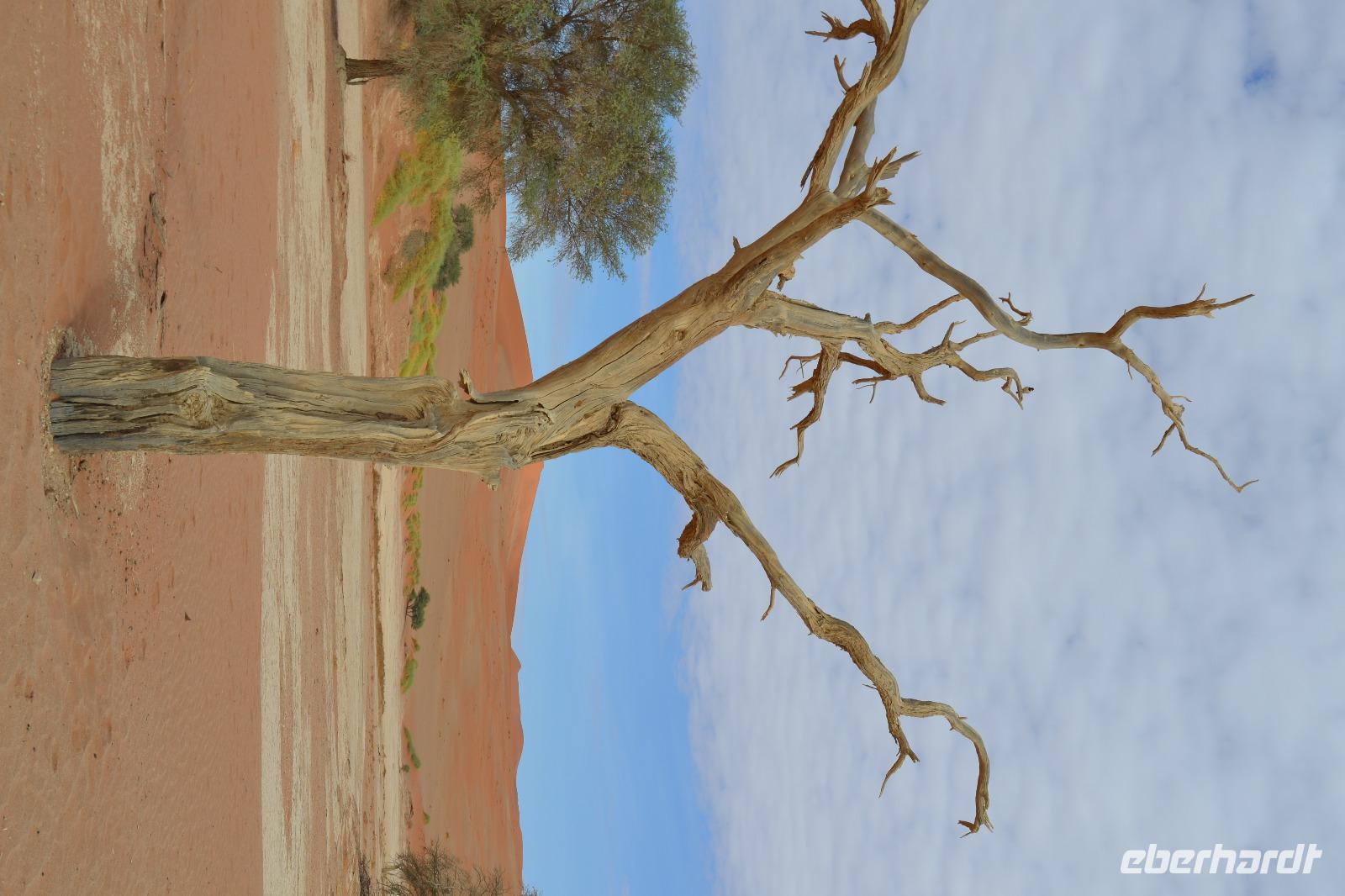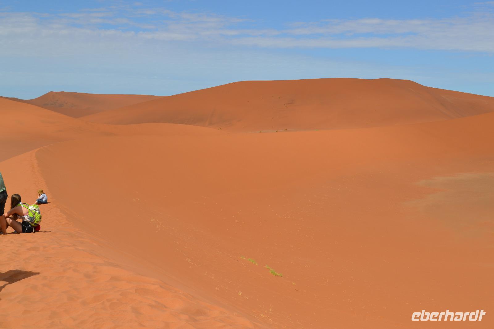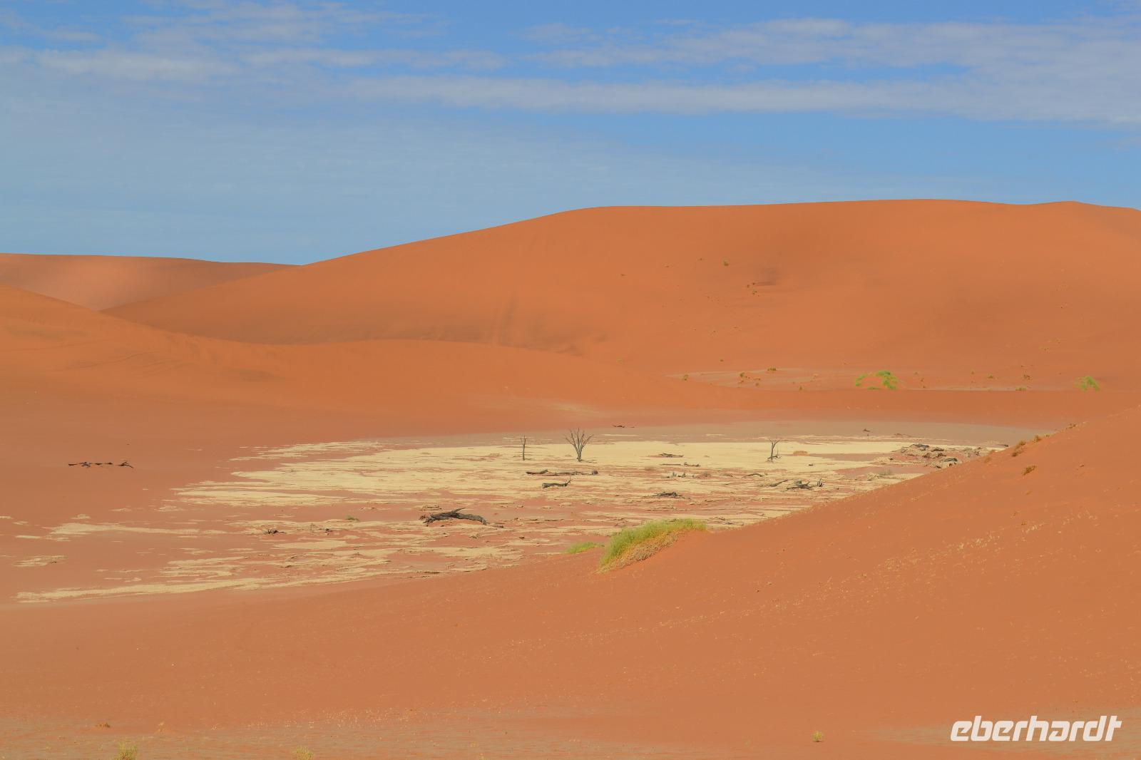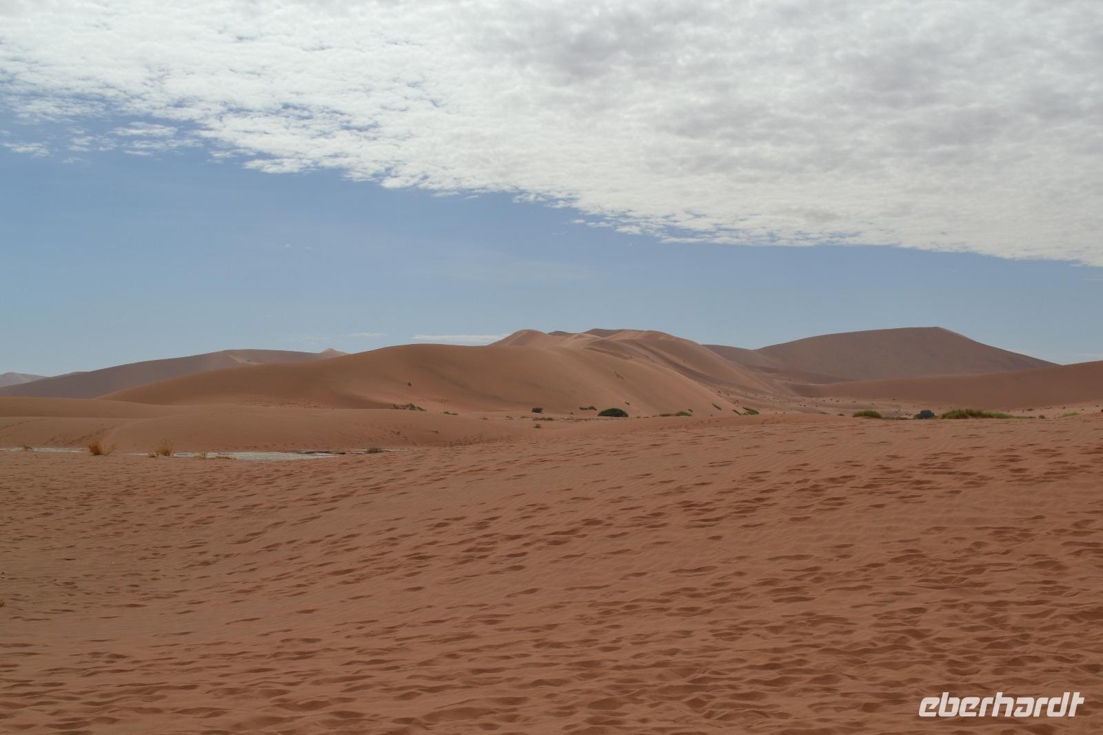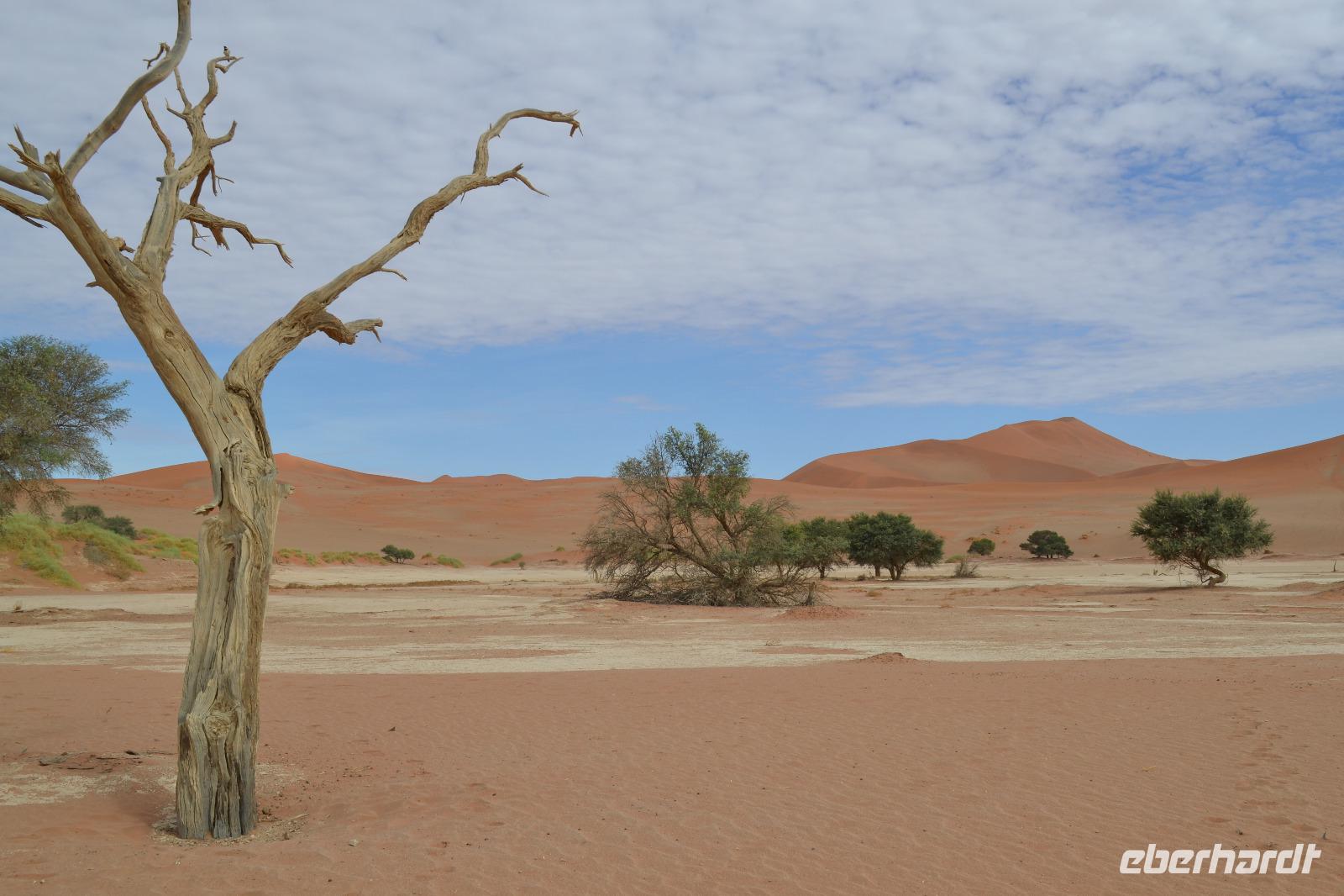 Bereits am frühen Morgen mit nur wenig Schlaf machten wir und auf den Weg in den Namib Naukluftpark Nationalpark. Der Park hat eine Fläche von 49.800 km². Nach einer kurzen Fahrt in unserem Truck über die Schotterpads hielten wir für eine kurze Toilettenpause vor den Toren des Nationalparks. Dort führte eine asphaltierte Straße zunächst zum bekannten Postkarten Motiv der Düne 45. Dort legten auch wir einen Fotostopp ein um auch ein so bekanntes Bild zu schießen. Im Anschluss ging es weiter bis wir in kleinere Jeeps umstiegen und unmittelbar in die Dünen fuhren. Den ersten Stopp legten wir am Sossusvlei ein. In den Sand malte uns Dagmar die Bewässerung ein. Bei dem Sossusvlei handelt es sich um eine von Sanddünen umschlossene beige Salz-Ton-Pfanne, die nur in seltenen guten Regenjahren Wasser führt. Dann bildet sich für kurze ein kleiner See im Vlei am Ende des Tsauchab. Der Jeep brachte uns zum Dead Vlei. Es ist die Sammelbezeichnung für die meist trockenliegende Endsenke eines Wüstenflusses. Dort wanderten bis zum Kalk Becken am Fuße des Big Daddy. In der Hitze konnten wir nur langsam einen Fuß vor den anderen setzen. Wieder zurück am Parkplatz angekommen holten wir die Muddi ab und warteten an der Haltestelle auf den Rücktransfer in den Jeeps. Wir stiegen nach einer kurzen Toiletten Pause in unseren Truck und fuhren zu einem abgelegenen Platz. Der Weg dorthin ging über eine sehr holperige Straße und alle Gäste wunderten sich was wir dort wollen. Dagmar meinte an diesen Fleck kommen viele Namibianer um die Düne entlang zu Wandern, roten Sand zu sammeln oder sich unter einen schönen Baum zu setzen. Das alles war natürlich nur eine Ausrede, denn wir bauten mehr oder weniger heimlich eine Dünenbar mit kleinen Snacks und Getränken auf. Eine schöne Überraschung und eine kleine Erholungspause in der Savanne. Unsere Melonen Reste und ein paar Keks Krümel fielen auch noch für die Vögel ab. Wir räumten unser Camping Equipment wieder in den Truck und fuhren zurück über die Hoppel Piste zum Sesriem Canyon. Zunächst schauten wir von oben herein und waren von der Größe stark beeindruckt. Wir stiegen gemeinsam die Treppen hinunter, wanderten und kletterten durch die beeindruckenden Wände des Canyons. Bei der Wärme war es eine wohltuende Abkühlung zwischen den Felswänden. Erschöpft ging es wieder zurück zum Hotel, wo uns noch genügend Zeit für ein Sprung in den Pool, einem kleinen Mittagsschläfchen oder eine Massage blieb. Am Abend trafen wir uns zu dem gemeinsamen Neujahr Abendessen. Heute war alles perfekt! Das Essen war warm und sehr lecker.