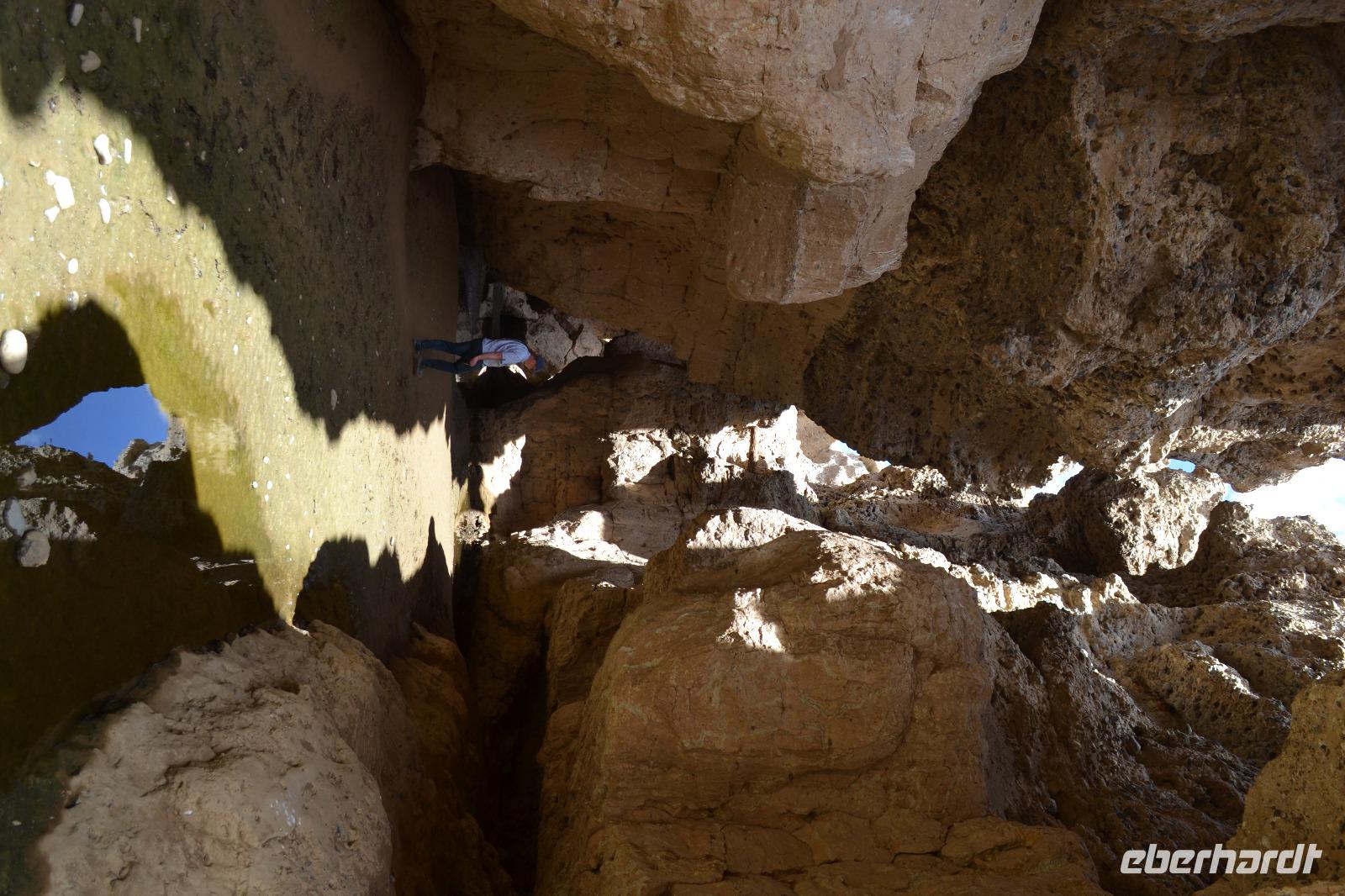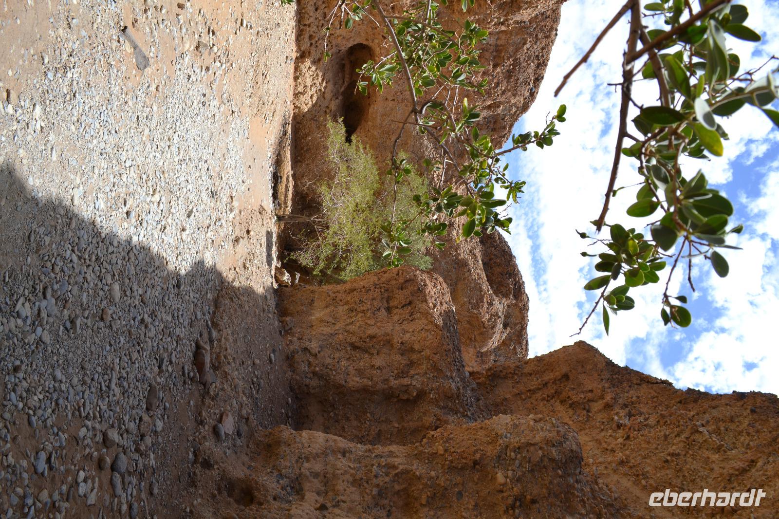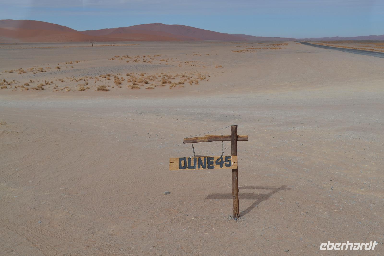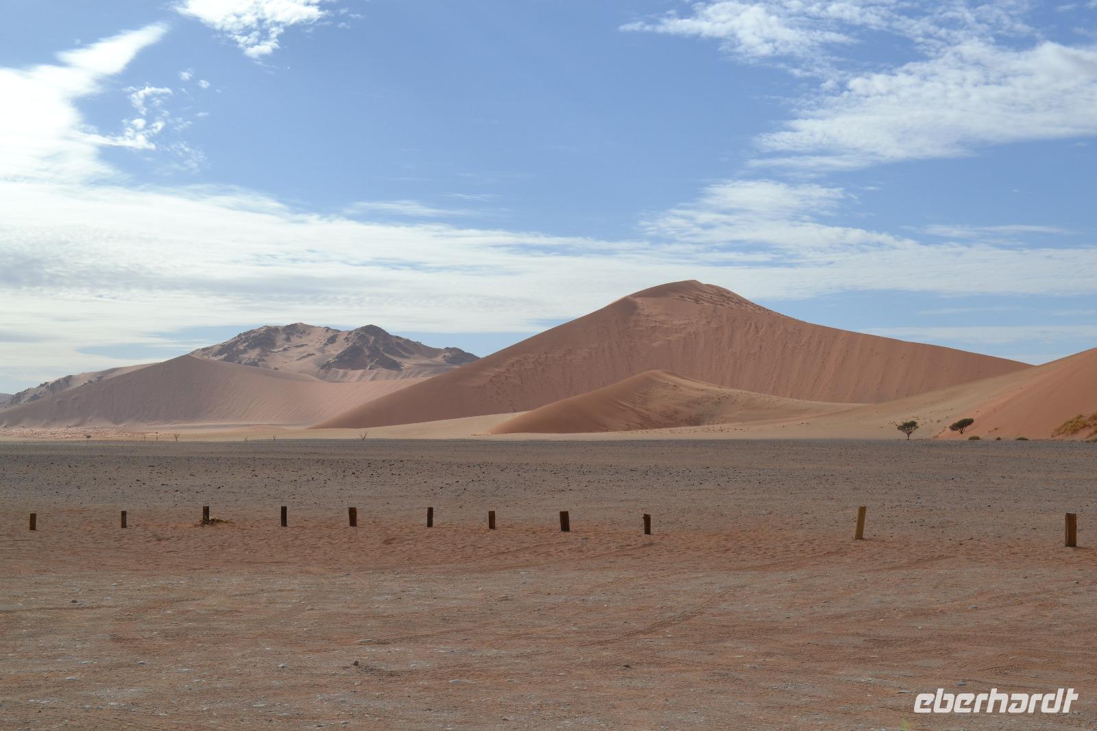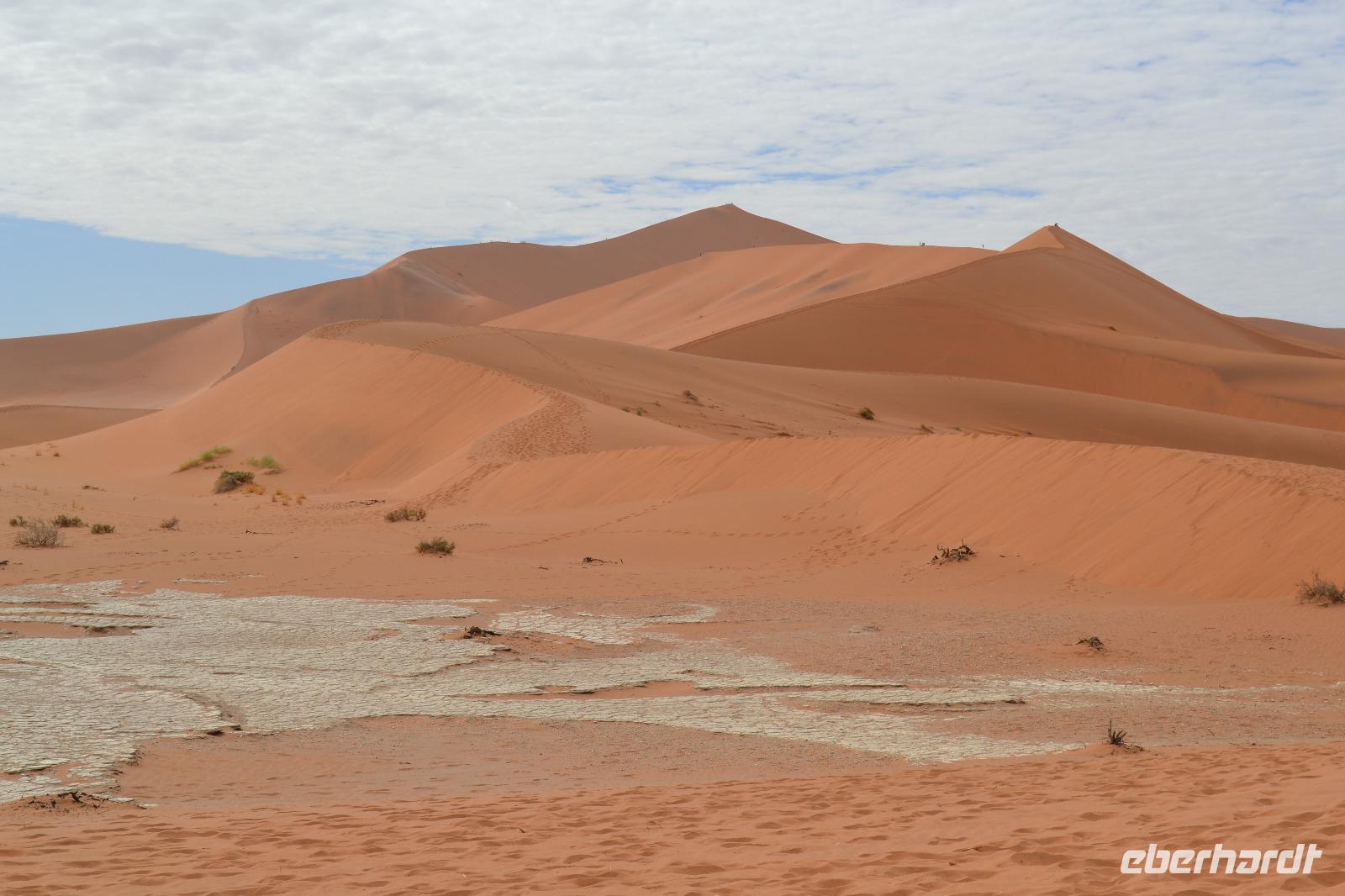 Bereits am frühen Morgen mit nur wenig Schlaf machten wir und auf den Weg in den Namib Naukluftpark Nationalpark. Der Park hat eine Fläche von 49.800 km². Nach einer kurzen Fahrt in unserem Truck über die Schotterpads hielten wir für eine kurze Toilettenpause vor den Toren des Nationalparks. Dort führte eine asphaltierte Straße zunächst zum bekannten Postkarten Motiv der Düne 45. Dort legten auch wir einen Fotostopp ein um auch ein so bekanntes Bild zu schießen. Im Anschluss ging es weiter bis wir in kleinere Jeeps umstiegen und unmittelbar in die Dünen fuhren. Den ersten Stopp legten wir am Sossusvlei ein. In den Sand malte uns Dagmar die Bewässerung ein. Bei dem Sossusvlei handelt es sich um eine von Sanddünen umschlossene beige Salz-Ton-Pfanne, die nur in seltenen guten Regenjahren Wasser führt. Dann bildet sich für kurze ein kleiner See im Vlei am Ende des Tsauchab. Der Jeep brachte uns zum Dead Vlei. Es ist die Sammelbezeichnung für die meist trockenliegende Endsenke eines Wüstenflusses. Dort wanderten bis zum Kalk Becken am Fuße des Big Daddy. In der Hitze konnten wir nur langsam einen Fuß vor den anderen setzen. Wieder zurück am Parkplatz angekommen holten wir die Muddi ab und warteten an der Haltestelle auf den Rücktransfer in den Jeeps. Wir stiegen nach einer kurzen Toiletten Pause in unseren Truck und fuhren zu einem abgelegenen Platz. Der Weg dorthin ging über eine sehr holperige Straße und alle Gäste wunderten sich was wir dort wollen. Dagmar meinte an diesen Fleck kommen viele Namibianer um die Düne entlang zu Wandern, roten Sand zu sammeln oder sich unter einen schönen Baum zu setzen. Das alles war natürlich nur eine Ausrede, denn wir bauten mehr oder weniger heimlich eine Dünenbar mit kleinen Snacks und Getränken auf. Eine schöne Überraschung und eine kleine Erholungspause in der Savanne. Unsere Melonen Reste und ein paar Keks Krümel fielen auch noch für die Vögel ab. Wir räumten unser Camping Equipment wieder in den Truck und fuhren zurück über die Hoppel Piste zum Sesriem Canyon. Zunächst schauten wir von oben herein und waren von der Größe stark beeindruckt. Wir stiegen gemeinsam die Treppen hinunter, wanderten und kletterten durch die beeindruckenden Wände des Canyons. Bei der Wärme war es eine wohltuende Abkühlung zwischen den Felswänden. Erschöpft ging es wieder zurück zum Hotel, wo uns noch genügend Zeit für ein Sprung in den Pool, einem kleinen Mittagsschläfchen oder eine Massage blieb. Am Abend trafen wir uns zu dem gemeinsamen Neujahr Abendessen. Heute war alles perfekt! Das Essen war warm und sehr lecker.