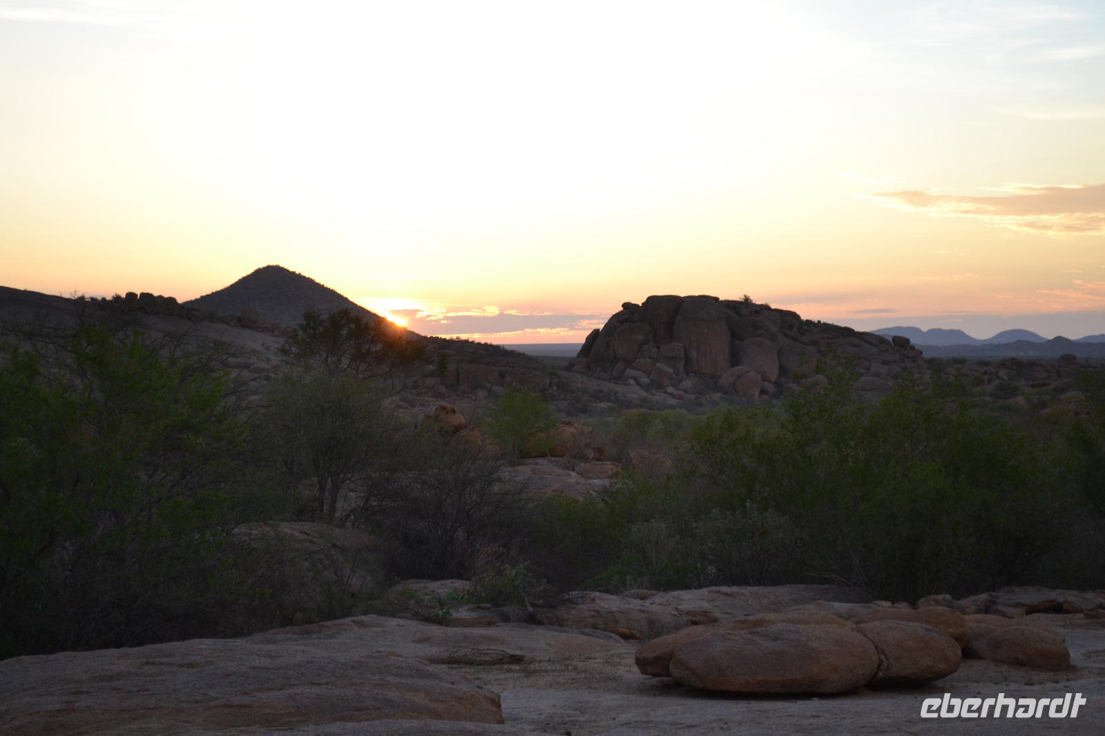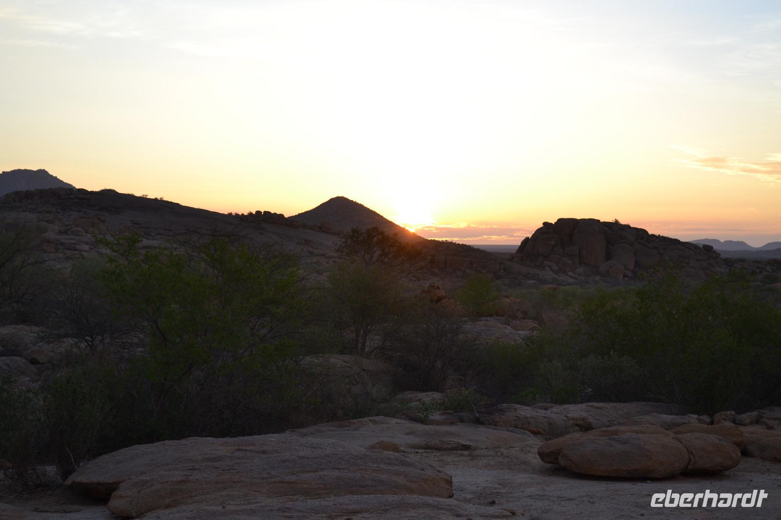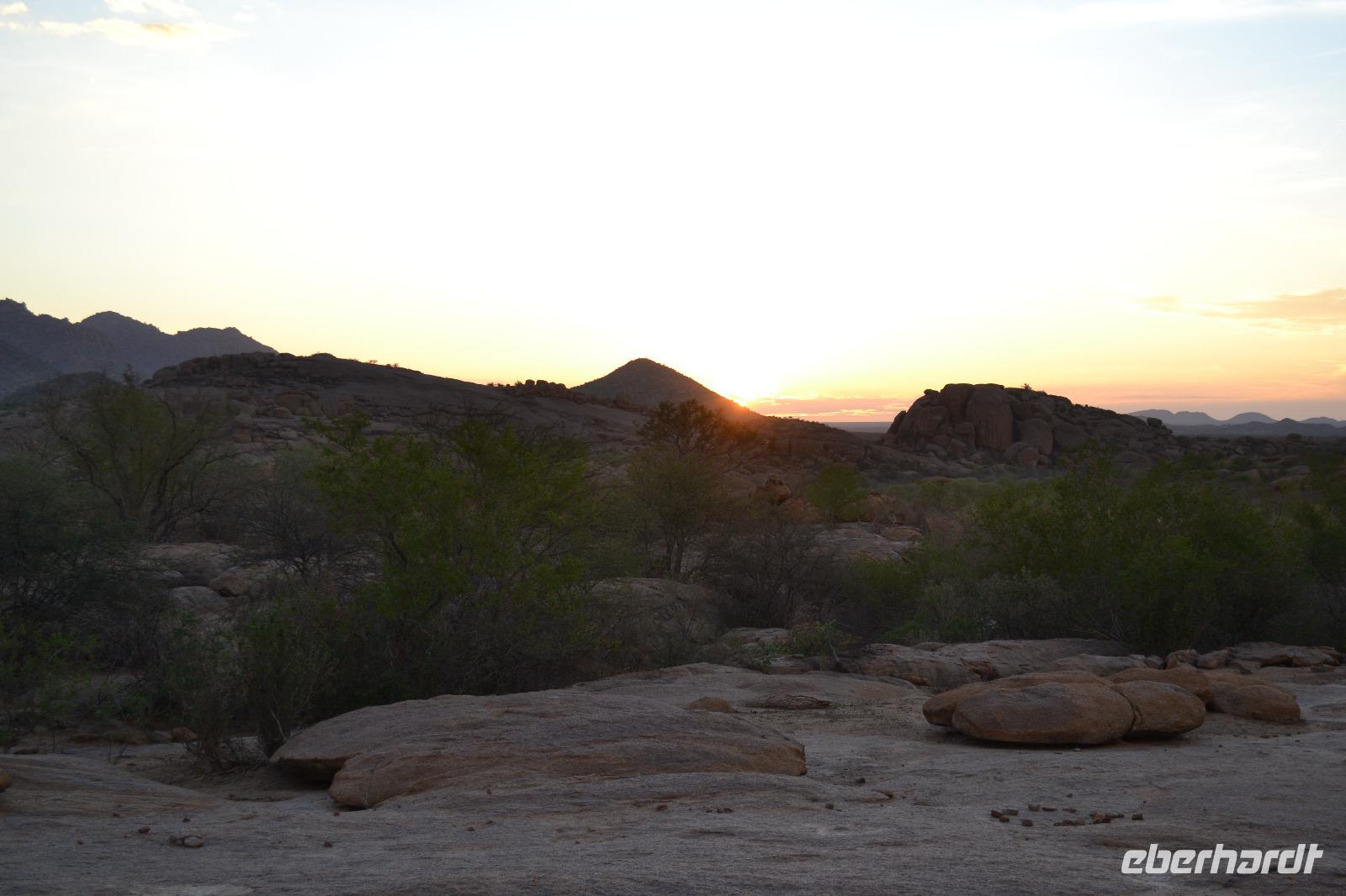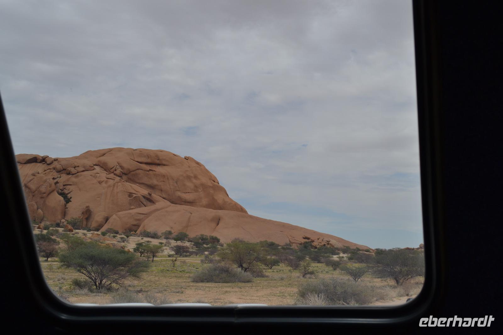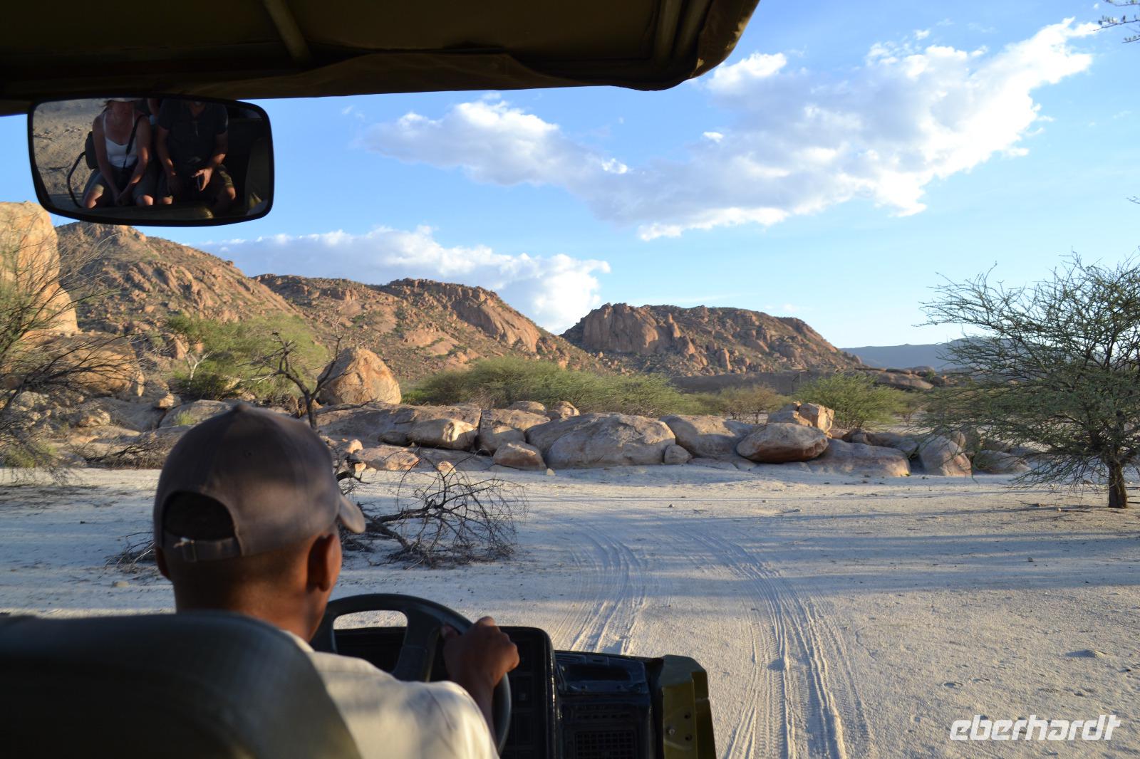 Wir frühstückten in dem neuen Stadthotel und fuhren heute mal etwas später los als gewohnt. Unserer Dagmar ging es heute leider nicht so gut. Sie hatte am Vortag anscheinend etwas Falsches gegessen. Die Kripo besuchte vor der Abfahrt noch die örtliche Polizeistation und schoß ein paar Erinnerungsfotos. Anschließend fuhren wir nicht allzu weit zur Spitzkoppe. Der Inselberg mit 1728 m Höhe wird auch als das „Matterhorn Namibias" bezeichnet. Seit 2011 gilt es als Nationaldenkmal und unterhielt damals eine Polizeistation der Schutztruppe für Deutsch-Südwestafrika. Leider verloren wir auf der gestrigen Holperfahrt unsere Klimaanlage und mussten nun mit offenen Fenstern auskommen. Eine Reparatur oder ein Bustausch war auf Grund der Ferien bis zum 07.01. leider nicht möglich. An dem Berg angekommen unternahmen wir zunächst einen kleinen Spaziergang über die skurrile Fels Landschaft zum Rock Arch, dem Felsbogen. Lange hielt man es auf Grund der Hitze dort allerdings nicht aus. Unter einem schönen Baum veranstalteten wir ein Reste-Picknick, wobei wir einiges am Morgen in Swakopmund frisch einkauften. Unser Highlight war am Ende des Picknicks der Springbock Tanz mit dem anschließend namensgleichen Getränk. Dazu mischten Laura und Dagmar Pfefferminz Likör mit Amarula. Ein leckeres und erfrischendes Schnäpsle. Auf dem Weg zur Lodge hielten wir an den Ständen der Kinder, welche aus Blech gebastelte und bemalte Mobiles verkauften. Wir verteilten die Reste unseres Picknicks an die Kinder, welche sich sehr darüber freuten. Am Nachmittag erreichten wir die Ai Aiba Lodge und bezogen unsere Zimmer am Fuße eines Felsens im Erongo Gebirge. Wie regenerierten uns bei einem kühlen Getränk oder einem kleinen Schläfchen. 17 Uhr ging es dann auf eine Sundowner Fahrt durch das Erongo Tal. Auf dieser Tour mit dem Jeep sahen wir unterschiedlichste Landschaftsbilder, Giraffen, Warzenschweine, Oryx und Wandmalereien. Diese dienten der Weiter Erzählung von Geschichten, waren Veranstaltungsort für Zeremonien und stellten die Geschichte der Ureinwohner dar. An einem höher gelegenen Felsen legten wir mit den Jeeps eine Pause ein. Jeder bekam ein kühles Getränk für den Sonnenuntergang im Gebirge, sowie ein paar Naschereien. Am Abend kamen wir in der Dunkelheit zurück in das Hotel, wo bereits N. Und Dagmar hungrig auf uns und das Abendessen warteten.