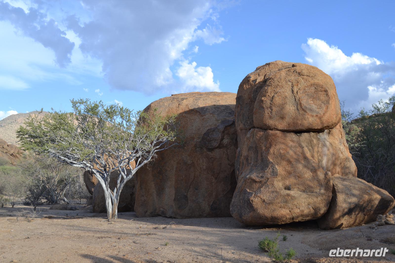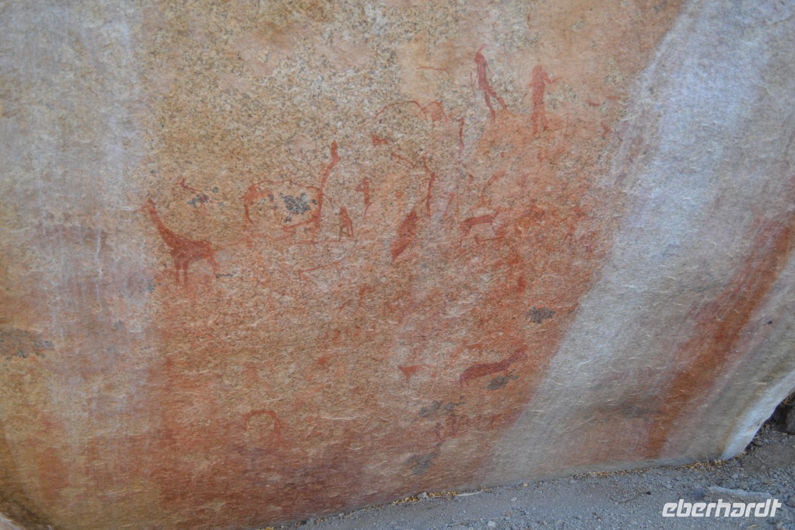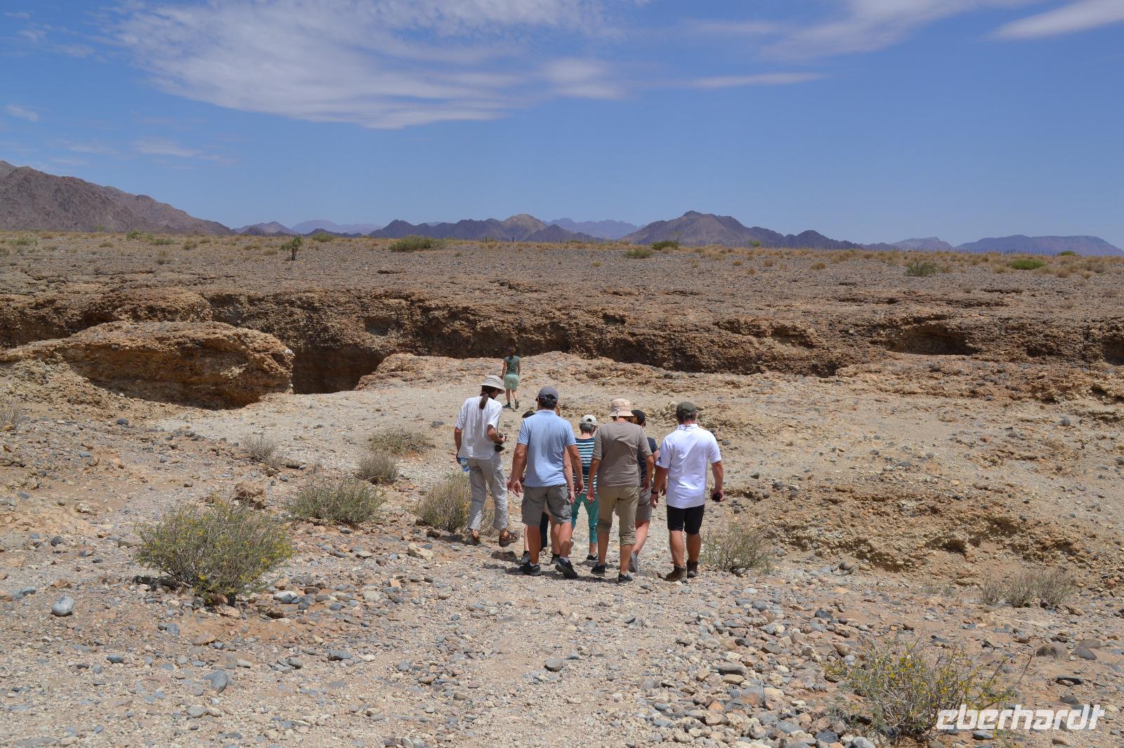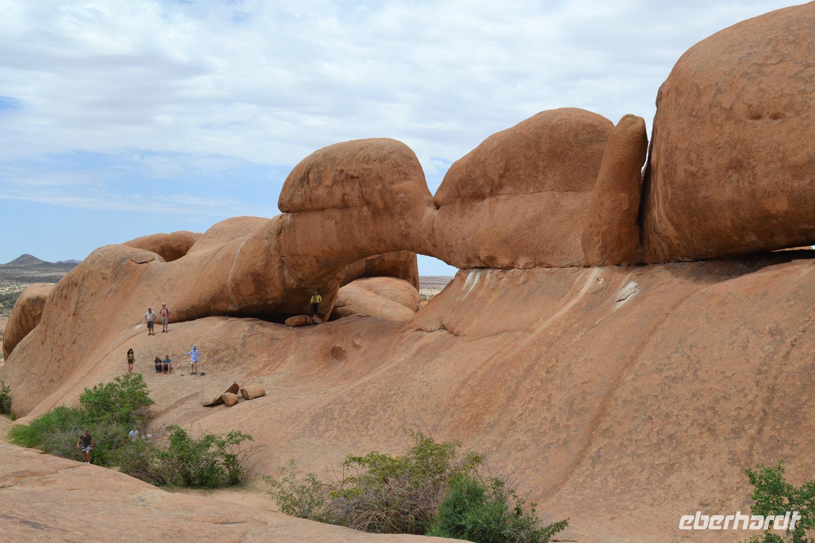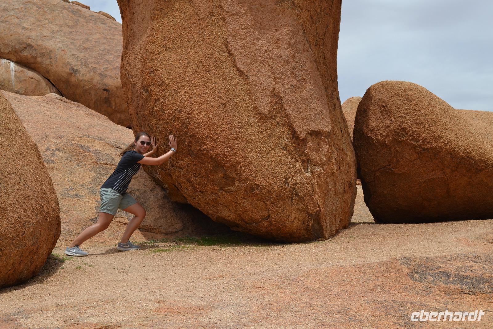 Wir frühstückten in dem neuen Stadthotel und fuhren heute mal etwas später los als gewohnt. Unserer Dagmar ging es heute leider nicht so gut. Sie hatte am Vortag anscheinend etwas Falsches gegessen. Die Kripo besuchte vor der Abfahrt noch die örtliche Polizeistation und schoß ein paar Erinnerungsfotos. Anschließend fuhren wir nicht allzu weit zur Spitzkoppe. Der Inselberg mit 1728 m Höhe wird auch als das „Matterhorn Namibias" bezeichnet. Seit 2011 gilt es als Nationaldenkmal und unterhielt damals eine Polizeistation der Schutztruppe für Deutsch-Südwestafrika. Leider verloren wir auf der gestrigen Holperfahrt unsere Klimaanlage und mussten nun mit offenen Fenstern auskommen. Eine Reparatur oder ein Bustausch war auf Grund der Ferien bis zum 07.01. leider nicht möglich. An dem Berg angekommen unternahmen wir zunächst einen kleinen Spaziergang über die skurrile Fels Landschaft zum Rock Arch, dem Felsbogen. Lange hielt man es auf Grund der Hitze dort allerdings nicht aus. Unter einem schönen Baum veranstalteten wir ein Reste-Picknick, wobei wir einiges am Morgen in Swakopmund frisch einkauften. Unser Highlight war am Ende des Picknicks der Springbock Tanz mit dem anschließend namensgleichen Getränk. Dazu mischten Laura und Dagmar Pfefferminz Likör mit Amarula. Ein leckeres und erfrischendes Schnäpsle. Auf dem Weg zur Lodge hielten wir an den Ständen der Kinder, welche aus Blech gebastelte und bemalte Mobiles verkauften. Wir verteilten die Reste unseres Picknicks an die Kinder, welche sich sehr darüber freuten. Am Nachmittag erreichten wir die Ai Aiba Lodge und bezogen unsere Zimmer am Fuße eines Felsens im Erongo Gebirge. Wie regenerierten uns bei einem kühlen Getränk oder einem kleinen Schläfchen. 17 Uhr ging es dann auf eine Sundowner Fahrt durch das Erongo Tal. Auf dieser Tour mit dem Jeep sahen wir unterschiedlichste Landschaftsbilder, Giraffen, Warzenschweine, Oryx und Wandmalereien. Diese dienten der Weiter Erzählung von Geschichten, waren Veranstaltungsort für Zeremonien und stellten die Geschichte der Ureinwohner dar. An einem höher gelegenen Felsen legten wir mit den Jeeps eine Pause ein. Jeder bekam ein kühles Getränk für den Sonnenuntergang im Gebirge, sowie ein paar Naschereien. Am Abend kamen wir in der Dunkelheit zurück in das Hotel, wo bereits N. Und Dagmar hungrig auf uns und das Abendessen warteten.