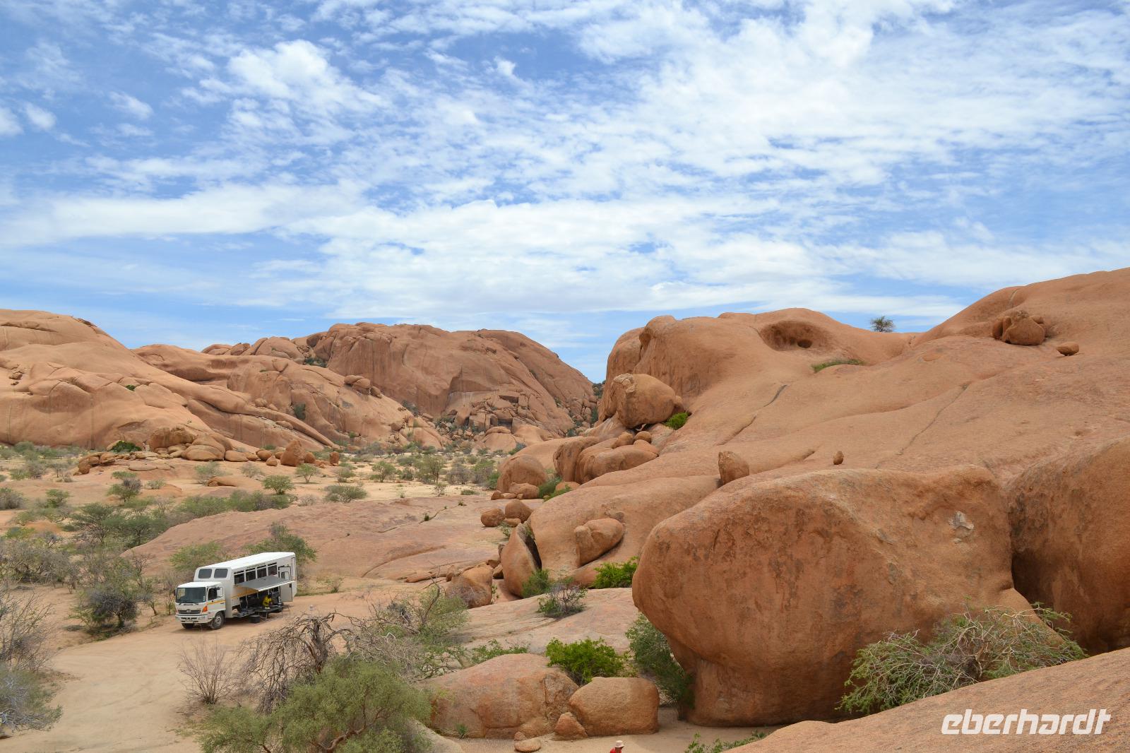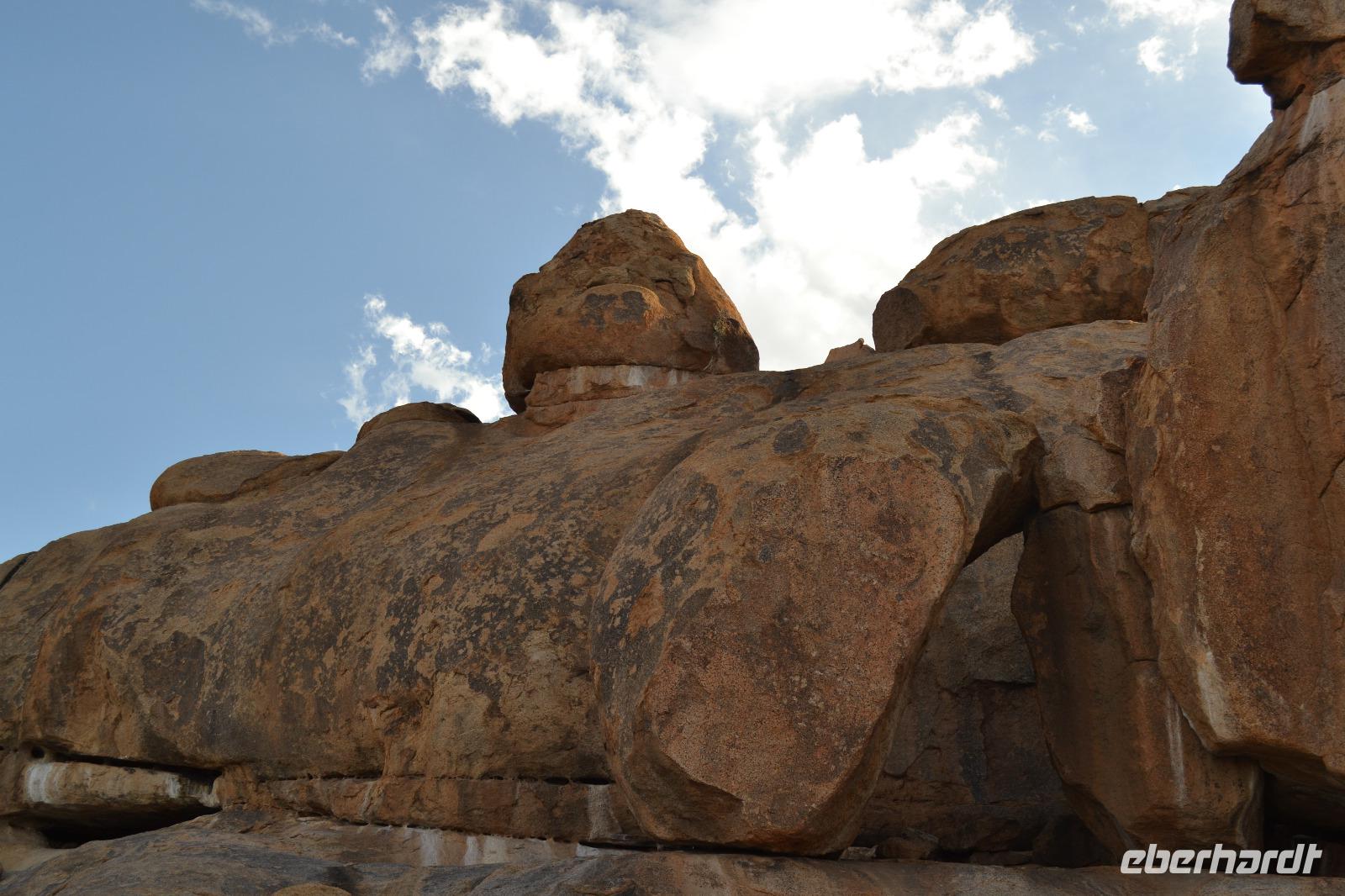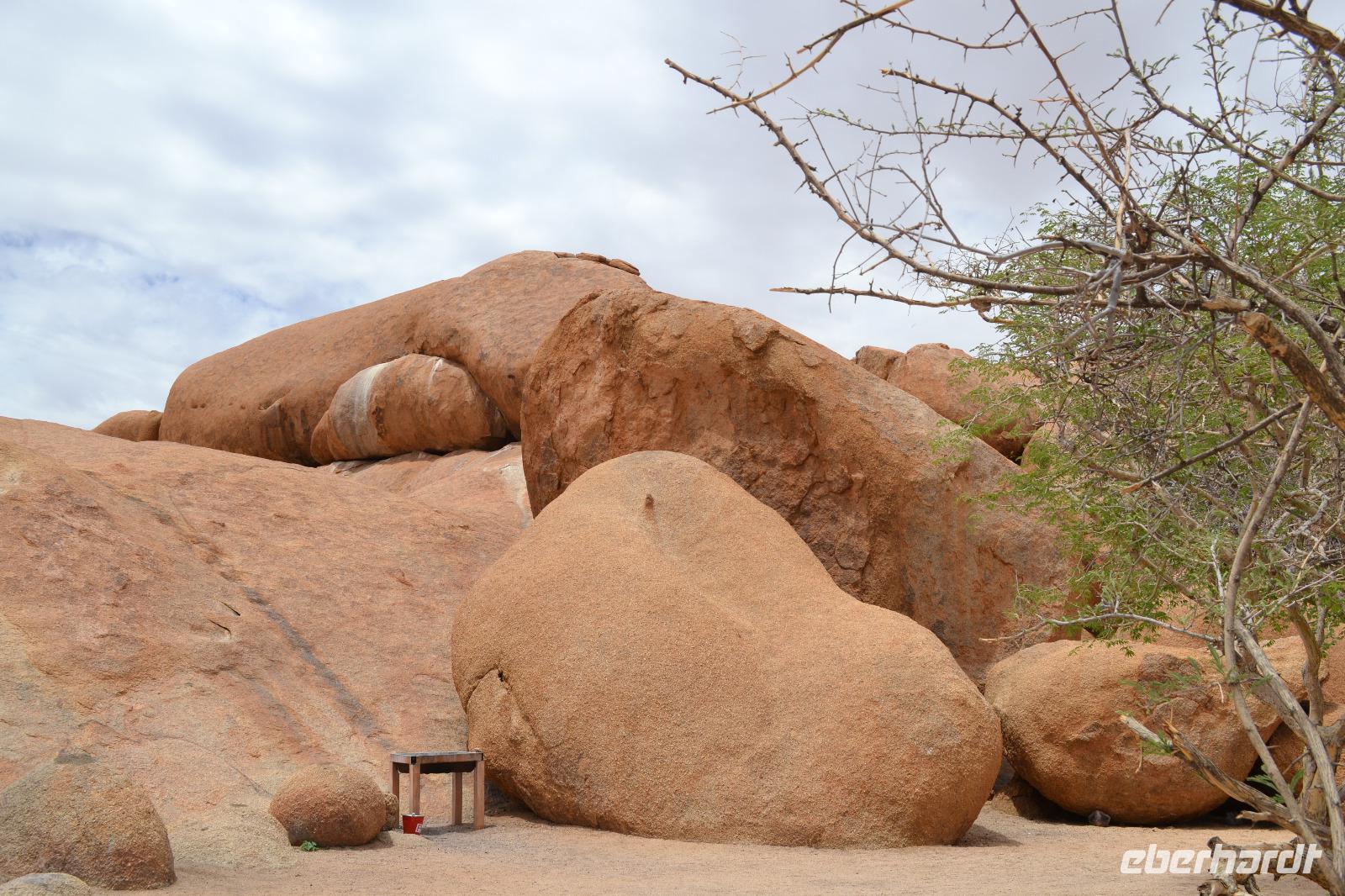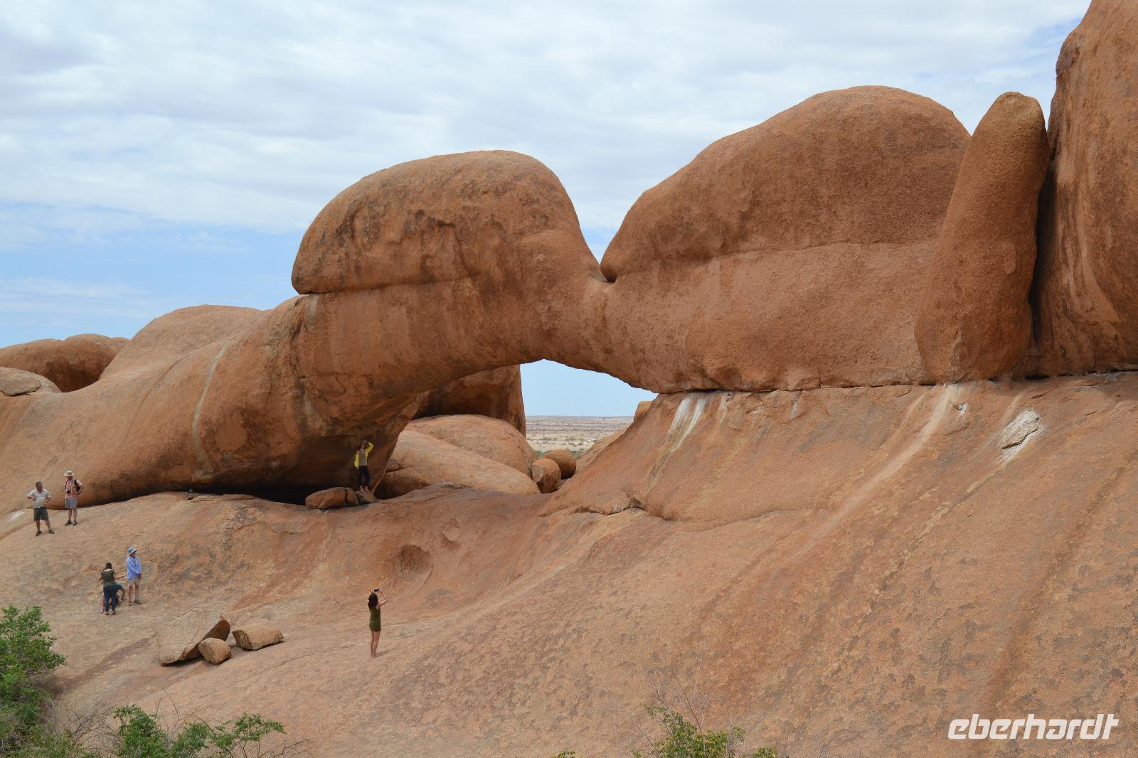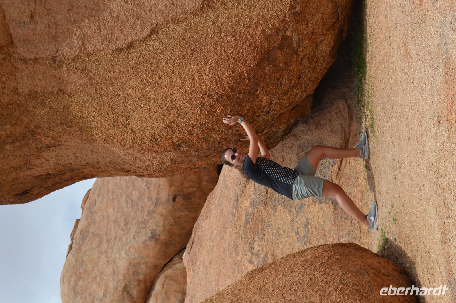 Wir frühstückten in dem neuen Stadthotel und fuhren heute mal etwas später los als gewohnt. Unserer Dagmar ging es heute leider nicht so gut. Sie hatte am Vortag anscheinend etwas Falsches gegessen. Die Kripo besuchte vor der Abfahrt noch die örtliche Polizeistation und schoß ein paar Erinnerungsfotos. Anschließend fuhren wir nicht allzu weit zur Spitzkoppe. Der Inselberg mit 1728 m Höhe wird auch als das „Matterhorn Namibias" bezeichnet. Seit 2011 gilt es als Nationaldenkmal und unterhielt damals eine Polizeistation der Schutztruppe für Deutsch-Südwestafrika. Leider verloren wir auf der gestrigen Holperfahrt unsere Klimaanlage und mussten nun mit offenen Fenstern auskommen. Eine Reparatur oder ein Bustausch war auf Grund der Ferien bis zum 07.01. leider nicht möglich. An dem Berg angekommen unternahmen wir zunächst einen kleinen Spaziergang über die skurrile Fels Landschaft zum Rock Arch, dem Felsbogen. Lange hielt man es auf Grund der Hitze dort allerdings nicht aus. Unter einem schönen Baum veranstalteten wir ein Reste-Picknick, wobei wir einiges am Morgen in Swakopmund frisch einkauften. Unser Highlight war am Ende des Picknicks der Springbock Tanz mit dem anschließend namensgleichen Getränk. Dazu mischten Laura und Dagmar Pfefferminz Likör mit Amarula. Ein leckeres und erfrischendes Schnäpsle. Auf dem Weg zur Lodge hielten wir an den Ständen der Kinder, welche aus Blech gebastelte und bemalte Mobiles verkauften. Wir verteilten die Reste unseres Picknicks an die Kinder, welche sich sehr darüber freuten. Am Nachmittag erreichten wir die Ai Aiba Lodge und bezogen unsere Zimmer am Fuße eines Felsens im Erongo Gebirge. Wie regenerierten uns bei einem kühlen Getränk oder einem kleinen Schläfchen. 17 Uhr ging es dann auf eine Sundowner Fahrt durch das Erongo Tal. Auf dieser Tour mit dem Jeep sahen wir unterschiedlichste Landschaftsbilder, Giraffen, Warzenschweine, Oryx und Wandmalereien. Diese dienten der Weiter Erzählung von Geschichten, waren Veranstaltungsort für Zeremonien und stellten die Geschichte der Ureinwohner dar. An einem höher gelegenen Felsen legten wir mit den Jeeps eine Pause ein. Jeder bekam ein kühles Getränk für den Sonnenuntergang im Gebirge, sowie ein paar Naschereien. Am Abend kamen wir in der Dunkelheit zurück in das Hotel, wo bereits N. Und Dagmar hungrig auf uns und das Abendessen warteten.