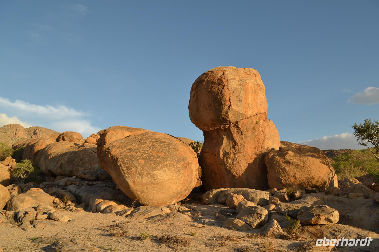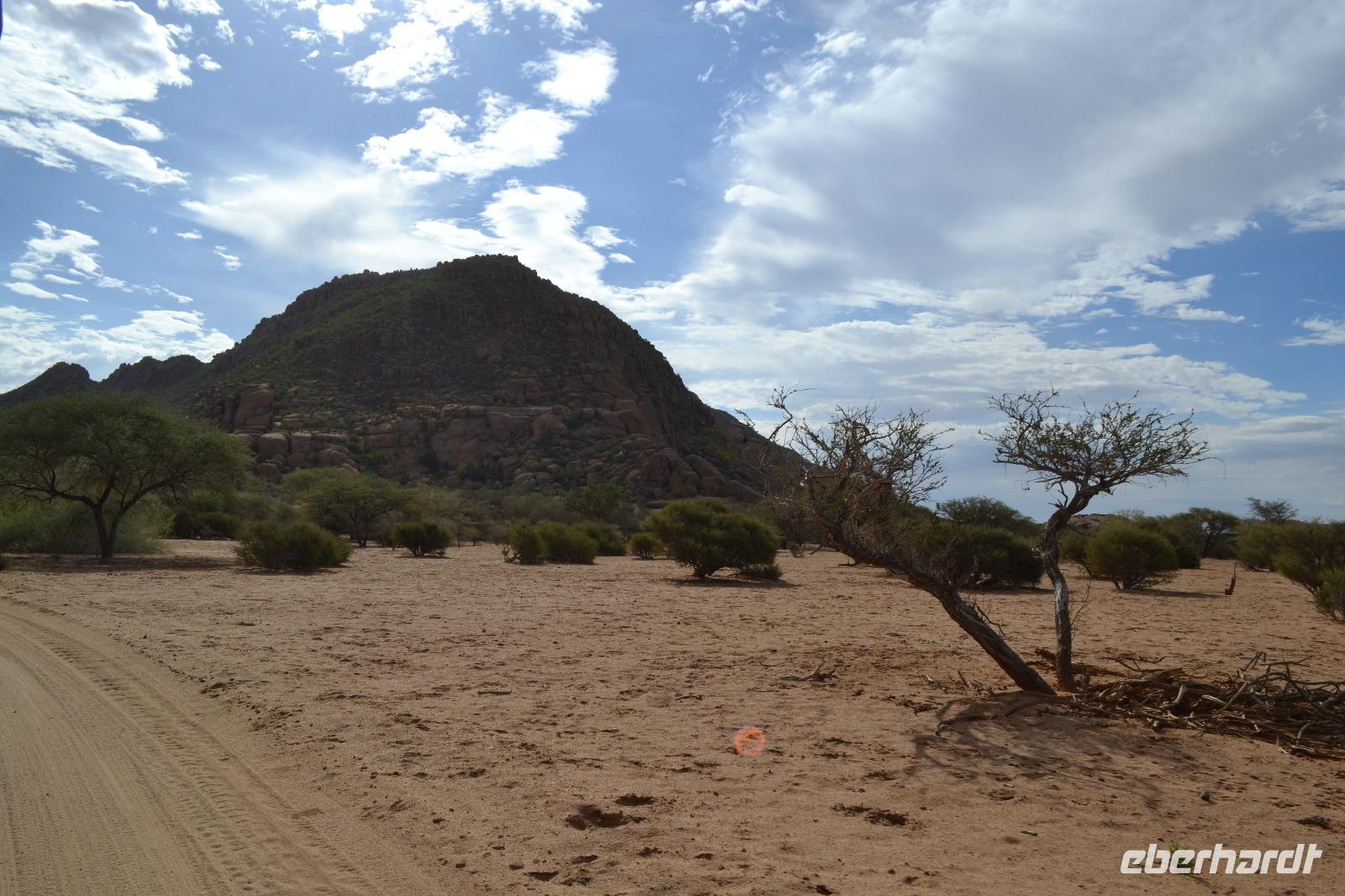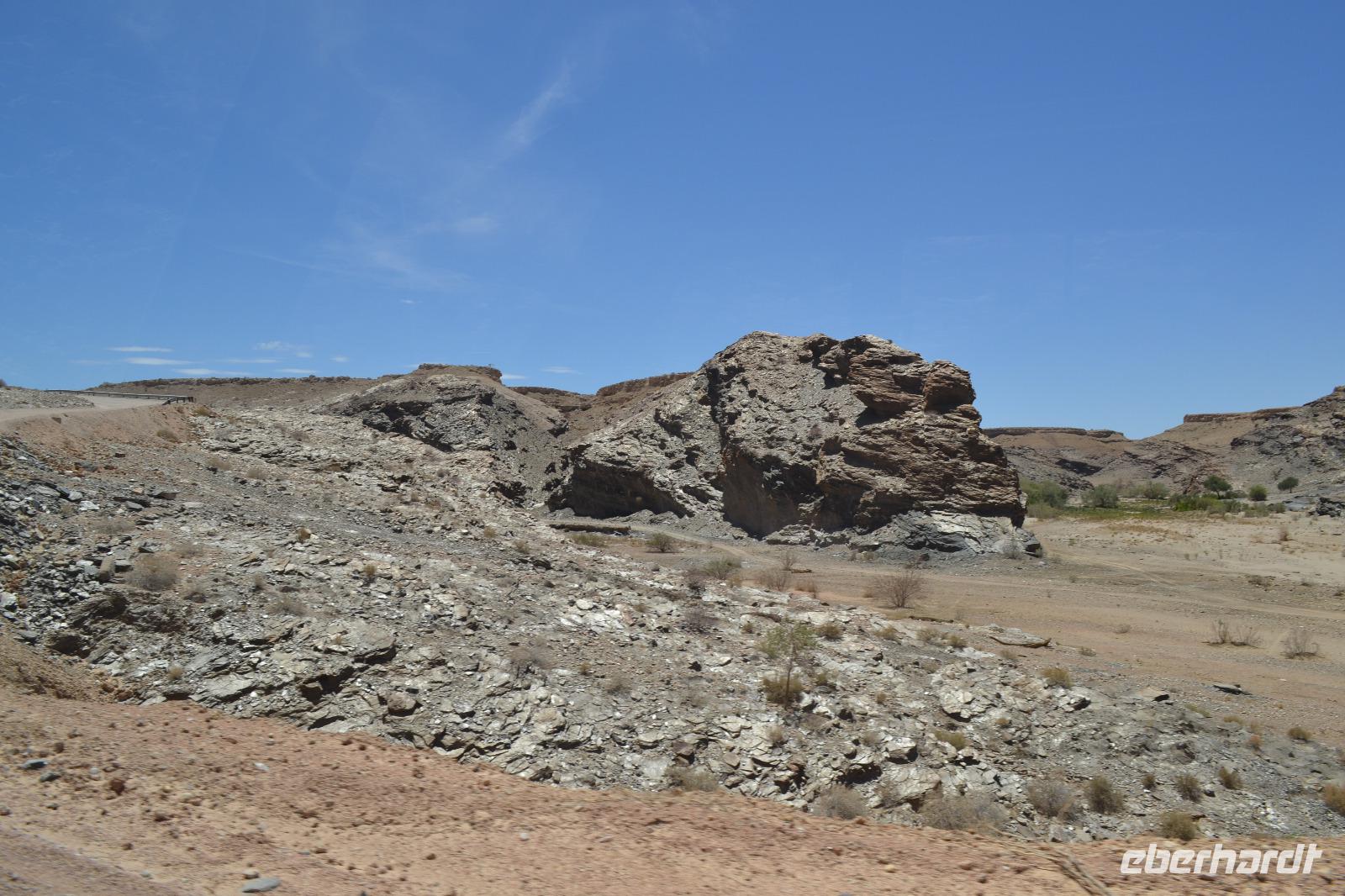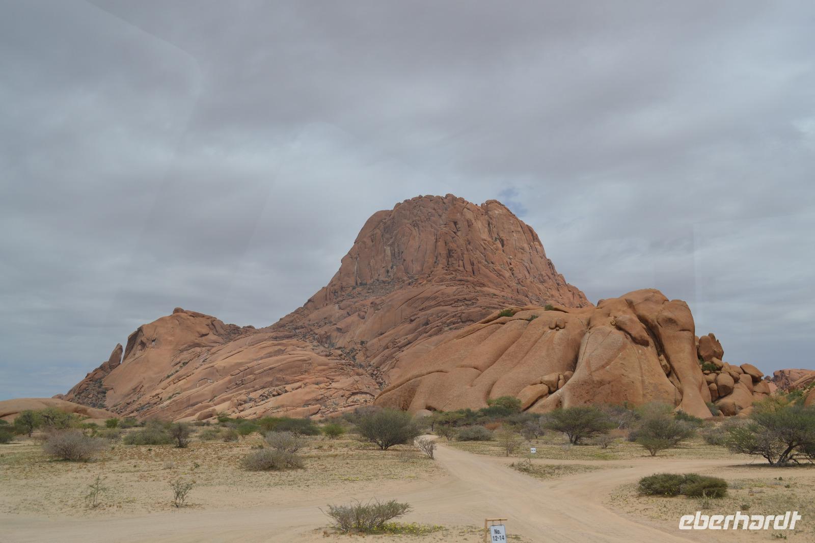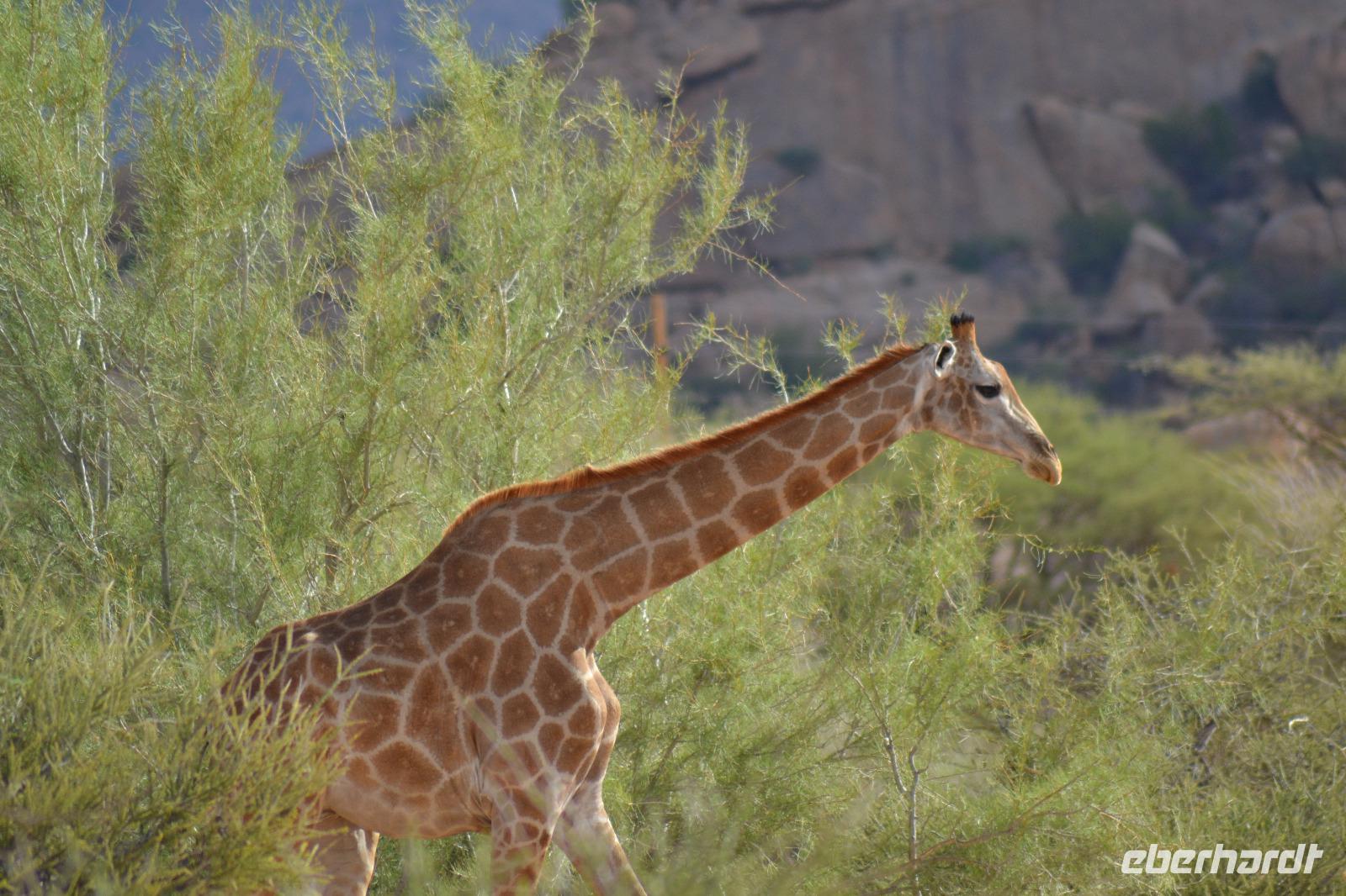 Wir frühstückten in dem neuen Stadthotel und fuhren heute mal etwas später los als gewohnt. Unserer Dagmar ging es heute leider nicht so gut. Sie hatte am Vortag anscheinend etwas Falsches gegessen. Die Kripo besuchte vor der Abfahrt noch die örtliche Polizeistation und schoß ein paar Erinnerungsfotos. Anschließend fuhren wir nicht allzu weit zur Spitzkoppe. Der Inselberg mit 1728 m Höhe wird auch als das „Matterhorn Namibias" bezeichnet. Seit 2011 gilt es als Nationaldenkmal und unterhielt damals eine Polizeistation der Schutztruppe für Deutsch-Südwestafrika. Leider verloren wir auf der gestrigen Holperfahrt unsere Klimaanlage und mussten nun mit offenen Fenstern auskommen. Eine Reparatur oder ein Bustausch war auf Grund der Ferien bis zum 07.01. leider nicht möglich. An dem Berg angekommen unternahmen wir zunächst einen kleinen Spaziergang über die skurrile Fels Landschaft zum Rock Arch, dem Felsbogen. Lange hielt man es auf Grund der Hitze dort allerdings nicht aus. Unter einem schönen Baum veranstalteten wir ein Reste-Picknick, wobei wir einiges am Morgen in Swakopmund frisch einkauften. Unser Highlight war am Ende des Picknicks der Springbock Tanz mit dem anschließend namensgleichen Getränk. Dazu mischten Laura und Dagmar Pfefferminz Likör mit Amarula. Ein leckeres und erfrischendes Schnäpsle. Auf dem Weg zur Lodge hielten wir an den Ständen der Kinder, welche aus Blech gebastelte und bemalte Mobiles verkauften. Wir verteilten die Reste unseres Picknicks an die Kinder, welche sich sehr darüber freuten. Am Nachmittag erreichten wir die Ai Aiba Lodge und bezogen unsere Zimmer am Fuße eines Felsens im Erongo Gebirge. Wie regenerierten uns bei einem kühlen Getränk oder einem kleinen Schläfchen. 17 Uhr ging es dann auf eine Sundowner Fahrt durch das Erongo Tal. Auf dieser Tour mit dem Jeep sahen wir unterschiedlichste Landschaftsbilder, Giraffen, Warzenschweine, Oryx und Wandmalereien. Diese dienten der Weiter Erzählung von Geschichten, waren Veranstaltungsort für Zeremonien und stellten die Geschichte der Ureinwohner dar. An einem höher gelegenen Felsen legten wir mit den Jeeps eine Pause ein. Jeder bekam ein kühles Getränk für den Sonnenuntergang im Gebirge, sowie ein paar Naschereien. Am Abend kamen wir in der Dunkelheit zurück in das Hotel, wo bereits N. Und Dagmar hungrig auf uns und das Abendessen warteten.