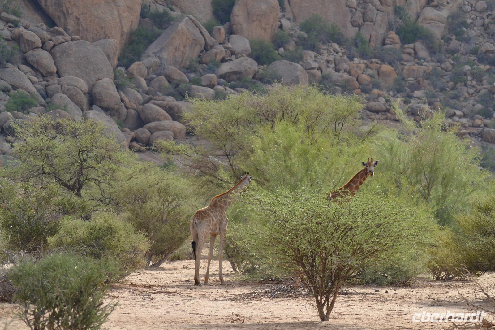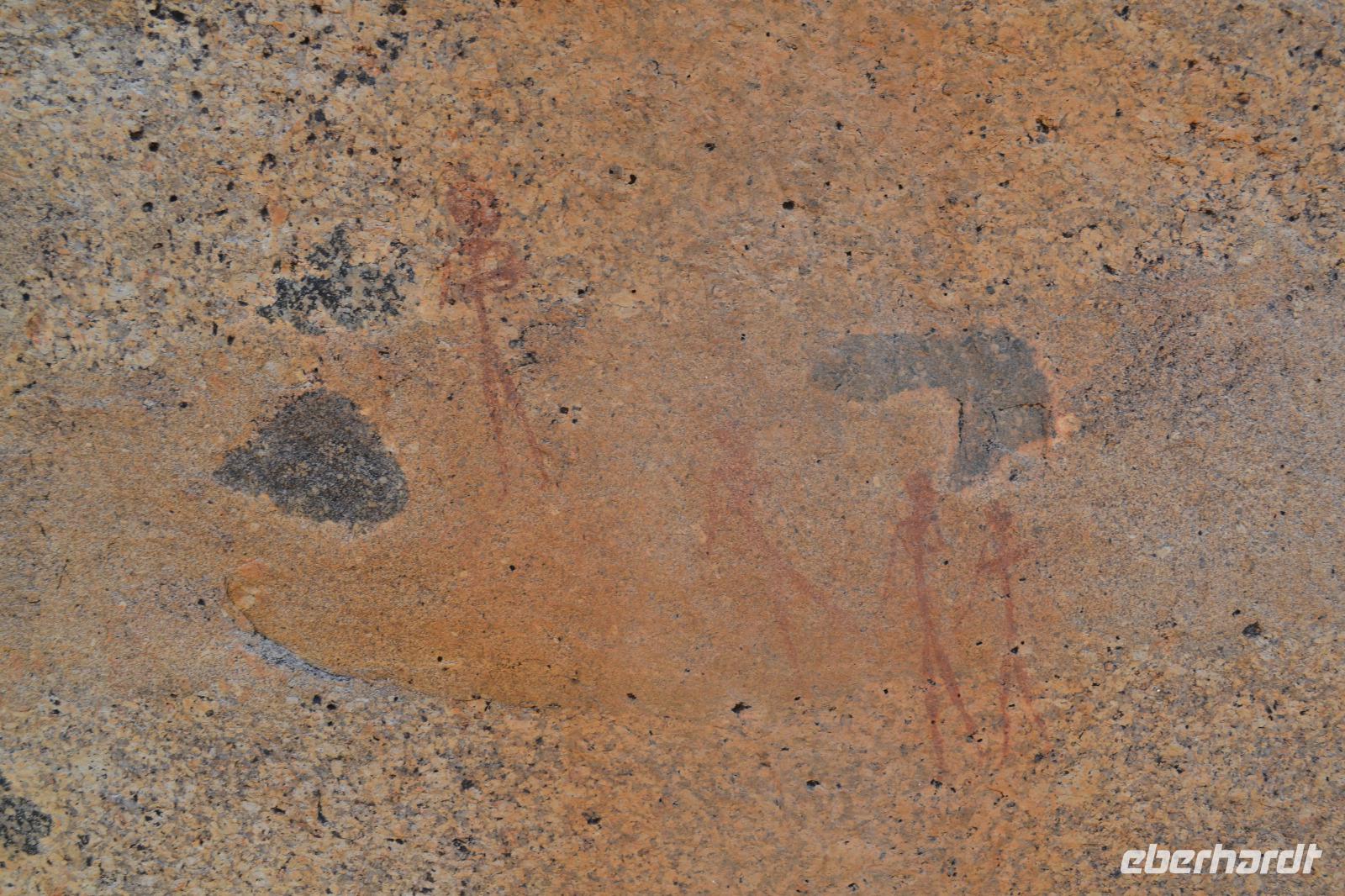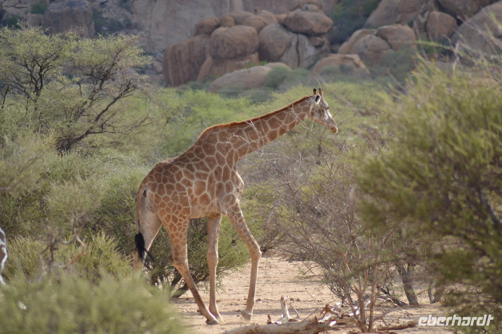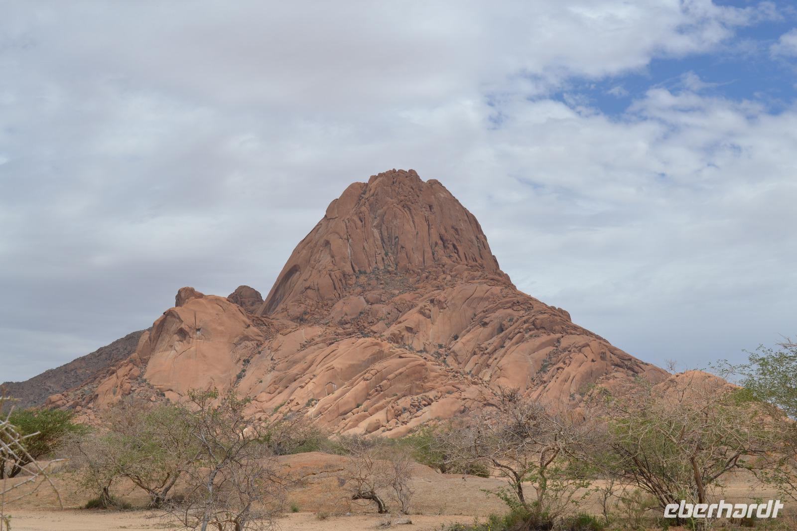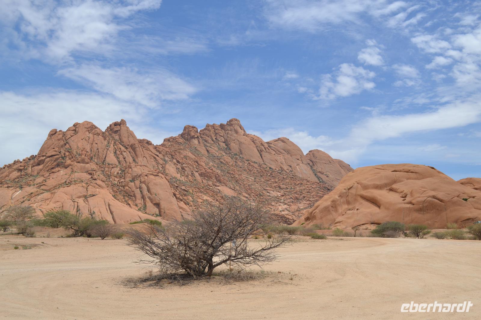 Wir frühstückten in dem neuen Stadthotel und fuhren heute mal etwas später los als gewohnt. Unserer Dagmar ging es heute leider nicht so gut. Sie hatte am Vortag anscheinend etwas Falsches gegessen. Die Kripo besuchte vor der Abfahrt noch die örtliche Polizeistation und schoß ein paar Erinnerungsfotos. Anschließend fuhren wir nicht allzu weit zur Spitzkoppe. Der Inselberg mit 1728 m Höhe wird auch als das „Matterhorn Namibias" bezeichnet. Seit 2011 gilt es als Nationaldenkmal und unterhielt damals eine Polizeistation der Schutztruppe für Deutsch-Südwestafrika. Leider verloren wir auf der gestrigen Holperfahrt unsere Klimaanlage und mussten nun mit offenen Fenstern auskommen. Eine Reparatur oder ein Bustausch war auf Grund der Ferien bis zum 07.01. leider nicht möglich. An dem Berg angekommen unternahmen wir zunächst einen kleinen Spaziergang über die skurrile Fels Landschaft zum Rock Arch, dem Felsbogen. Lange hielt man es auf Grund der Hitze dort allerdings nicht aus. Unter einem schönen Baum veranstalteten wir ein Reste-Picknick, wobei wir einiges am Morgen in Swakopmund frisch einkauften. Unser Highlight war am Ende des Picknicks der Springbock Tanz mit dem anschließend namensgleichen Getränk. Dazu mischten Laura und Dagmar Pfefferminz Likör mit Amarula. Ein leckeres und erfrischendes Schnäpsle. Auf dem Weg zur Lodge hielten wir an den Ständen der Kinder, welche aus Blech gebastelte und bemalte Mobiles verkauften. Wir verteilten die Reste unseres Picknicks an die Kinder, welche sich sehr darüber freuten. Am Nachmittag erreichten wir die Ai Aiba Lodge und bezogen unsere Zimmer am Fuße eines Felsens im Erongo Gebirge. Wie regenerierten uns bei einem kühlen Getränk oder einem kleinen Schläfchen. 17 Uhr ging es dann auf eine Sundowner Fahrt durch das Erongo Tal. Auf dieser Tour mit dem Jeep sahen wir unterschiedlichste Landschaftsbilder, Giraffen, Warzenschweine, Oryx und Wandmalereien. Diese dienten der Weiter Erzählung von Geschichten, waren Veranstaltungsort für Zeremonien und stellten die Geschichte der Ureinwohner dar. An einem höher gelegenen Felsen legten wir mit den Jeeps eine Pause ein. Jeder bekam ein kühles Getränk für den Sonnenuntergang im Gebirge, sowie ein paar Naschereien. Am Abend kamen wir in der Dunkelheit zurück in das Hotel, wo bereits N. Und Dagmar hungrig auf uns und das Abendessen warteten.