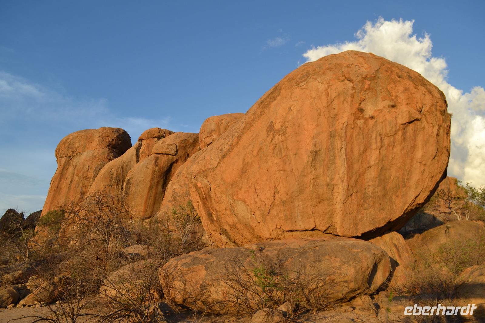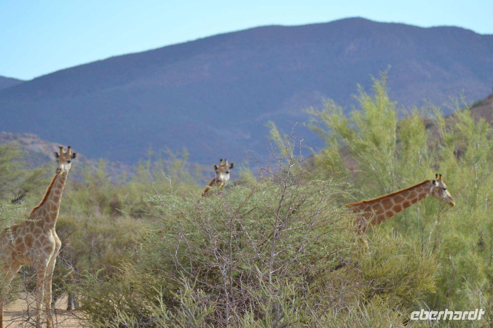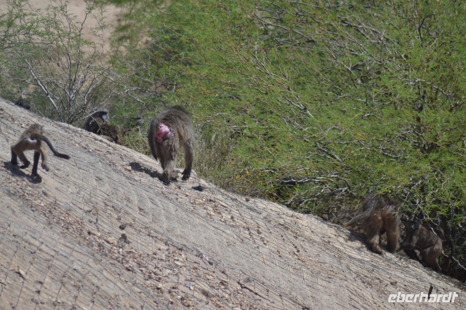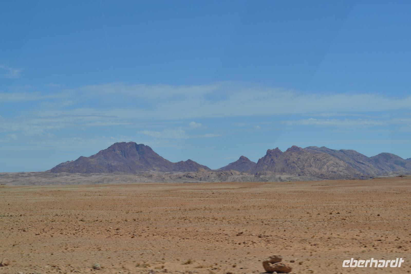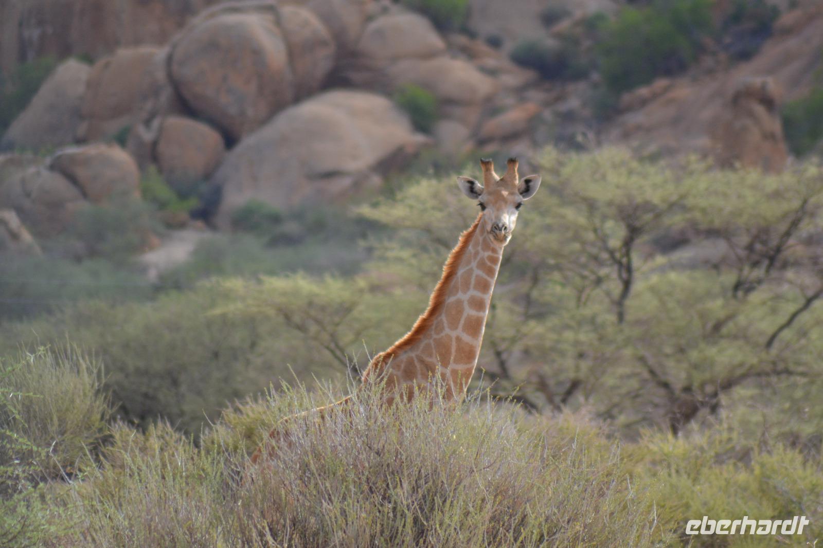 Wir frühstückten in dem neuen Stadthotel und fuhren heute mal etwas später los als gewohnt. Unserer Dagmar ging es heute leider nicht so gut. Sie hatte am Vortag anscheinend etwas Falsches gegessen. Die Kripo besuchte vor der Abfahrt noch die örtliche Polizeistation und schoß ein paar Erinnerungsfotos. Anschließend fuhren wir nicht allzu weit zur Spitzkoppe. Der Inselberg mit 1728 m Höhe wird auch als das „Matterhorn Namibias" bezeichnet. Seit 2011 gilt es als Nationaldenkmal und unterhielt damals eine Polizeistation der Schutztruppe für Deutsch-Südwestafrika. Leider verloren wir auf der gestrigen Holperfahrt unsere Klimaanlage und mussten nun mit offenen Fenstern auskommen. Eine Reparatur oder ein Bustausch war auf Grund der Ferien bis zum 07.01. leider nicht möglich. An dem Berg angekommen unternahmen wir zunächst einen kleinen Spaziergang über die skurrile Fels Landschaft zum Rock Arch, dem Felsbogen. Lange hielt man es auf Grund der Hitze dort allerdings nicht aus. Unter einem schönen Baum veranstalteten wir ein Reste-Picknick, wobei wir einiges am Morgen in Swakopmund frisch einkauften. Unser Highlight war am Ende des Picknicks der Springbock Tanz mit dem anschließend namensgleichen Getränk. Dazu mischten Laura und Dagmar Pfefferminz Likör mit Amarula. Ein leckeres und erfrischendes Schnäpsle. Auf dem Weg zur Lodge hielten wir an den Ständen der Kinder, welche aus Blech gebastelte und bemalte Mobiles verkauften. Wir verteilten die Reste unseres Picknicks an die Kinder, welche sich sehr darüber freuten. Am Nachmittag erreichten wir die Ai Aiba Lodge und bezogen unsere Zimmer am Fuße eines Felsens im Erongo Gebirge. Wie regenerierten uns bei einem kühlen Getränk oder einem kleinen Schläfchen. 17 Uhr ging es dann auf eine Sundowner Fahrt durch das Erongo Tal. Auf dieser Tour mit dem Jeep sahen wir unterschiedlichste Landschaftsbilder, Giraffen, Warzenschweine, Oryx und Wandmalereien. Diese dienten der Weiter Erzählung von Geschichten, waren Veranstaltungsort für Zeremonien und stellten die Geschichte der Ureinwohner dar. An einem höher gelegenen Felsen legten wir mit den Jeeps eine Pause ein. Jeder bekam ein kühles Getränk für den Sonnenuntergang im Gebirge, sowie ein paar Naschereien. Am Abend kamen wir in der Dunkelheit zurück in das Hotel, wo bereits N. Und Dagmar hungrig auf uns und das Abendessen warteten.