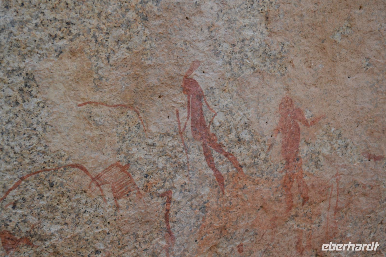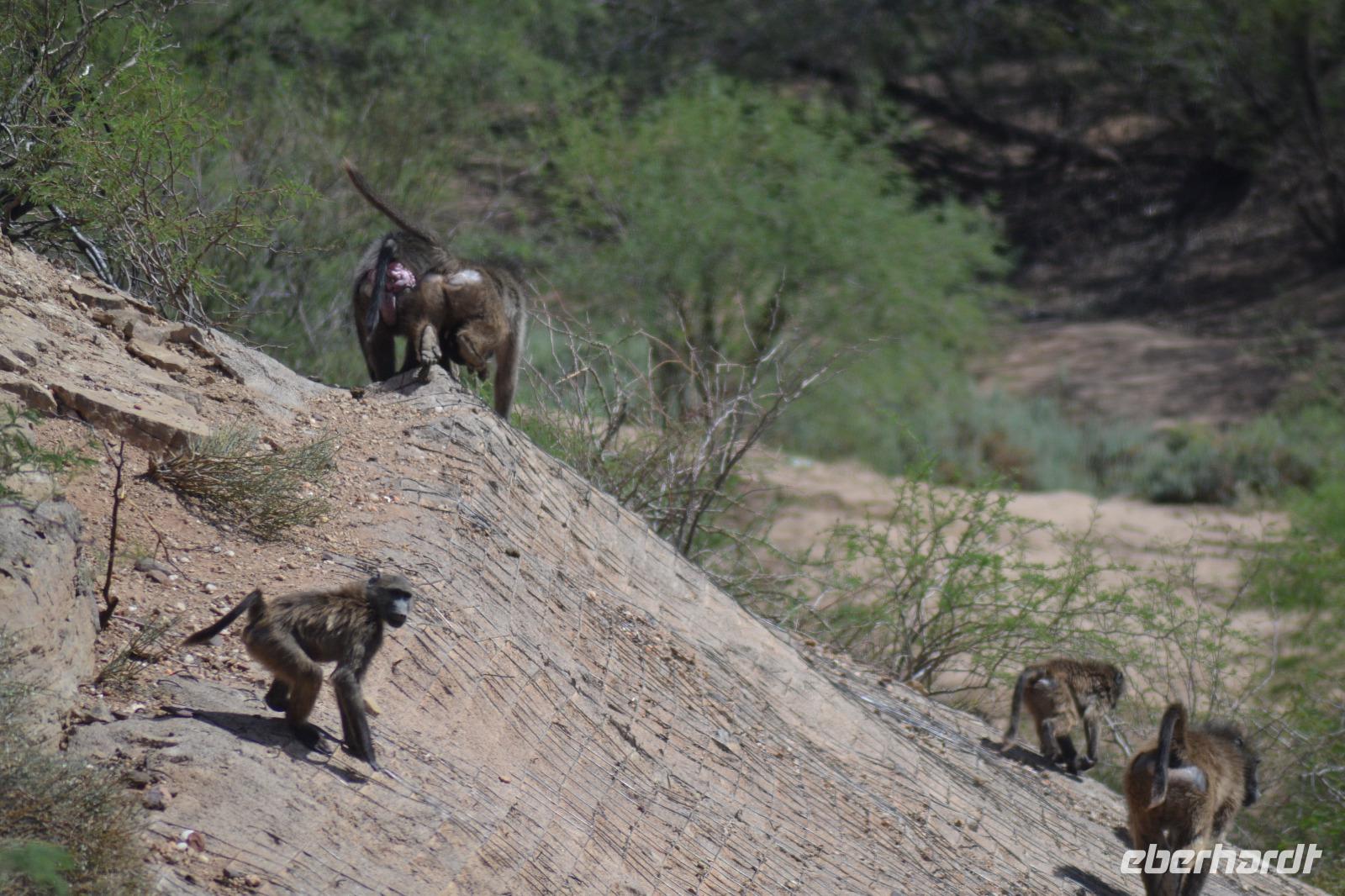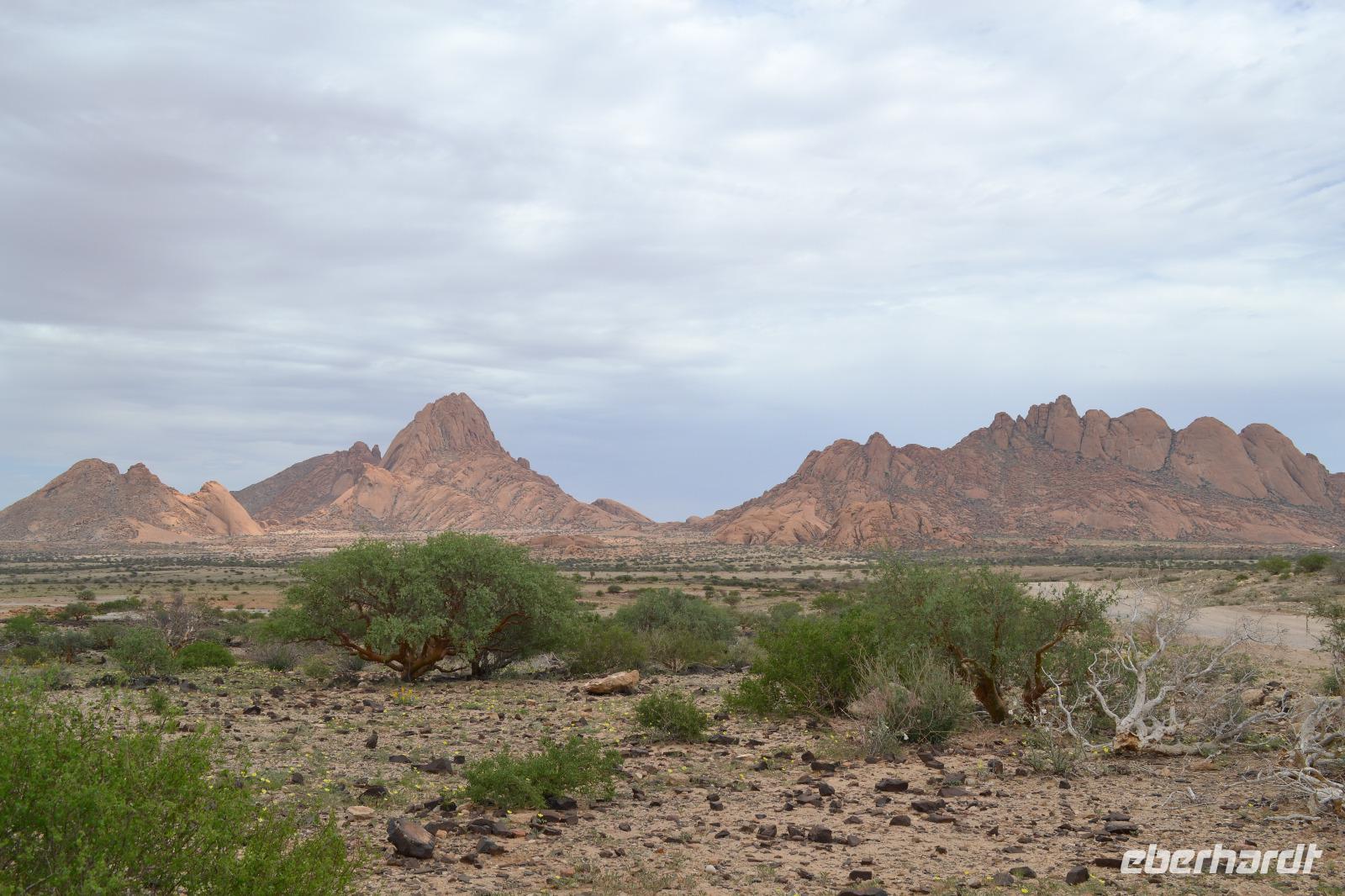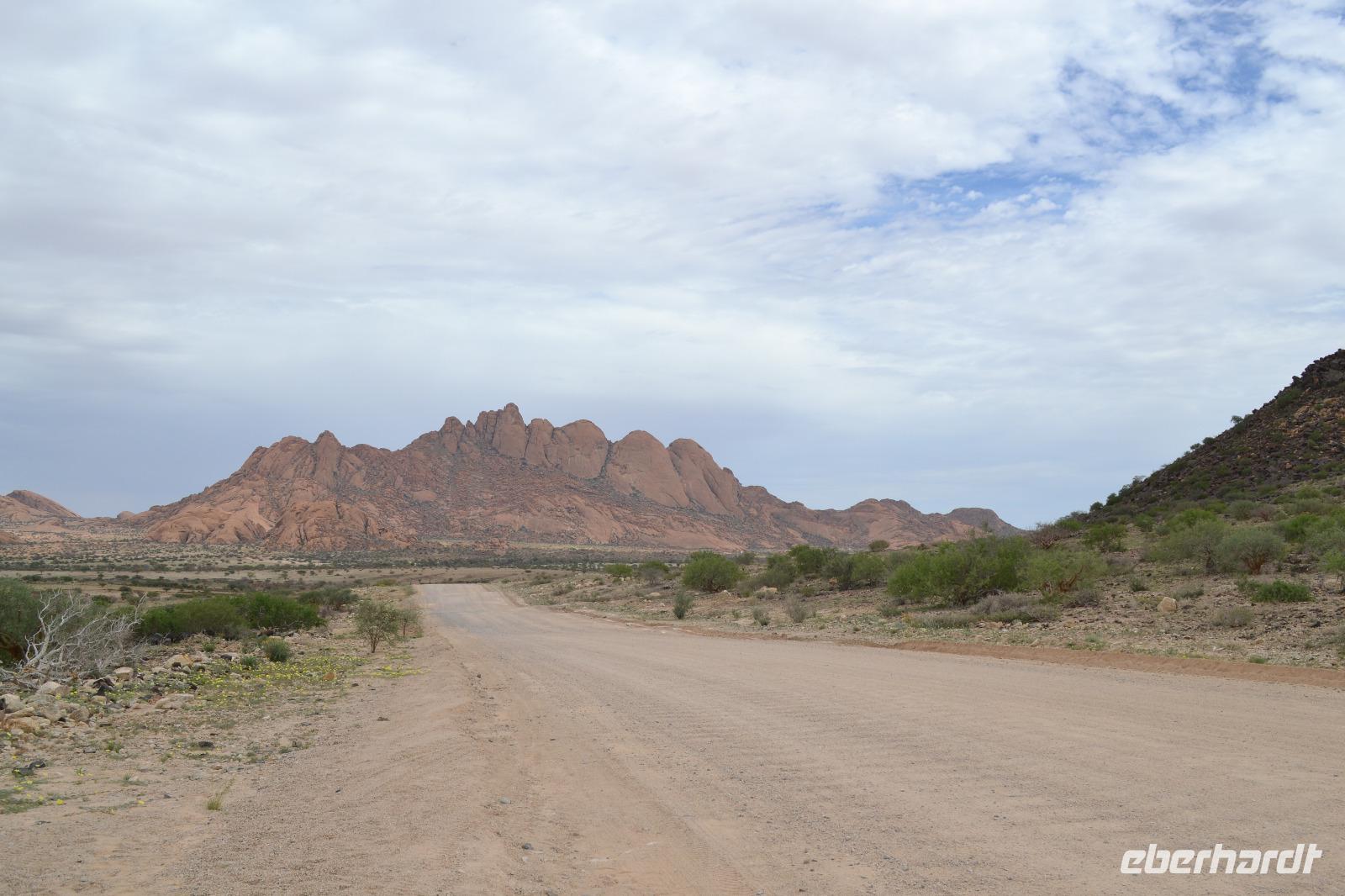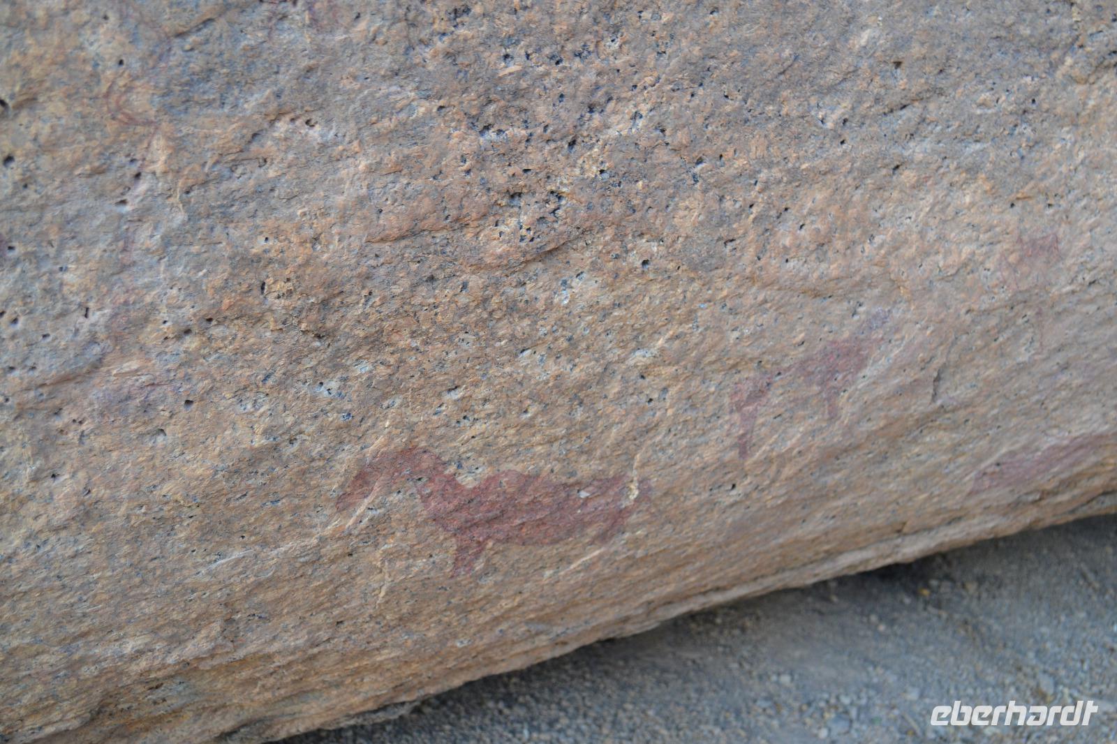 Wir frühstückten in dem neuen Stadthotel und fuhren heute mal etwas später los als gewohnt. Unserer Dagmar ging es heute leider nicht so gut. Sie hatte am Vortag anscheinend etwas Falsches gegessen. Die Kripo besuchte vor der Abfahrt noch die örtliche Polizeistation und schoß ein paar Erinnerungsfotos. Anschließend fuhren wir nicht allzu weit zur Spitzkoppe. Der Inselberg mit 1728 m Höhe wird auch als das „Matterhorn Namibias" bezeichnet. Seit 2011 gilt es als Nationaldenkmal und unterhielt damals eine Polizeistation der Schutztruppe für Deutsch-Südwestafrika. Leider verloren wir auf der gestrigen Holperfahrt unsere Klimaanlage und mussten nun mit offenen Fenstern auskommen. Eine Reparatur oder ein Bustausch war auf Grund der Ferien bis zum 07.01. leider nicht möglich. An dem Berg angekommen unternahmen wir zunächst einen kleinen Spaziergang über die skurrile Fels Landschaft zum Rock Arch, dem Felsbogen. Lange hielt man es auf Grund der Hitze dort allerdings nicht aus. Unter einem schönen Baum veranstalteten wir ein Reste-Picknick, wobei wir einiges am Morgen in Swakopmund frisch einkauften. Unser Highlight war am Ende des Picknicks der Springbock Tanz mit dem anschließend namensgleichen Getränk. Dazu mischten Laura und Dagmar Pfefferminz Likör mit Amarula. Ein leckeres und erfrischendes Schnäpsle. Auf dem Weg zur Lodge hielten wir an den Ständen der Kinder, welche aus Blech gebastelte und bemalte Mobiles verkauften. Wir verteilten die Reste unseres Picknicks an die Kinder, welche sich sehr darüber freuten. Am Nachmittag erreichten wir die Ai Aiba Lodge und bezogen unsere Zimmer am Fuße eines Felsens im Erongo Gebirge. Wie regenerierten uns bei einem kühlen Getränk oder einem kleinen Schläfchen. 17 Uhr ging es dann auf eine Sundowner Fahrt durch das Erongo Tal. Auf dieser Tour mit dem Jeep sahen wir unterschiedlichste Landschaftsbilder, Giraffen, Warzenschweine, Oryx und Wandmalereien. Diese dienten der Weiter Erzählung von Geschichten, waren Veranstaltungsort für Zeremonien und stellten die Geschichte der Ureinwohner dar. An einem höher gelegenen Felsen legten wir mit den Jeeps eine Pause ein. Jeder bekam ein kühles Getränk für den Sonnenuntergang im Gebirge, sowie ein paar Naschereien. Am Abend kamen wir in der Dunkelheit zurück in das Hotel, wo bereits N. Und Dagmar hungrig auf uns und das Abendessen warteten.