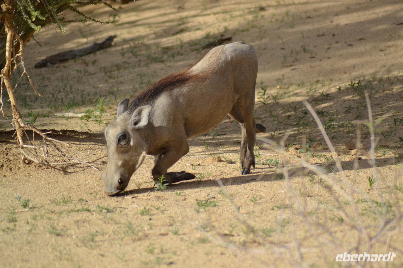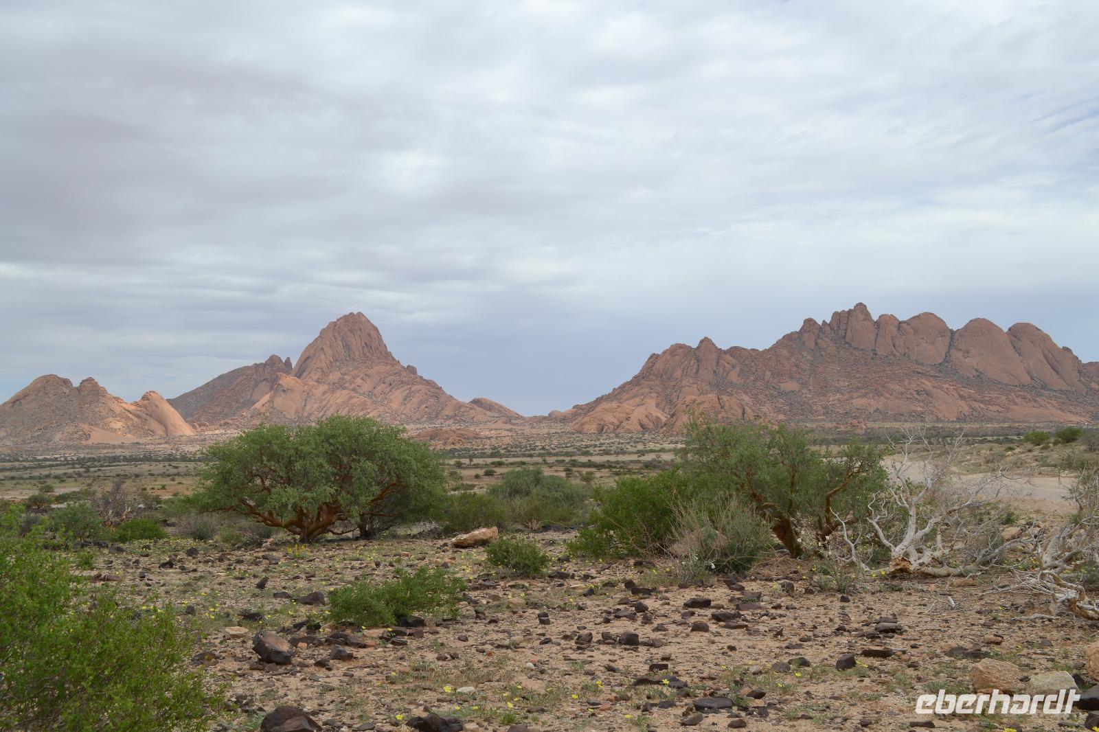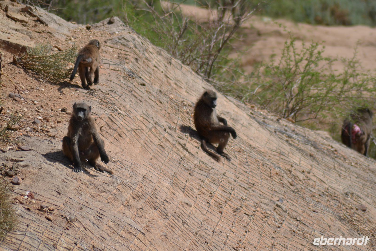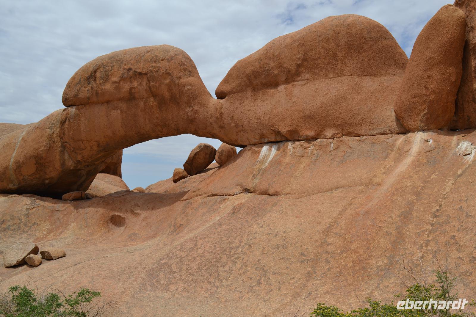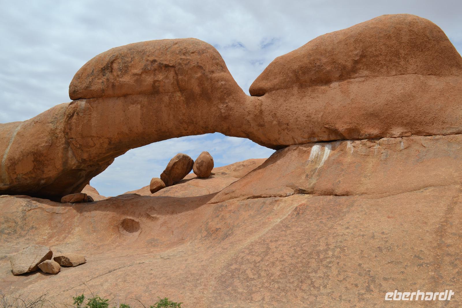 Wir frühstückten in dem neuen Stadthotel und fuhren heute mal etwas später los als gewohnt. Unserer Dagmar ging es heute leider nicht so gut. Sie hatte am Vortag anscheinend etwas Falsches gegessen. Die Kripo besuchte vor der Abfahrt noch die örtliche Polizeistation und schoß ein paar Erinnerungsfotos. Anschließend fuhren wir nicht allzu weit zur Spitzkoppe. Der Inselberg mit 1728 m Höhe wird auch als das „Matterhorn Namibias" bezeichnet. Seit 2011 gilt es als Nationaldenkmal und unterhielt damals eine Polizeistation der Schutztruppe für Deutsch-Südwestafrika. Leider verloren wir auf der gestrigen Holperfahrt unsere Klimaanlage und mussten nun mit offenen Fenstern auskommen. Eine Reparatur oder ein Bustausch war auf Grund der Ferien bis zum 07.01. leider nicht möglich. An dem Berg angekommen unternahmen wir zunächst einen kleinen Spaziergang über die skurrile Fels Landschaft zum Rock Arch, dem Felsbogen. Lange hielt man es auf Grund der Hitze dort allerdings nicht aus. Unter einem schönen Baum veranstalteten wir ein Reste-Picknick, wobei wir einiges am Morgen in Swakopmund frisch einkauften. Unser Highlight war am Ende des Picknicks der Springbock Tanz mit dem anschließend namensgleichen Getränk. Dazu mischten Laura und Dagmar Pfefferminz Likör mit Amarula. Ein leckeres und erfrischendes Schnäpsle. Auf dem Weg zur Lodge hielten wir an den Ständen der Kinder, welche aus Blech gebastelte und bemalte Mobiles verkauften. Wir verteilten die Reste unseres Picknicks an die Kinder, welche sich sehr darüber freuten. Am Nachmittag erreichten wir die Ai Aiba Lodge und bezogen unsere Zimmer am Fuße eines Felsens im Erongo Gebirge. Wie regenerierten uns bei einem kühlen Getränk oder einem kleinen Schläfchen. 17 Uhr ging es dann auf eine Sundowner Fahrt durch das Erongo Tal. Auf dieser Tour mit dem Jeep sahen wir unterschiedlichste Landschaftsbilder, Giraffen, Warzenschweine, Oryx und Wandmalereien. Diese dienten der Weiter Erzählung von Geschichten, waren Veranstaltungsort für Zeremonien und stellten die Geschichte der Ureinwohner dar. An einem höher gelegenen Felsen legten wir mit den Jeeps eine Pause ein. Jeder bekam ein kühles Getränk für den Sonnenuntergang im Gebirge, sowie ein paar Naschereien. Am Abend kamen wir in der Dunkelheit zurück in das Hotel, wo bereits N. Und Dagmar hungrig auf uns und das Abendessen warteten.